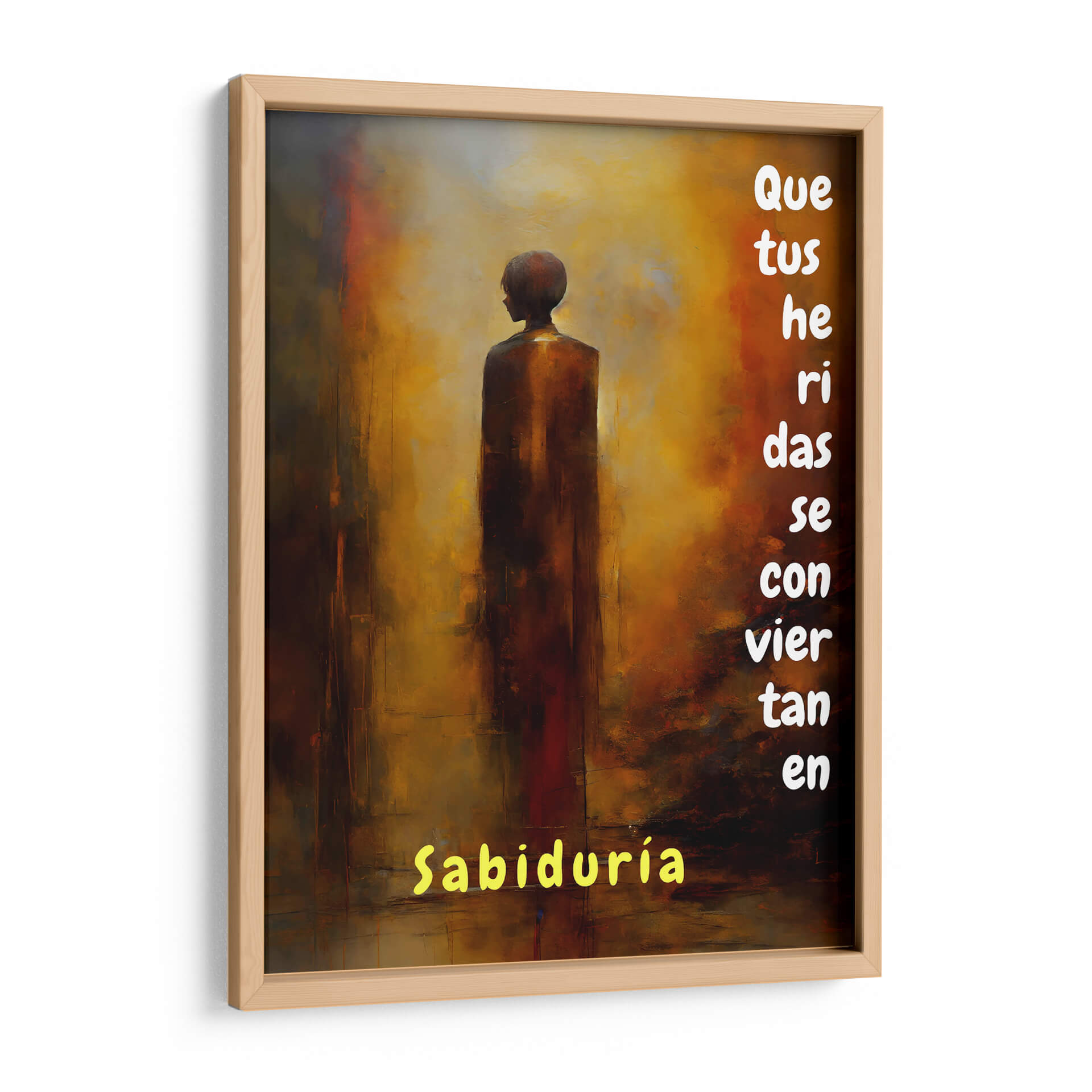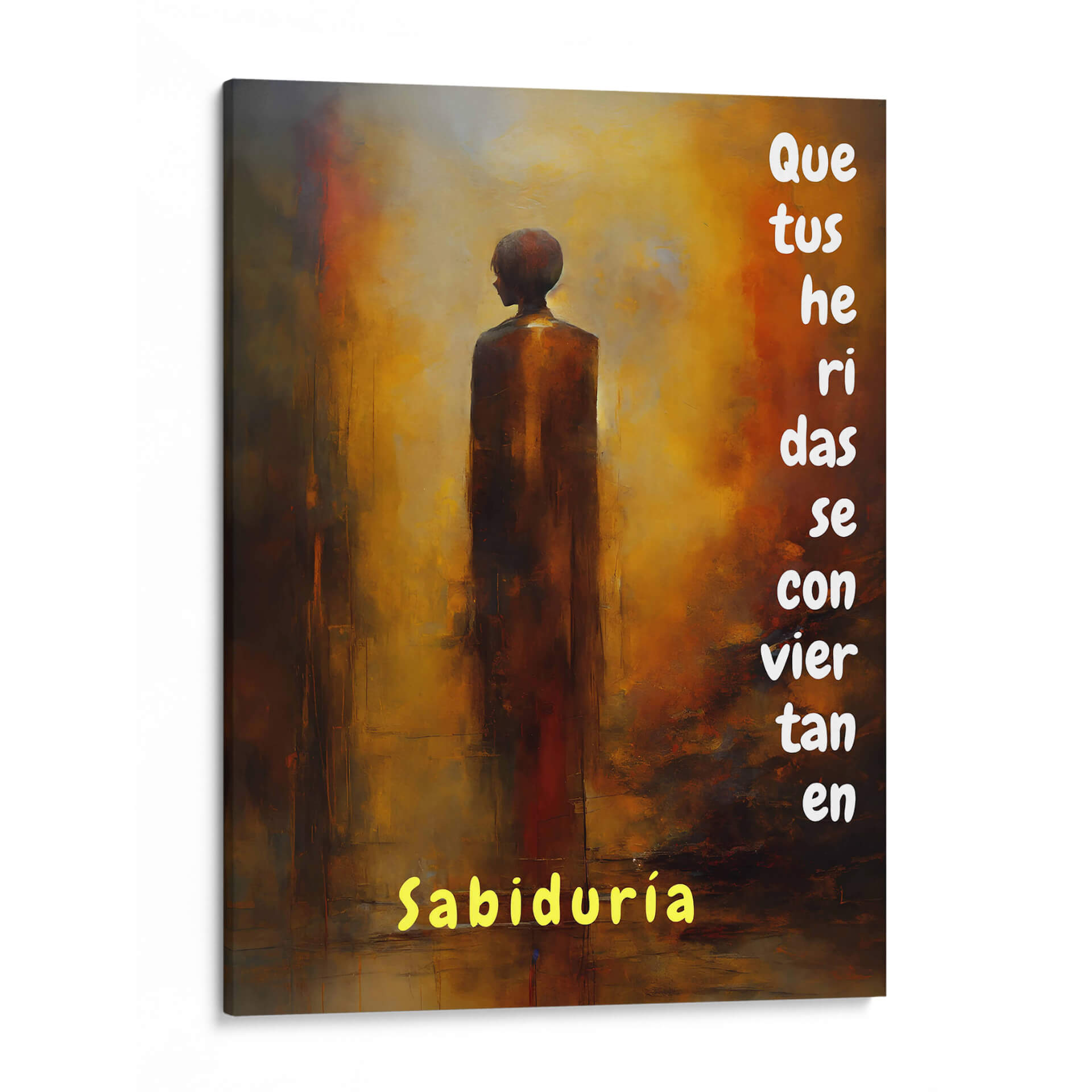 Transforma tu espacio con "Que tus Heridas se Conviertan en Sabiduría", una obra de arte digital que evoca introspección y fortaleza. La pieza presenta una figura estilizada en tonos tierra, envuelta en un fondo abstracto de cálidos naranjas, dorados y ocres, con toques de carmesí que añaden profundidad y emoción. La composición minimalista, centrada en la figura solitaria, invita a la reflexión sobre el crecimiento personal a través de las adversidades. Las pinceladas texturizadas y la atmósfera etérea crean un ambiente de serenidad y sabiduría. Este cuadro decorativo es ideal para añadir un toque inspirador a tu hogar u oficina, funcionando como un recordatorio visual de resiliencia y autoconocimiento. Su estilo contemporáneo y su mensaje positivo lo convierten en una pieza perfecta para cualquier sala de estar, dormitorio o estudio que busque un punto focal cargado de significado y elegancia sutil. Deja que esta obra te inspire cada día.