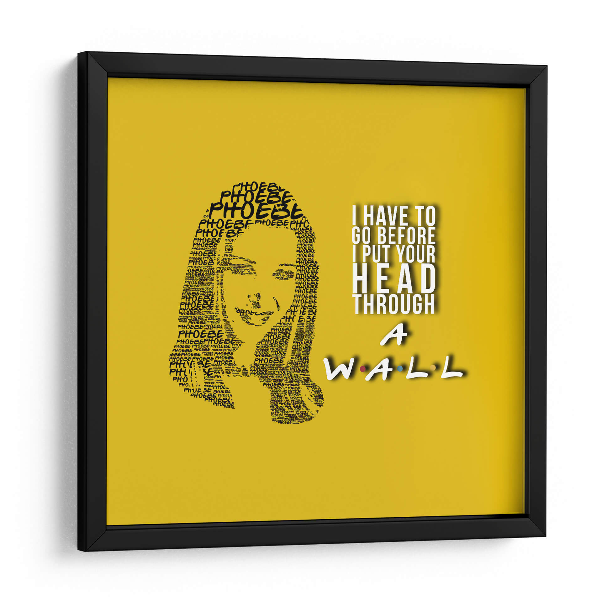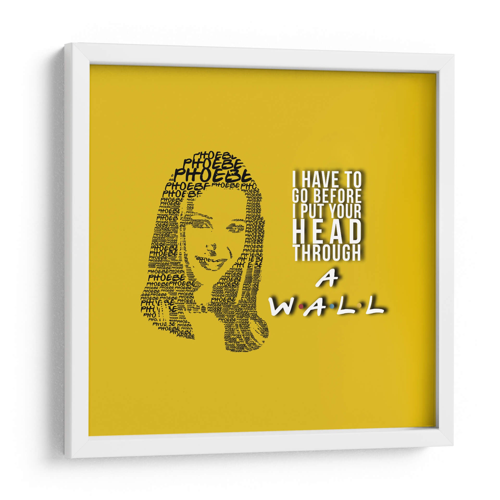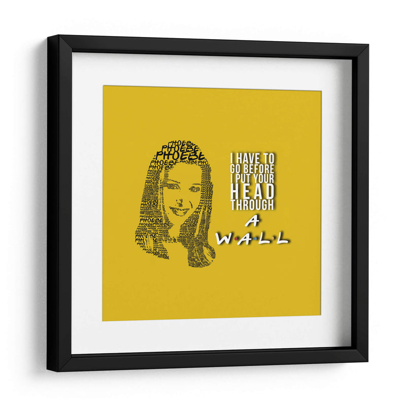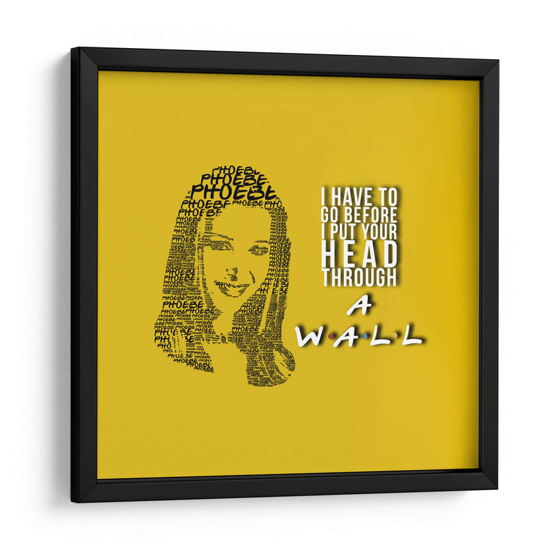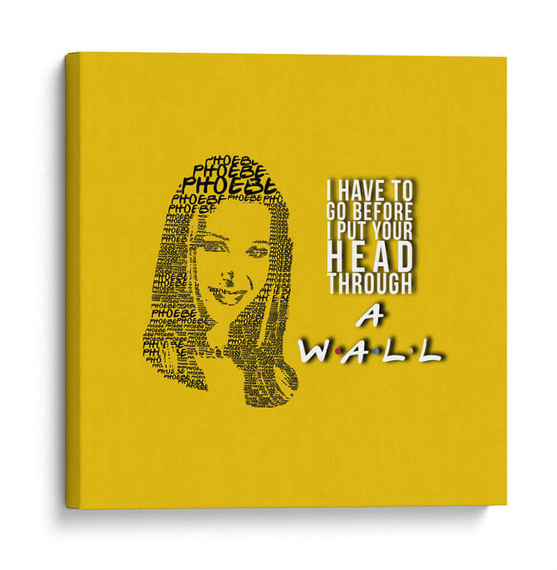 Este cautivador cuadro decorativo, titulado "Phoebe quote", es una pieza de arte digital única que captura la esencia de un personaje icónico con una ejecución ingeniosa. La obra presenta un retrato formado enteramente por la repetición del nombre "Phoebe", creando una textura visual fascinante y un homenaje sutil. A la derecha, una cita célebre en tipografía audaz, "I HAVE TO GO BEFORE I PUT YOUR HEAD THROUGH A WALL", añade un toque de humor y personalidad distintiva, rematado con el icónico logo de "Friends" en la parte inferior. La paleta de colores, dominada por un vibrante fondo amarillo sol, aporta energía y calidez al conjunto, haciendo que esta pieza sea ideal para infundir alegría y carácter a cualquier espacio. Su estilo gráfico y conceptual la convierte en una adición perfecta para salas de estar, estudios o cualquier rincón que necesite un acento divertido y memorable. Este cuadro decorativo no solo embellece, sino que también evoca nostalgia y conversación, siendo un punto focal que atraerá miradas y sonrisas. Transforma tu hogar u oficina con este homenaje artístico que combina diseño, humor y un diseño gráfico impactante, ofreciendo una dosis de cultura pop con estilo.