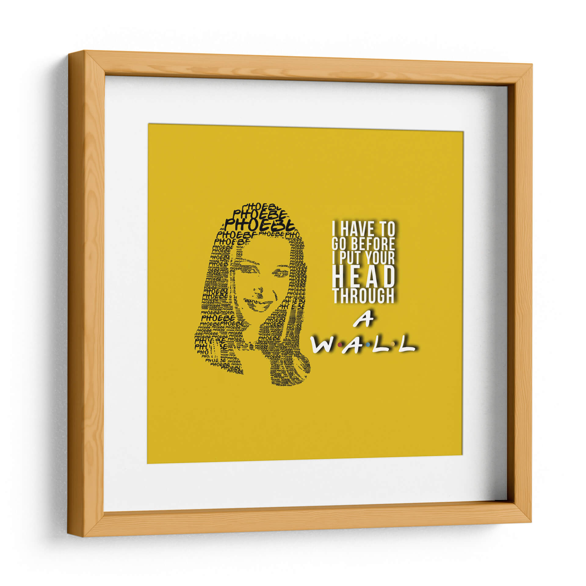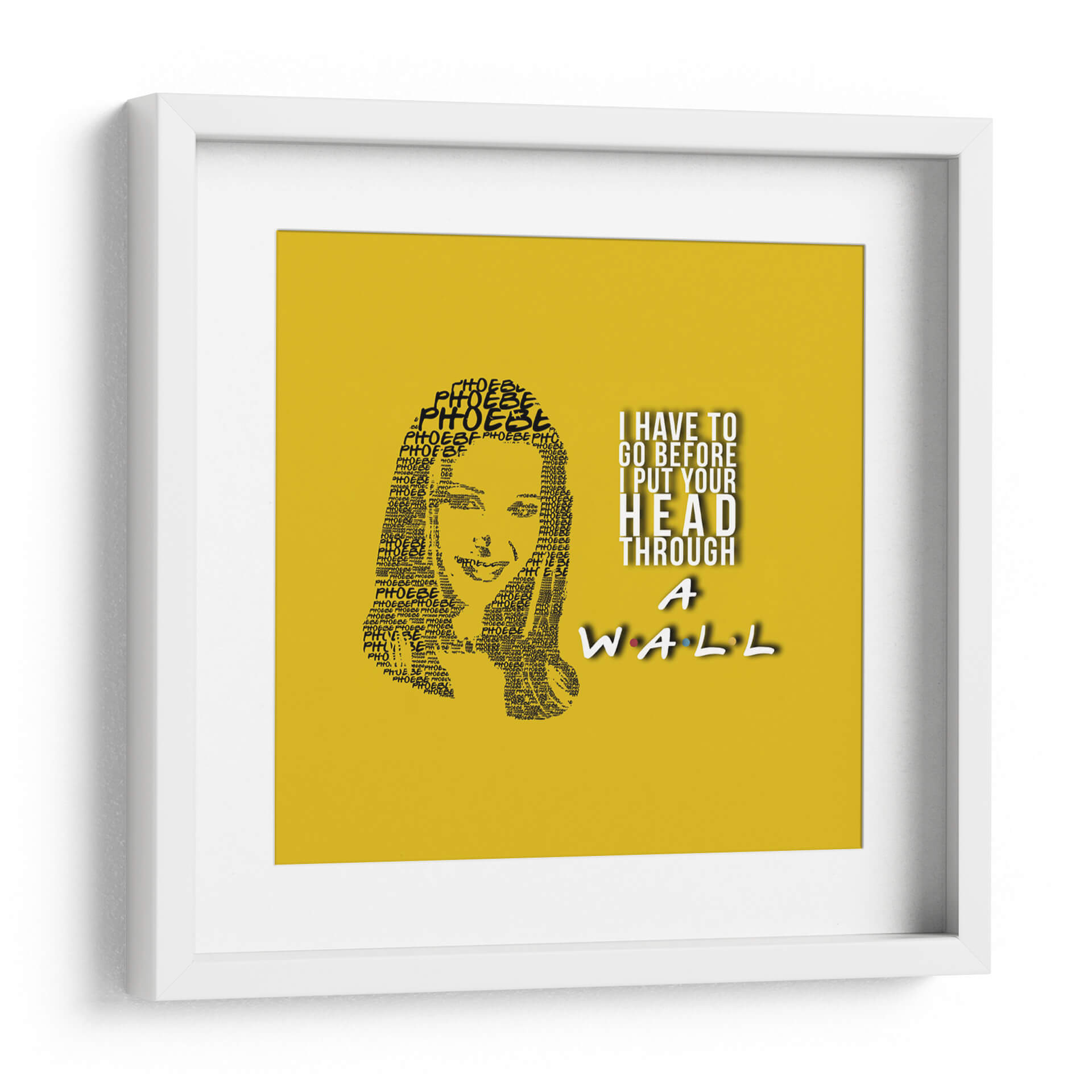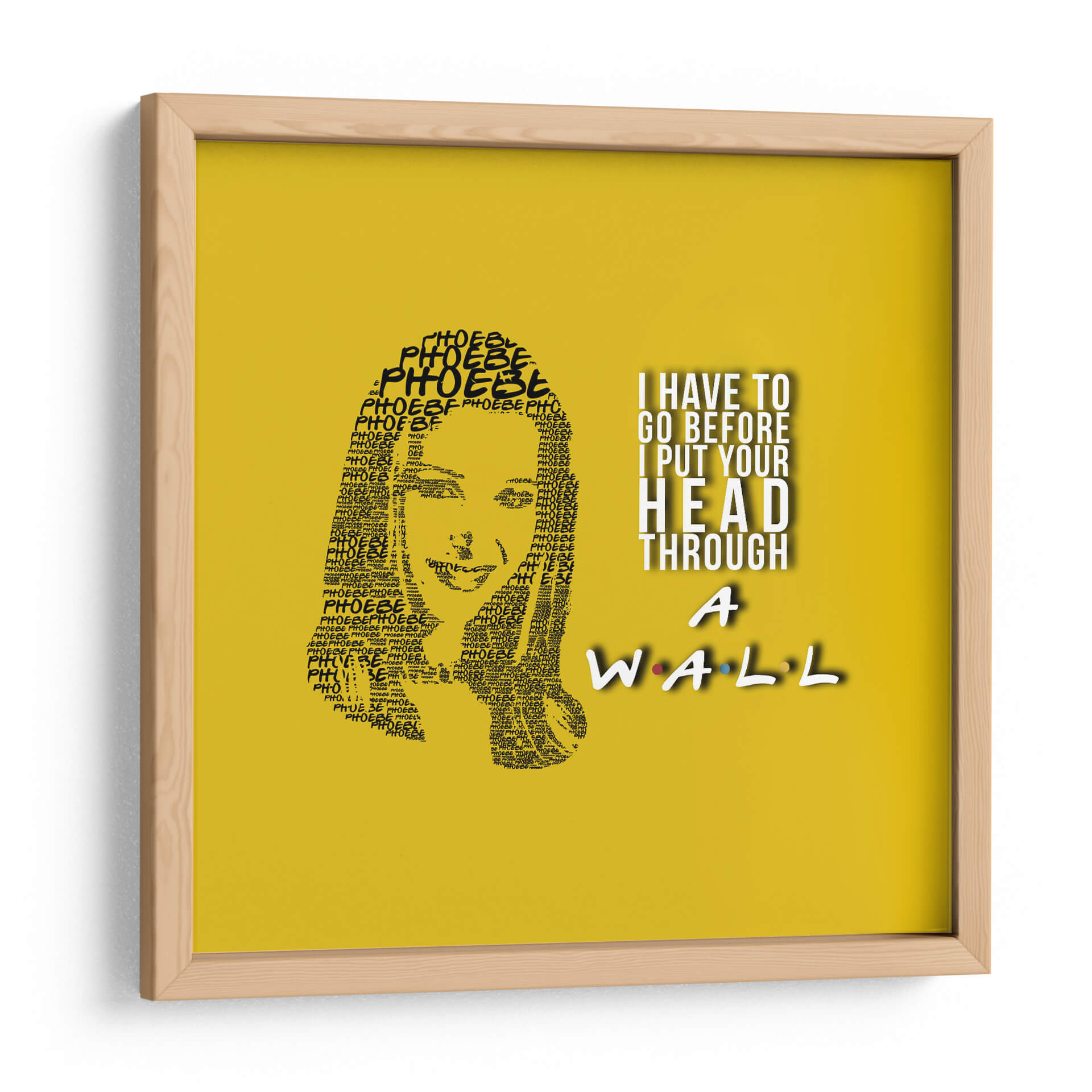 Este cautivador cuadro decorativo, titulado "Phoebe quote", es una pieza de arte digital única que captura la esencia de un personaje icónico con una ejecución ingeniosa. La obra presenta un retrato formado enteramente por la repetición del nombre "Phoebe", creando una textura visual fascinante y un homenaje sutil. A la derecha, una cita célebre en tipografía audaz, "I HAVE TO GO BEFORE I PUT YOUR HEAD THROUGH A WALL", añade un toque de humor y personalidad distintiva, rematado con el icónico logo de "Friends" en la parte inferior. La paleta de colores, dominada por un vibrante fondo amarillo sol, aporta energía y calidez al conjunto, haciendo que esta pieza sea ideal para infundir alegría y carácter a cualquier espacio. Su estilo gráfico y conceptual la convierte en una adición perfecta para salas de estar, estudios o cualquier rincón que necesite un acento divertido y memorable. Este cuadro decorativo no solo embellece, sino que también evoca nostalgia y conversación, siendo un punto focal que atraerá miradas y sonrisas. Transforma tu hogar u oficina con este homenaje artístico que combina diseño, humor y un diseño gráfico impactante, ofreciendo una dosis de cultura pop con estilo.