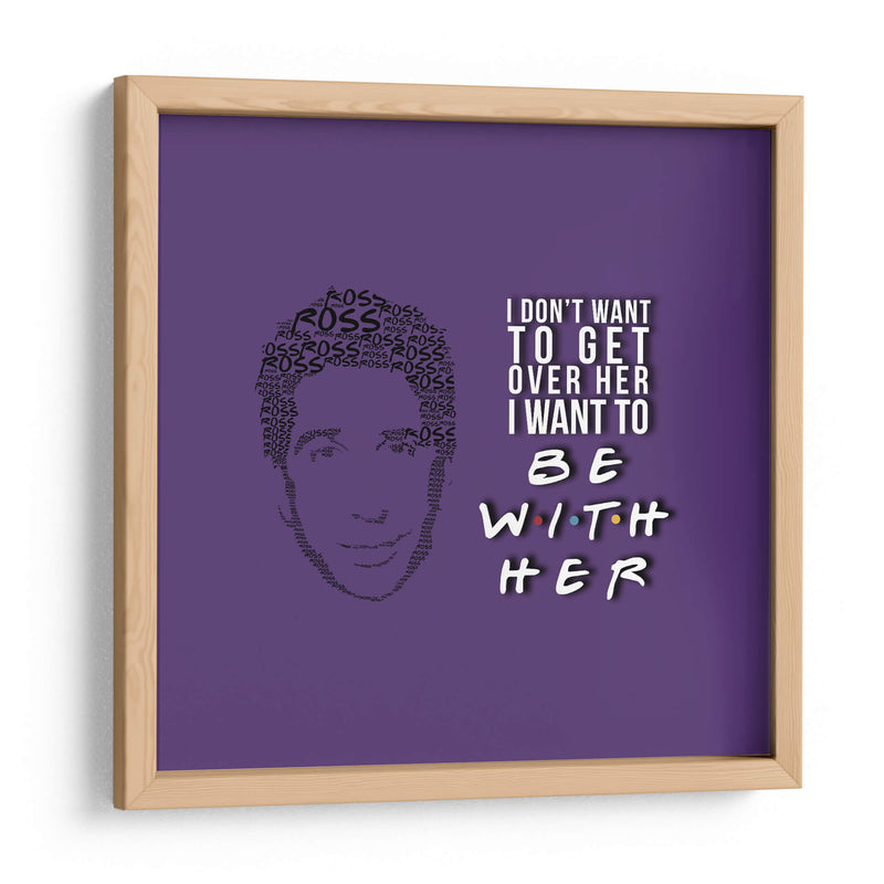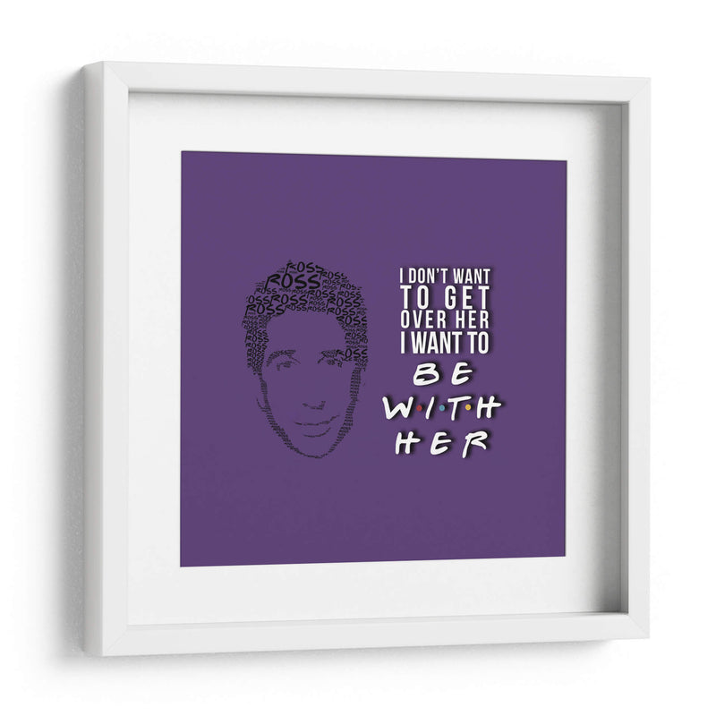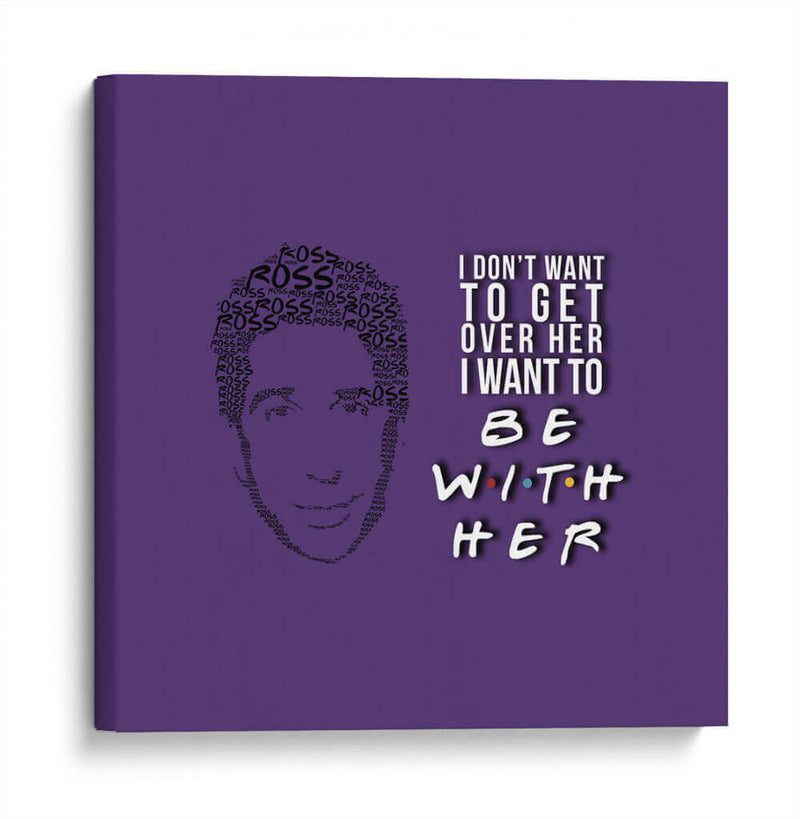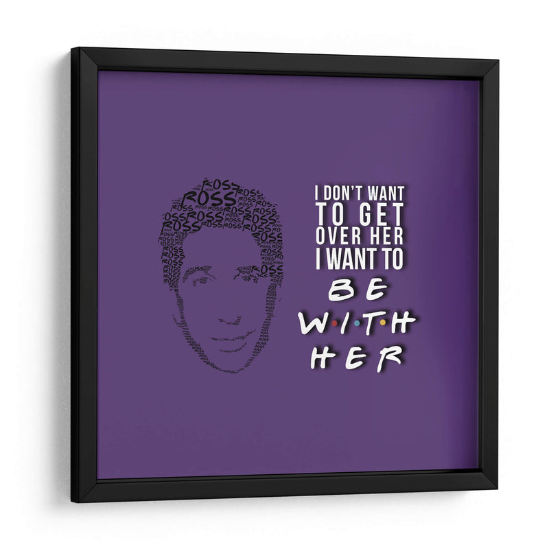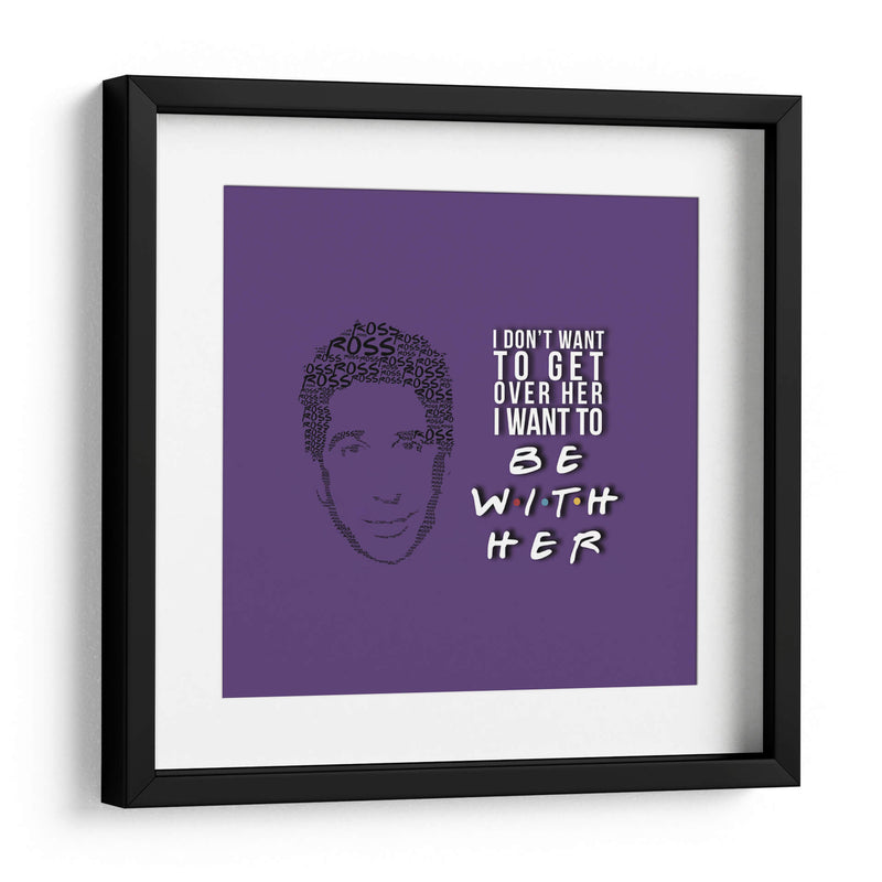 Embellece tu espacio con este singular cuadro decorativo que celebra un icónico momento de la cultura pop. La obra presenta un retrato sutilmente formado por la repetición de la palabra 'Ross', creando una textura visual intrigante y un homenaje a un personaje querido. A su lado, una cita célebre escrita en tipografía clara y audaz, resalta un sentimiento universal de amor y devoción: "I DON'T WANT TO GET OVER HER I WANT TO BE WITH HER". Los colores vibrantes del fondo púrpura contrastan elegantemente con el negro del texto y la silueta, aportando energía y sofisticación a cualquier habitación. Este cuadro es ideal para añadir un toque de personalidad y nostalgia a salones, dormitorios o espacios de entretenimiento. Su diseño moderno y conceptual lo convierte en una pieza de conversación, perfecta para fans de la serie y amantes del arte con un toque de humor y emotividad.