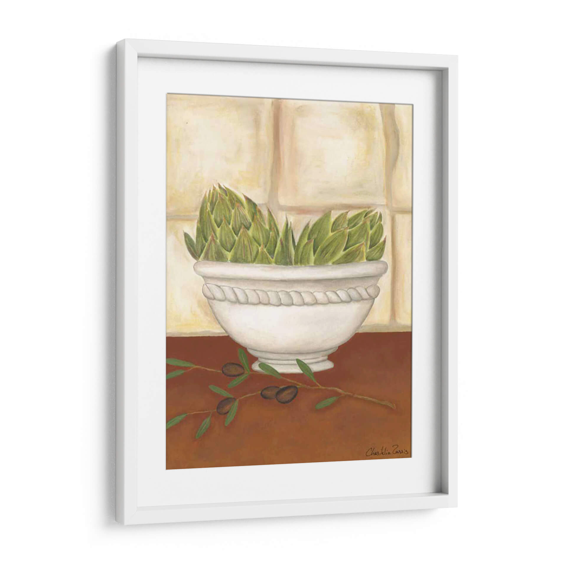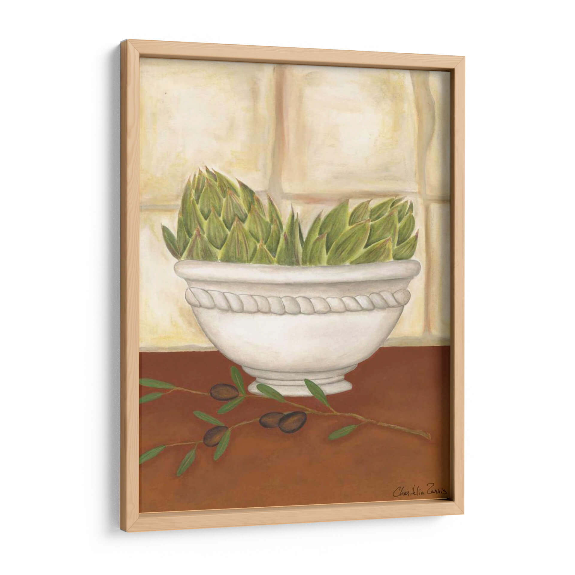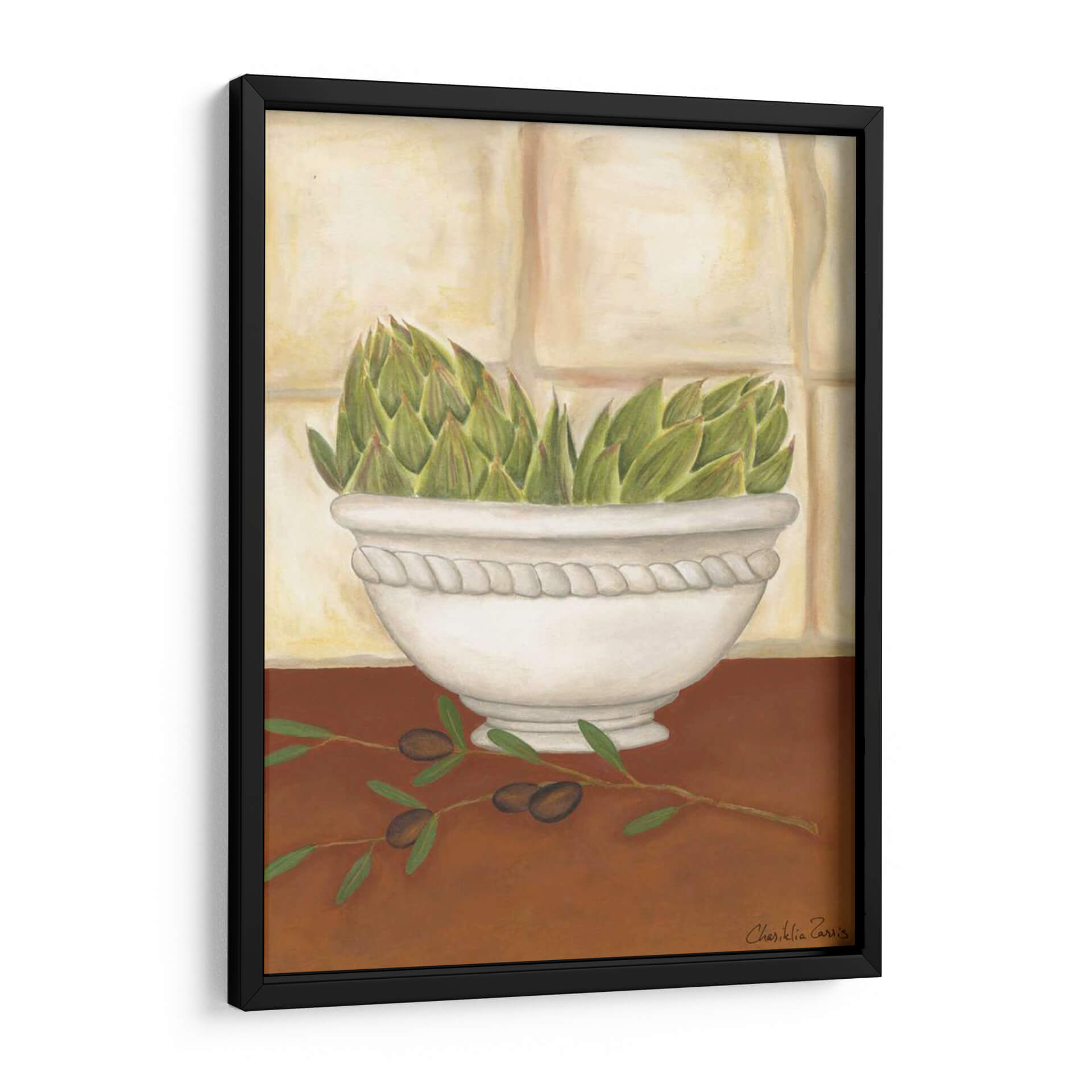 Inmortaliza la esencia de la campiña italiana en tu hogar con "Cosecha Toscana I", una cautivadora obra de arte de Chariklia Zarris. Este cuadro decorativo captura la frescura y la vitalidad de las alcachofas recién cosechadas, presentadas en una elegante vasija de terracota con un delicado relieve trenzado. La composición se enriquece con una rama de olivo, cuyas aceitunas oscuras y hojas verdes añaden un toque de autenticidad mediterránea. La paleta de colores, dominada por verdes vibrantes, tonos tierra cálidos y un fondo que evoca azulejos de cerámica desgastados por el tiempo, crea una atmósfera de serenidad rústica y elegancia atemporal. "Cosecha Toscana I" es más que una simple decoración de pared; es una ventana a la abundancia y la belleza de la naturaleza, ideal para infundir calidez y un aire de sofisticación campestre en tu cocina, comedor o cualquier espacio que desees realzar con un toque de sabor italiano. Añade esta pieza a tu colección y disfruta de su encanto evocador día tras día.