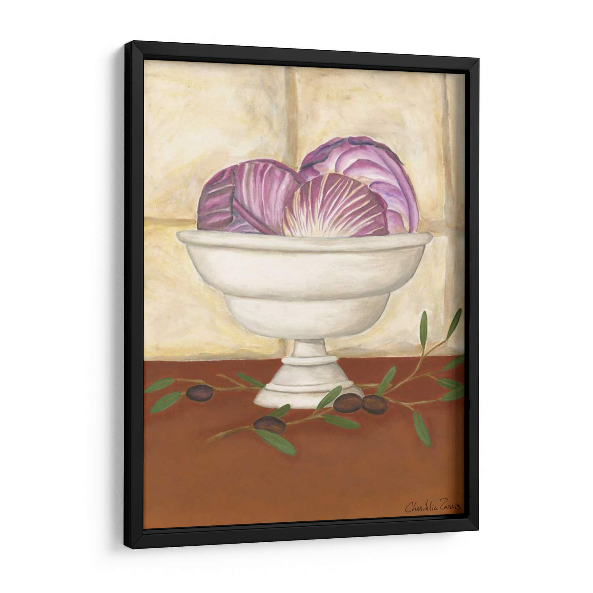Descubre la esencia de la campiña italiana con "Cosecha Toscana III", un cuadro decorativo que captura la belleza rústica de los productos frescos. La obra presenta un elegante cuenco blanco lleno de vibrantes cogollos de radicchio morado, cuyas hojas despliegan intrincados patrones de color y textura. La composición se enriquece con una rama de olivo cargada de aceitunas oscuras, que se extiende elegantemente sobre una superficie de tono terracota, evocando la calidez y la generosidad de la tierra toscana. El fondo, con sus sutiles matices cremosos y un patrón que recuerda a azulejos o estuco, aporta una sensación de profundidad y serenidad, creando una atmósfera acogedora y auténtica. Los colores, dominados por los ricos púrpuras del radicchio, los tonos cálidos de la tierra y los verdes naturales de las hojas de olivo, combinan armoniosamente para crear una pieza visualmente atractiva y llena de carácter. Este cuadro decorativo es perfecto para añadir un toque de elegancia campestre a tu cocina, comedor o cualquier espacio que desees llenar de vida y color. "Cosecha Toscana III" es más que una simple imagen; es una invitación a disfrutar de los placeres sencillos y la belleza natural.