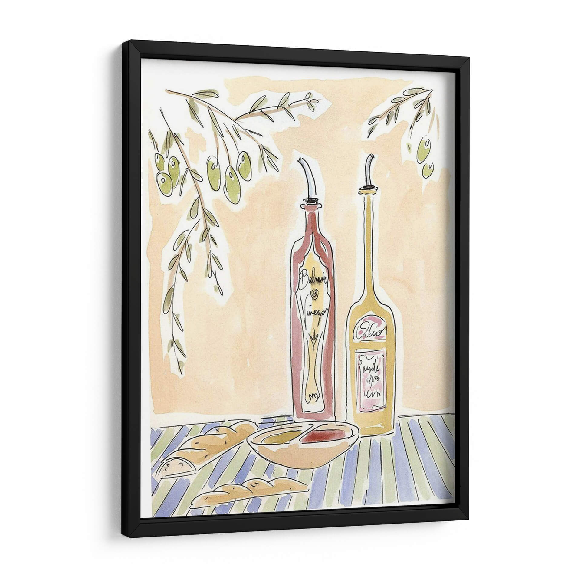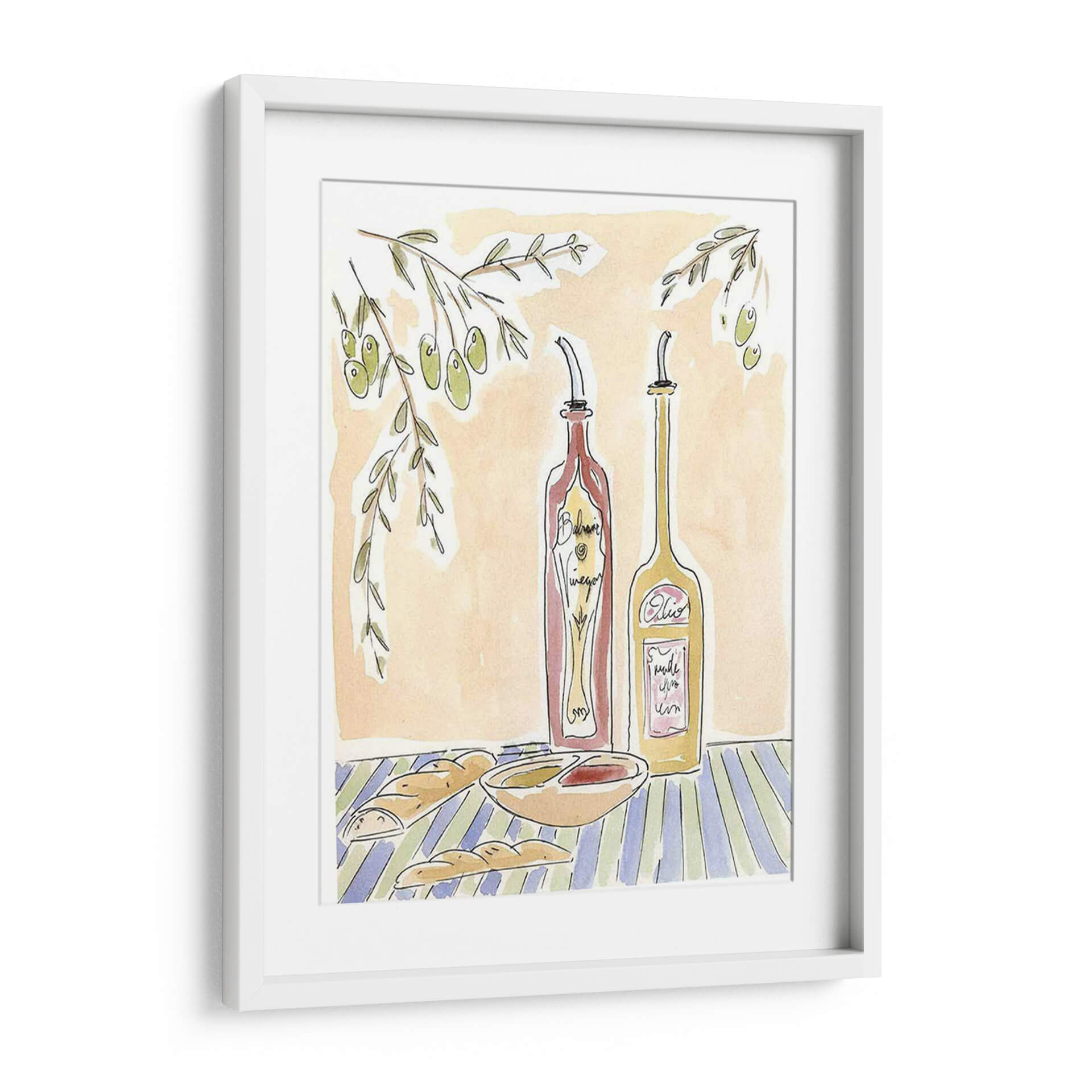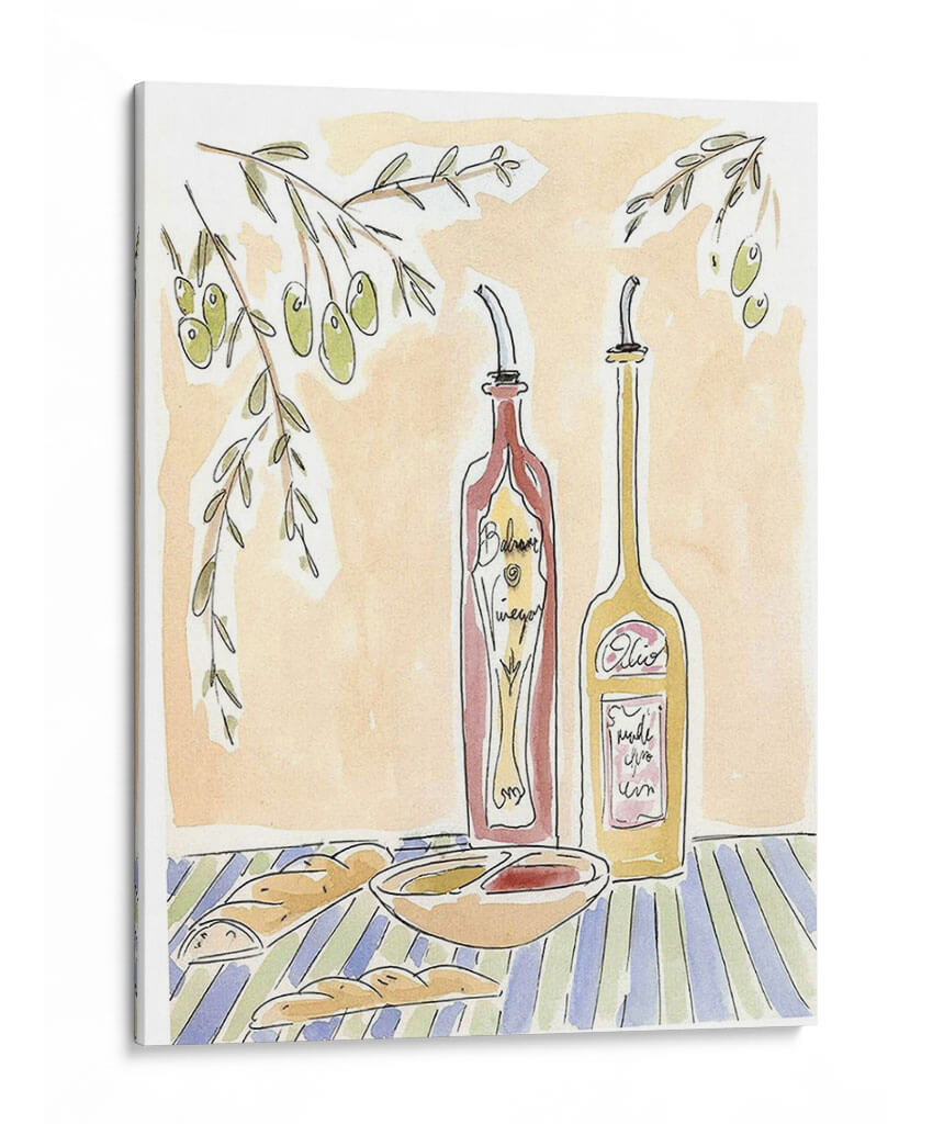 Sumérgete en la calidez de la cocina italiana con 'Olio Della Cucina Iv', una obra de arte que captura la esencia de una mesa rústica y acogedora. Este cuadro decorativo presenta una composición encantadora con dos botellas dispensadoras, una de vinagre balsámico y otra de aceite, junto a un cuenco de aderezo y panes crujientes, todo ello bajo la sombra de una rama de olivo. La paleta de colores cálidos, dominada por tonos tierra y acentos de verde y azul, evoca una atmósfera de serenidad y familiaridad, perfecta para cualquier espacio culinario o comedor. El estilo de ilustración, con trazos sueltos y acuarelados, añade un toque de autenticidad y arte manual, invitando a la contemplación y al disfrute de los placeres sencillos de la vida. 'Olio Della Cucina Iv' es ideal para quienes buscan infundir a su hogar un aire de trattoria italiana, aportando carácter y una sensación de bienestar. Este cuadro decorativo transformará tu cocina o comedor en un refugio de buen gusto y calidez, convirtiéndose en un punto focal que invita a la conversación y a la creación de memorias.