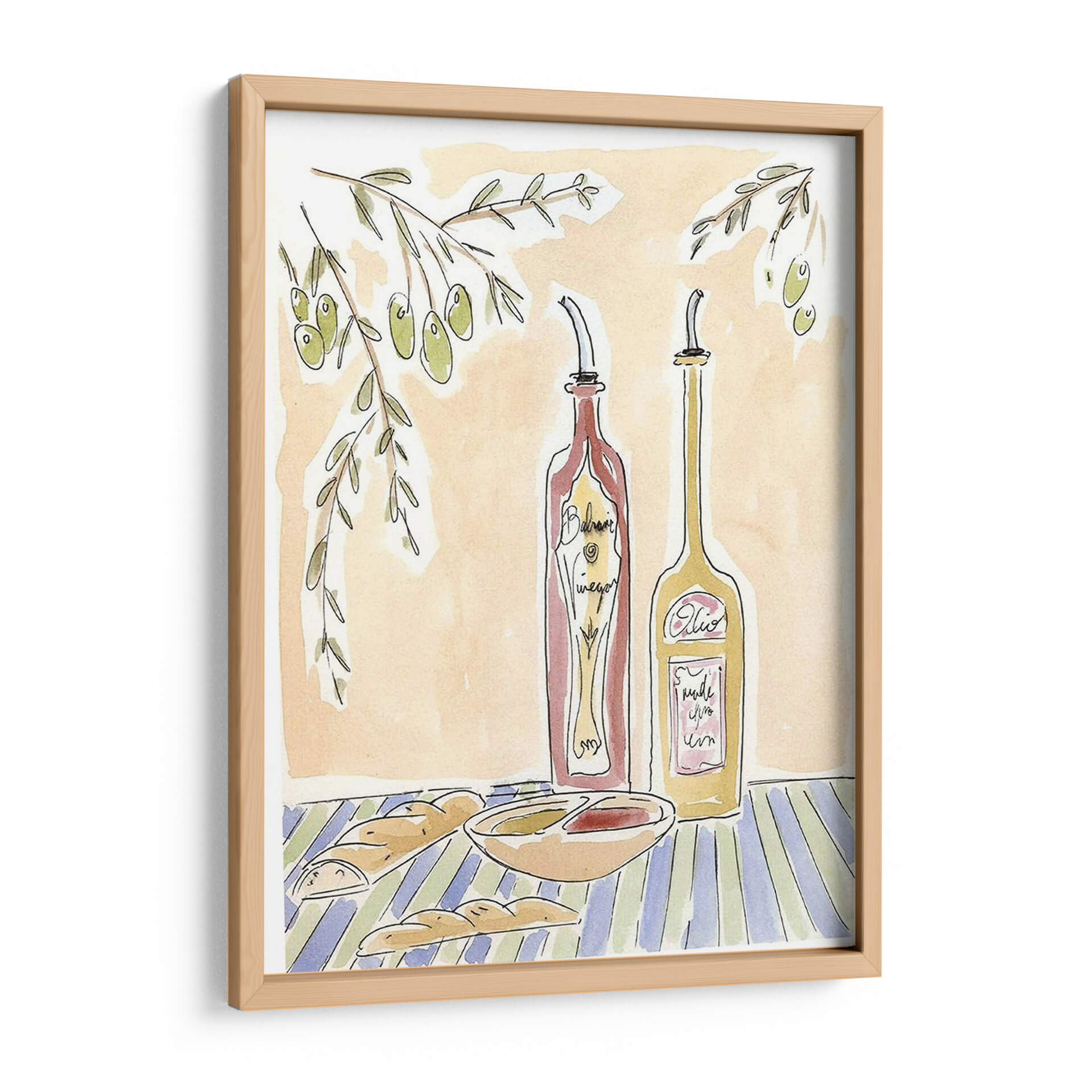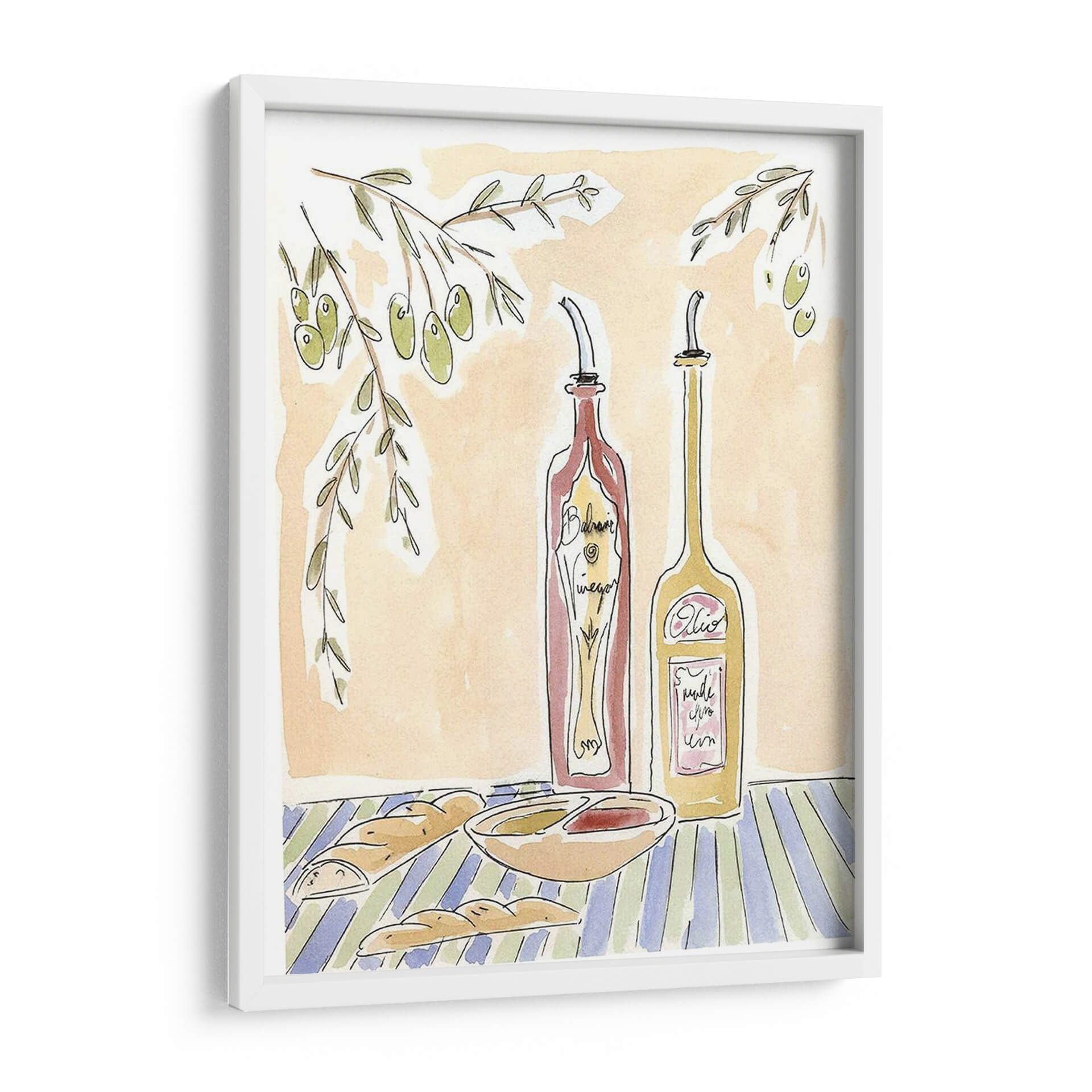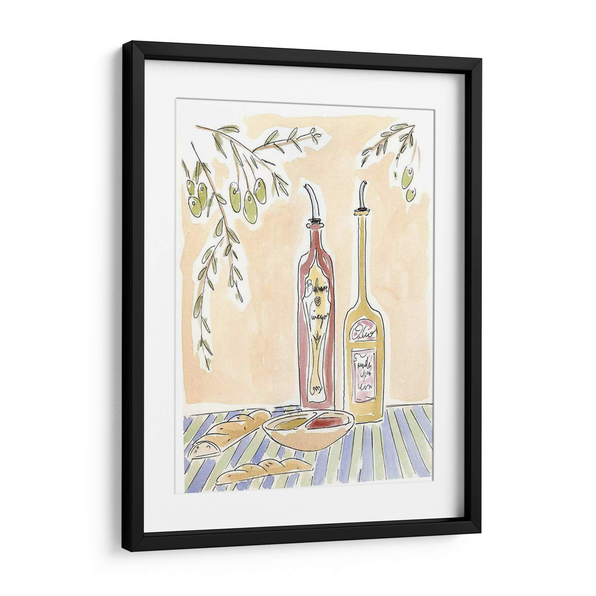 Sumérgete en la calidez de la cocina italiana con 'Olio Della Cucina Iv', una obra de arte que captura la esencia de una mesa rústica y acogedora. Este cuadro decorativo presenta una composición encantadora con dos botellas dispensadoras, una de vinagre balsámico y otra de aceite, junto a un cuenco de aderezo y panes crujientes, todo ello bajo la sombra de una rama de olivo. La paleta de colores cálidos, dominada por tonos tierra y acentos de verde y azul, evoca una atmósfera de serenidad y familiaridad, perfecta para cualquier espacio culinario o comedor. El estilo de ilustración, con trazos sueltos y acuarelados, añade un toque de autenticidad y arte manual, invitando a la contemplación y al disfrute de los placeres sencillos de la vida. 'Olio Della Cucina Iv' es ideal para quienes buscan infundir a su hogar un aire de trattoria italiana, aportando carácter y una sensación de bienestar. Este cuadro decorativo transformará tu cocina o comedor en un refugio de buen gusto y calidez, convirtiéndose en un punto focal que invita a la conversación y a la creación de memorias.