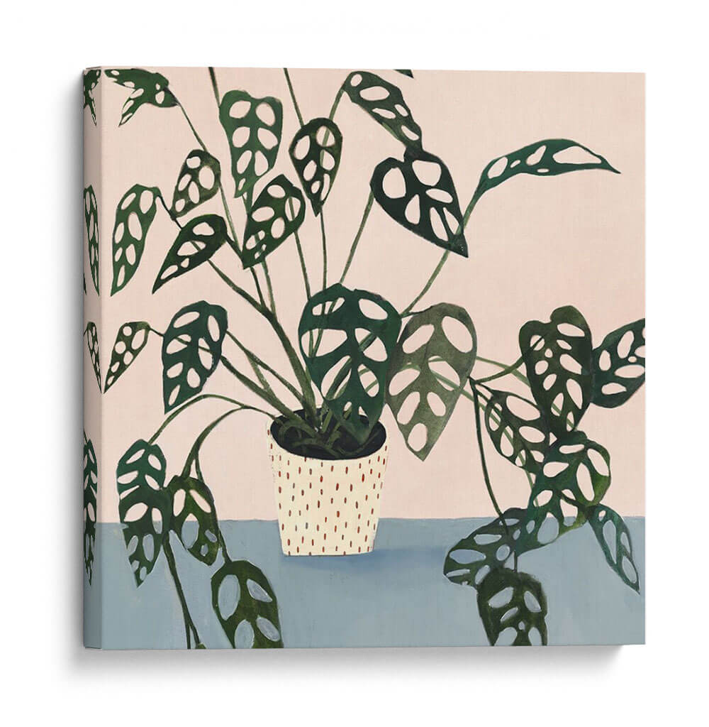 Embellece tu espacio con la serenidad botánica de 'Planta De Interior I', una cautivadora obra de arte de Victoria Borges. Esta pieza presenta una exuberante planta de Monstera Adansonii, capturada con un estilo contemporáneo y detallado que evoca la frescura de la naturaleza. La paleta de colores, dominada por verdes profundos de las hojas, contrasta suavemente con un fondo en tonos pastel rosados y una base azul grisáceo, creando una atmósfera de calma y sofisticación. Las hojas perforadas, representadas con trazos delicados y precisos, añaden una textura visual intrigante y un toque de elegancia orgánica. Este cuadro decorativo es perfecto para infundir vida y tranquilidad en cualquier habitación, ya sea una sala de estar moderna, un dormitorio acogedor o un espacio de oficina que necesite un respiro natural. La composición equilibrada y el enfoque en la belleza intrínseca de la planta la convierten en una adición versátil y atemporal a tu decoración, invitando a la contemplación y al bienestar. Descubre cómo el arte de Victoria Borges puede transformar tu hogar en un santuario de estilo y armonía.