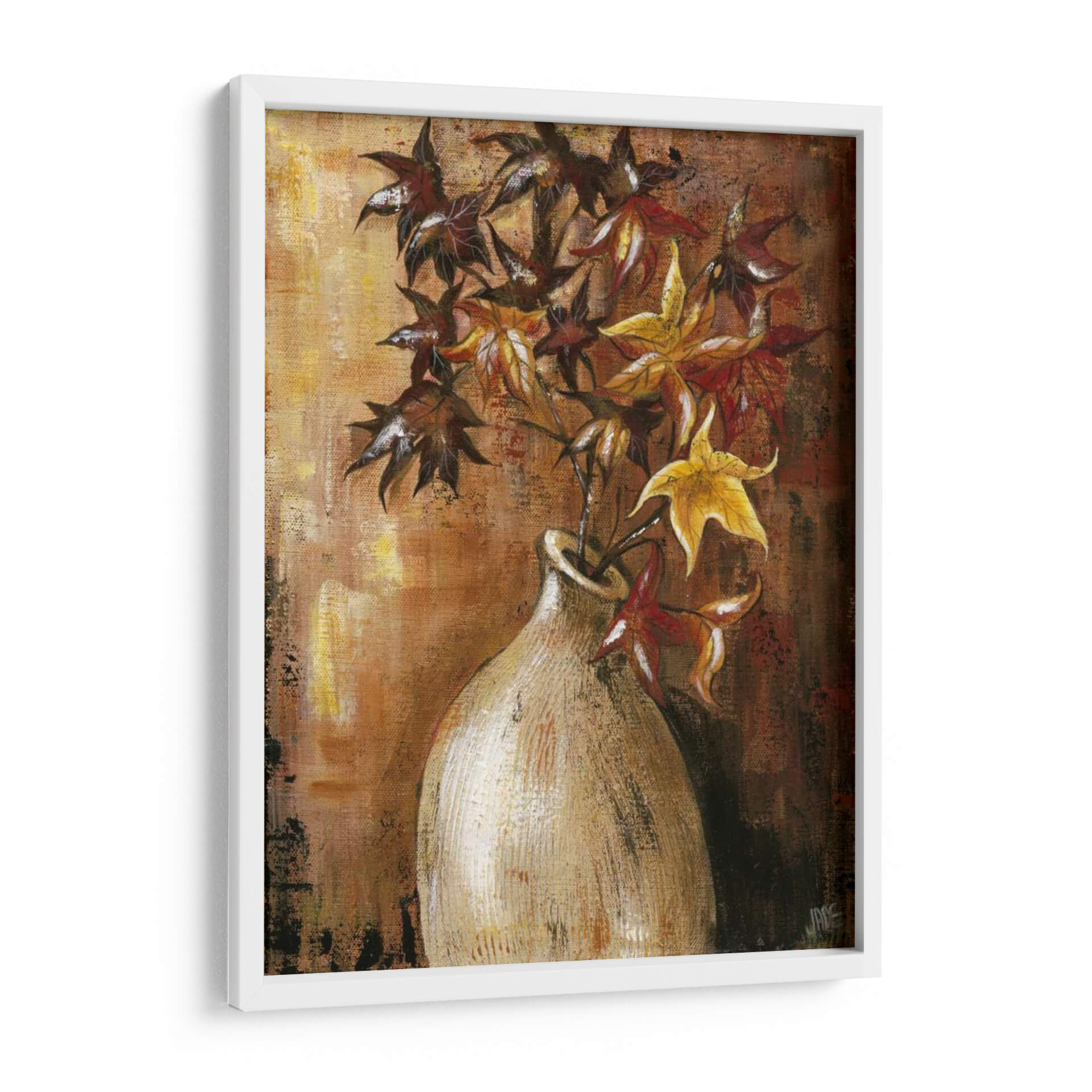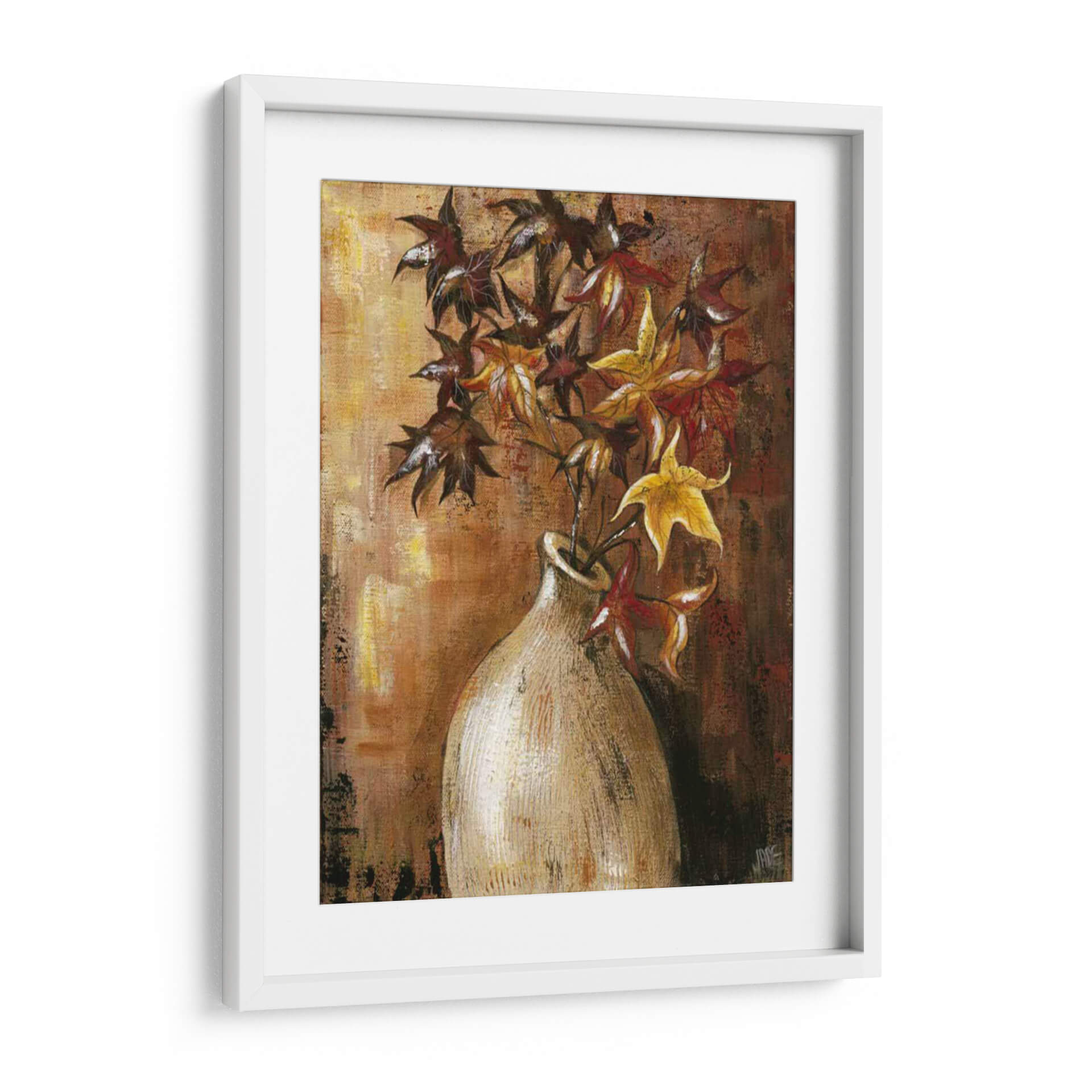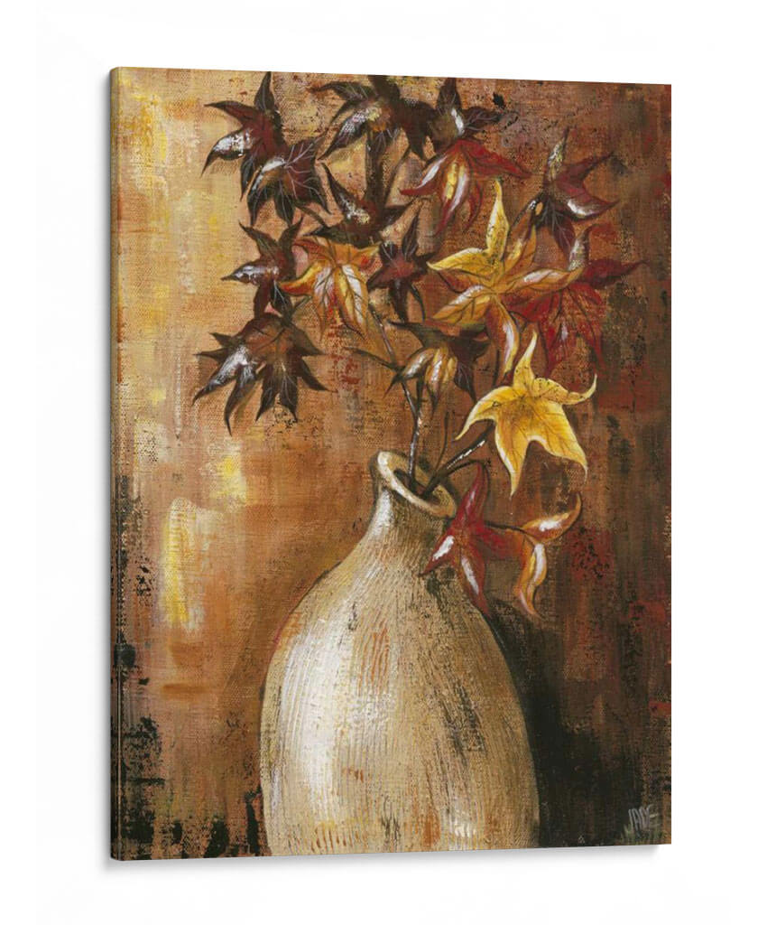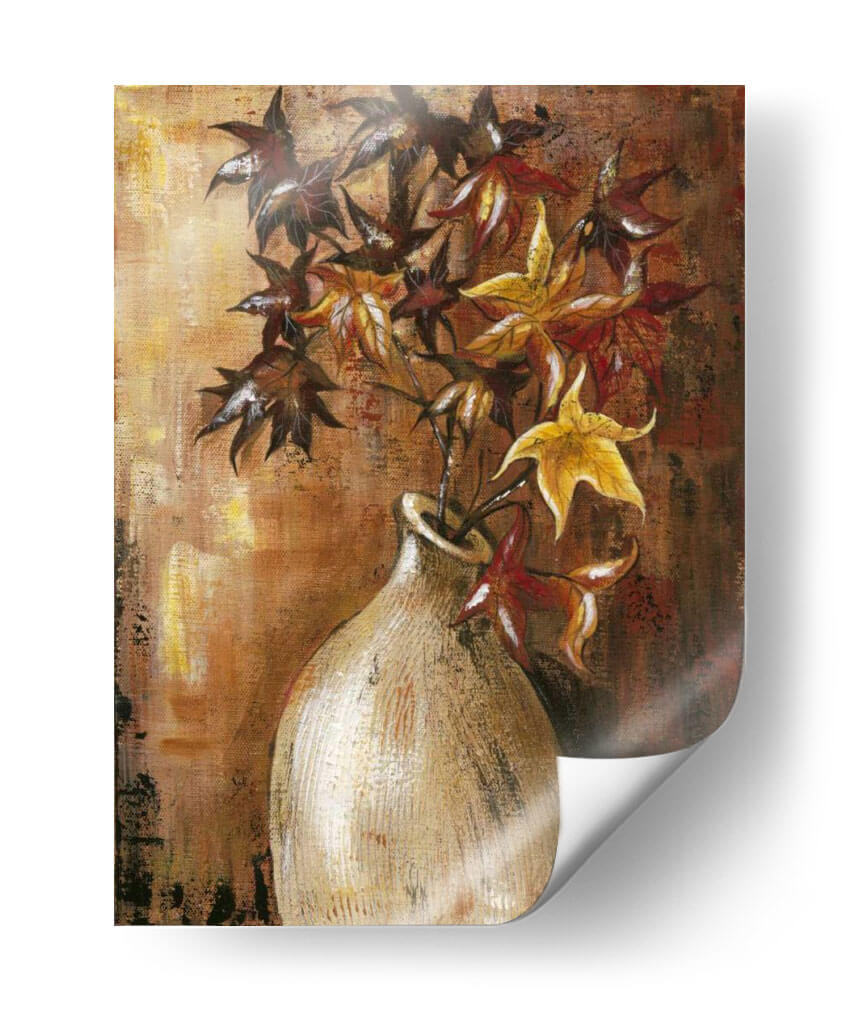 Sumérgete en la calidez y la textura de "Ramas en el Jarrón II", una obra de arte contemporáneo de Jade Reynolds que captura la esencia del otoño con una paleta de colores rica y terrosa. Este cuadro decorativo presenta un arreglo floral estilizado, donde las hojas, en tonos profundos de carmesí, ocre y dorado, se elevan desde un jarrón de cerámica de apariencia rústica. La técnica pictórica, con pinceladas visibles y un acabado texturizado, añade profundidad y un carácter orgánico a la composición. El fondo, trabajado en capas de marrones y dorados, evoca la luz cálida de una tarde otoñal, creando una atmósfera acogedora y serena. "Ramas en el Jarrón II" es una pieza versátil, perfecta para añadir un toque de naturaleza y sofisticación a cualquier espacio, desde una sala de estar moderna hasta un rincón tranquilo en un estudio u oficina. Su estilo artístico, que combina elementos figurativos con una ejecución expresionista, lo convierte en un punto focal cautivador sin ser abrumador. Ideal para quienes buscan infundir sus ambientes con una sensación de calma, elegancia atemporal y la belleza efímera de la estación.