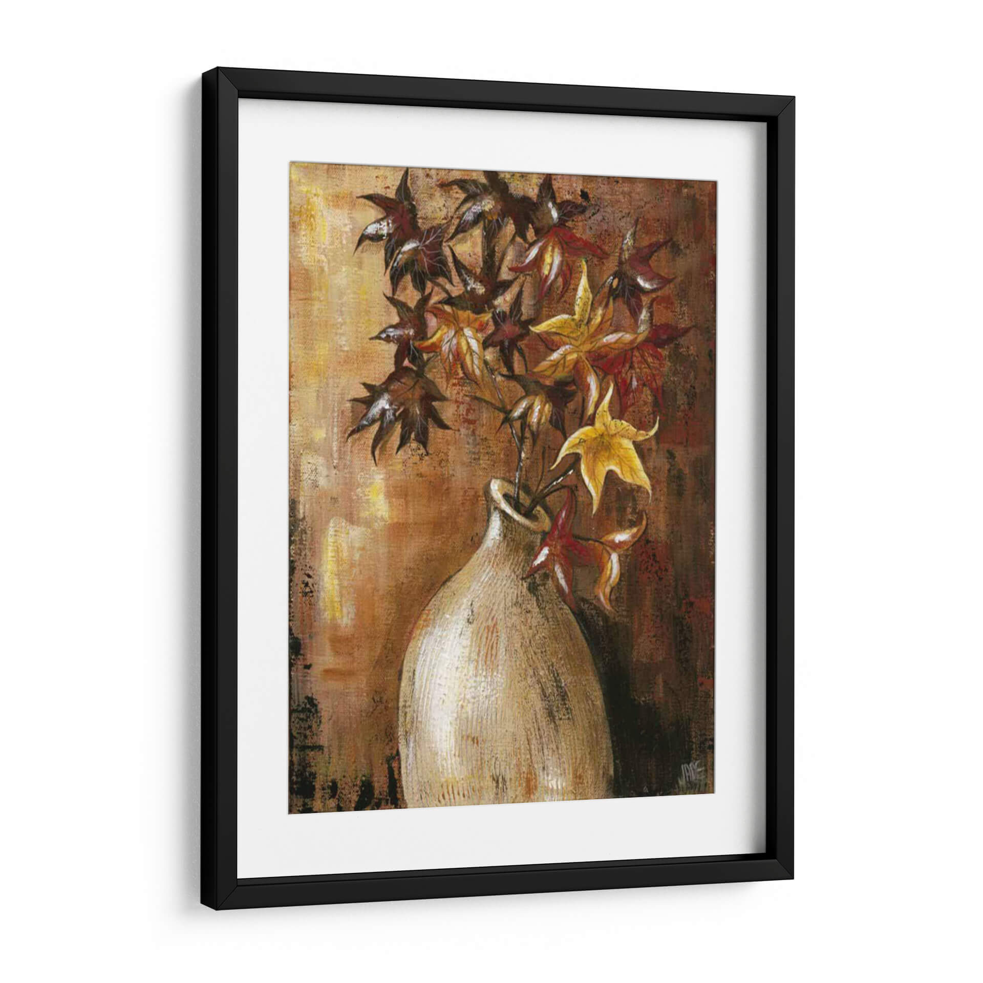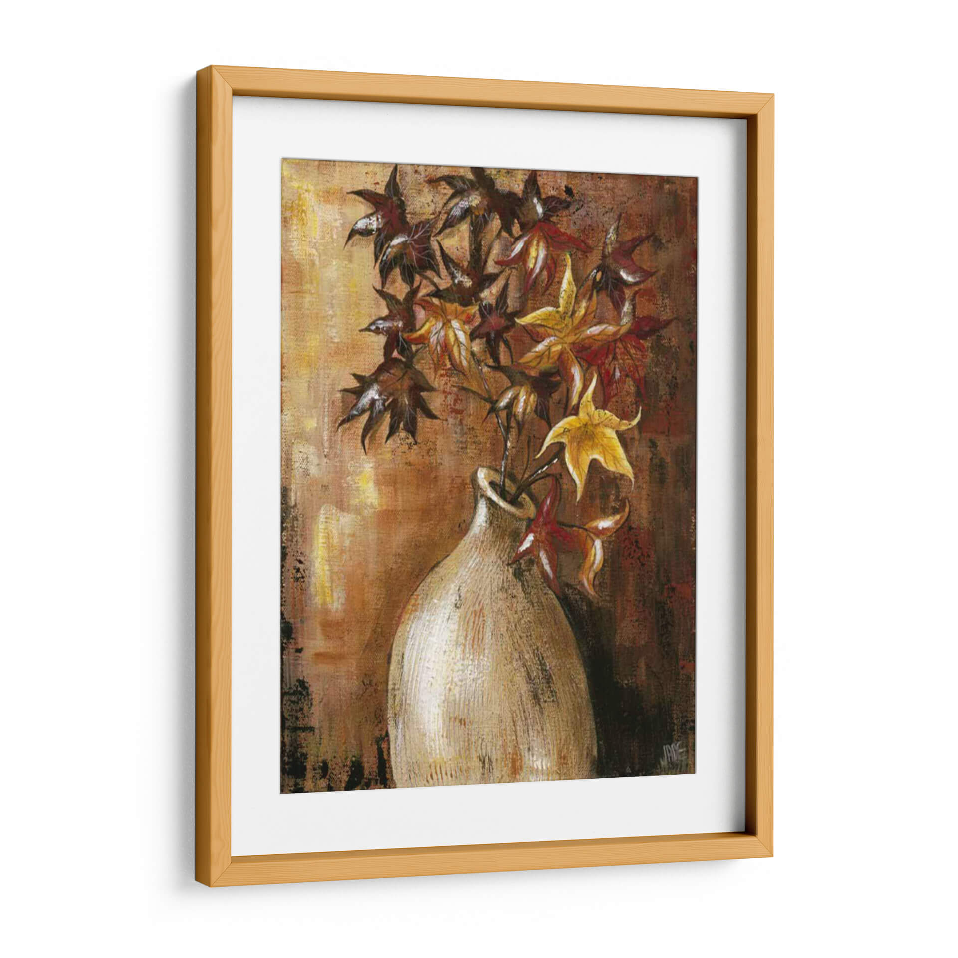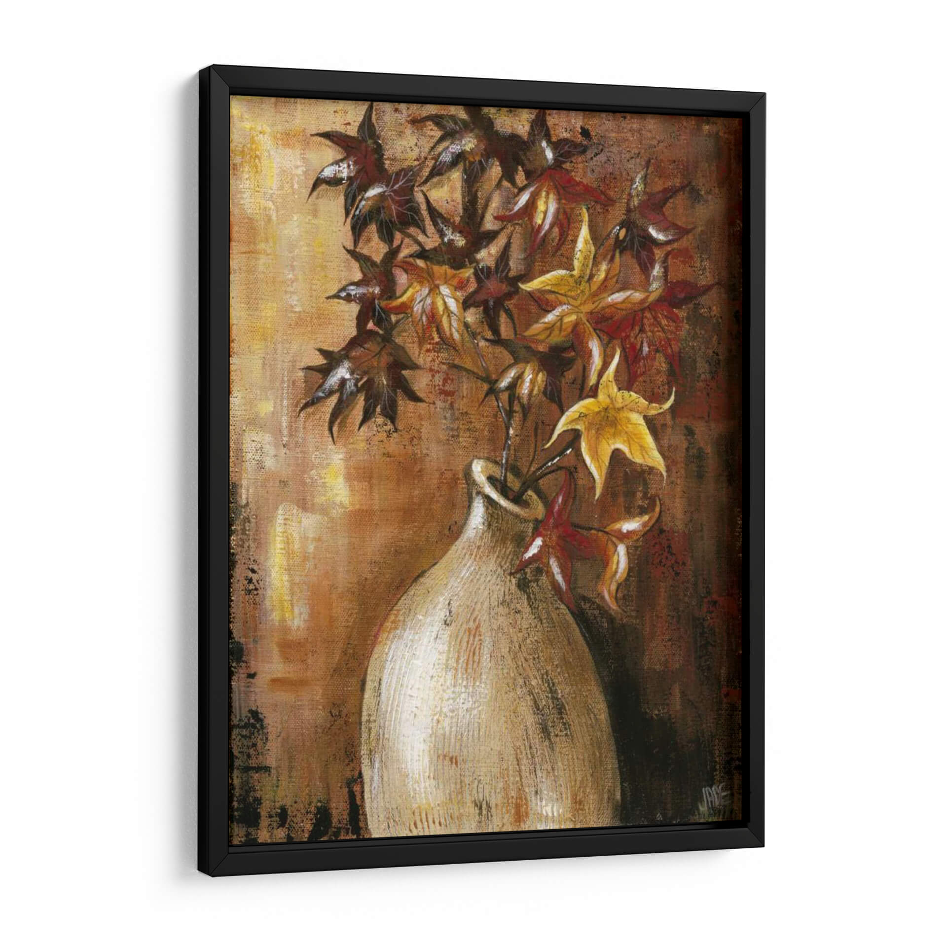 Sumérgete en la calidez y la textura de "Ramas en el Jarrón II", una obra de arte contemporáneo de Jade Reynolds que captura la esencia del otoño con una paleta de colores rica y terrosa. Este cuadro decorativo presenta un arreglo floral estilizado, donde las hojas, en tonos profundos de carmesí, ocre y dorado, se elevan desde un jarrón de cerámica de apariencia rústica. La técnica pictórica, con pinceladas visibles y un acabado texturizado, añade profundidad y un carácter orgánico a la composición. El fondo, trabajado en capas de marrones y dorados, evoca la luz cálida de una tarde otoñal, creando una atmósfera acogedora y serena. "Ramas en el Jarrón II" es una pieza versátil, perfecta para añadir un toque de naturaleza y sofisticación a cualquier espacio, desde una sala de estar moderna hasta un rincón tranquilo en un estudio u oficina. Su estilo artístico, que combina elementos figurativos con una ejecución expresionista, lo convierte en un punto focal cautivador sin ser abrumador. Ideal para quienes buscan infundir sus ambientes con una sensación de calma, elegancia atemporal y la belleza efímera de la estación.