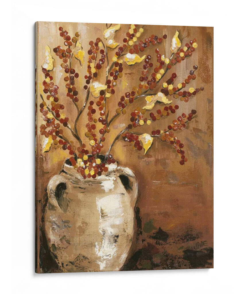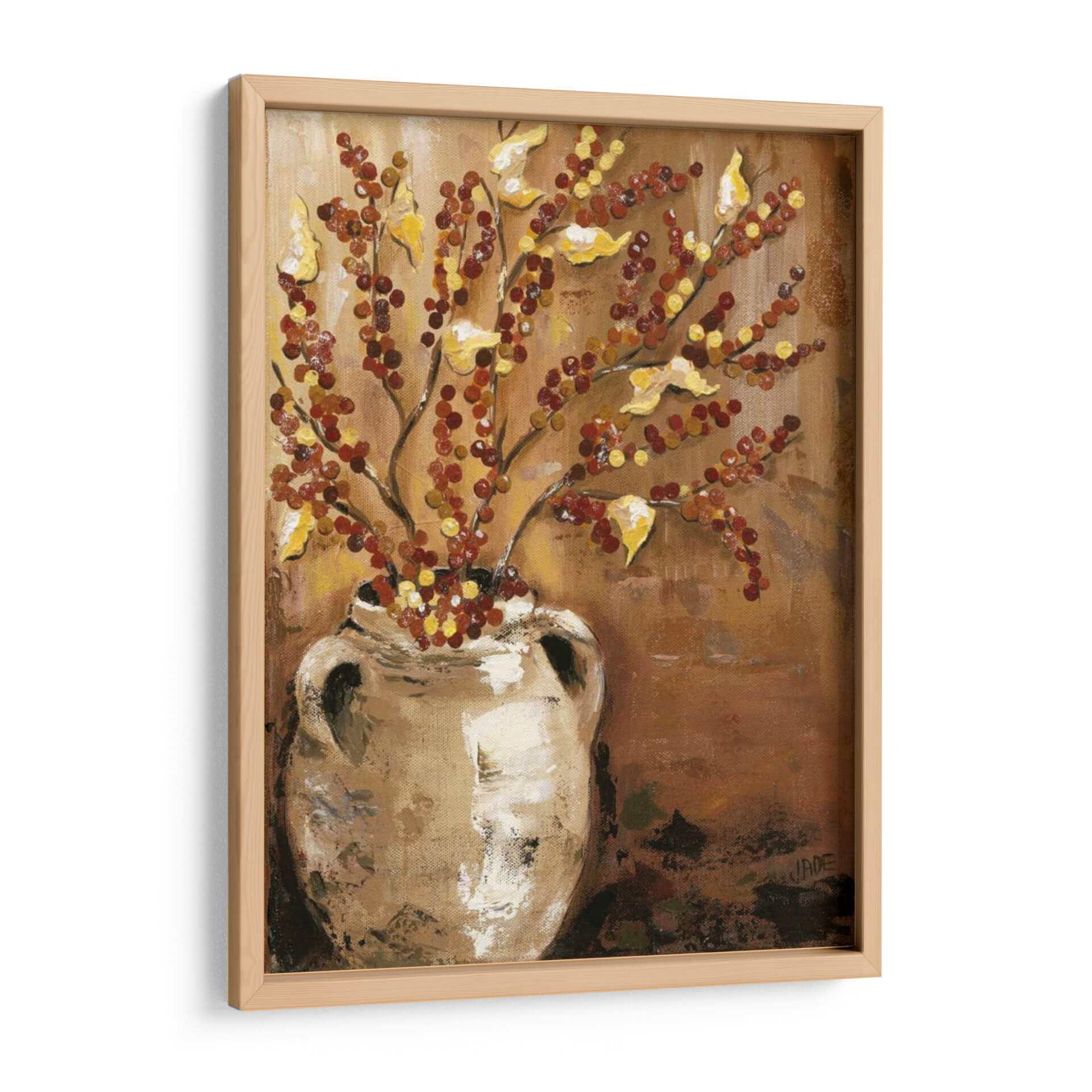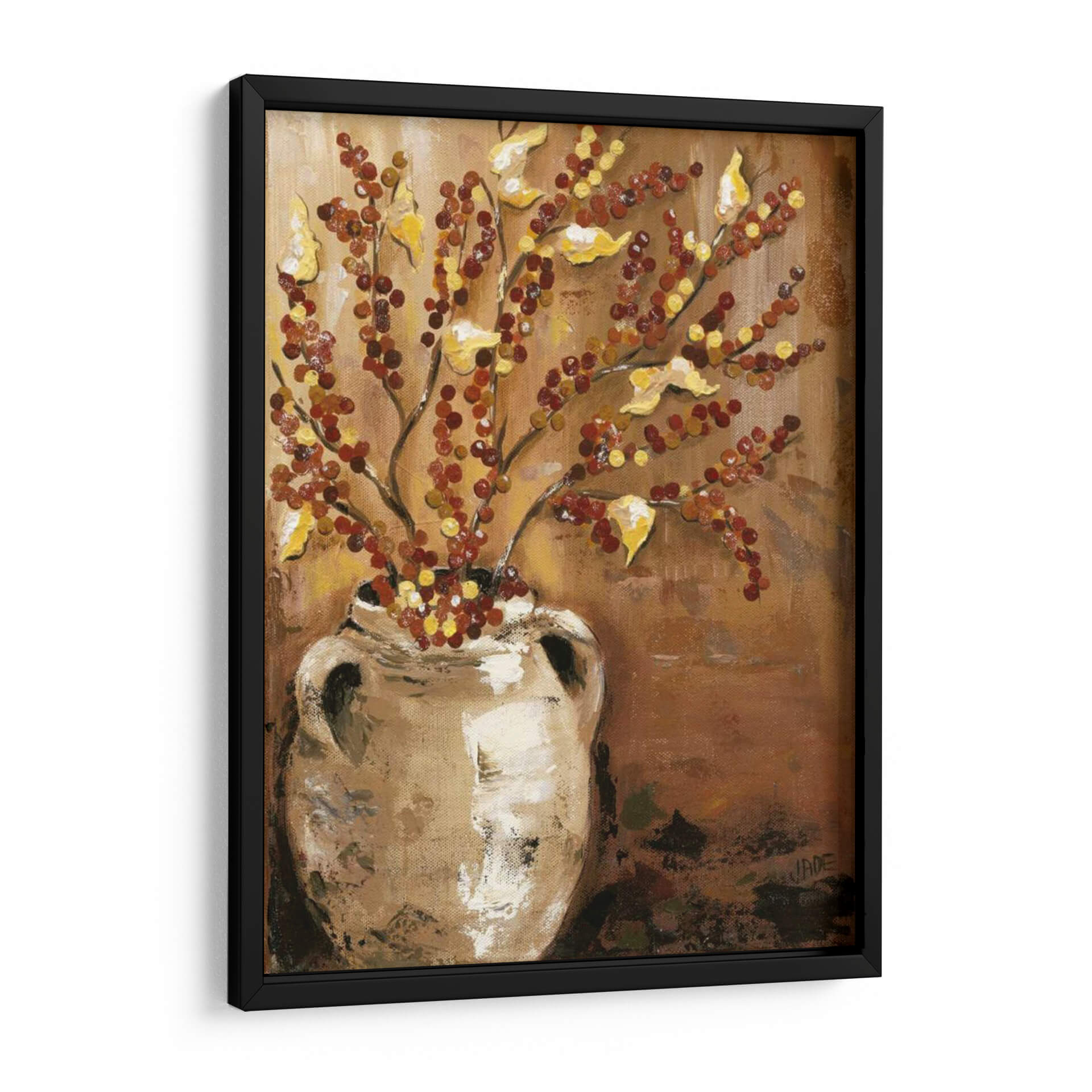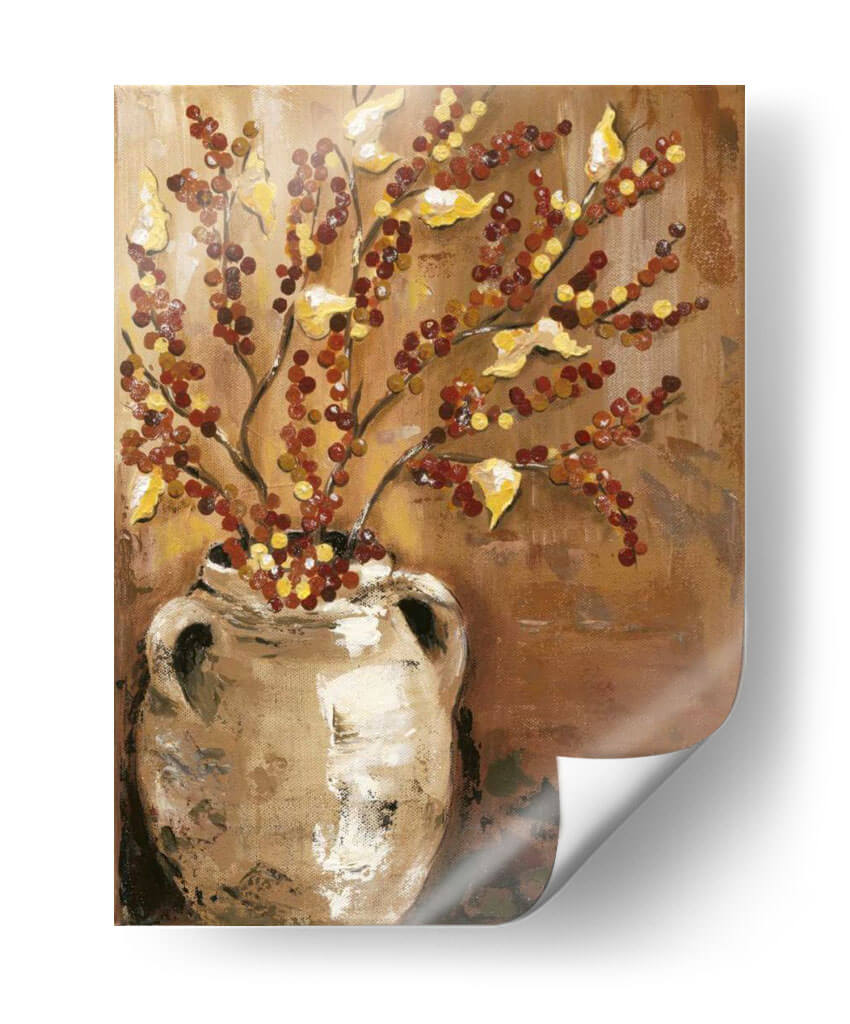 Sumérgete en la calidez y la belleza otoñal con "Ramas En Jarrón I", una obra de arte de Jade Reynolds que captura la esencia de la naturaleza en su máxima expresión. Este cuadro decorativo presenta un ramillete de ramas delicadas cargadas de bayas en tonos rojizos y amarillos vibrantes, contrastando sutilmente con las hojas de un tono mostaza pálido. La composición se centra en un jarrón rústico de gran tamaño, con una textura que evoca la cerámica artesanal, sirviendo como base terrosa para la exuberante vegetación. La paleta de colores, dominada por marrones cálidos, ocres y toques de burdeos, crea una atmósfera acogedora y serena, perfecta para cualquier rincón de tu hogar u oficina. El estilo pictórico, con pinceladas expresivas y un enfoque en la textura, otorga profundidad y vida a la pieza, invitando al espectador a contemplar la delicadeza de las formas y la riqueza cromática. Ideal para espacios que buscan un toque de elegancia natural y un ambiente de tranquilidad, este cuadro es una invitación a la contemplación y al disfrute de la belleza efímera de las estaciones. Añade una nota de sofisticación rústica a tu decoración con esta pieza única.