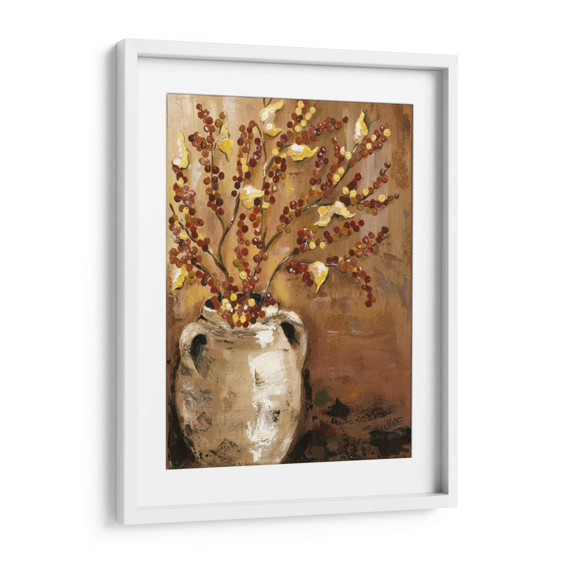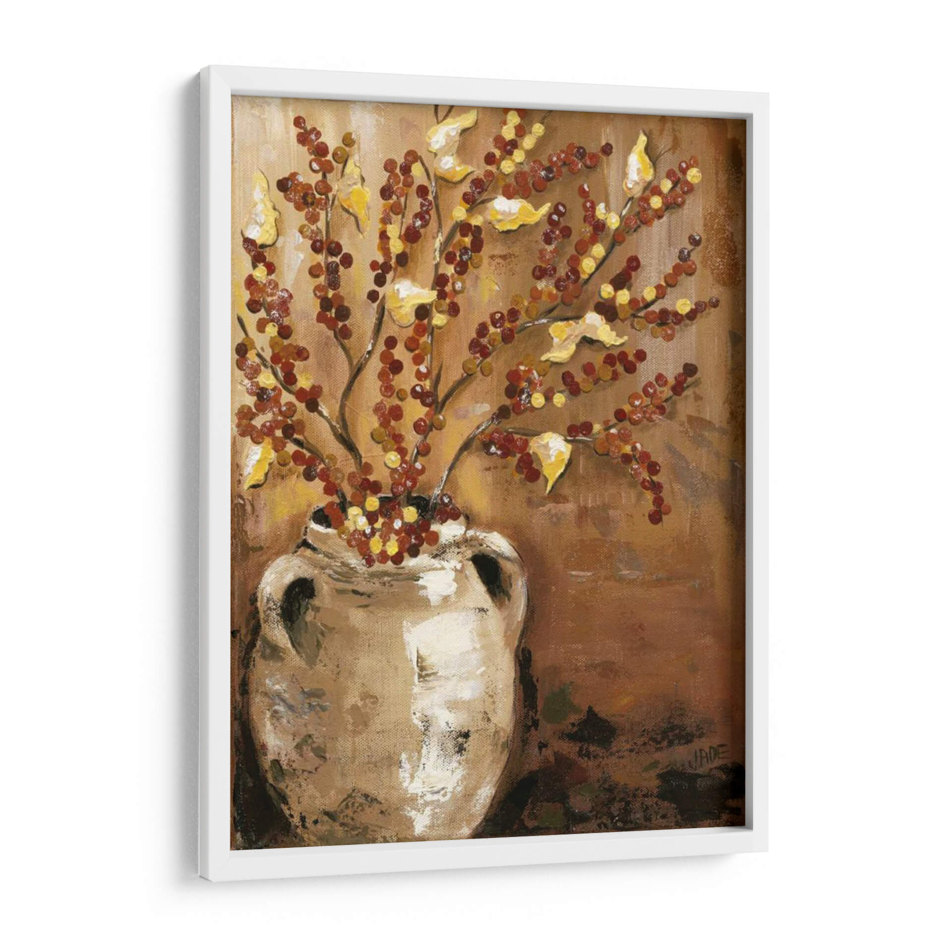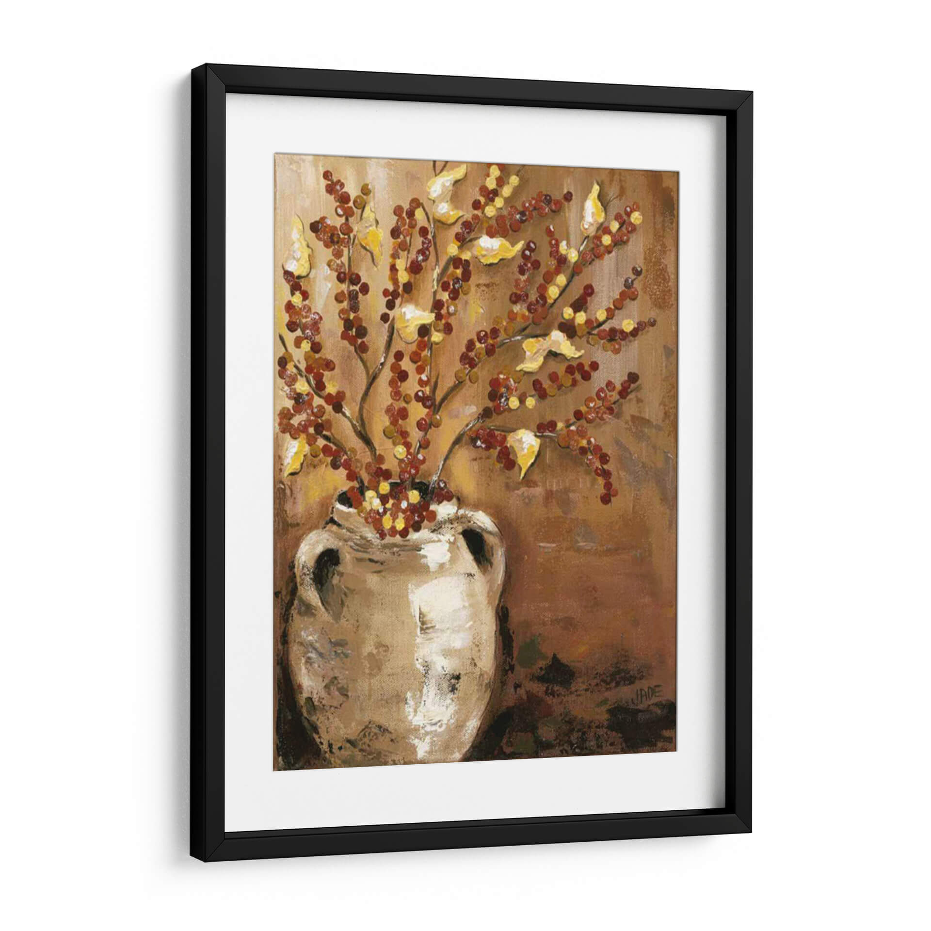 Sumérgete en la calidez y la belleza otoñal con "Ramas En Jarrón I", una obra de arte de Jade Reynolds que captura la esencia de la naturaleza en su máxima expresión. Este cuadro decorativo presenta un ramillete de ramas delicadas cargadas de bayas en tonos rojizos y amarillos vibrantes, contrastando sutilmente con las hojas de un tono mostaza pálido. La composición se centra en un jarrón rústico de gran tamaño, con una textura que evoca la cerámica artesanal, sirviendo como base terrosa para la exuberante vegetación. La paleta de colores, dominada por marrones cálidos, ocres y toques de burdeos, crea una atmósfera acogedora y serena, perfecta para cualquier rincón de tu hogar u oficina. El estilo pictórico, con pinceladas expresivas y un enfoque en la textura, otorga profundidad y vida a la pieza, invitando al espectador a contemplar la delicadeza de las formas y la riqueza cromática. Ideal para espacios que buscan un toque de elegancia natural y un ambiente de tranquilidad, este cuadro es una invitación a la contemplación y al disfrute de la belleza efímera de las estaciones. Añade una nota de sofisticación rústica a tu decoración con esta pieza única.