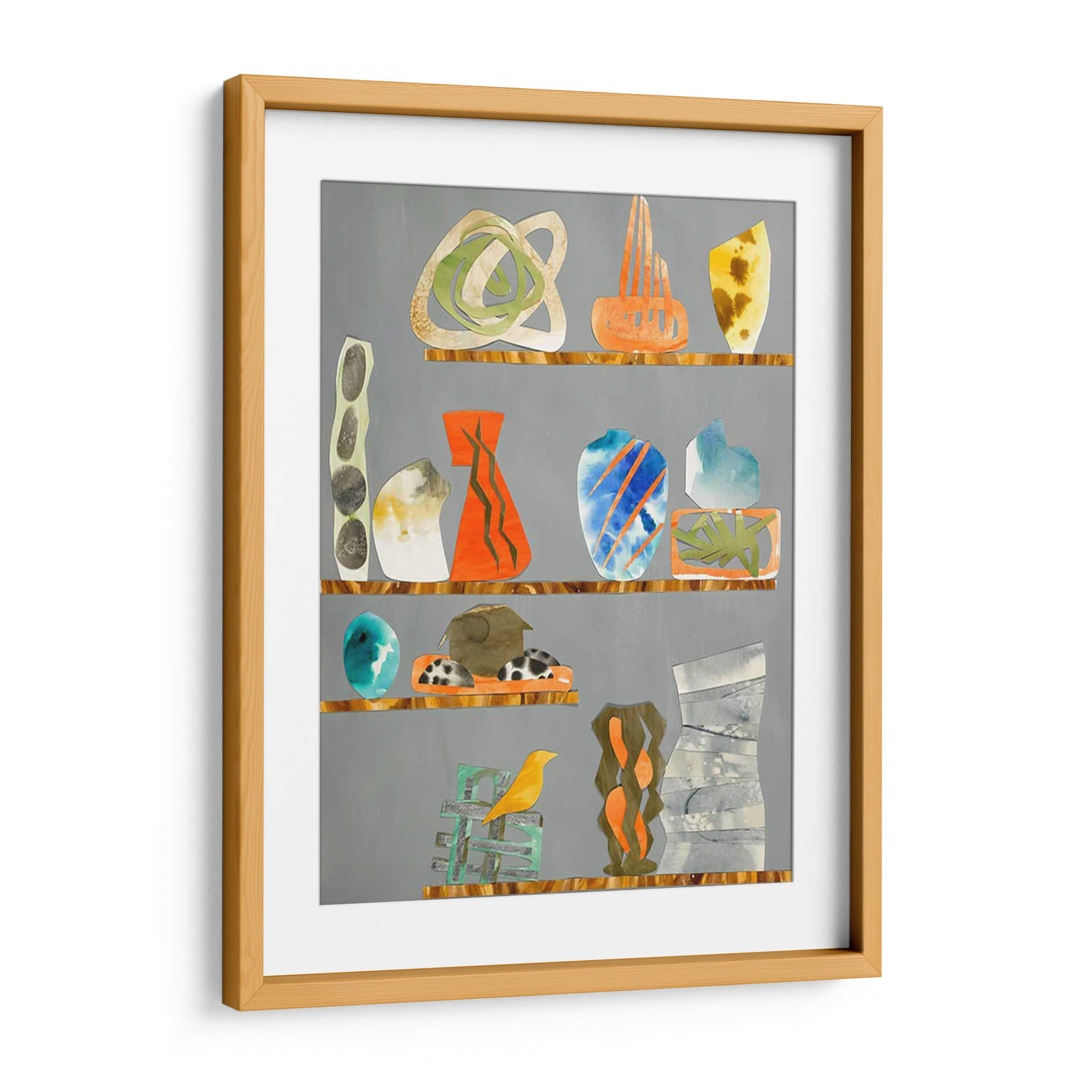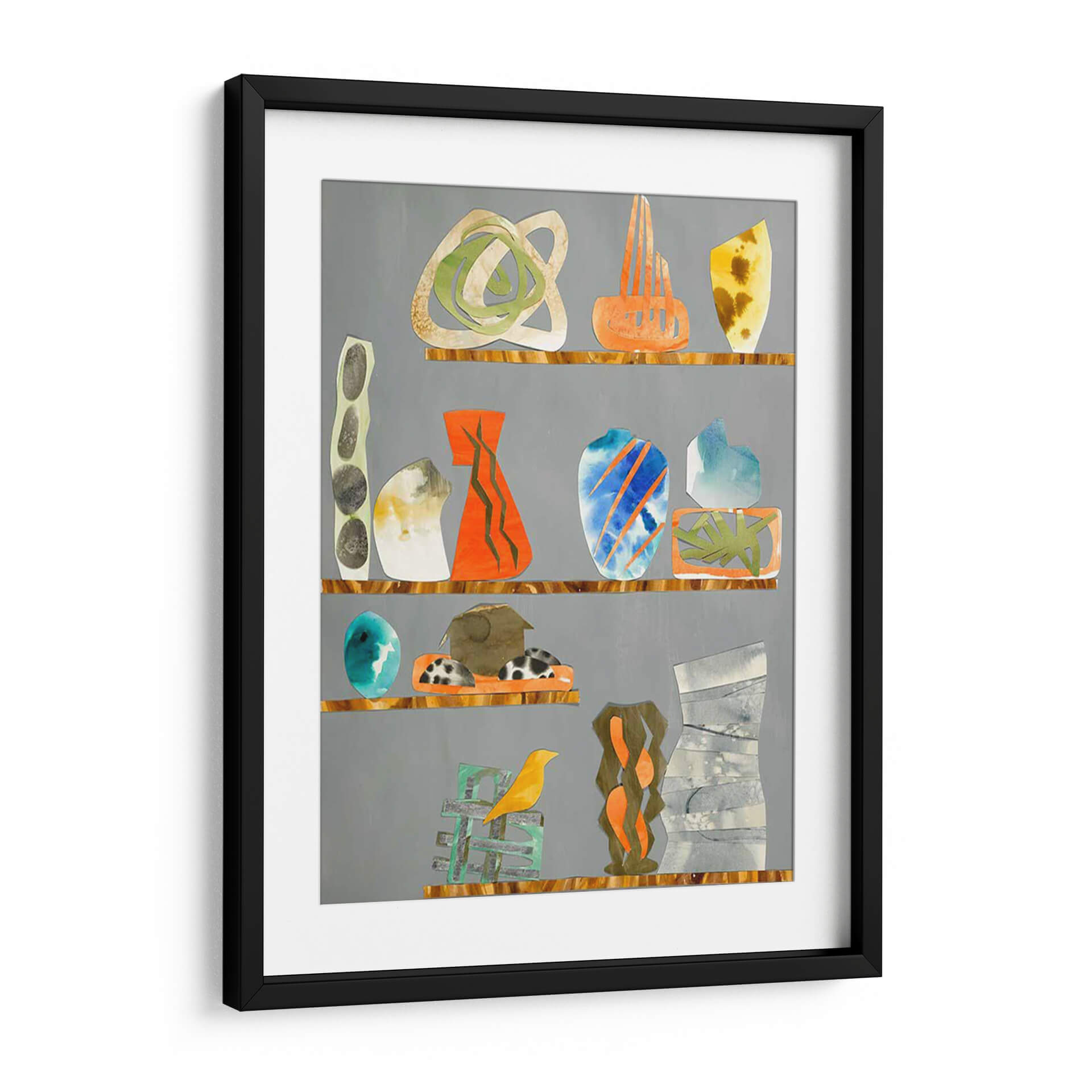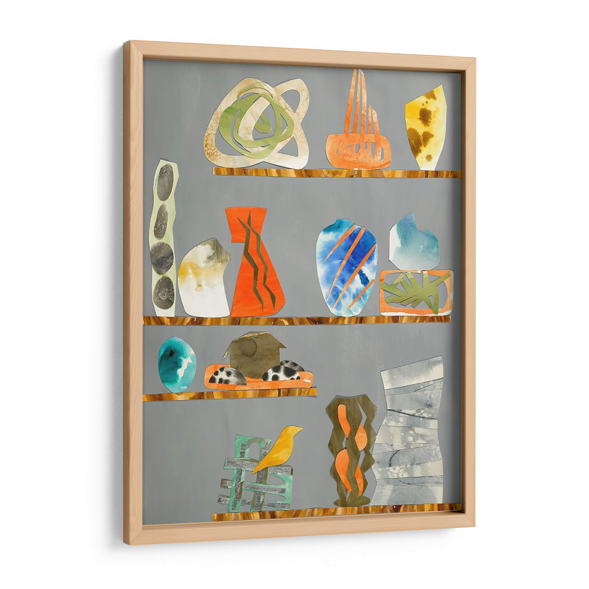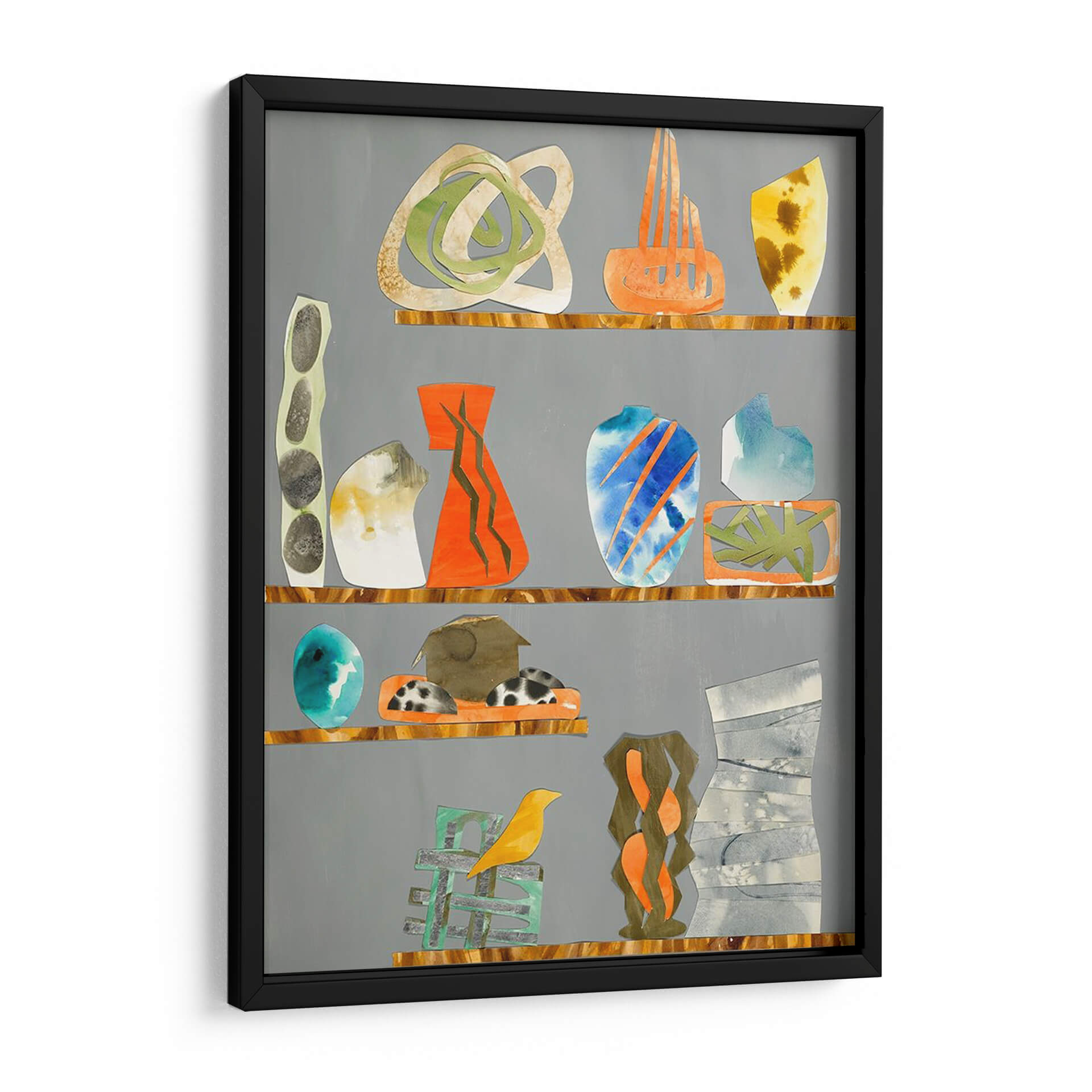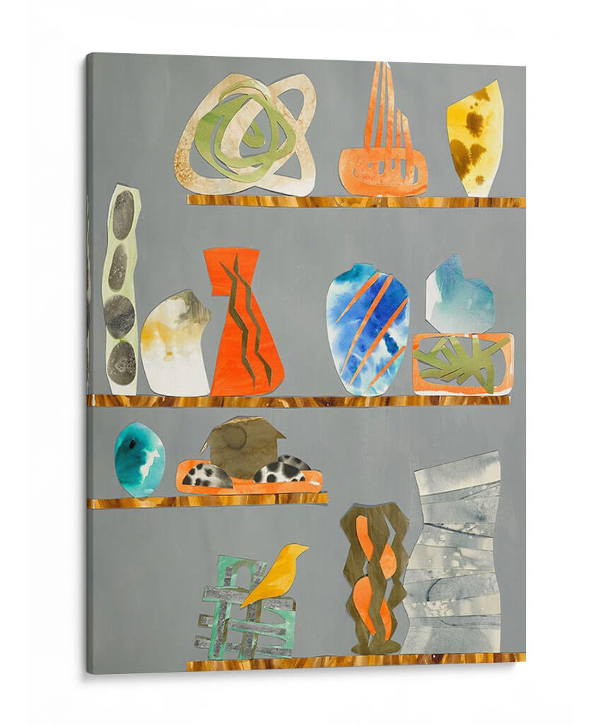 Sumérgete en el encanto ecléctico de 'Tinkets 1', una obra de arte contemporáneo que evoca la sensación de una colección cuidadosamente curada. Esta pieza presenta una serie de objetos abstractos y estilizados, reminiscentes de jarrones, esculturas y formas orgánicas, dispuestos en estantes que rompen la monotonía del fondo gris. La paleta de colores es vibrante y variada, con toques audaces de naranja, azul eléctrico y verde, contrastando armoniosamente con tonos tierra, grises y blanco, creando un equilibrio visual dinámico. Las texturas sutiles y las formas fluidas invitan a la contemplación, sugiriendo una narrativa visual única para cada observador. El estilo, una mezcla de collage y abstracción, aporta una modernidad distintiva. 'Tinkets 1' es ideal para infundir personalidad y un toque artístico a cualquier espacio, desde una sala de estar moderna hasta un estudio creativo u oficina, convirtiéndose en un punto focal que inspira conversación y admiración. Añade este cuadro decorativo a tu colección y transforma tu hogar en una galería personal.