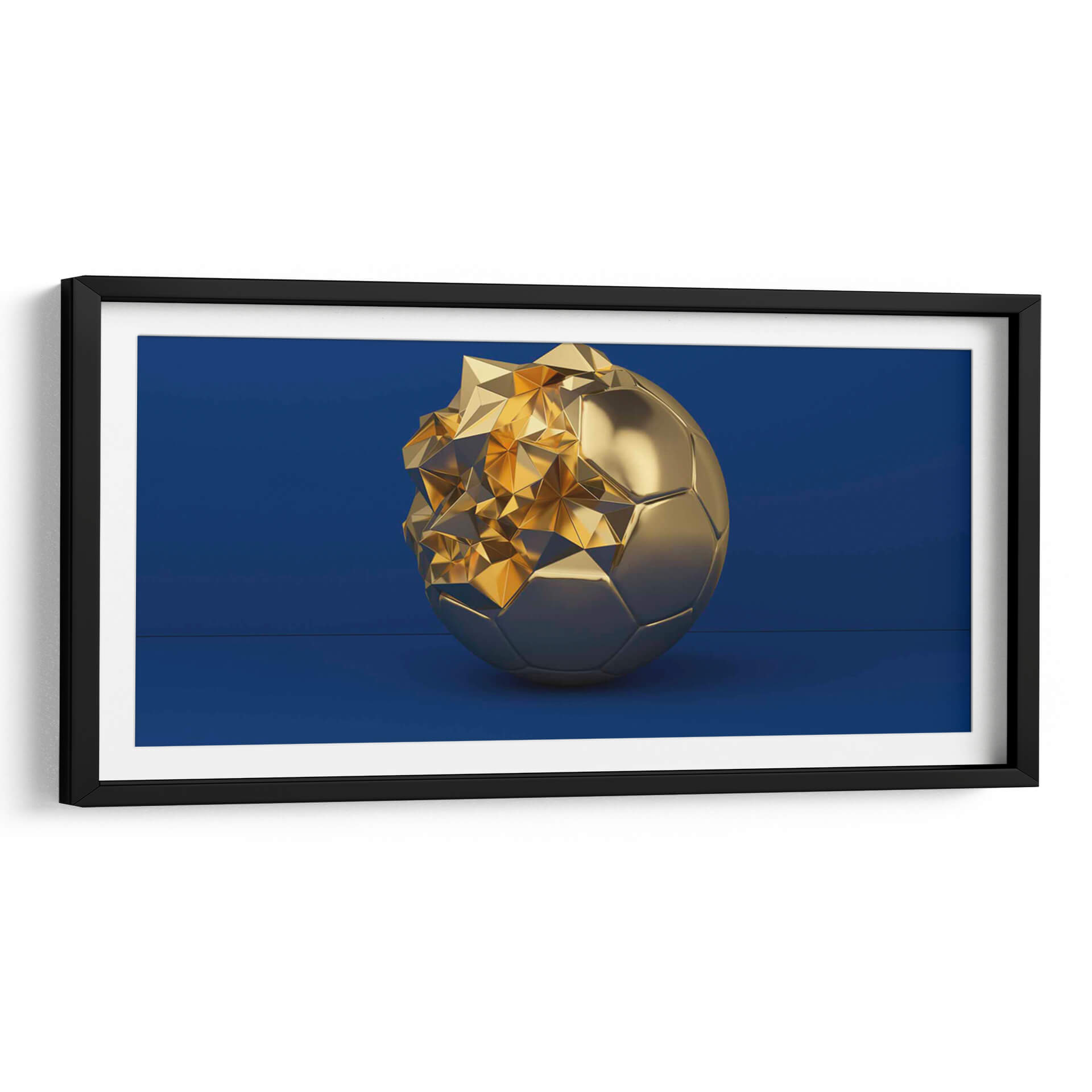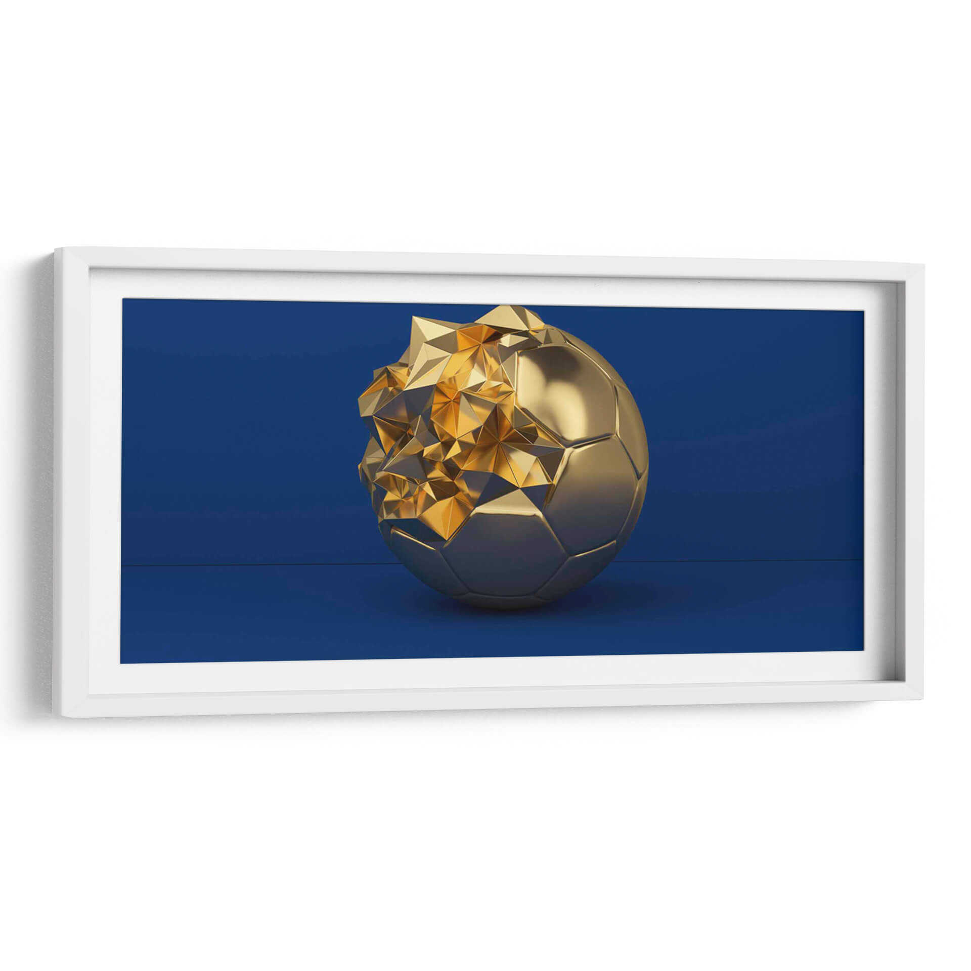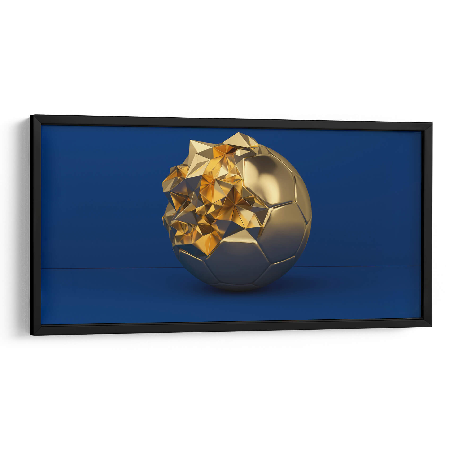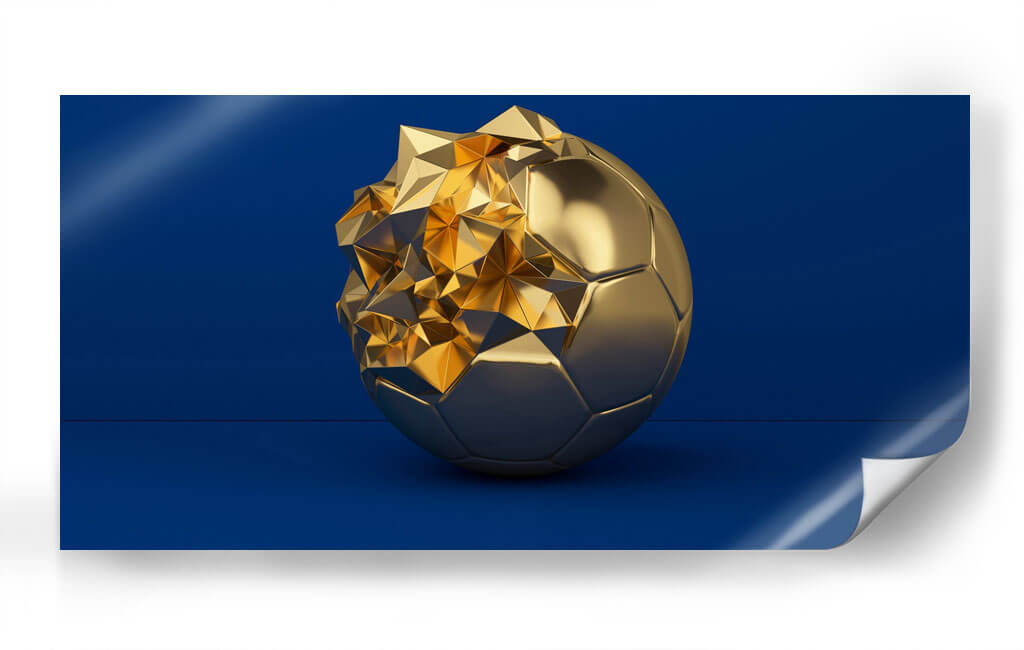 Este cautivador cuadro decorativo presenta una reinterpretación audaz del clásico balón de fútbol, transformado en una escultura de oro brillante. La pieza se erige sobre un fondo azul profundo y liso, creando un contraste visual impactante que resalta la majestuosidad del objeto central. La mitad inferior del balón mantiene su forma icónica y pulida, mientras que la mitad superior se desintegra en una explosión de formas geométricas angulares y facetadas, capturando la luz y reflejando destellos dorados que evocan lujo y dinamismo. La composición minimalista, centrada en el balón, permite que cada detalle brille, desde los pentágonos y hexágonos que definen su estructura hasta el juego de luces y sombras en sus superficies metálicas. Esta obra de arte contemporáneo es perfecta para espacios que buscan un toque de sofisticación y un guiño al deporte y al éxito. Ideal para salones modernos, oficinas ejecutivas o cualquier lugar donde se desee añadir un punto focal de elegancia y poder. Transmite una sensación de transformación, de la forma perfecta a la abstracción, invitando a la reflexión sobre la evolución y la belleza en el arte deportivo.