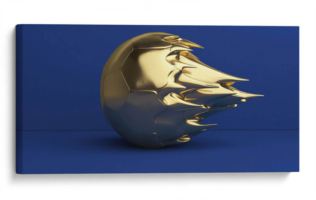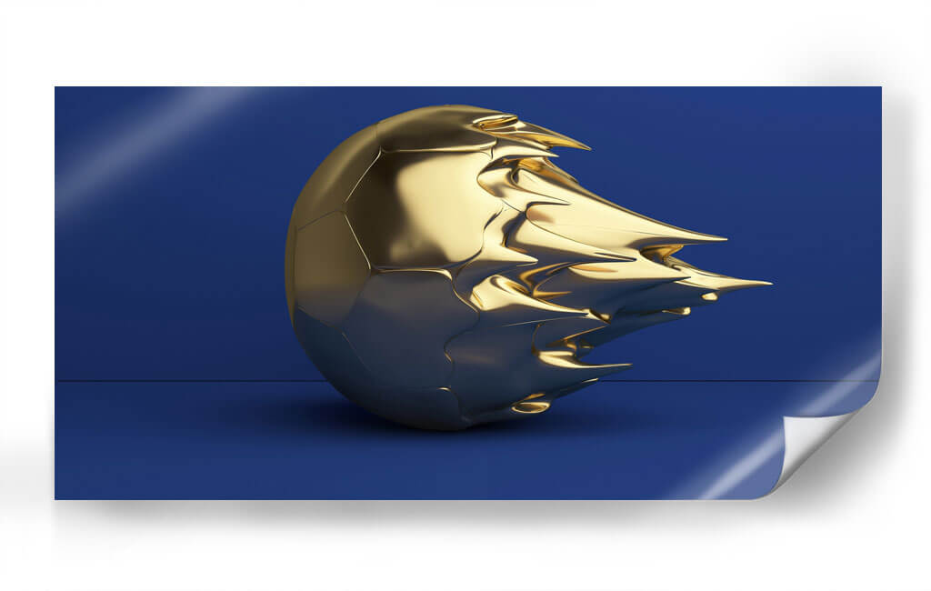Este cautivador cuadro decorativo, titulado 'Balón hecho de oro II', presenta una escultura abstracta de un balón de fútbol en un acabado metálico dorado, sobre un fondo azul profundo. La obra destaca por su composición audaz y su paleta de colores vibrante, donde el brillo del oro contrasta fuertemente con la solidez del azul, creando una pieza visualmente impactante. La textura del balón, con sus formas fluidas y angulosas que parecen emerger del centro, sugiere movimiento y transformación, invitando a la reflexión sobre la gloria, el éxito o la deconstrucción de lo icónico. Es una pieza de arte contemporáneo que aportará un toque de sofisticación y modernidad a cualquier espacio. Ideal para salas de estar, oficinas o áreas de entretenimiento donde se busque un acento de lujo y originalidad. Su diseño versátil permite integrarlo en decoraciones minimalistas, modernas o eclécticas, añadiendo un punto focal que atraerá todas las miradas y generará conversación.
