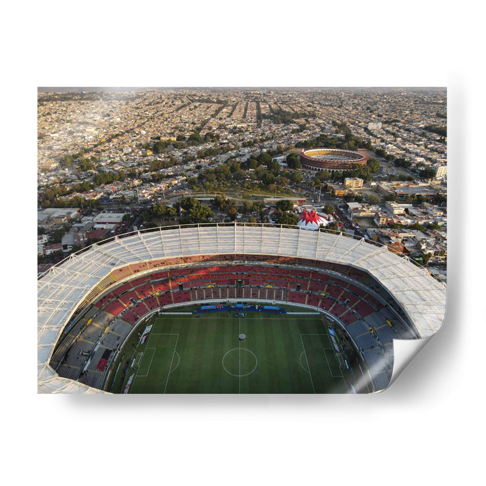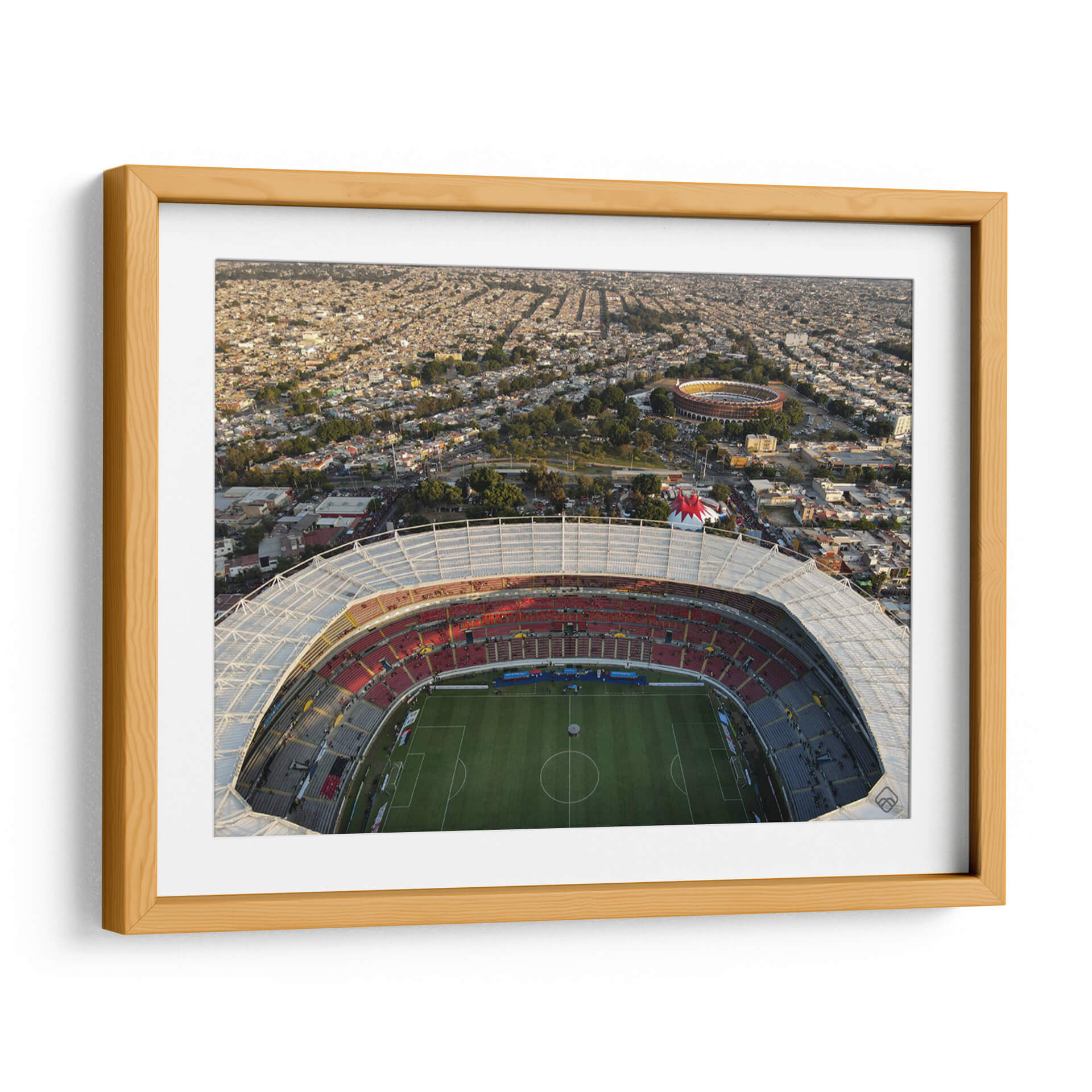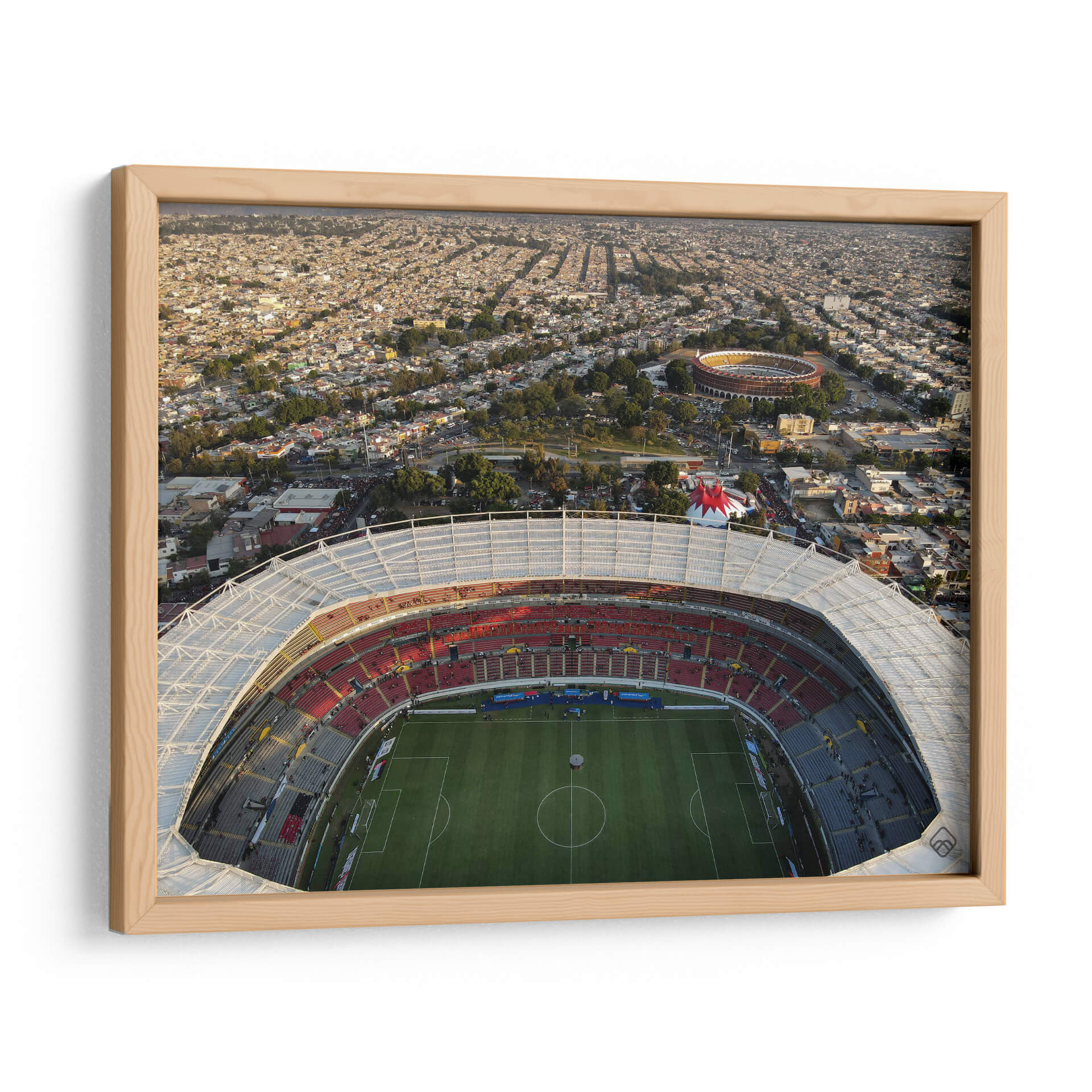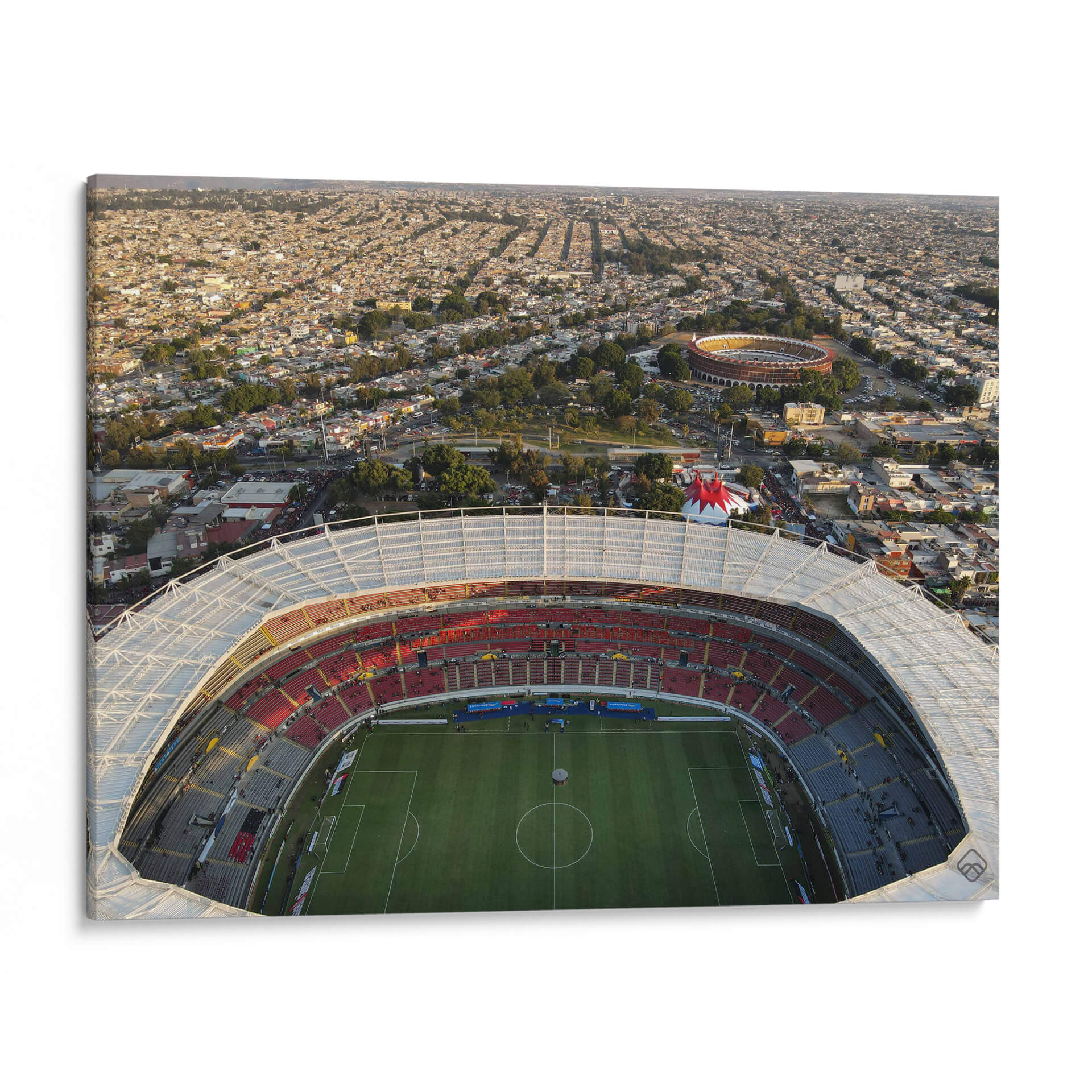Capture la energía y la magnitud de la vida urbana con este impactante cuadro decorativo del artista Raúl Fierro, titulado 'Estadio de Futbol y Plaza de Toros'. Esta obra maestra visual ofrece una perspectiva aérea única, sumergiendo al espectador en el corazón de una ciudad vibrante, donde la arquitectura monumental de un estadio deportivo se fusiona con la silueta de una plaza de toros, rodeada por un mar de tejados residenciales. La composición es dinámica, con la luz del atardecer bañando la escena en tonos dorados y cálidos, realzando la textura y la profundidad de la imagen. Los colores, predominantemente ocres, rojos intensos y verdes terrosos del campo de juego, crean una atmósfera de vitalidad y emoción. Este cuadro decorativo es ideal para aquellos que aprecian la arquitectura urbana, los deportes y la vida colectiva. Su escala y detalle lo convierten en un punto focal perfecto para salones modernos, oficinas o cualquier espacio que busque infundir carácter y una narrativa visual cautivadora. Añada un toque de grandiosidad y la esencia de la cultura deportiva y urbana a su decoración con esta pieza excepcional.
