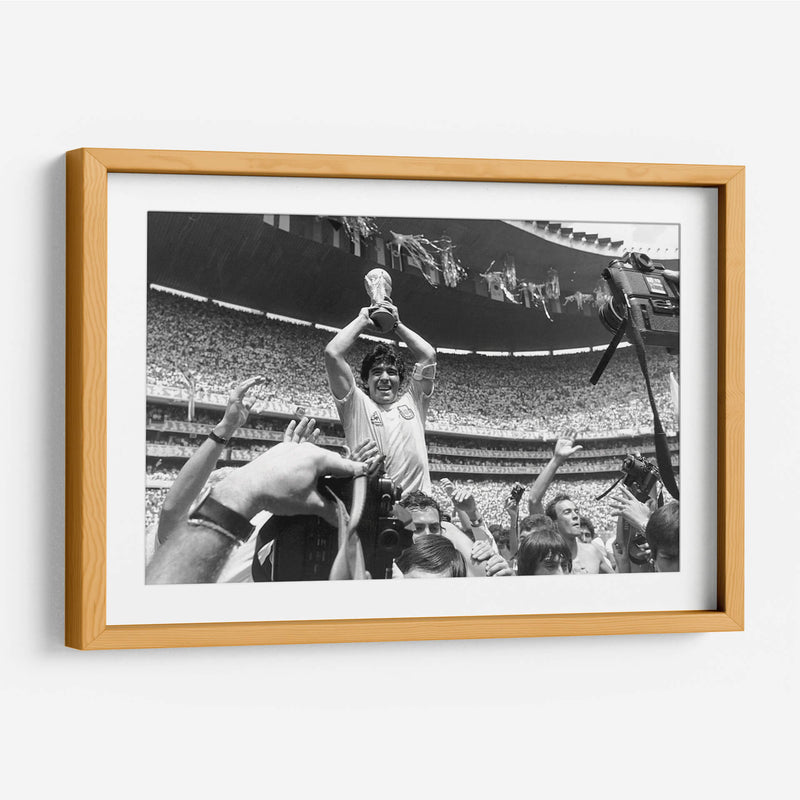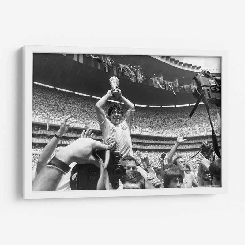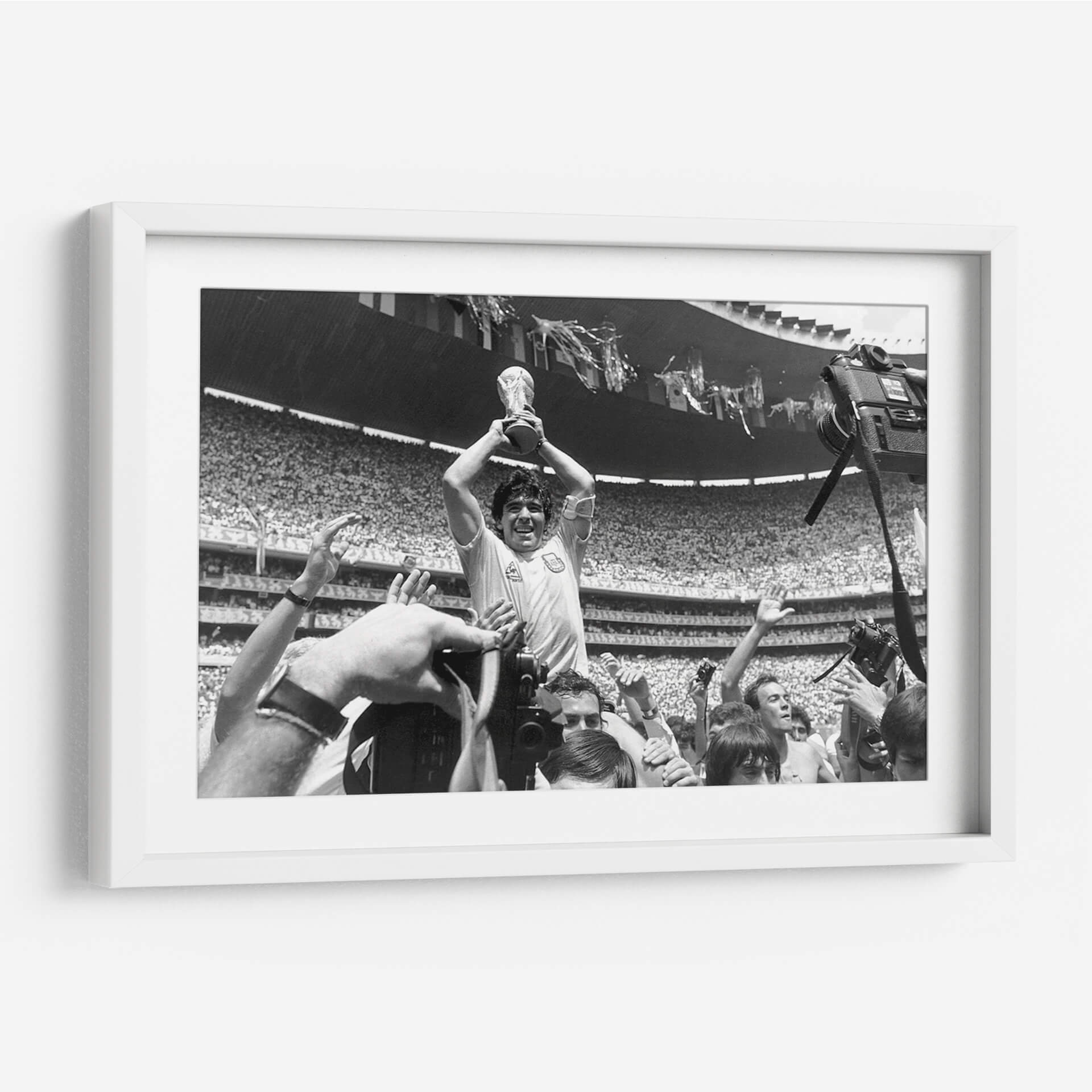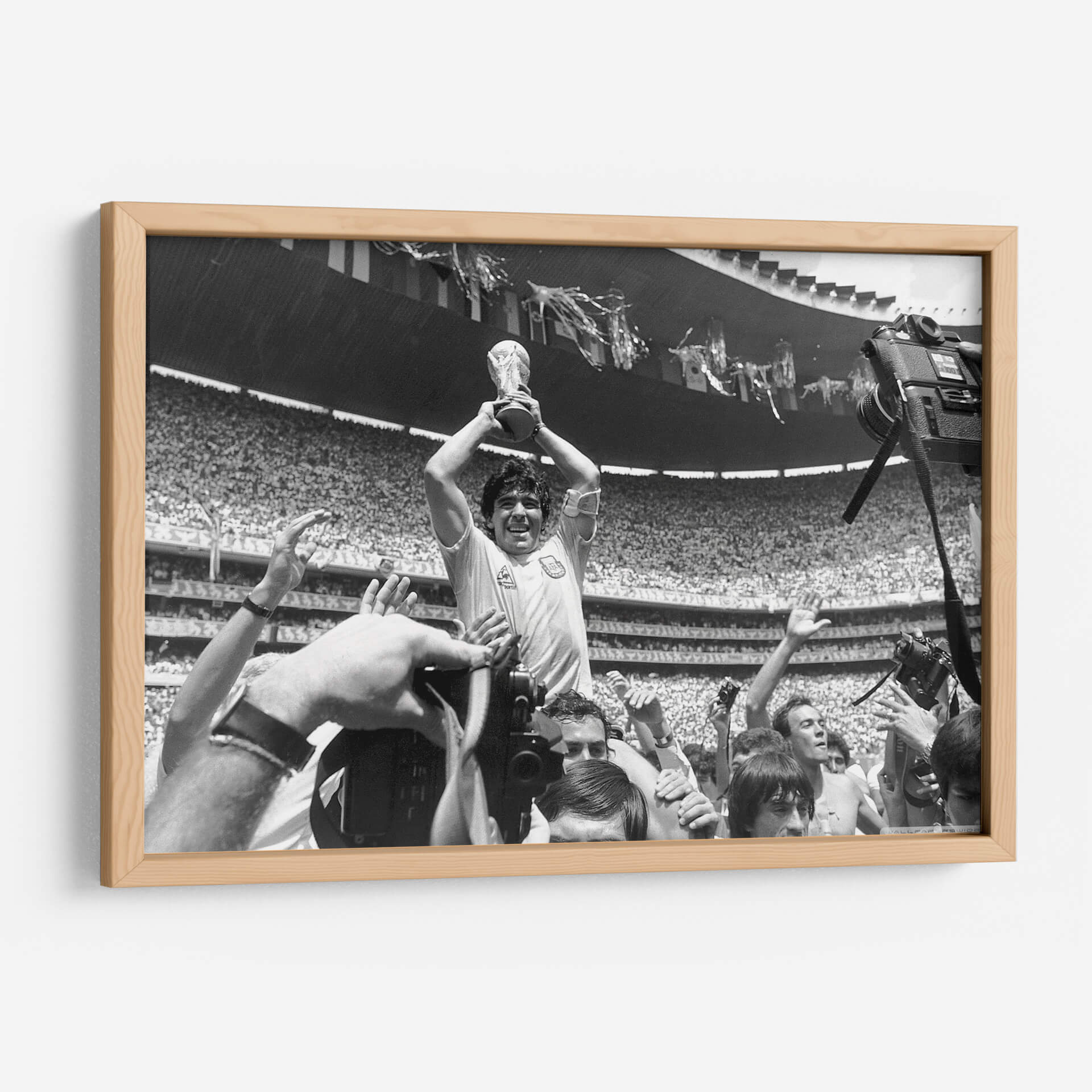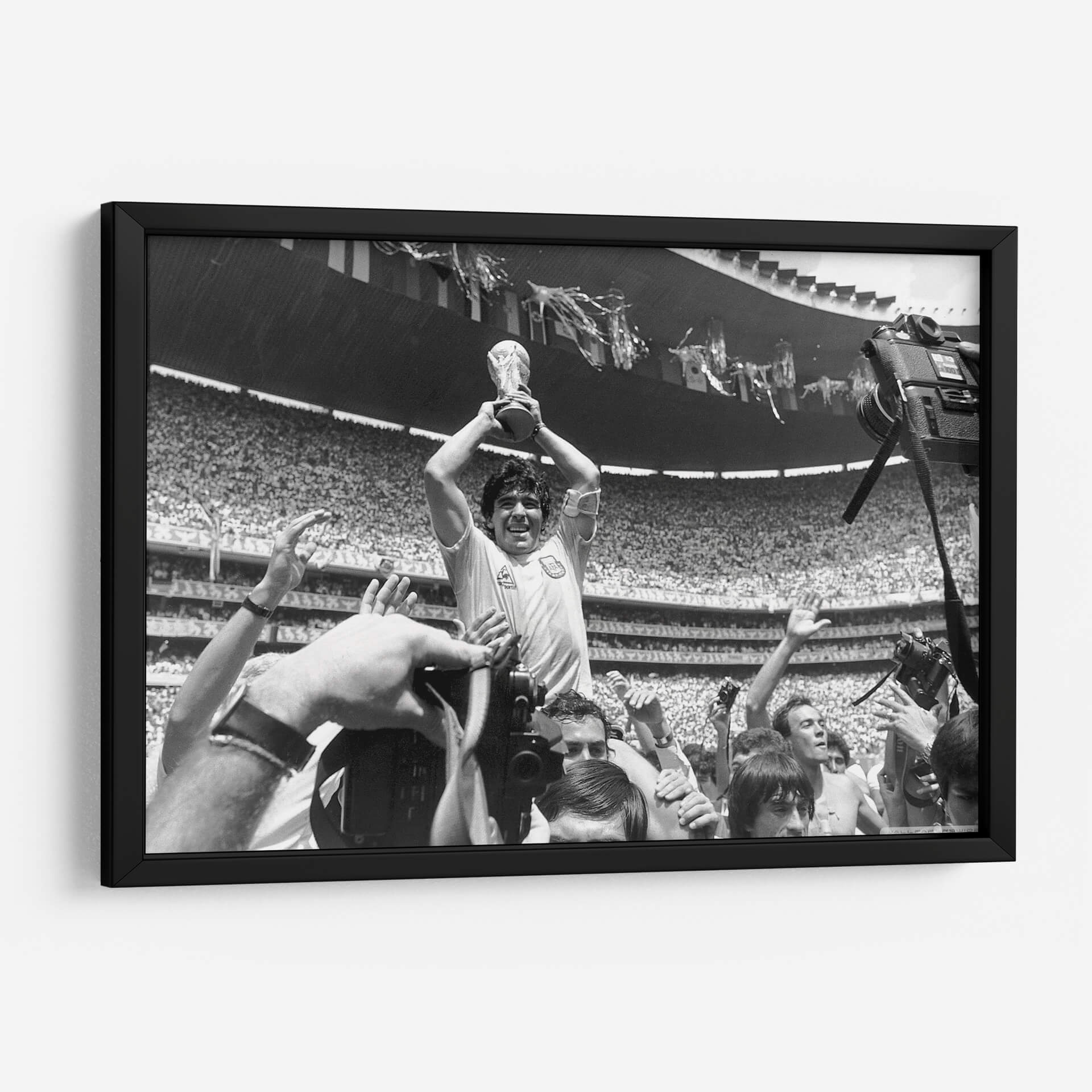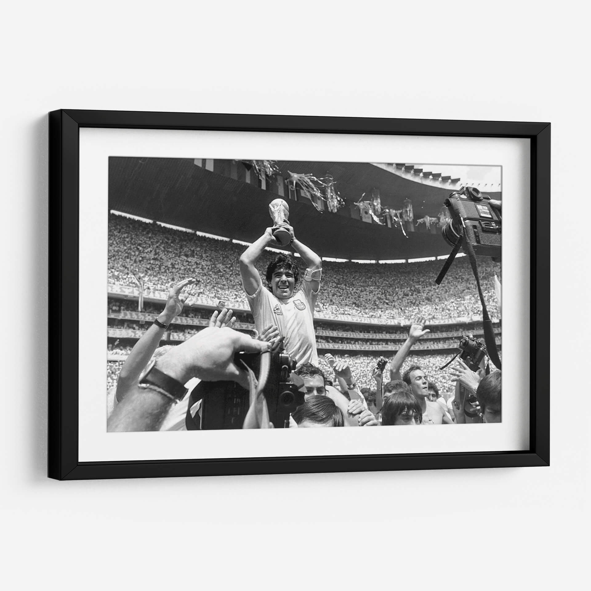 Captura la euforia del triunfo con este icónico cuadro decorativo "Maradona, Campeón del Mundo". Esta fotografía en blanco y negro, cargada de historia y emoción, inmortaliza un momento cumbre en la carrera de una leyenda del fútbol. La imagen muestra a Diego Maradona alzando con orgullo el trofeo de campeón, rodeado por la ovación de miles de aficionados en un estadio repleto. La composición dinámica, con la multitud y los cámaras en primer plano, transmite la energía y la intensidad del instante de la victoria. Los contrastes de luz y sombra propios de la fotografía en blanco y negro acentúan la atmósfera dramática y la celebración desbordante. Este cuadro decorativo es una pieza de arte inspiradora, perfecta para cualquier aficionado al deporte rey o para quienes buscan añadir un toque de pasión y grandeza a su hogar u oficina. Ideal para salas de estar, estudios o espacios de ocio, este retrato histórico evoca sentimientos de logro, perseverancia y gloria deportiva. Una adición atemporal a tu colección de arte de pared que rinde homenaje a uno de los momentos más memorables del deporte.