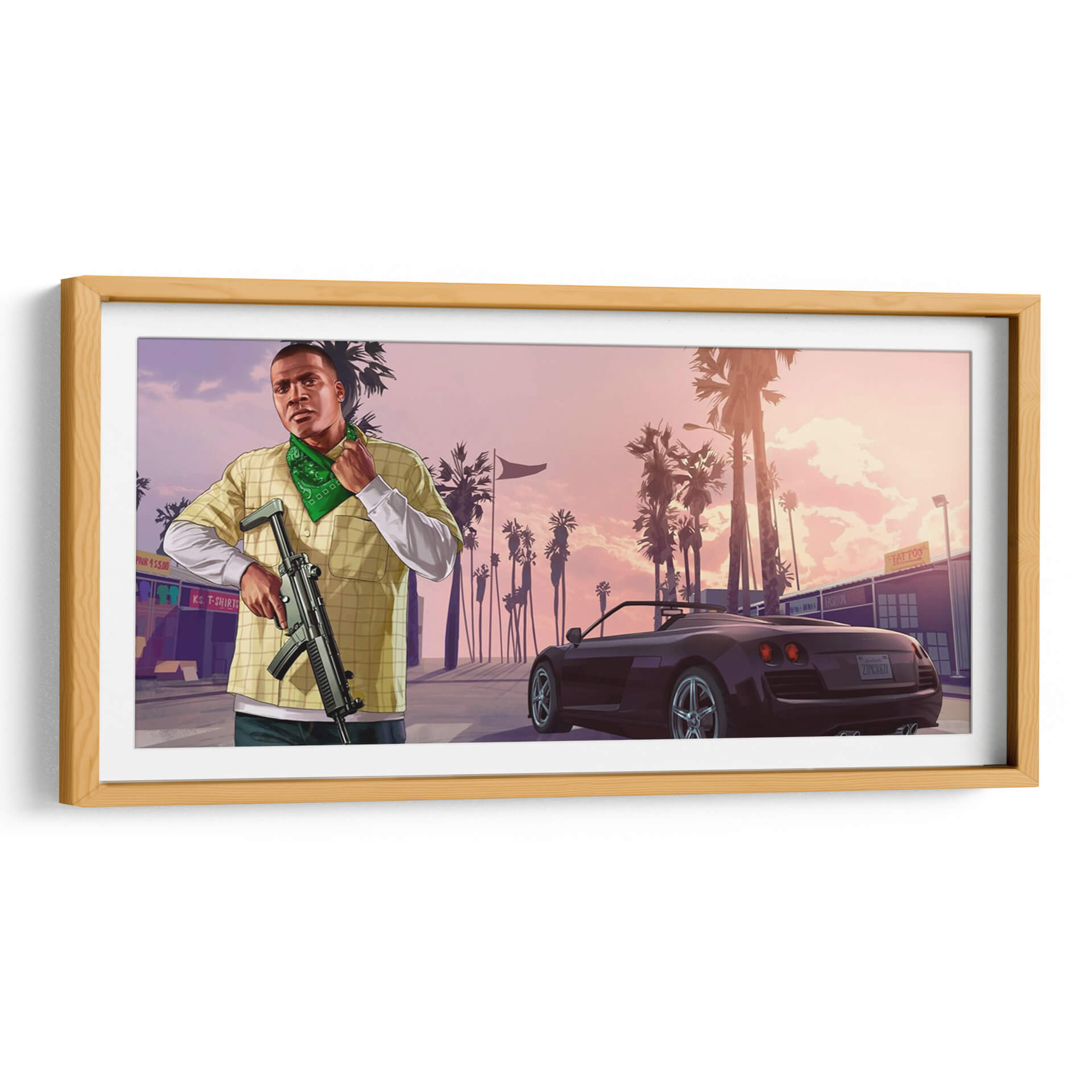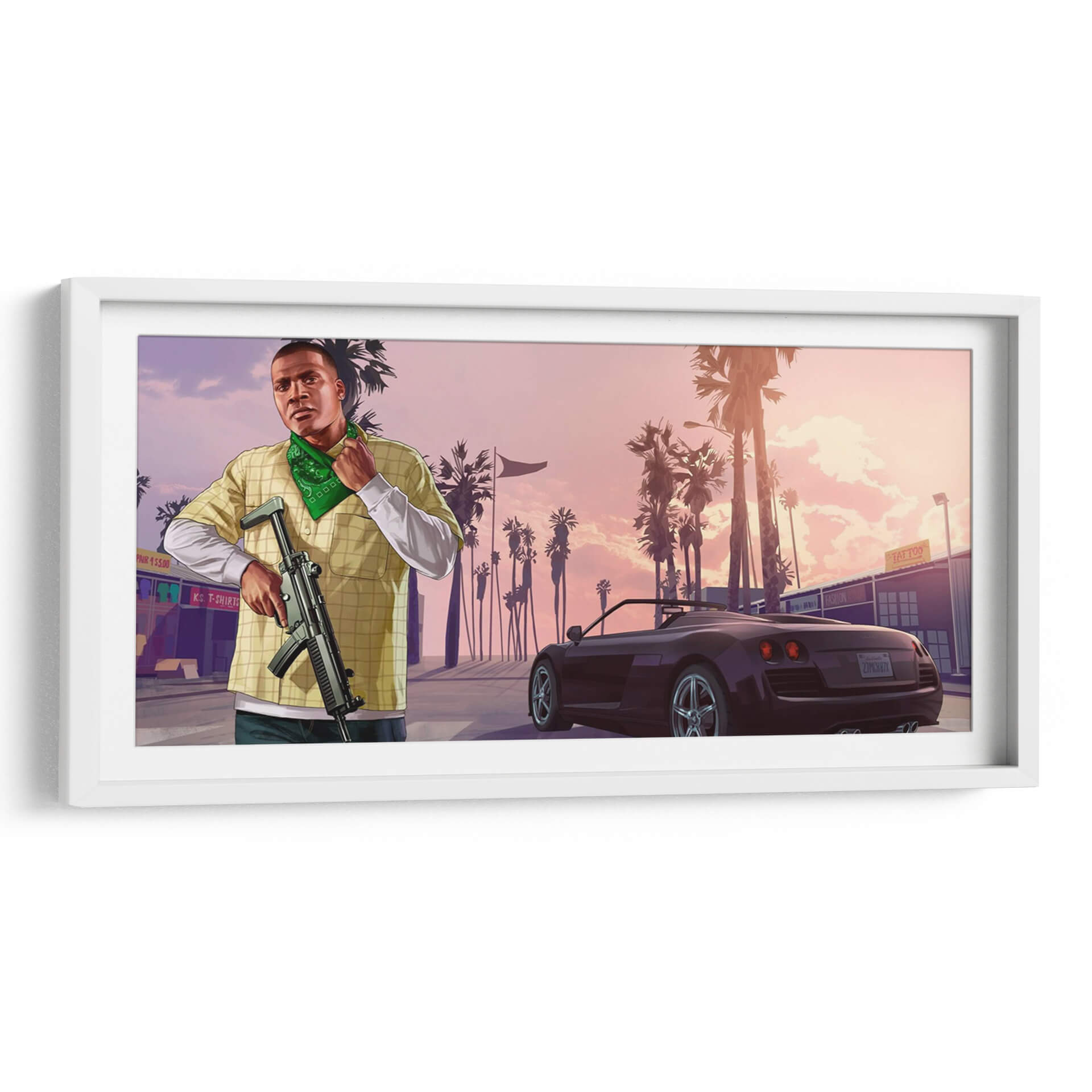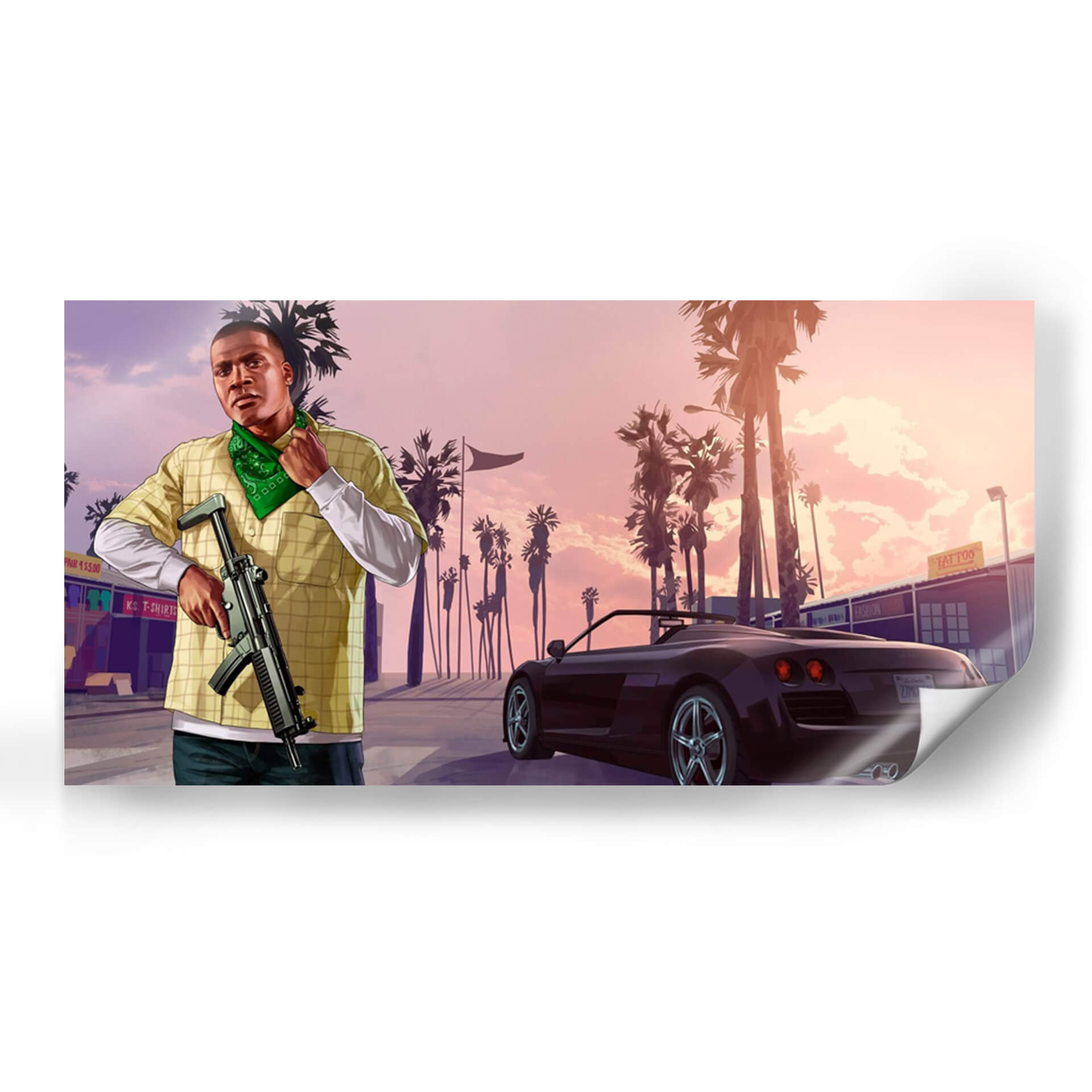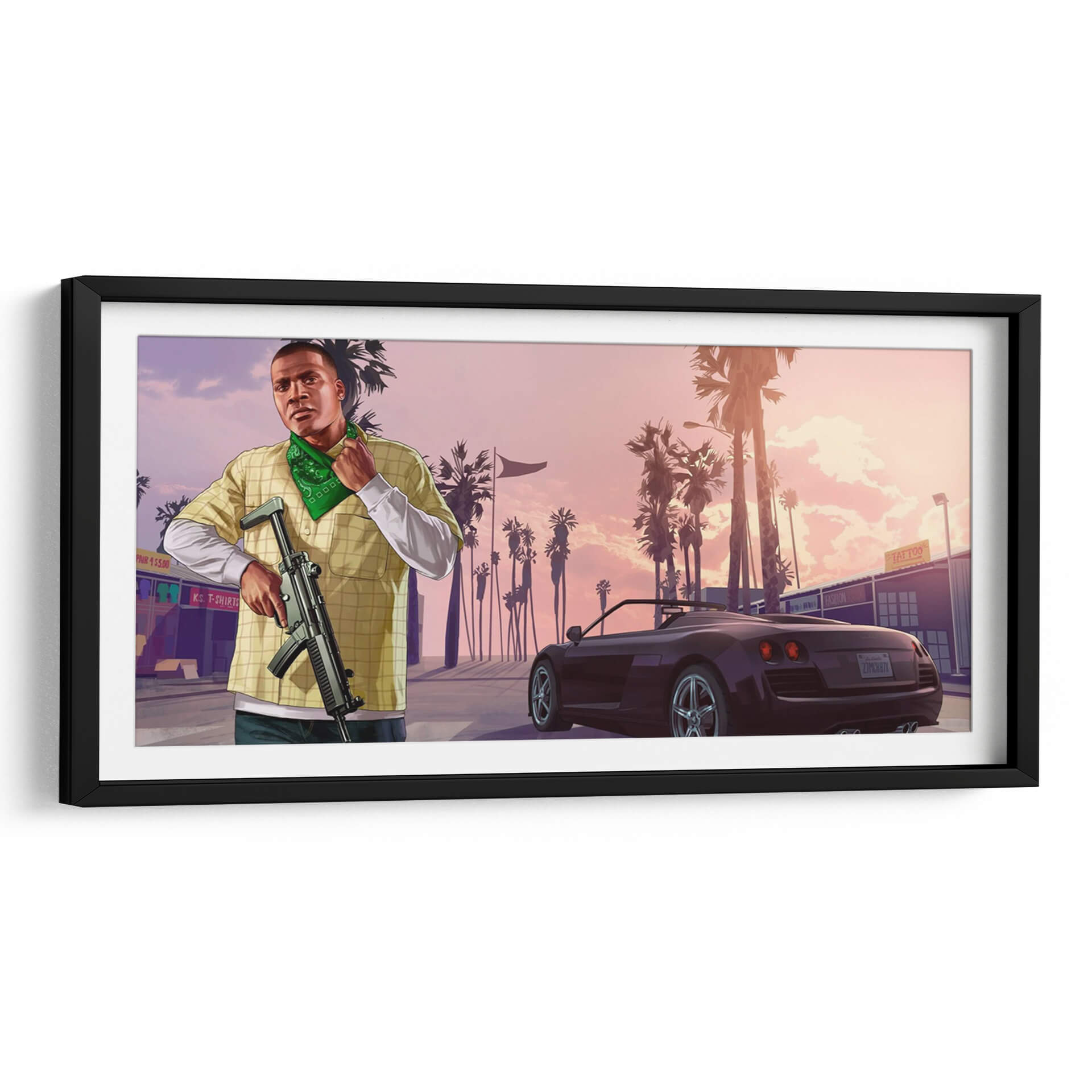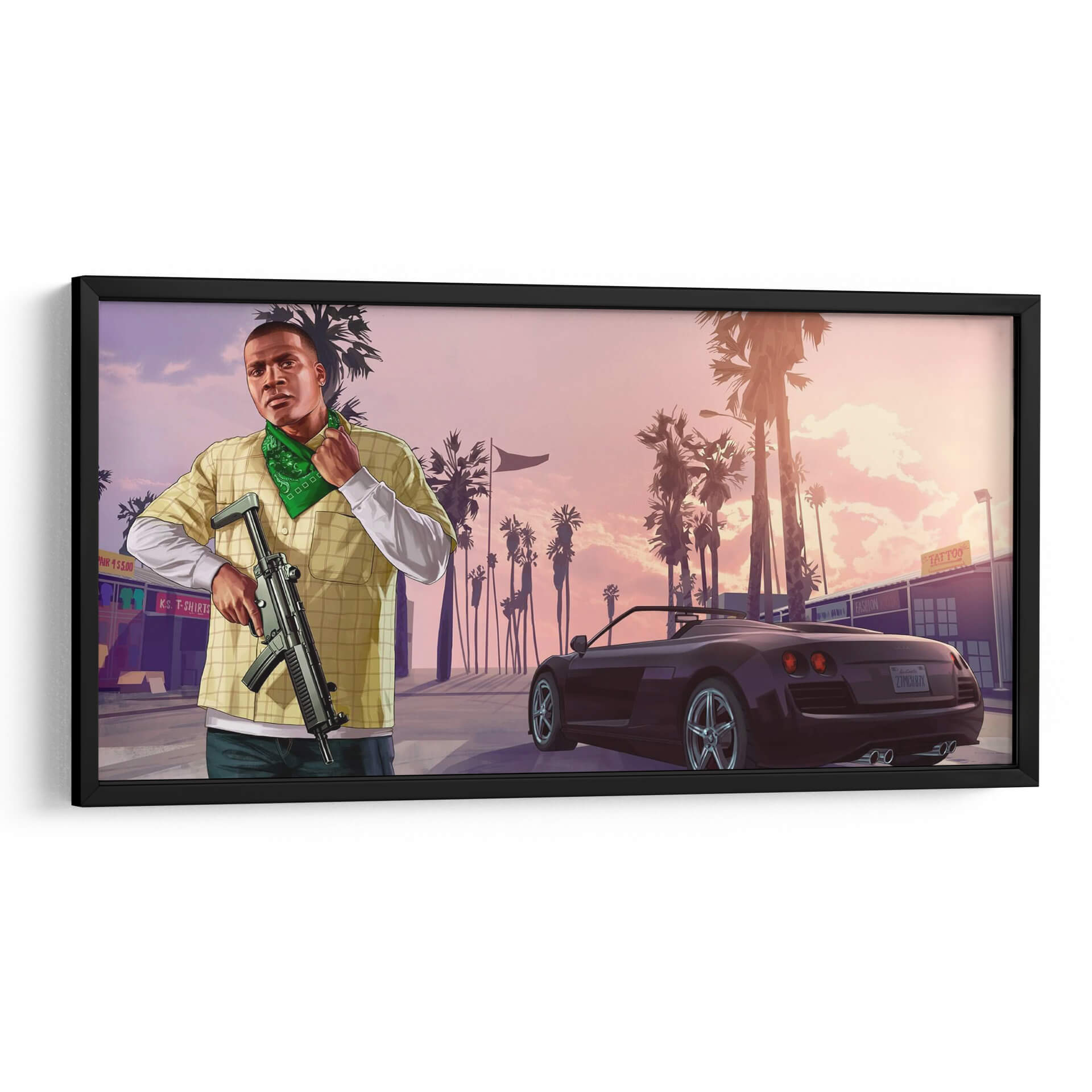 Sumérgete en la vibrante atmósfera de "Franklin Clinton", una obra de arte digital que captura la esencia de un atardecer californiano con un toque urbano. Esta pieza presenta a un hombre con una vestimenta casual y un pañuelo verde, sosteniendo un arma, ante un paisaje urbano bordeado de palmeras. El cielo en tonos pastel, que van del rosa al naranja suave, crea un telón de fondo evocador, contrastando con las siluetas oscuras de las palmeras y los edificios. Un coche deportivo de lujo añade un elemento de sofisticación y dinamismo a la escena. El estilo artístico, inspirado en videojuegos y arte callejero, transmite una sensación de acción y actitud. Ideal para espacios modernos y juveniles, este cuadro decorativo es perfecto para salas de estar, estudios o habitaciones que buscan un toque de carácter y una narrativa visual audaz. La combinación de colores y la composición dinámica invitan a la contemplación sobre la dualidad entre la tranquilidad del paisaje y la intensidad del personaje. Añade una pieza única a tu colección de arte de pared que genere conversación y refleje un estilo contemporáneo y atrevido.