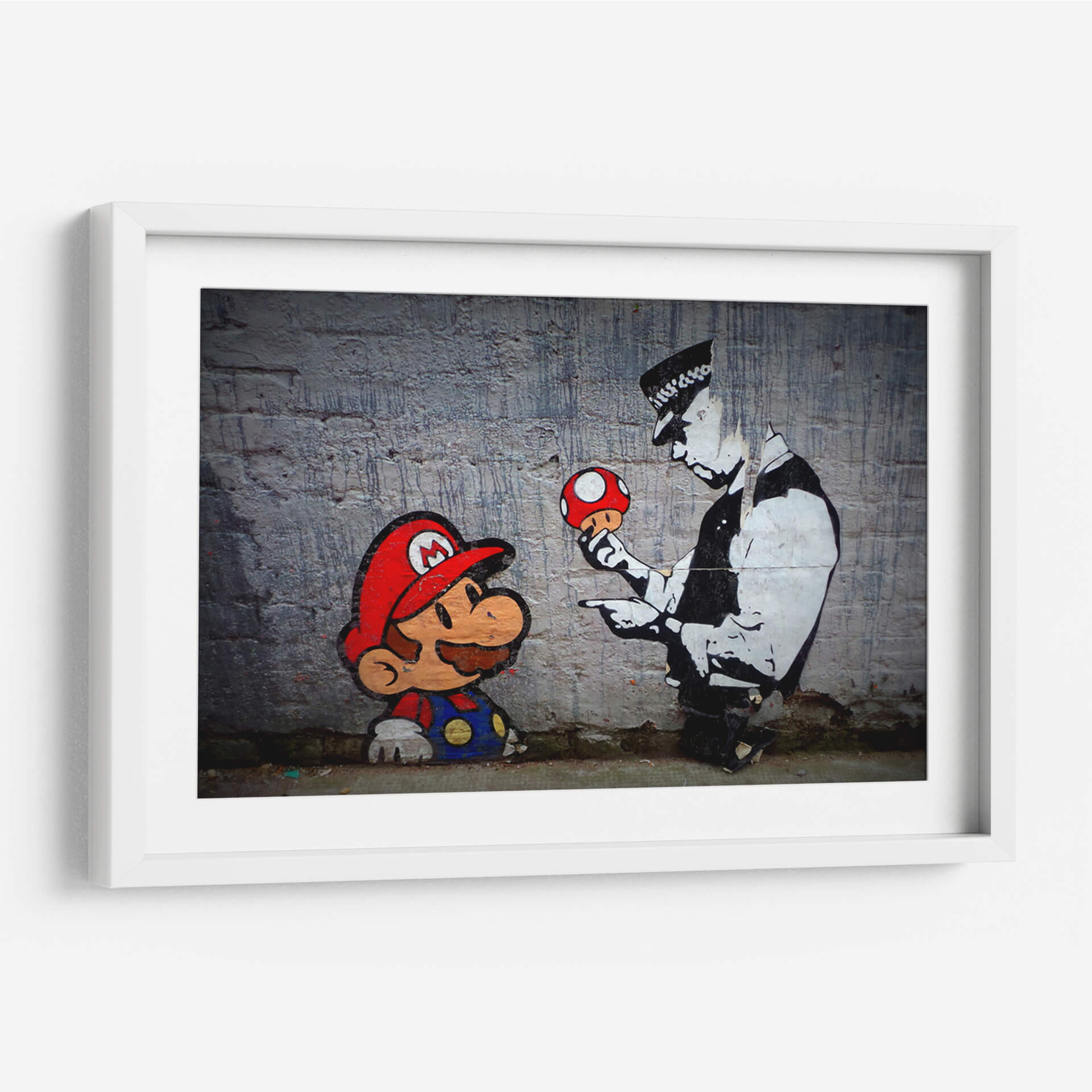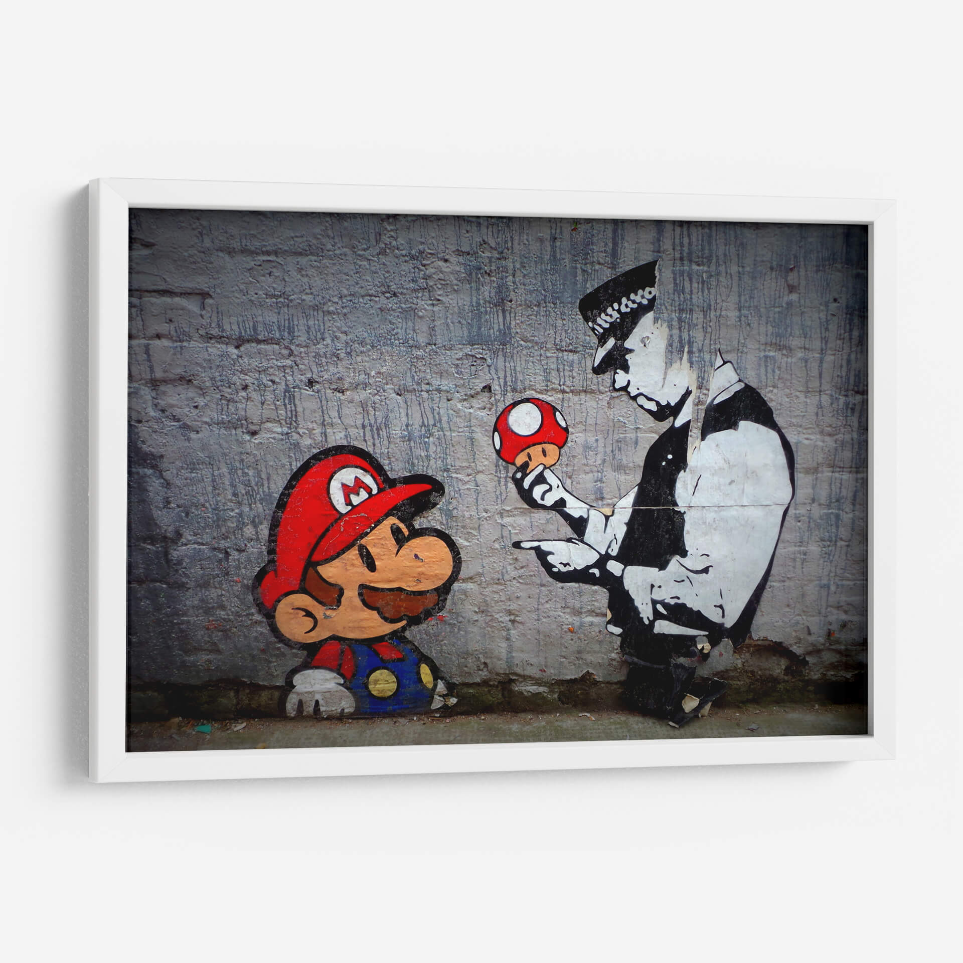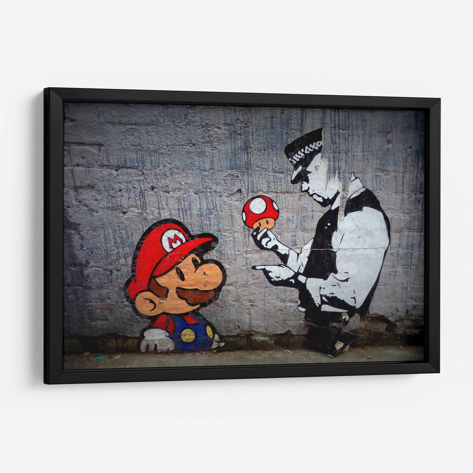 Este impactante cuadro decorativo captura un momento surrealista y lleno de humor que fusiona el mundo de los videojuegos con la realidad urbana. La obra presenta al icónico personaje de Mario, con su característico gorro rojo y overol azul, interactuando con una figura de un policía. La paleta de colores es vibrante en el personaje de Mario, contrastando con la estética en blanco y negro y trazos de spray del oficial y el fondo de pared de ladrillos. La composición, que evoca el arte callejero, crea una narrativa intrigante: ¿qué está sucediendo en este encuentro inesperado? Es una pieza ideal para espacios que buscan un toque de originalidad, irreverencia y cultura pop, como una sala de estar moderna, una oficina creativa o una habitación temática. Este cuadro decorativo es perfecto para quienes aprecian el arte con un guiño a la nostalgia y un comentario social sutil, aportando carácter y conversación a cualquier ambiente.