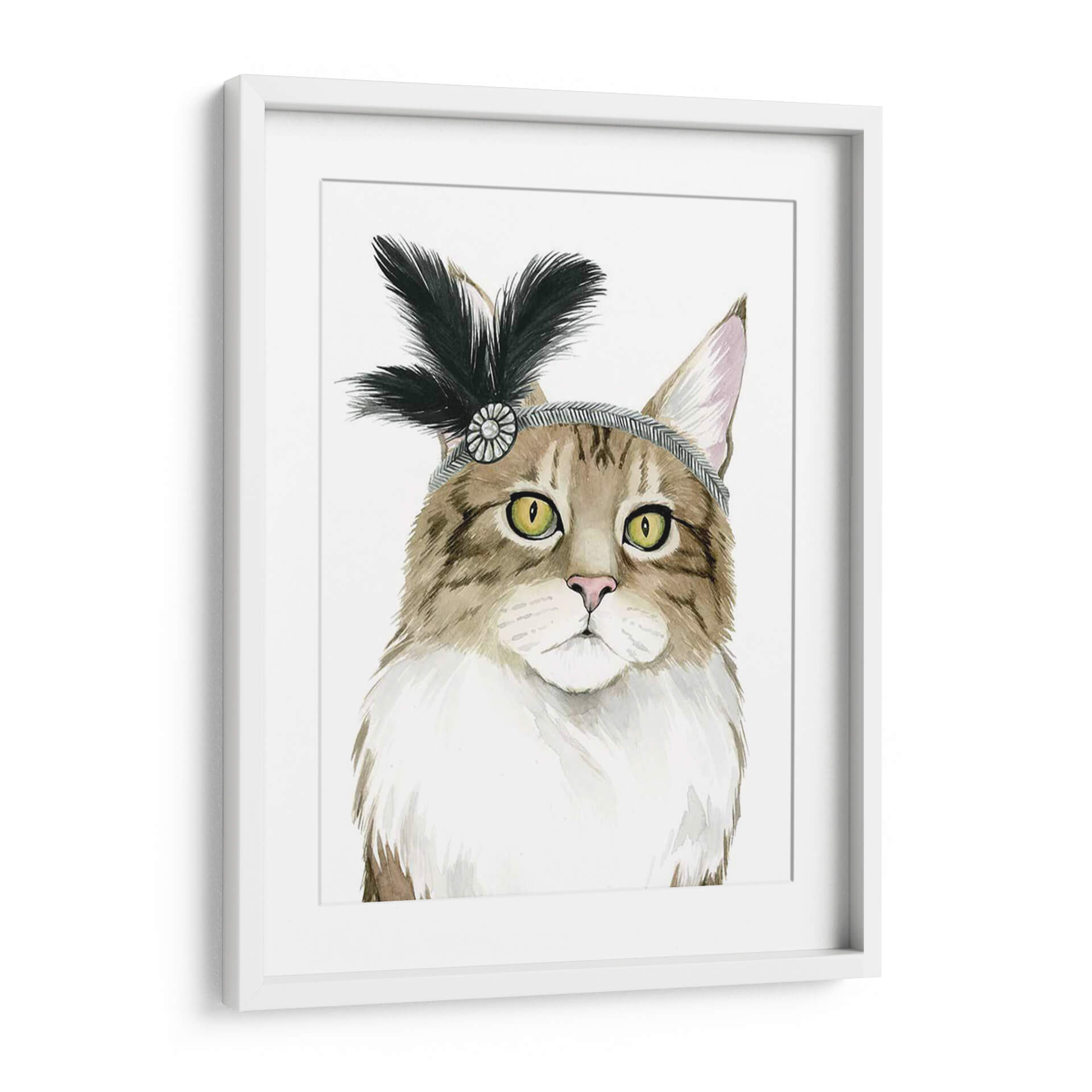 Emb uevo en un viaje de elegancia y carisma con "Downton Cat IV" de Grace Popp, una obra maestra que captura la esencia de la sofisticación felina. Este cuadro decorativo presenta un retrato cautivador de un gato de pelaje atigrado y ojos penetrantes color verde esmeralda, adornado con una diadema art déco y plumas negras, evocando la opulencia de una época pasada. La técnica de acuarela de Popp aporta una suavidad y un realismo sutil, mientras que la paleta de colores, dominada por tonos tierra y marrones cálidos, contrasta con el blanco puro del fondo, haciendo que el felino sea el protagonista indiscutible. La composición en primer plano se centra en la mirada enigmática del gato, invitando a la contemplación y añadiendo un toque de personalidad a cualquier espacio. Ideal para amantes de los animales, aficionados al estilo retro y quienes buscan una pieza de conversación única para su sala de estar, estudio u oficina. "Downton Cat IV" no es solo una decoración de pared, es una declaración de estilo que aporta calidez, intriga y un toque de lujo discreto a tu hogar, transformando cualquier rincón en una galería personal con un encanto atemporal y una elegancia que perdura.