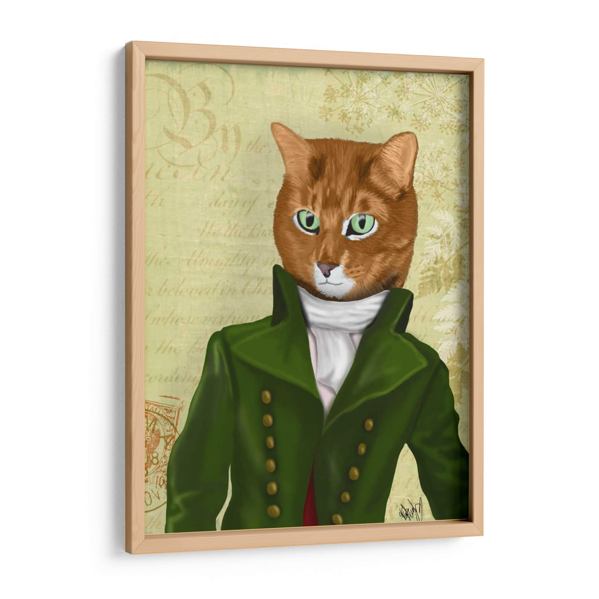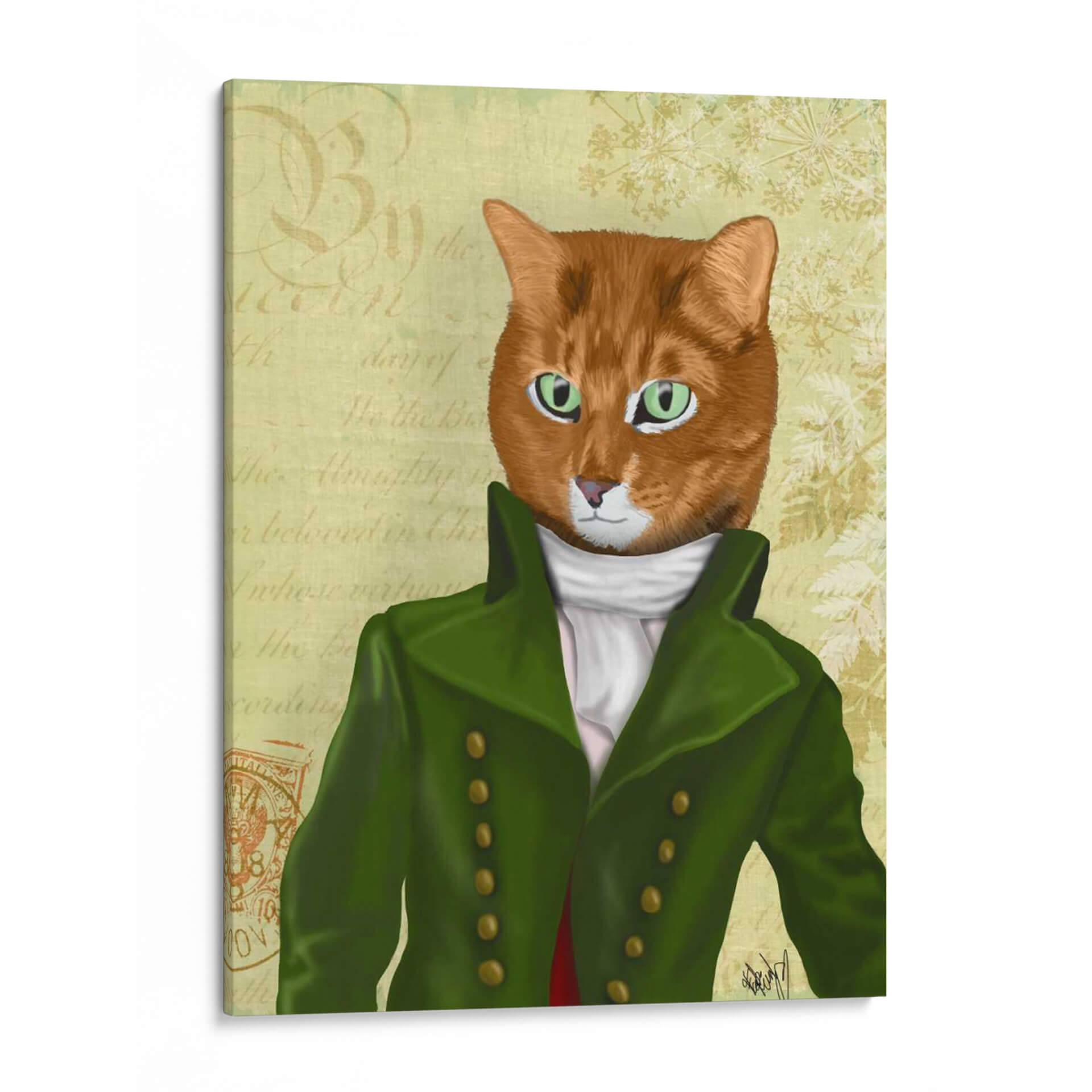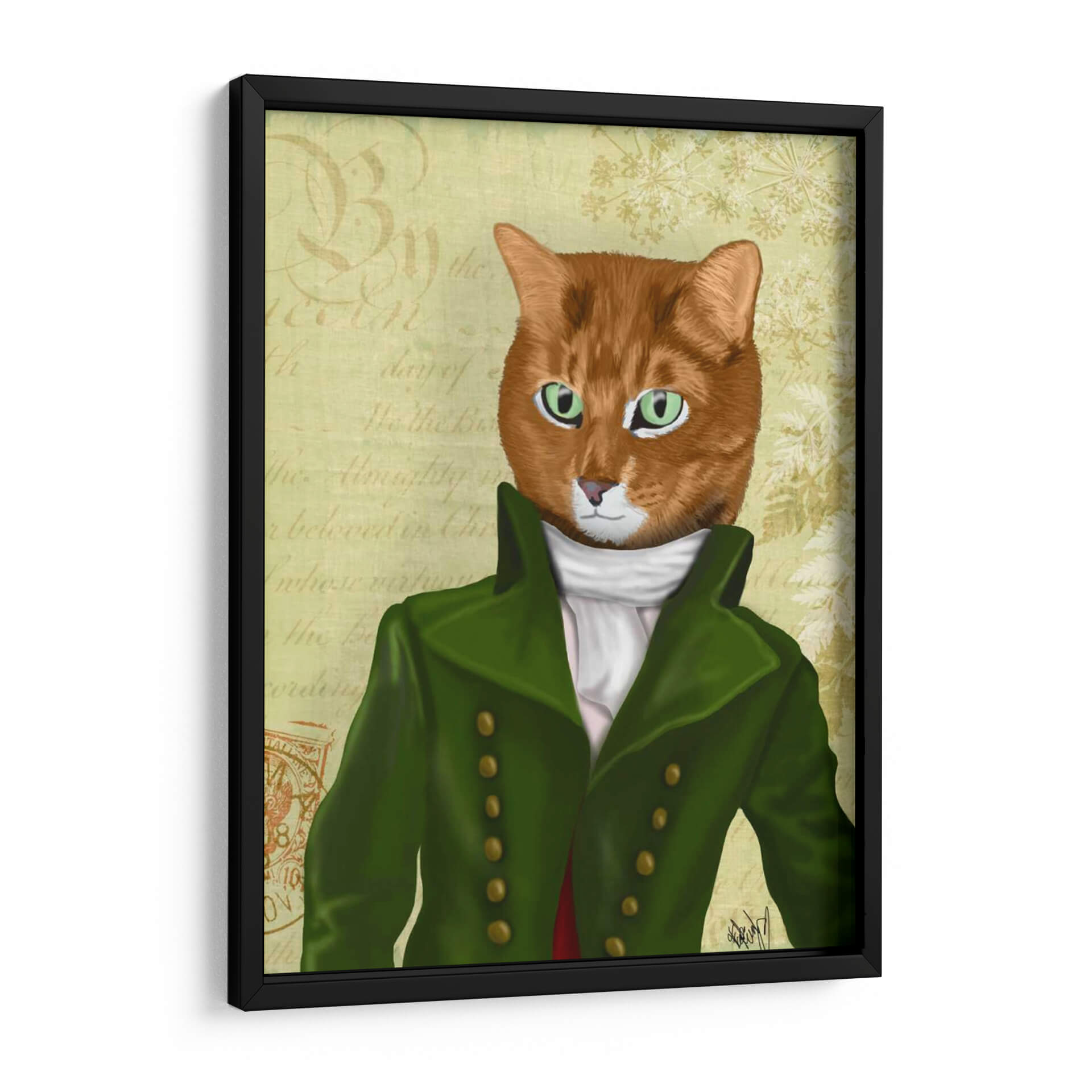Este encantador cuadro decorativo presenta un cautivador retrato de un gato atigrado de color jengibre, vestido con un elegante abrigo verde de época y una bufanda blanca. La obra de arte, con su estilo distintivo y toque whimsical, es perfecta para añadir un punto focal único a cualquier espacio. El fondo, con sus sutiles texturas y motivos florales, evoca una sensación de nostalgia y encanto, mientras que los vibrantes ojos verdes del gato aportan una chispa de vida y personalidad. El contraste entre el pelaje cálido del gato y el profundo tono del abrigo crea una composición visualmente atractiva. Ideal para salones, estudios u oficinas, este cuadro decorativo es una pieza que sin duda atraerá miradas y conversaciones. Su temática, que combina lo animal con lo antropomórfico de una manera sofisticada, lo convierte en una elección original para amantes del arte y de los felinos. Añade un toque de carácter y originalidad a tu decoración con esta pieza que equilibra perfectamente el humor y la elegancia.