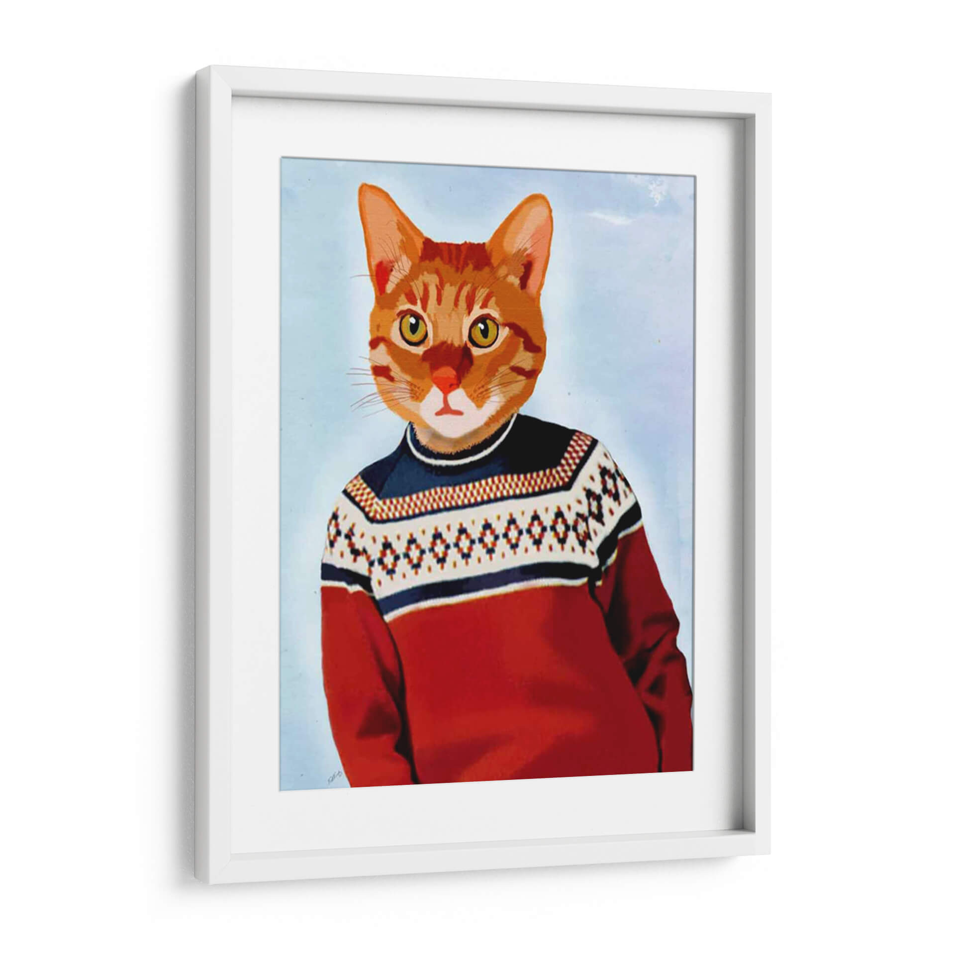 Este encantador cuadro decorativo, titulado 'Gato En Suéter De Esquí' del artista Fab Funky, captura la imaginación con su peculiar retrato de un felino ataviado con una prenda de invierno. La obra destaca por su paleta de colores vibrantes, dominada por el rojo intenso del suéter, contrastado con los detalles en azul marino y blanco del patrón geométrico. El fondo, de un suave celeste, realza la figura central y le otorga una atmósfera etérea y juguetona. El estilo artístico, que fusiona elementos realistas con un toque de fantasía, crea una pieza única que evoca una sensación de alegría y originalidad. Es perfecta para añadir un punto de interés y personalidad a cualquier espacio, desde una sala de estar moderna hasta un estudio o una habitación infantil. Este cuadro decorativo es ideal para amantes de los gatos, entusiastas del arte contemporáneo y cualquiera que busque una pieza de conversación que ilumine su hogar con un espíritu divertido y desenfadado. Su composición centrada y la expresividad del gato invitan a la contemplación y añaden un toque de calidez y humor a la decoración.