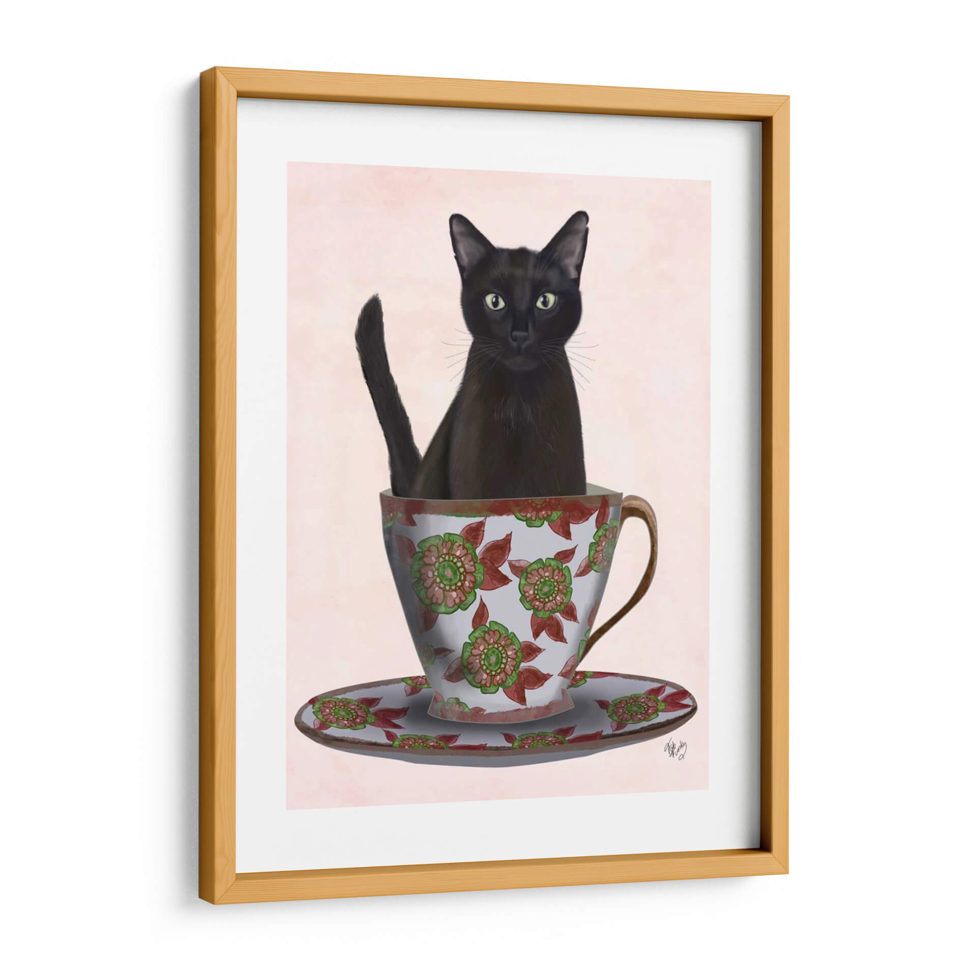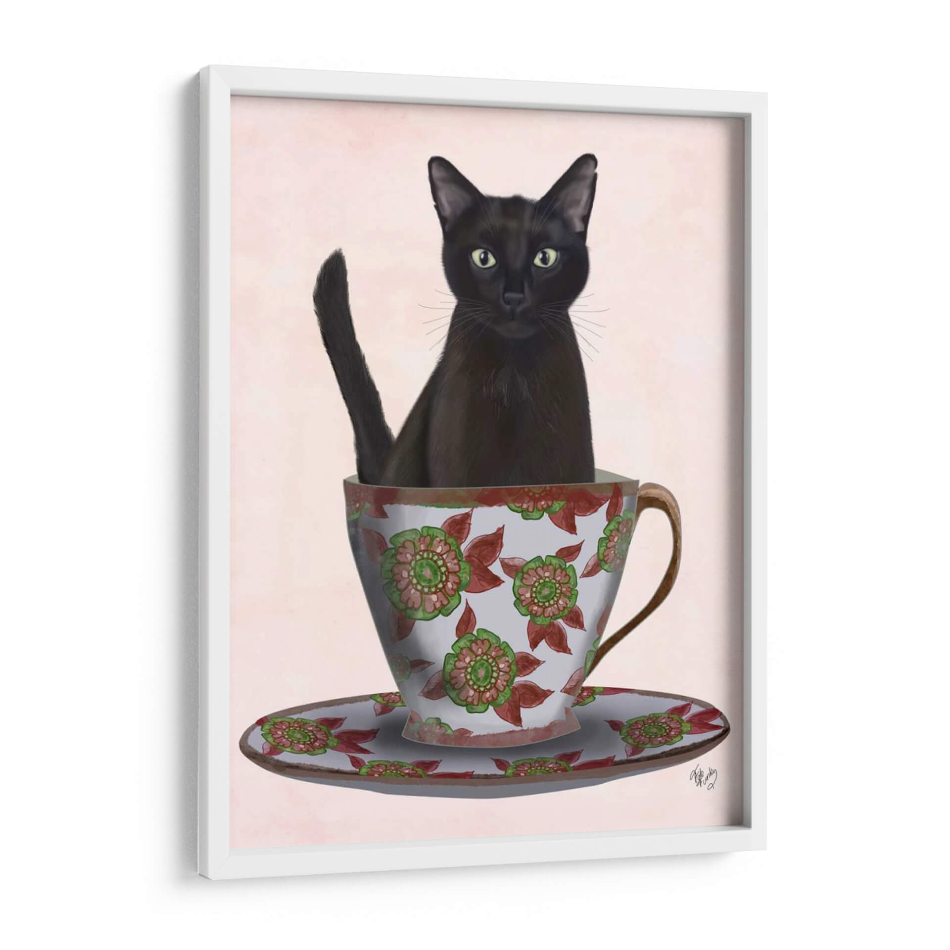 Sumérgete en la fascinante y juguetona obra de arte "Gato Negro En Taza De Té" del artista Fab Funky. Esta pieza cautivadora presenta un elegante gato negro posicionado de manera encantadora dentro de una taza de té bellamente ornamentada. Los colores son delicados y acogedores, con un fondo suavemente rosado que complementa a la perfección el pelaje oscuro del felino y los intrincados patrones florales en tonos verdes y rojos de la taza y el platillo. El estilo artístico, una mezcla de realismo y fantasía, da vida a la escena con detalles finos y una atmósfera ligeramente surrealista y misteriosa. La expresión del gato es enigmática, invitando a la contemplación. Ideal para añadir un toque de personalidad y un aire de sofisticación caprichosa a cualquier hogar u oficina, este cuadro decorativo es perfecto para amantes de los gatos, entusiastas del arte o cualquiera que aprecie una composición única y llamativa. Su paleta de colores lo hace versátil para diversos esquemas de decoración, desde modernos hasta clásicos, aportando un punto de interés visual que sin duda generará conversación.