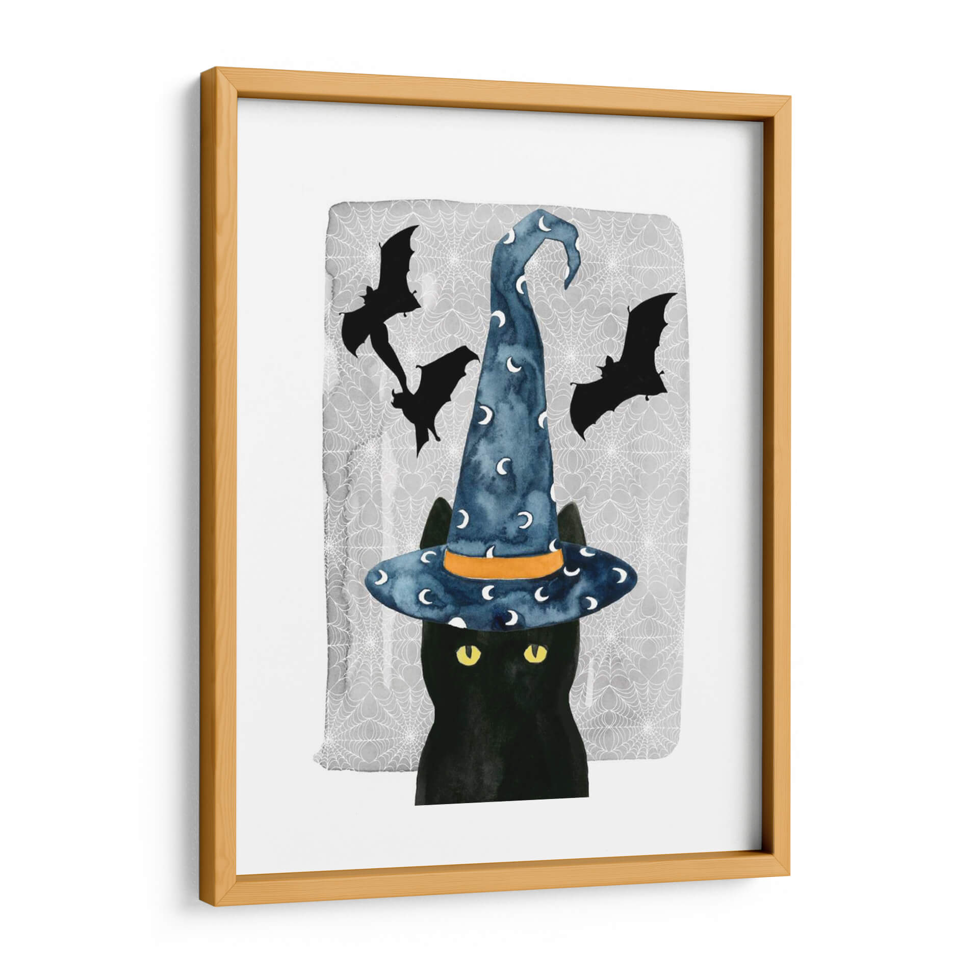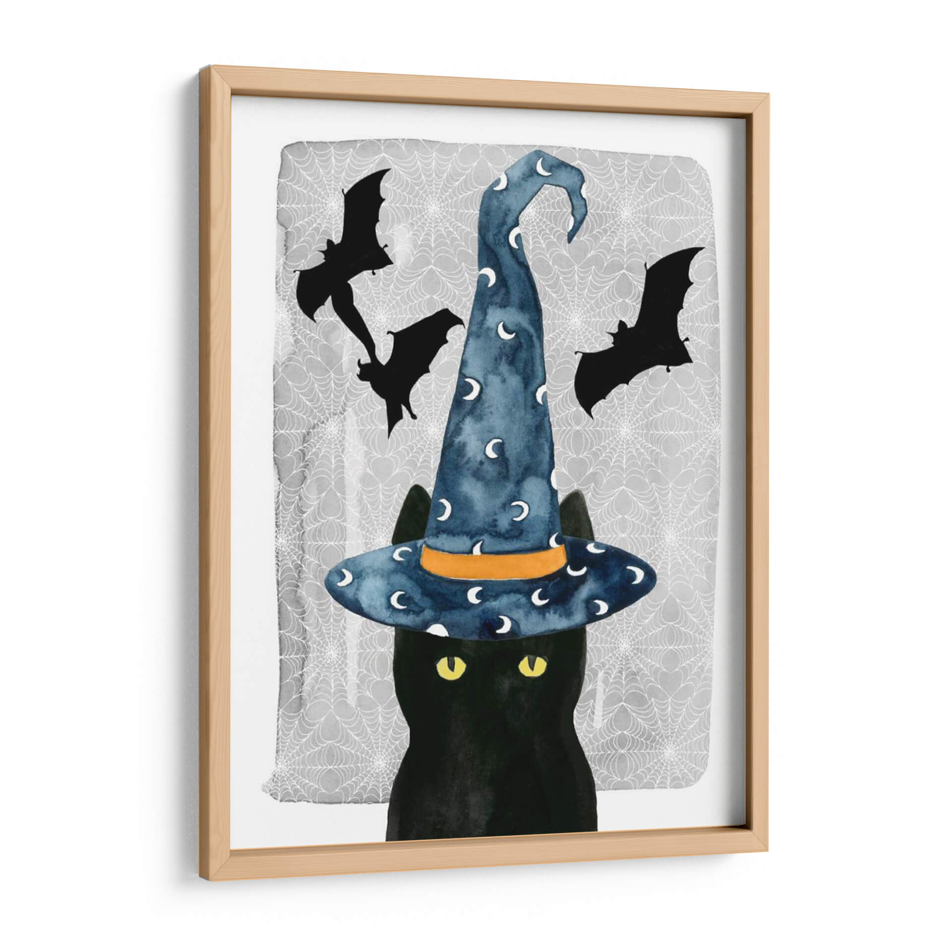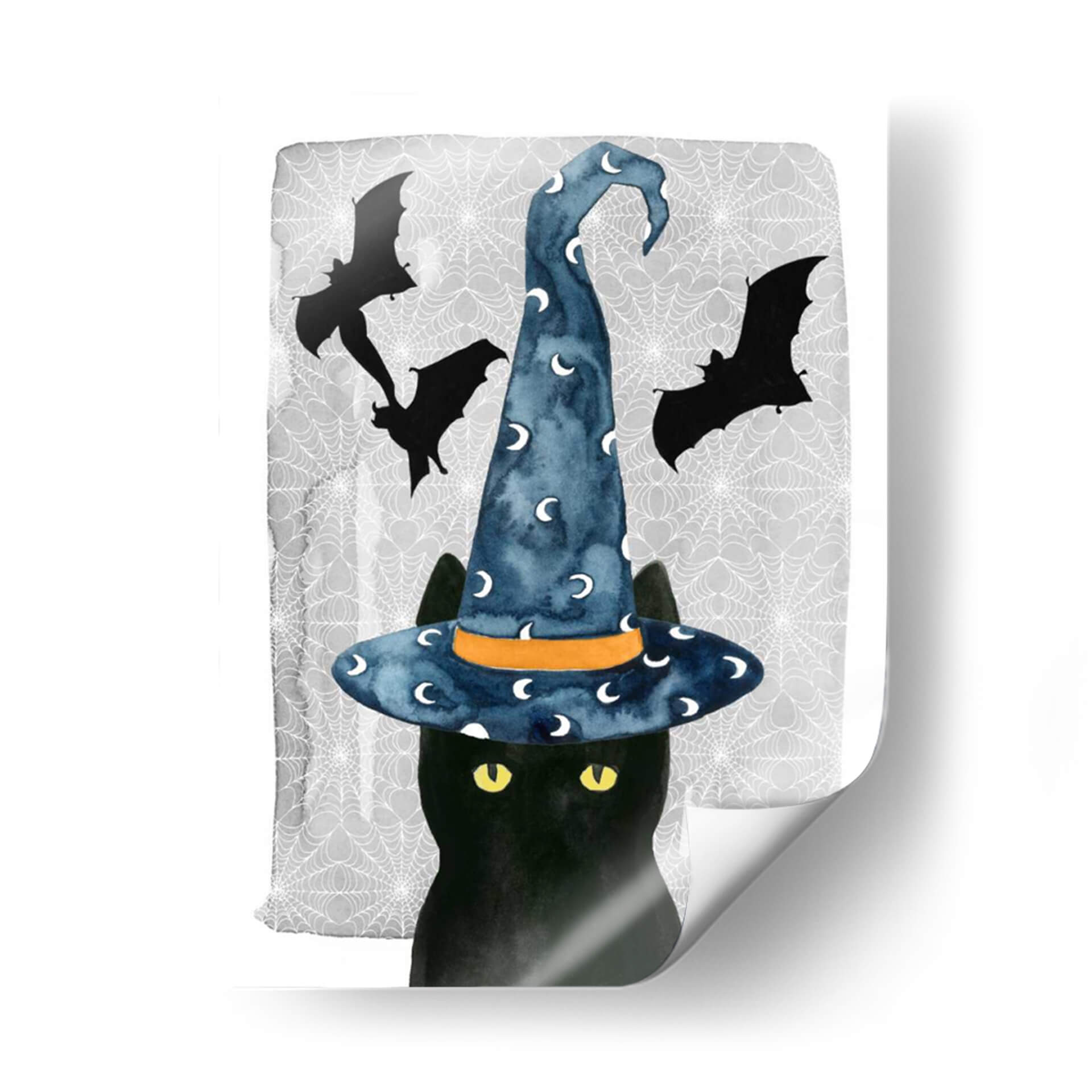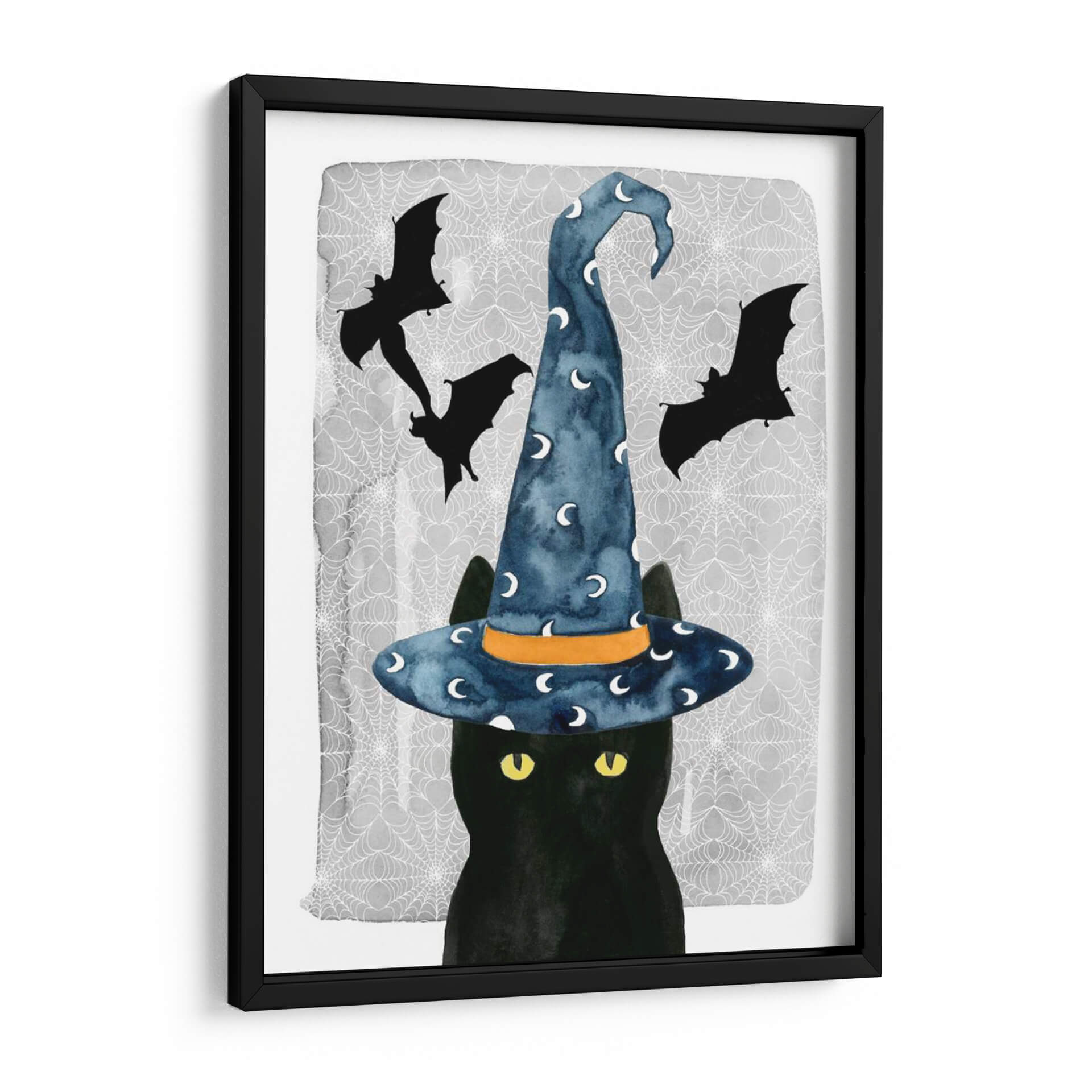 Sumérgete en el encanto místico de "Gato Negro I", una obra de arte cautivadora de Grace Popp que evoca la magia de Halloween con un toque contemporáneo y audaz. Esta pieza presenta un enigmático gato negro, cuyo pelaje profundo contrasta maravillosamente con sus penetrantes ojos amarillos, capturando la esencia de la astucia y el misterio felino. Coronado con un sombrero de bruja azul vibrante, adornado con lunas plateadas y detallado con una banda naranja, el gato parece estar a punto de desatar un hechizo o embarcarse en una aventura nocturna. El fondo sutilmente texturizado, adornado con telarañas delicadas y siluetas de murciélagos en vuelo, refuerza la atmósfera espeluznante pero juguetona de la temporada. El estilo de acuarela de Grace Popp aporta una suavidad etérea a la composición, mientras que la paleta de colores, dominada por el negro profundo, el azul cielo, el gris y toques de naranja y amarillo, crea un equilibrio visual fascinante. Este cuadro decorativo es ideal para añadir un toque de fantasía y carácter a cualquier espacio, desde una sala de estar moderna hasta un dormitorio temático o una oficina creativa. "Gato Negro I" no es solo una obra de arte, es una invitación a abrazar lo lúdico y lo misterioso en tu decoración de pared.