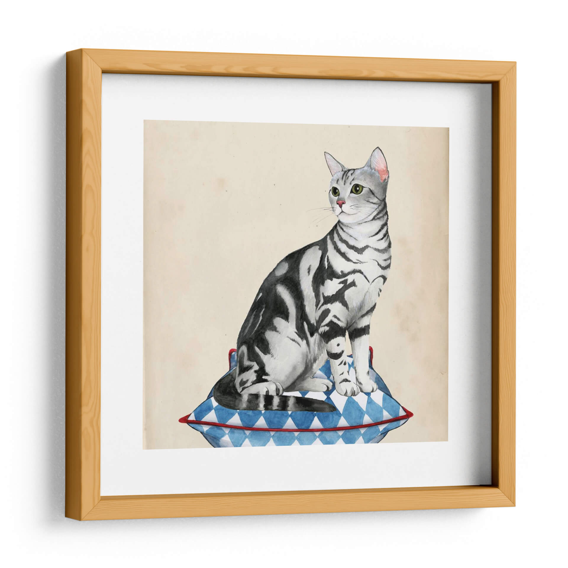 Eleva la decoración de tu hogar con este cautivador cuadro decorativo, 'Lady Cat I', de la aclamada artista Grace Popp. Esta obra de arte captura la elegancia y el misterio de un gato atigrado sentado majestuosamente sobre un cojín de diseño. La paleta de colores, dominada por suaves tonos beige en el fondo y contrastes nítidos de blanco, negro y gris en el felino, crea una atmósfera serena pero llamativa. El cojín, con su vibrante patrón de rombos en azul y blanco, añade un toque de sofisticación y color, complementando la figura central sin opacarla. El estilo, que evoca una mezcla entre lo clásico y lo contemporáneo, con toques que recuerdan a la acuarela por su delicadeza, hace que esta pieza sea versátil para diversos estilos de interiores. Imagina este cuadro decorativo como el punto focal en tu sala de estar, aportando personalidad y un aire de calma. Es también una opción encantadora para un dormitorio, un estudio o incluso una oficina, añadiendo un toque de distinción y calidez. La mirada del gato, serena y observadora, invita a la contemplación y añade una narrativa sutil a la pieza. 'Lady Cat I' no es solo una imagen, es una declaración de estilo y un refugio visual para amantes del arte y la estética felina.