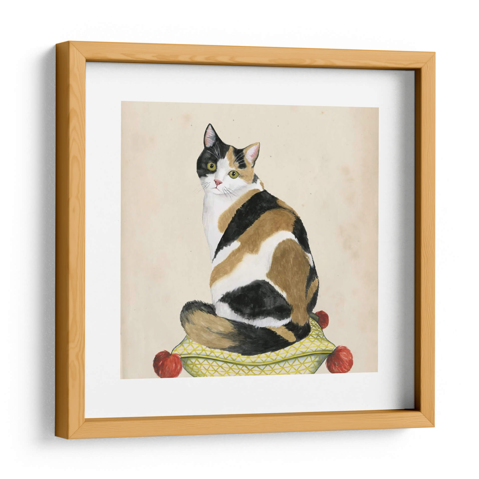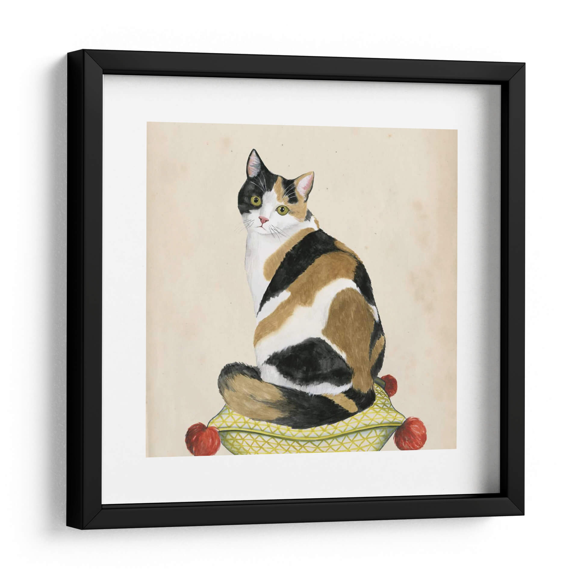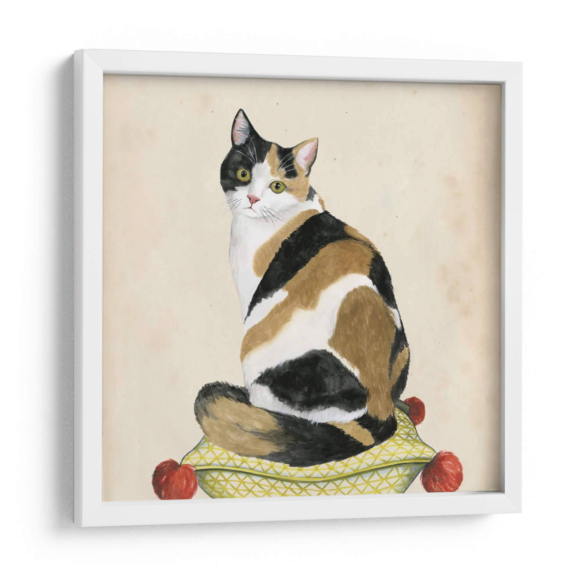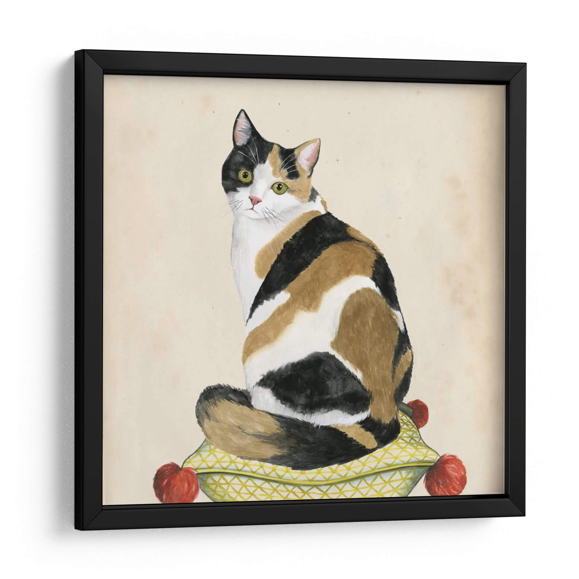 Adéntrate en el encantador mundo de "Lady Cat III" de Grace Popp, una obra de arte que captura la elegancia y el misterio felino con una paleta de colores cálidos y texturas evocadoras. Este cuadro decorativo presenta un majestuoso gato tricolor sentado en un cojín adornado con un patrón geométrico y detalles rojos vibrantes, todo sobre un fondo de tono sepia que evoca una sensación de nostalgia y calidez. El estilo distintivo de la artista, que mezcla lo figurativo con un toque de acuarela y detalle minucioso, da vida a esta pieza, invitando al espectador a contemplar la serenidad y la independencia de la figura central. Los ojos penetrantes del gato, llenos de inteligencia, son el foco de la composición, atrayendo la atención y creando una conexión emocional. "Lady Cat III" es una adición perfecta para aquellos que buscan infundir sus espacios con personalidad y un toque de sofisticación. Ideal para salones, estudios o cualquier rincón que desee un acento de carácter y calidez, este cuadro decorativo contemporáneo transformará tu hogar en una galería personal, reflejando un aprecio por la belleza sutil y el encanto animal. Su versatilidad cromática permite integrarlo fácilmente en diversas decoraciones, aportando un punto de interés visual sin sobrecargar el ambiente.