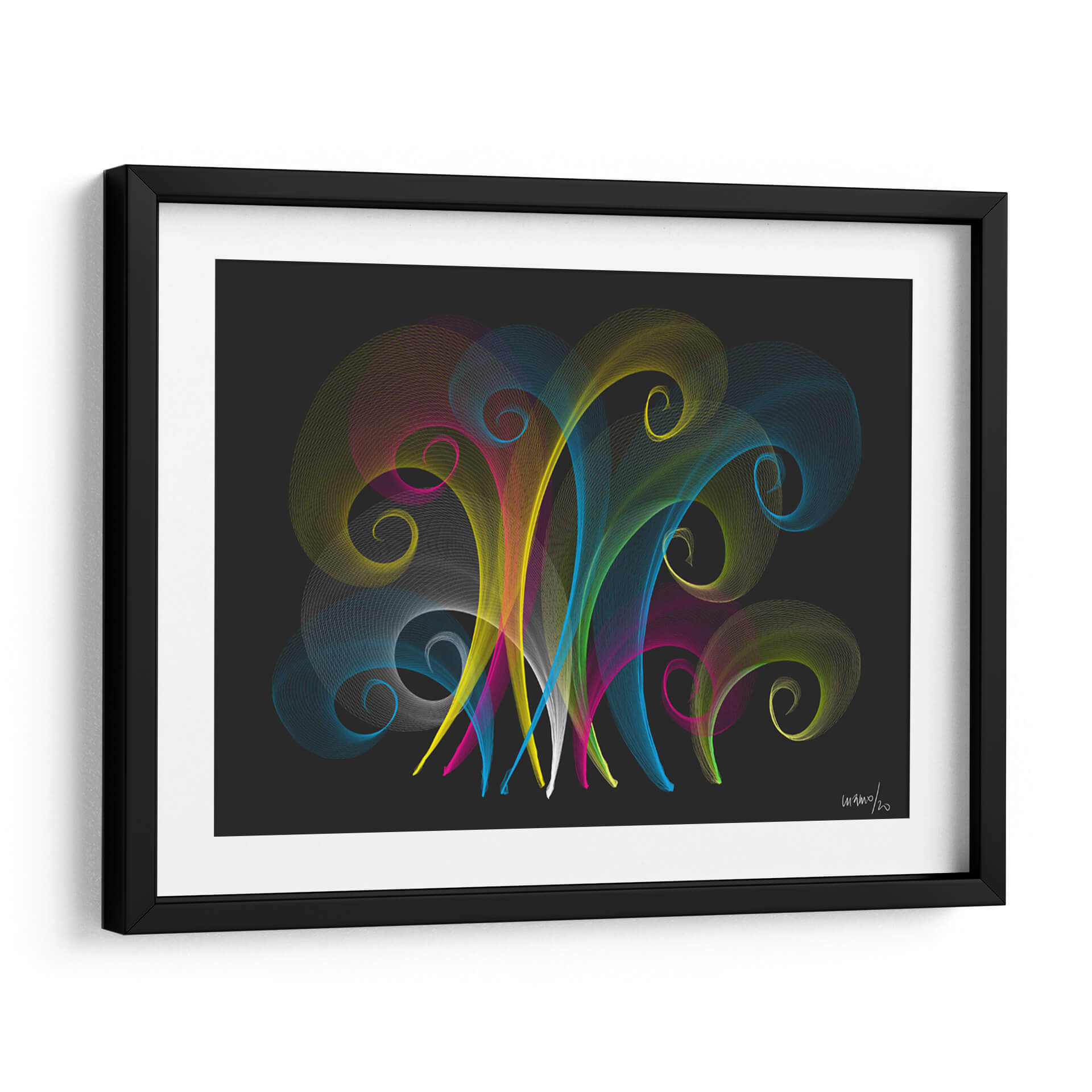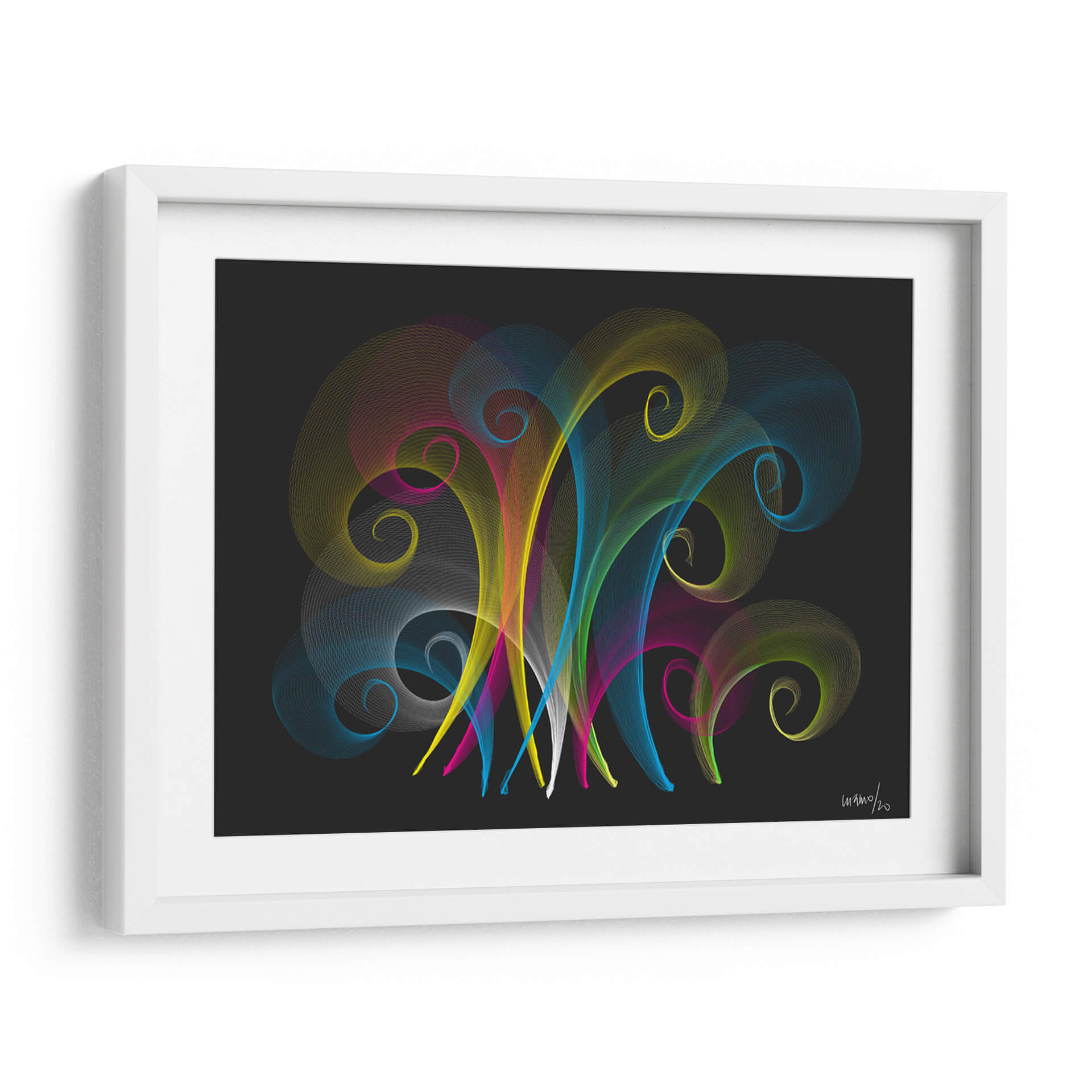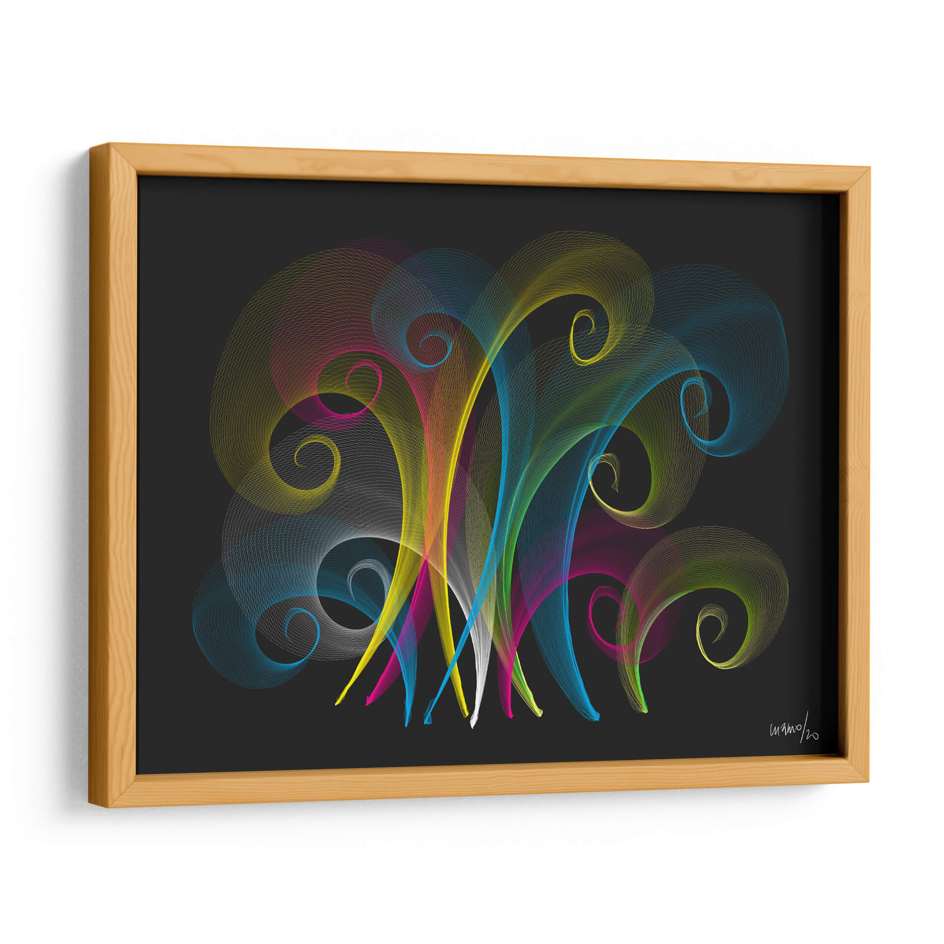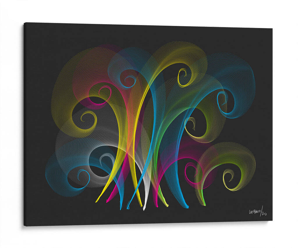 Embárcate en un viaje visual con 'Pirotecnia', una obra de arte contemporáneo de Gina Villalobos que celebra la energía y la explosión de color. Este cuadro decorativo presenta delicadas líneas fluidas en tonos vibrantes de amarillo, azul, rosa y verde, que se entrelazan y curvan sobre un fondo oscuro y enigmático. La composición evoca la sensación de fuegos artificiales abstractos o corrientes de energía pura, creando un impacto visual dinámico y cautivador. Cada espiral y trazo parece bailar en el espacio, invitando a la contemplación y la admiración. El contraste entre la vivacidad de los colores y la profundidad del fondo oscuro genera una atmósfera de sofisticación y modernidad. 'Pirotecnia' es ideal para infundir vitalidad y un toque artístico único en cualquier estancia, ya sea una sala de estar moderna, un estudio creativo o una oficina que busca inspiración. Este cuadro abstracto es una pieza versátil que puede adaptarse a diversos estilos decorativos, aportando un punto focal lleno de vida y expresión artística. Descubre cómo esta obra puede transformar tu espacio y añadir una dimensión de color y movimiento a tu decoración.