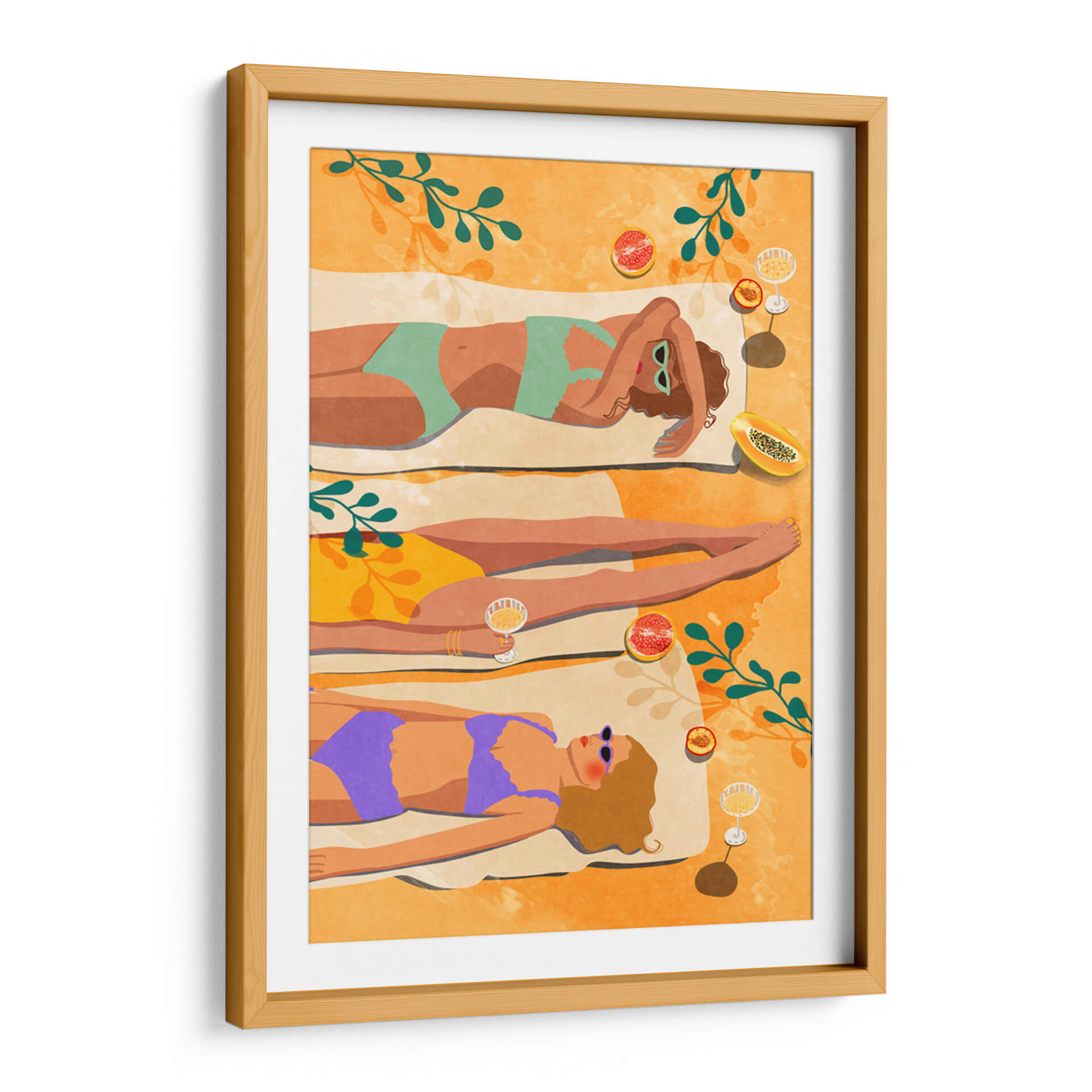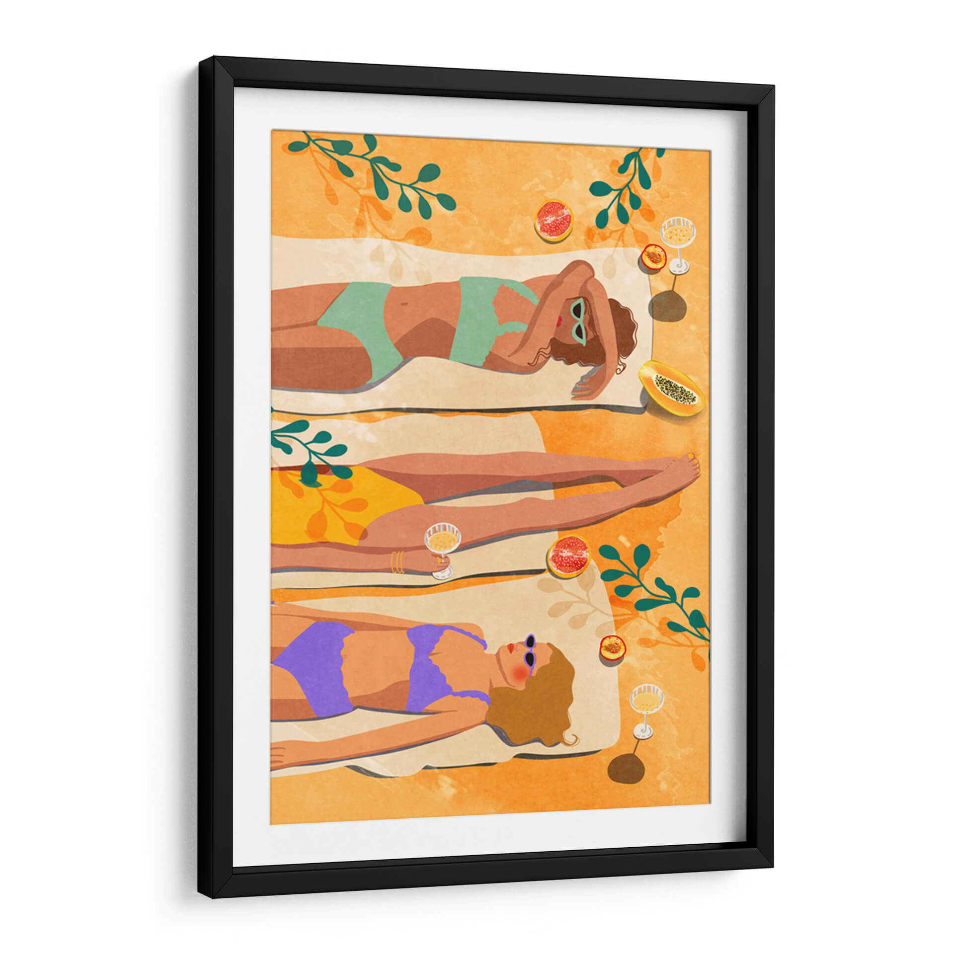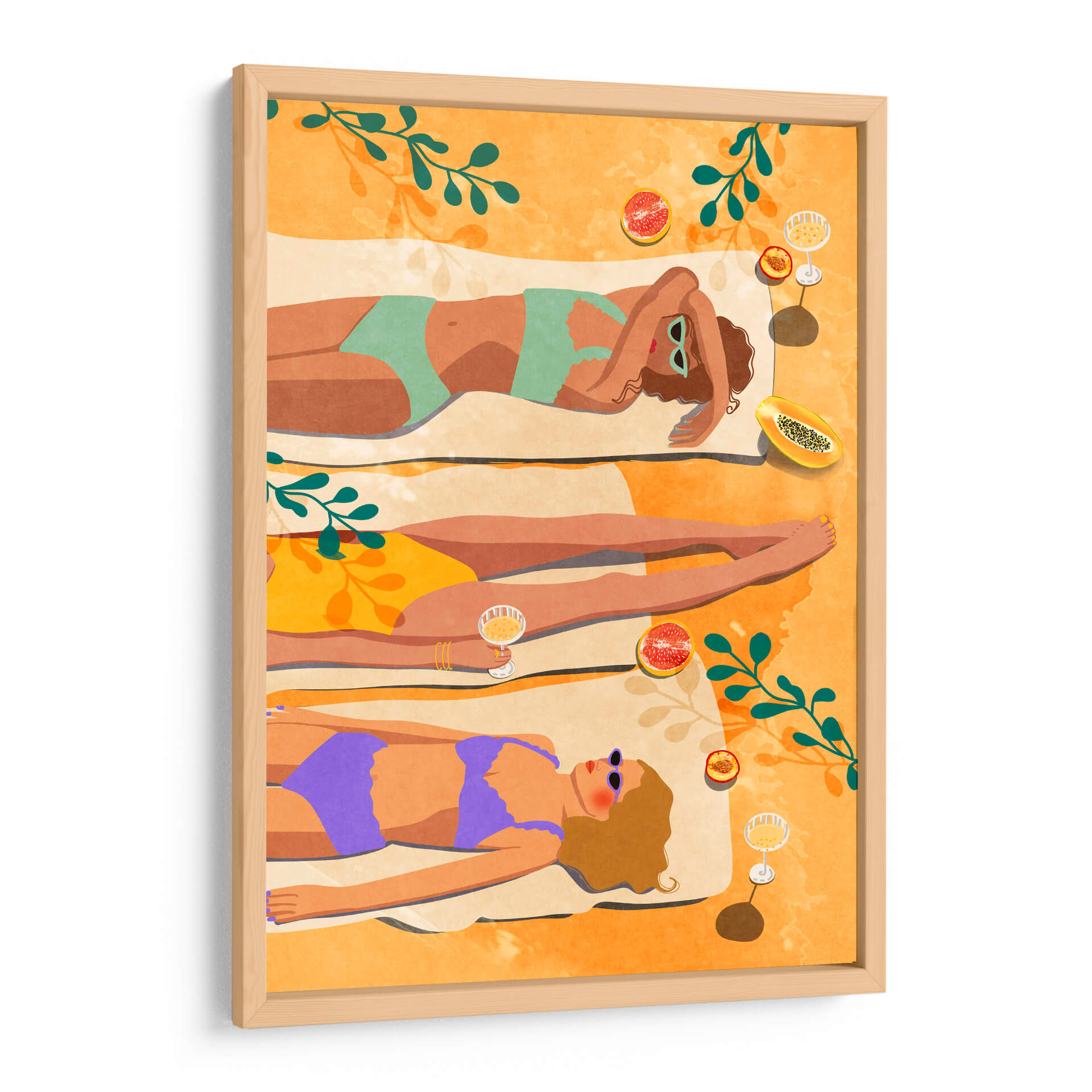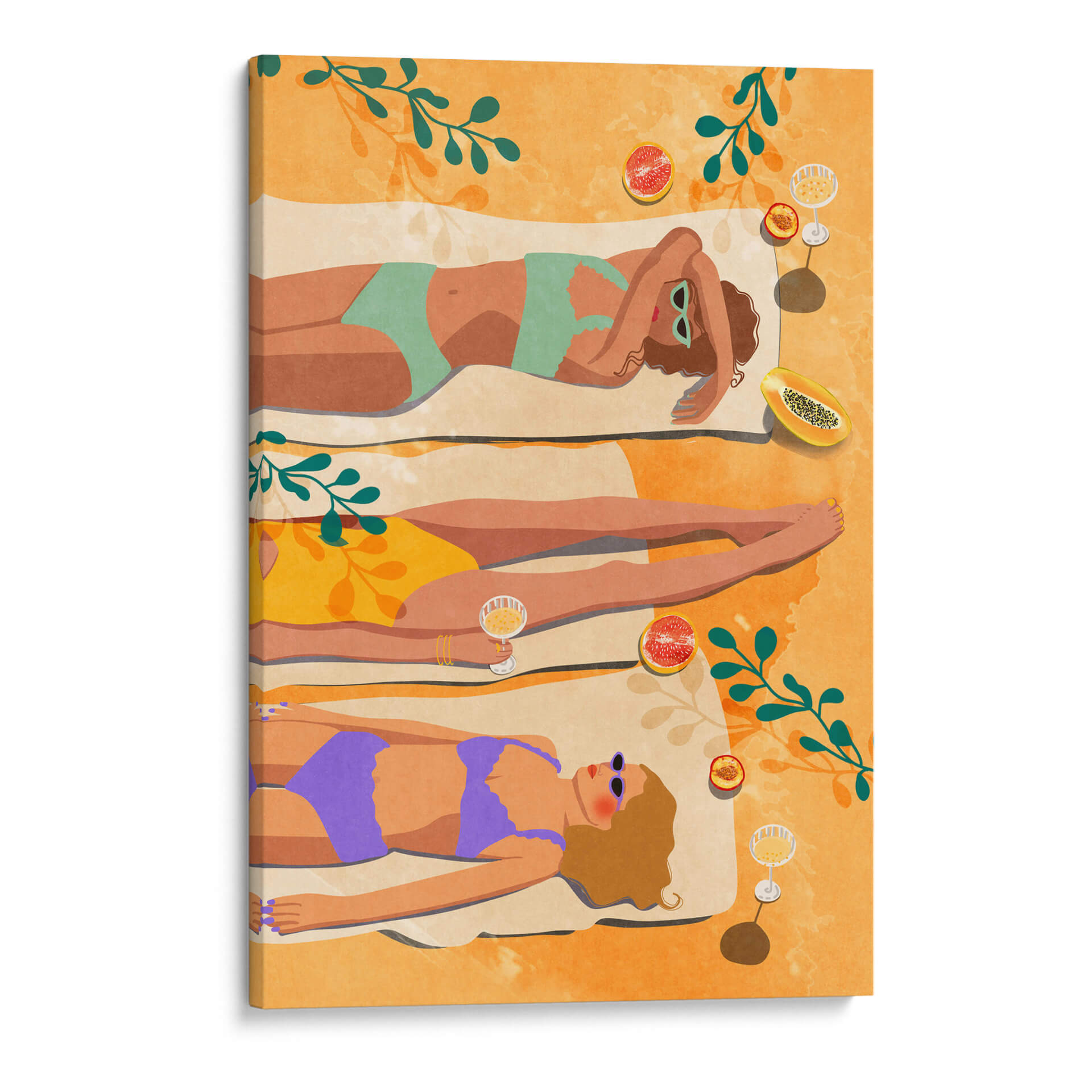 Sumérgete en la calidez y la despreocupación del verano con "Chicas de Verano", una vibrante obra de arte de Raissa Oltmanns. Esta pieza captura la esencia de un día perfecto bajo el sol, presentando a tres mujeres relajándose en la playa, rodeadas de frutas frescas y copas de espumoso. La paleta de colores, dominada por tonos cálidos de naranja y ocre, evoca la sensación del sol en la piel y la arena dorada, mientras que los toques de verde de las ramas y el turquesa y morado de los trajes de baño añaden un contraste refrescante y moderno. El estilo ilustrativo, con sus formas estilizadas y un toque de simplificación, confiere a la obra una atmósfera contemporánea y optimista. Es ideal para añadir un toque de alegría y vitalidad a cualquier espacio, ya sea una sala de estar, un dormitorio o un refugio junto a la piscina. Este cuadro decorativo no solo embellece tu hogar, sino que también te transporta a esos momentos de placer y descanso estival. La composición, que organiza las figuras en una disposición casi simétrica pero con un dinamismo orgánico, invita a la contemplación de la amistad y el disfrute de los placeres sencillos de la vida. "Chicas de Verano" es la elección perfecta para quienes buscan una decoración de pared que celebre la belleza del verano y la conexión humana.