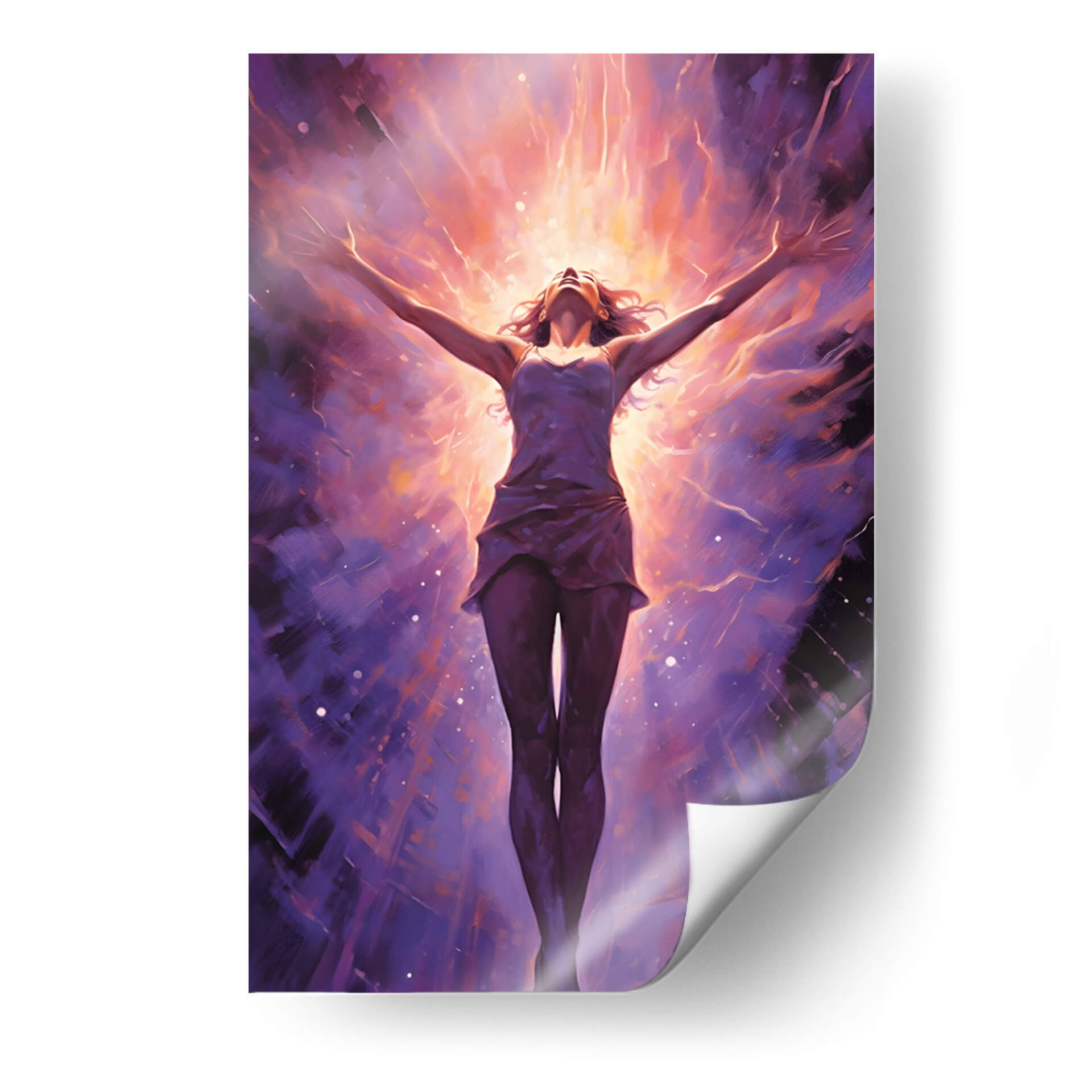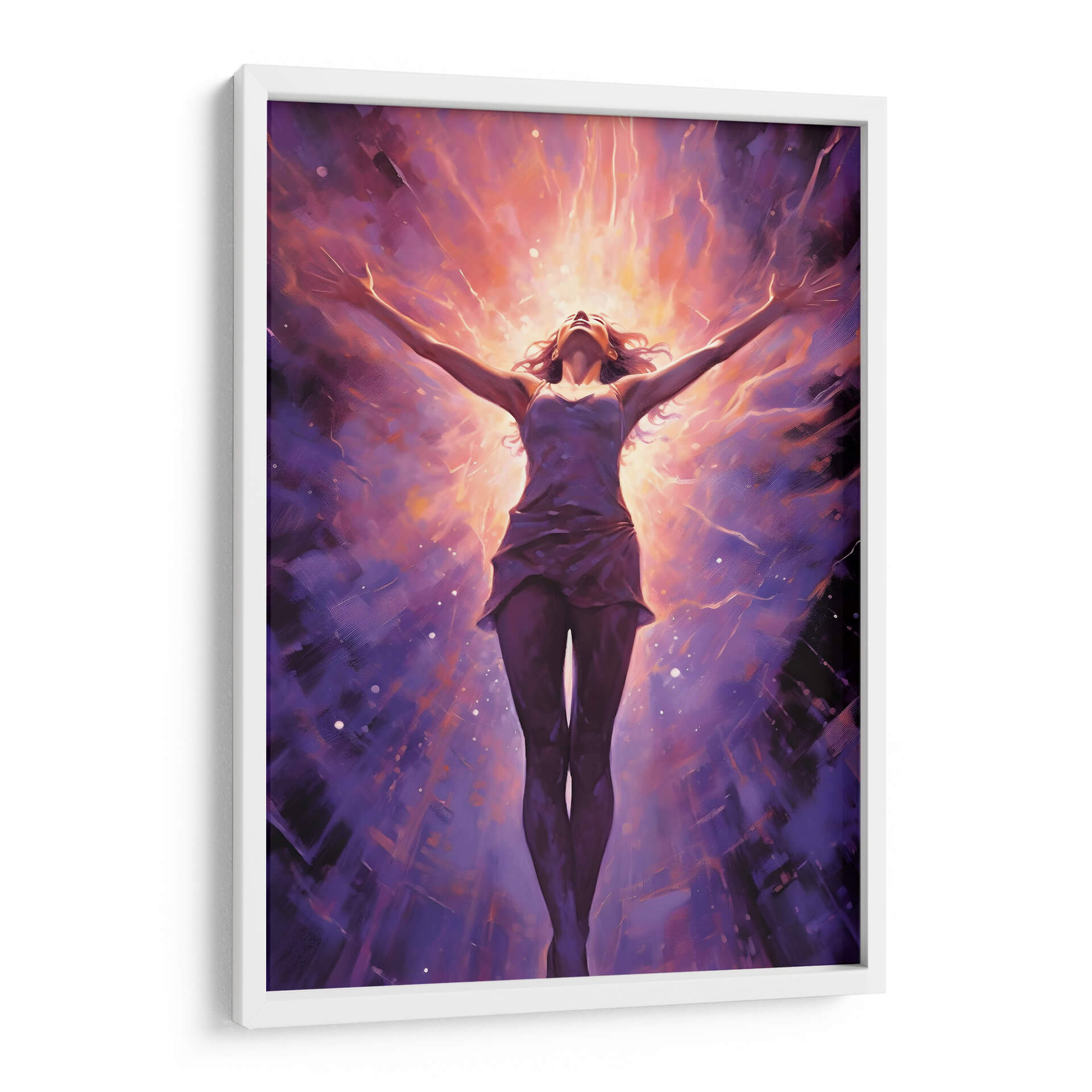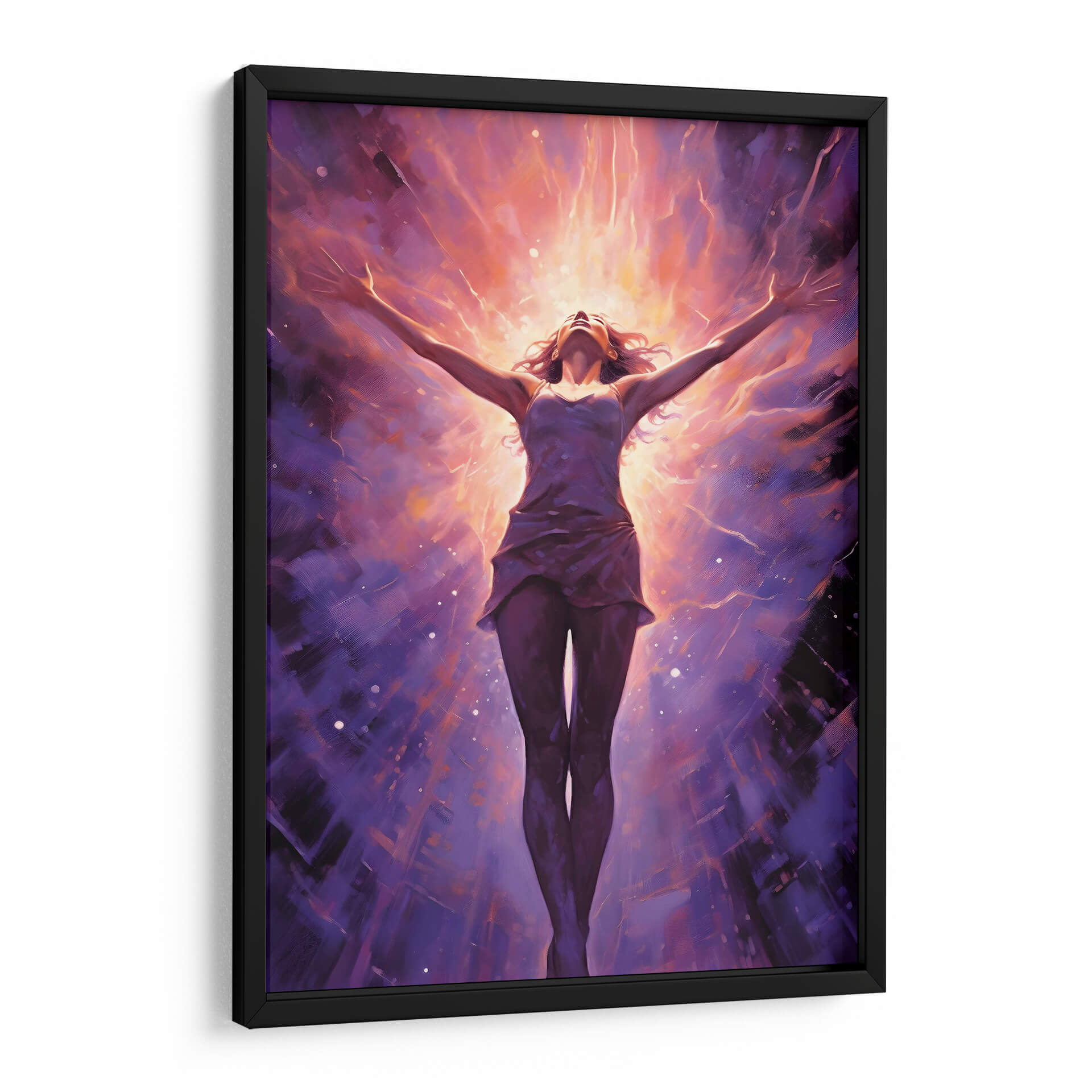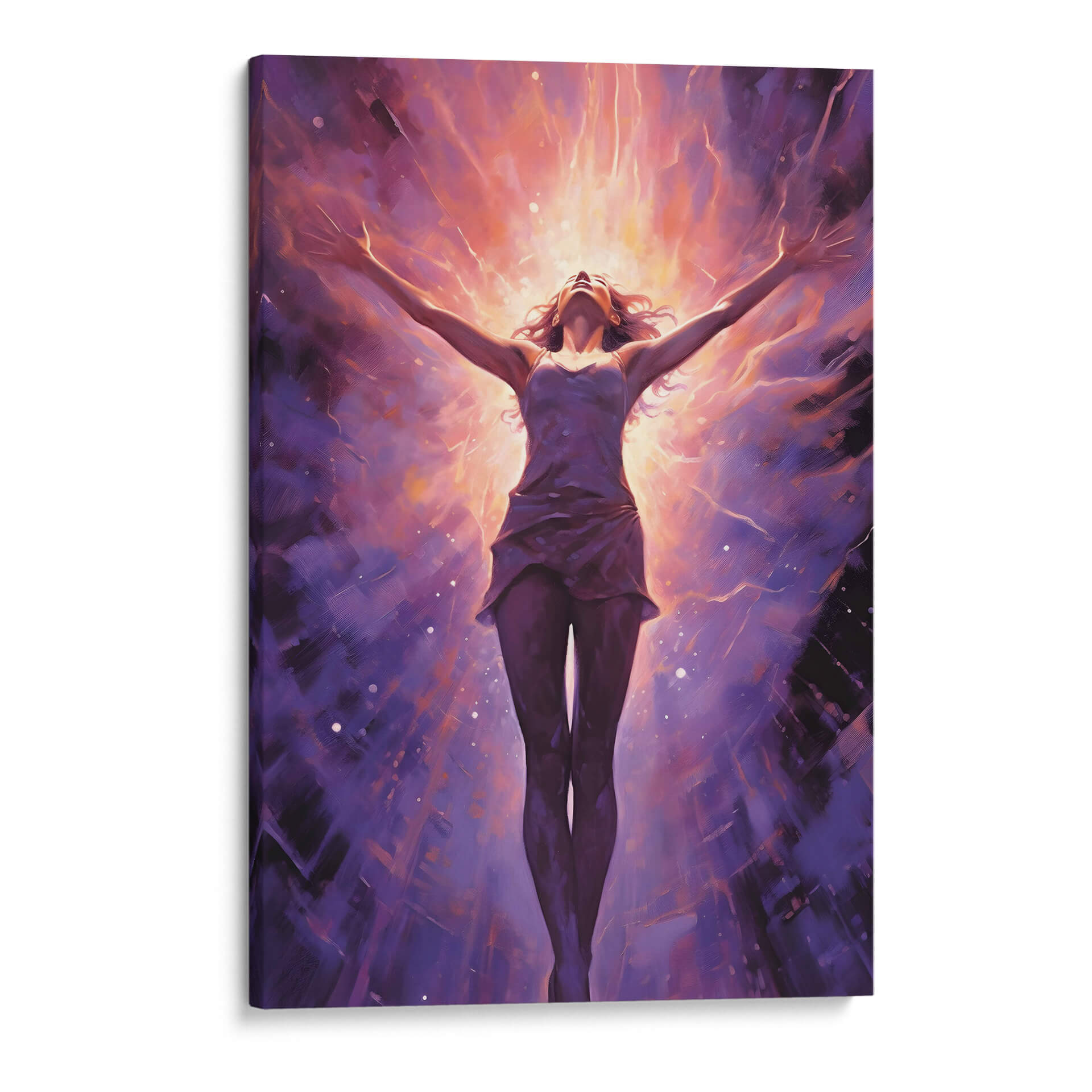 Sumérgete en la energía vibrante de "CHICA LIBRE Y PODEROSA", una obra maestra de Dav Madrid que captura la esencia de la emancipación y la fuerza interior. Esta pieza visualmente impactante presenta a una figura femenina con los brazos extendidos hacia un cielo radiante, envuelta en una explosión de colores cálidos y fríos. Los tonos morados profundos del fondo contrastan con los destellos naranjas y dorados del centro, creando una atmósfera de trascendencia y poder. El estilo pictórico, con pinceladas expresivas y un toque de abstracción, invita a la contemplación y a la conexión emocional. Ideal para aquellos que buscan inspirar sus espacios con un mensaje de libertad y empoderamiento, este cuadro decorativo se convertirá en el punto focal de cualquier habitación, ya sea un salón moderno, una oficina o un santuario personal. Su composición dinámica y su paleta de colores intensa la hacen perfecta para añadir un toque de audacia y sofisticación a la decoración de paredes.