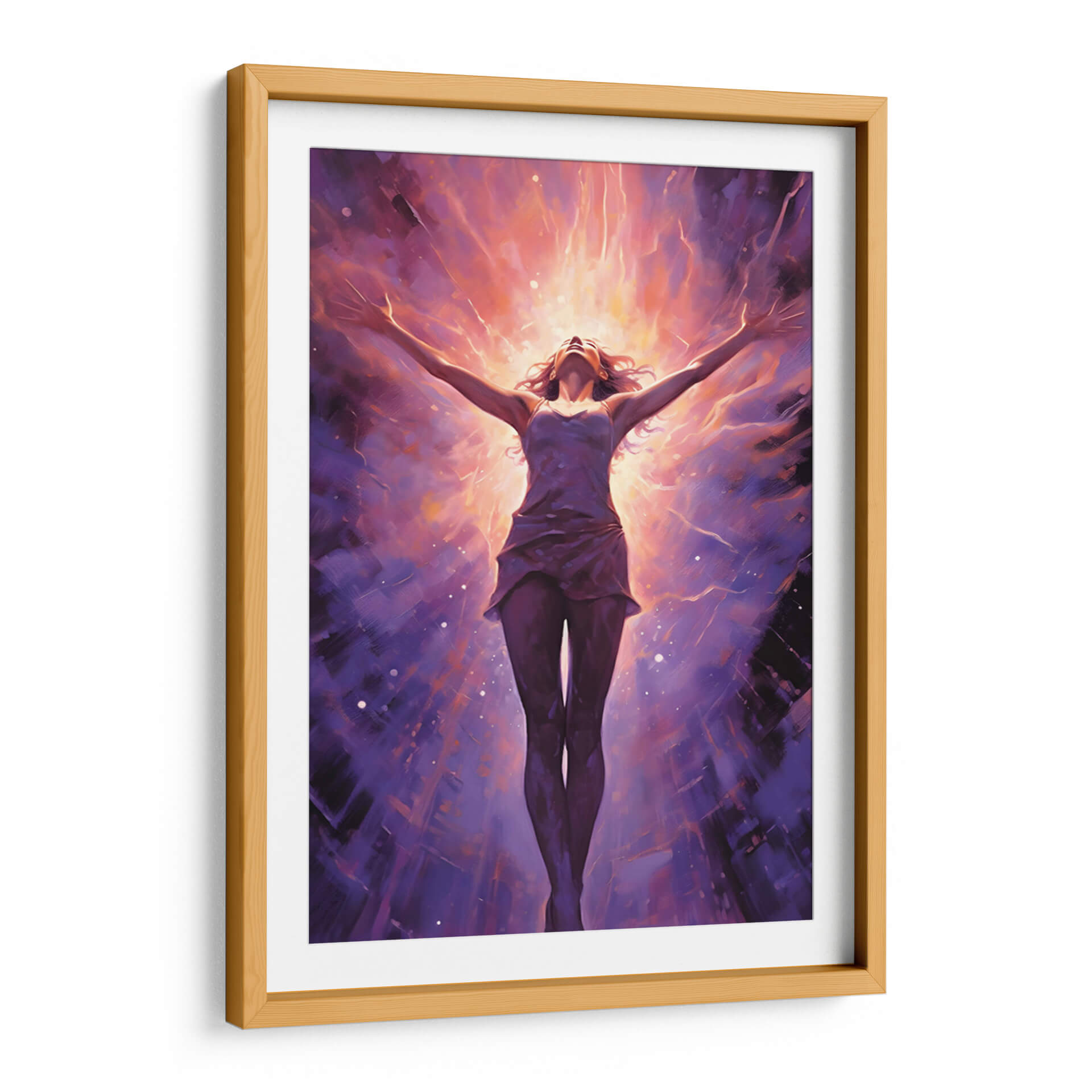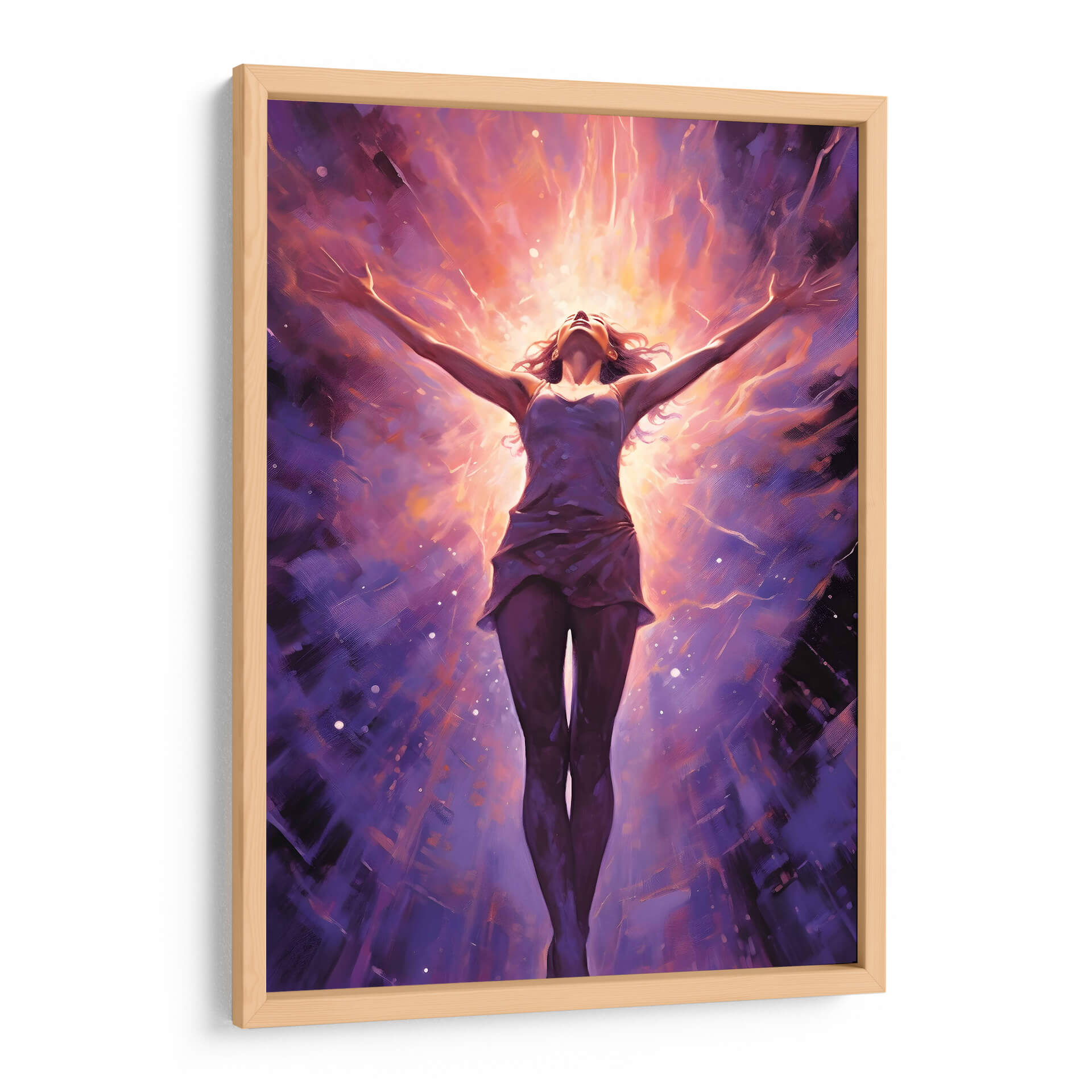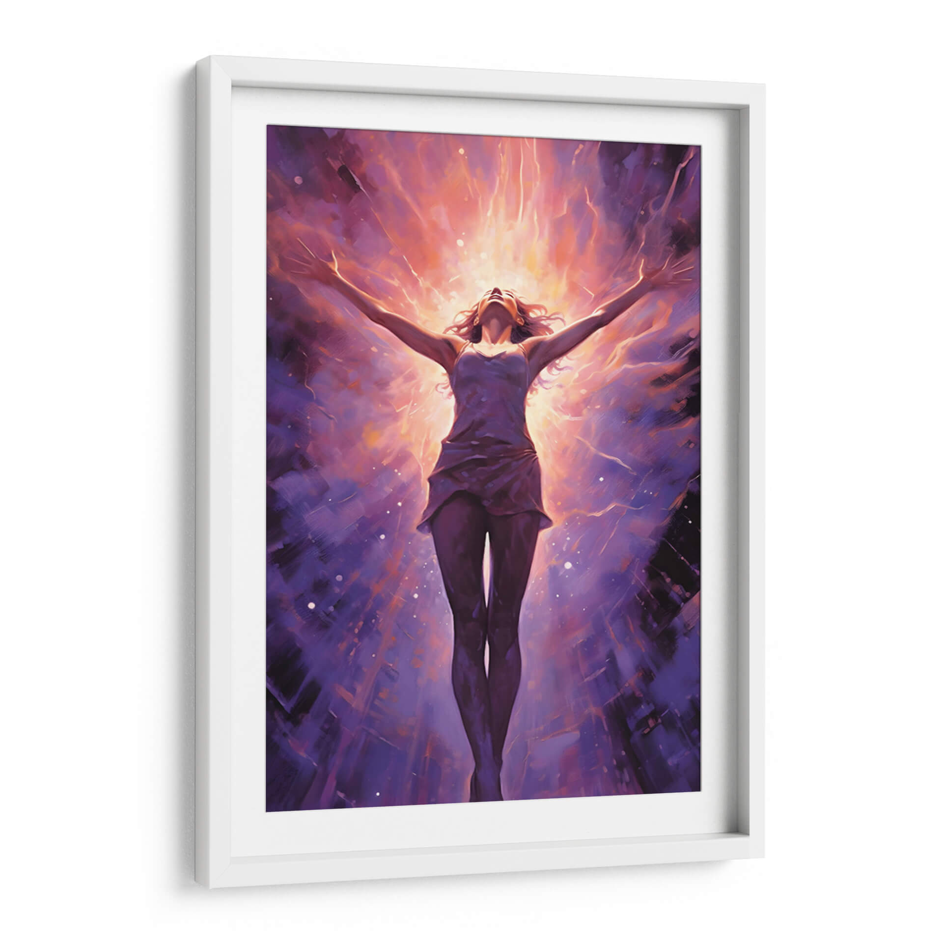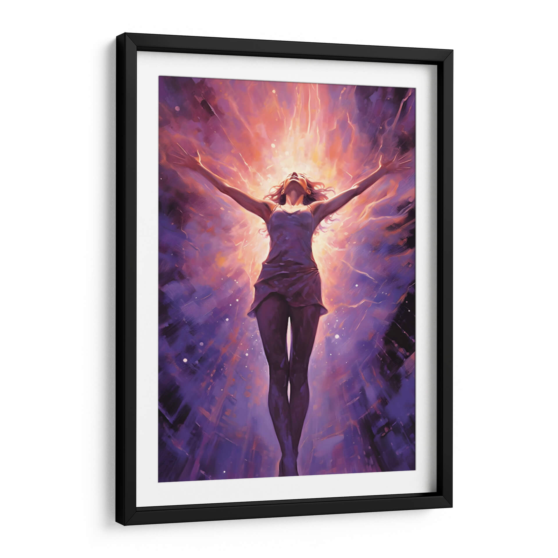 Sumérgete en la energía vibrante de "CHICA LIBRE Y PODEROSA", una obra maestra de Dav Madrid que captura la esencia de la emancipación y la fuerza interior. Esta pieza visualmente impactante presenta a una figura femenina con los brazos extendidos hacia un cielo radiante, envuelta en una explosión de colores cálidos y fríos. Los tonos morados profundos del fondo contrastan con los destellos naranjas y dorados del centro, creando una atmósfera de trascendencia y poder. El estilo pictórico, con pinceladas expresivas y un toque de abstracción, invita a la contemplación y a la conexión emocional. Ideal para aquellos que buscan inspirar sus espacios con un mensaje de libertad y empoderamiento, este cuadro decorativo se convertirá en el punto focal de cualquier habitación, ya sea un salón moderno, una oficina o un santuario personal. Su composición dinámica y su paleta de colores intensa la hacen perfecta para añadir un toque de audacia y sofisticación a la decoración de paredes.