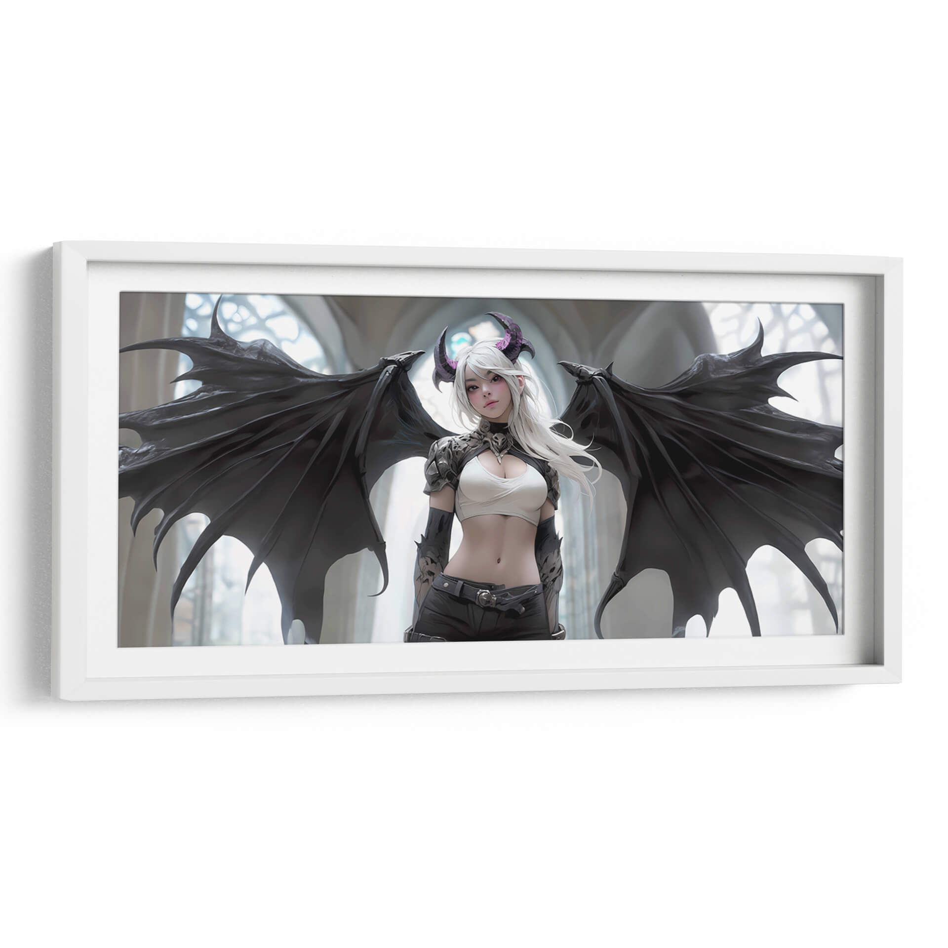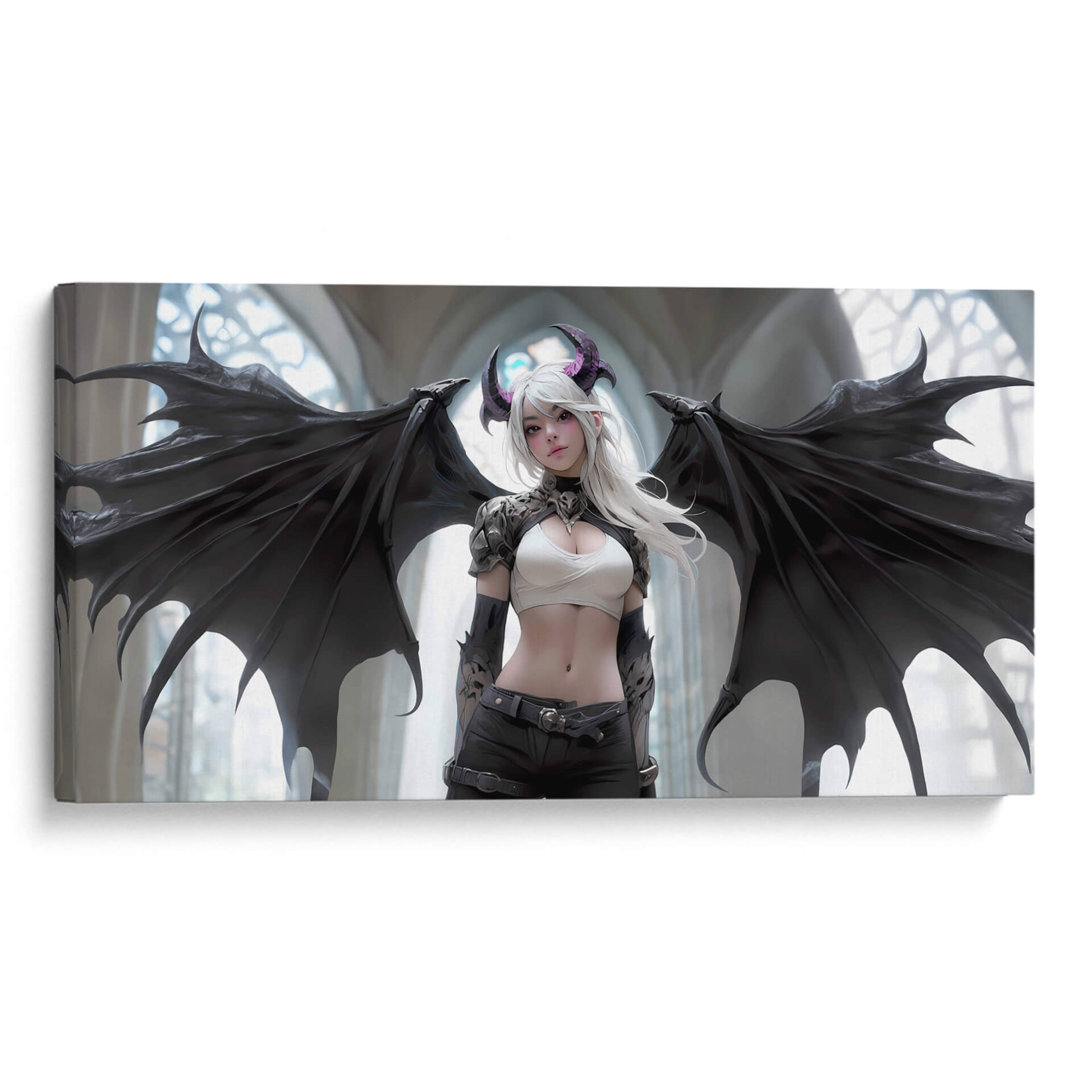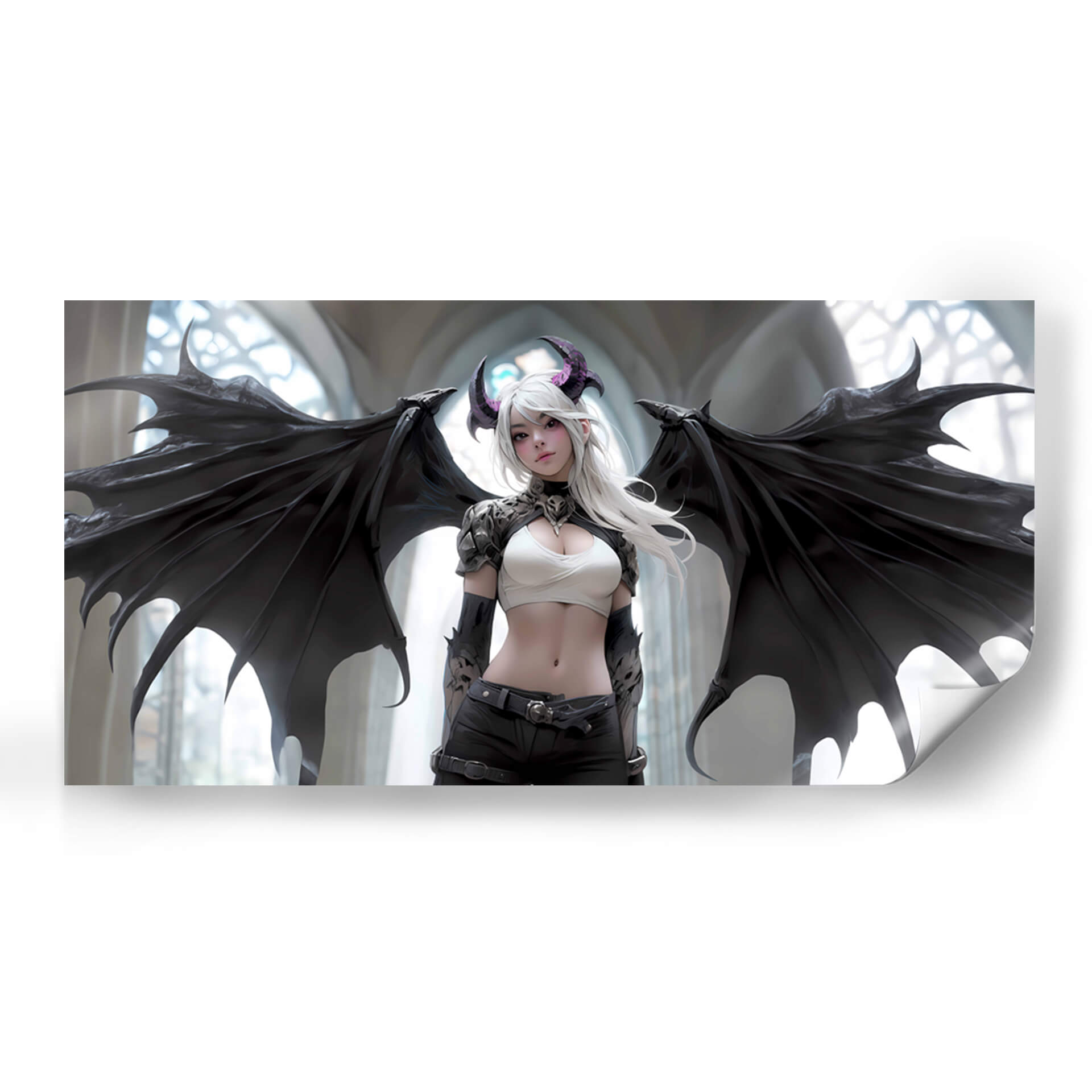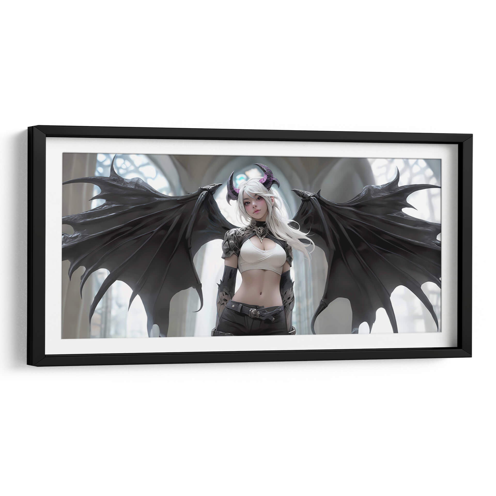 Sumérgete en el enigmático mundo de "Demonia Obscura - 2", una obra de arte digital que cautiva con su poderosa estética y atmósfera de misterio. Este cuadro decorativo presenta a una figura femenina etérea, adornada con imponentes alas de murciélago en tonos oscuros y cuernos que sugieren una naturaleza mística. La delicadeza de su cabello plateado contrasta con la intensidad de su mirada, mientras que su atuendo moderno y atrevido evoca una dualidad fascinante entre lo oscuro y lo contemporáneo. El fondo, reminiscentes de una arquitectura gótica o una catedral, con arcos y vidrieras difusas, añade una capa de profundidad y solemnidad a la composición. La paleta de colores, dominada por grises, negros y sutiles toques de morado y blanco, crea un ambiente introspectivo y ligeramente melancólico. Este cuadro decorativo es perfecto para aquellos que buscan añadir un toque de intriga y sofisticación a su hogar u oficina. Ideal para salas de estar, estudios o dormitorios, "Demonia Obscura - 2" invita a la contemplación y se convertirá en un punto focal ineludible en cualquier espacio, transmitiendo una sensación de fuerza y belleza enigmática. Un diseño de arte digital único para amantes de lo fantástico y lo gótico.