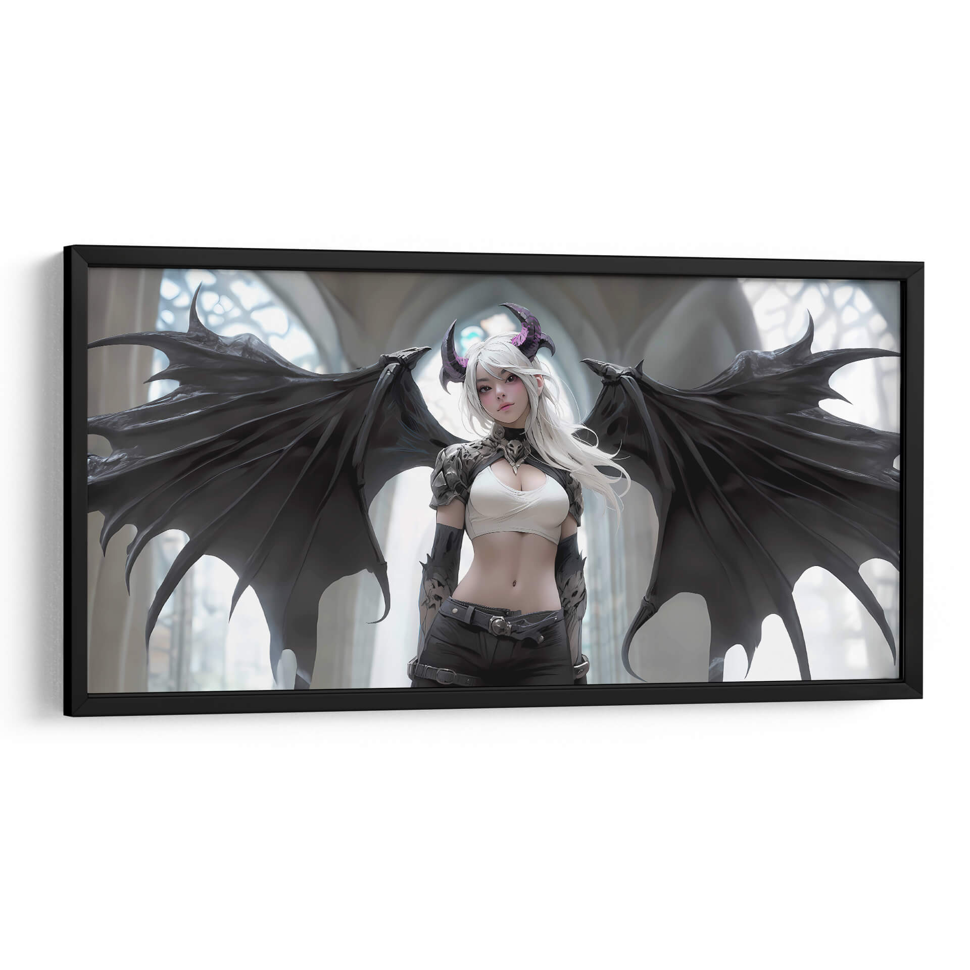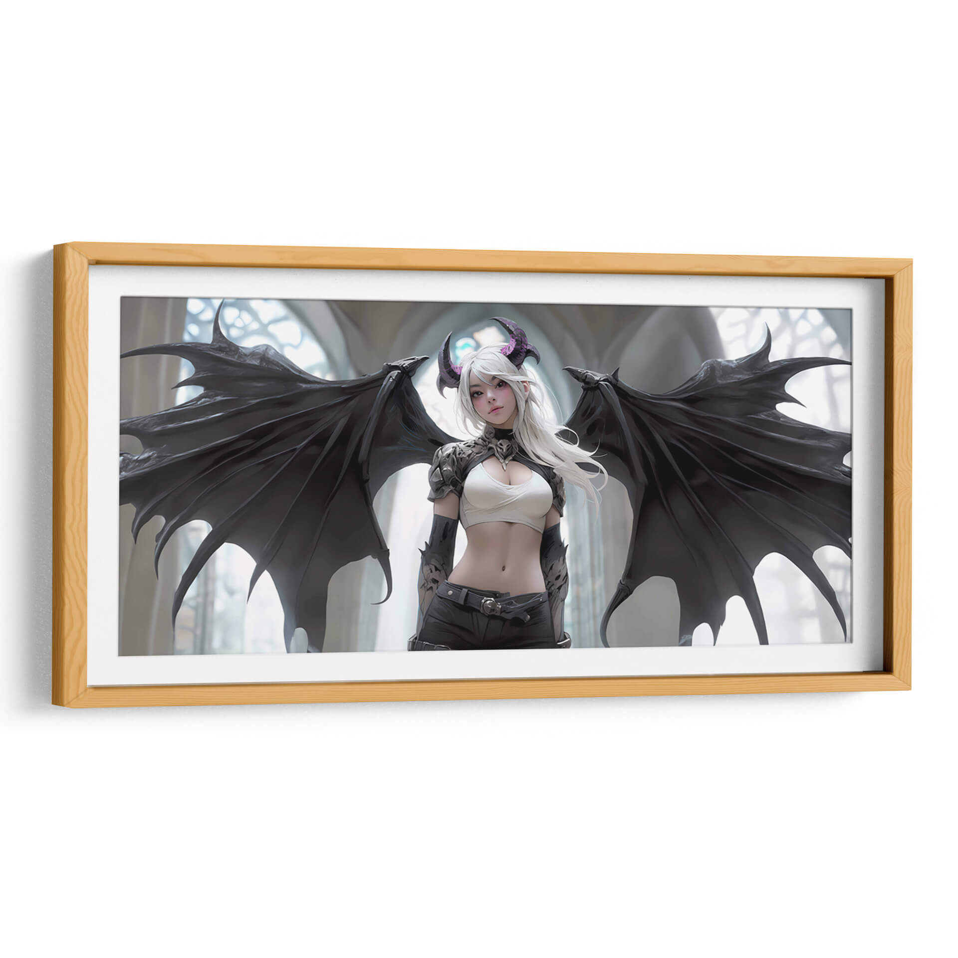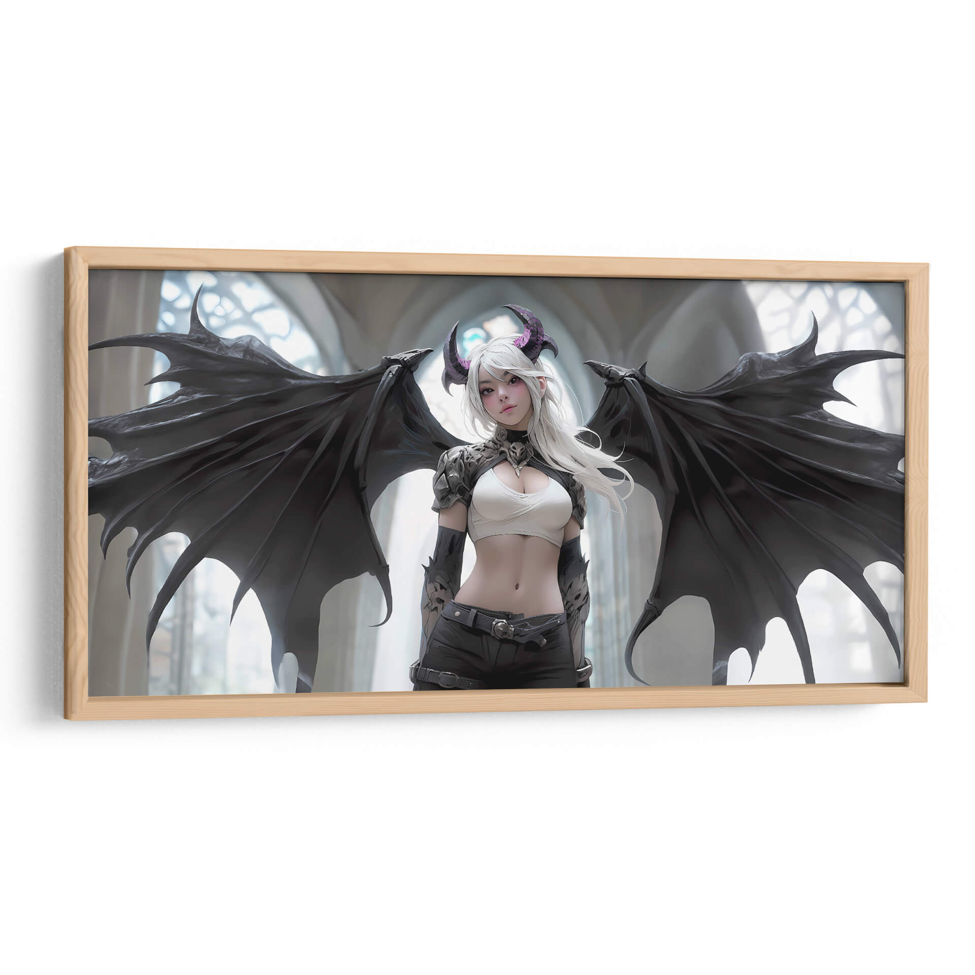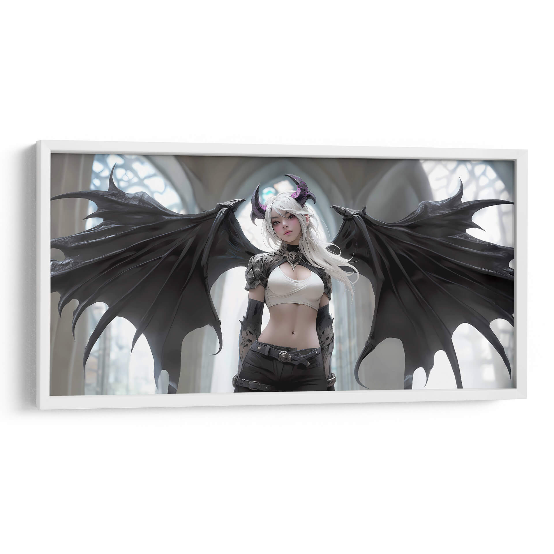 Sumérgete en el enigmático mundo de "Demonia Obscura - 2", una obra de arte digital que cautiva con su poderosa estética y atmósfera de misterio. Este cuadro decorativo presenta a una figura femenina etérea, adornada con imponentes alas de murciélago en tonos oscuros y cuernos que sugieren una naturaleza mística. La delicadeza de su cabello plateado contrasta con la intensidad de su mirada, mientras que su atuendo moderno y atrevido evoca una dualidad fascinante entre lo oscuro y lo contemporáneo. El fondo, reminiscentes de una arquitectura gótica o una catedral, con arcos y vidrieras difusas, añade una capa de profundidad y solemnidad a la composición. La paleta de colores, dominada por grises, negros y sutiles toques de morado y blanco, crea un ambiente introspectivo y ligeramente melancólico. Este cuadro decorativo es perfecto para aquellos que buscan añadir un toque de intriga y sofisticación a su hogar u oficina. Ideal para salas de estar, estudios o dormitorios, "Demonia Obscura - 2" invita a la contemplación y se convertirá en un punto focal ineludible en cualquier espacio, transmitiendo una sensación de fuerza y belleza enigmática. Un diseño de arte digital único para amantes de lo fantástico y lo gótico.