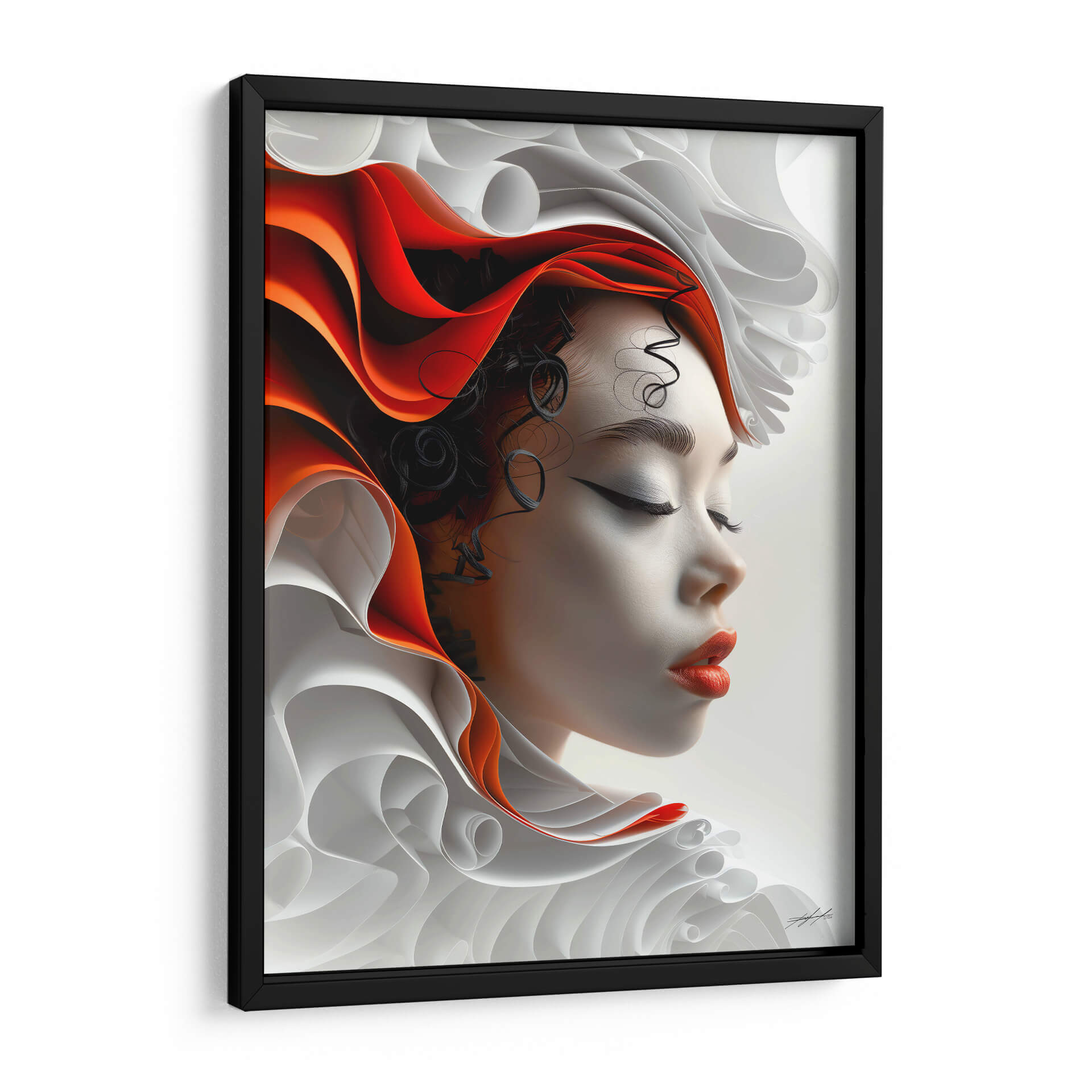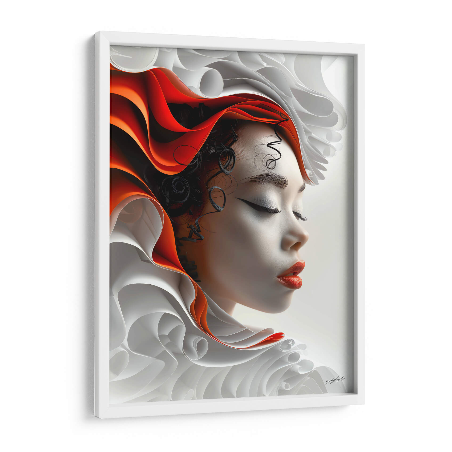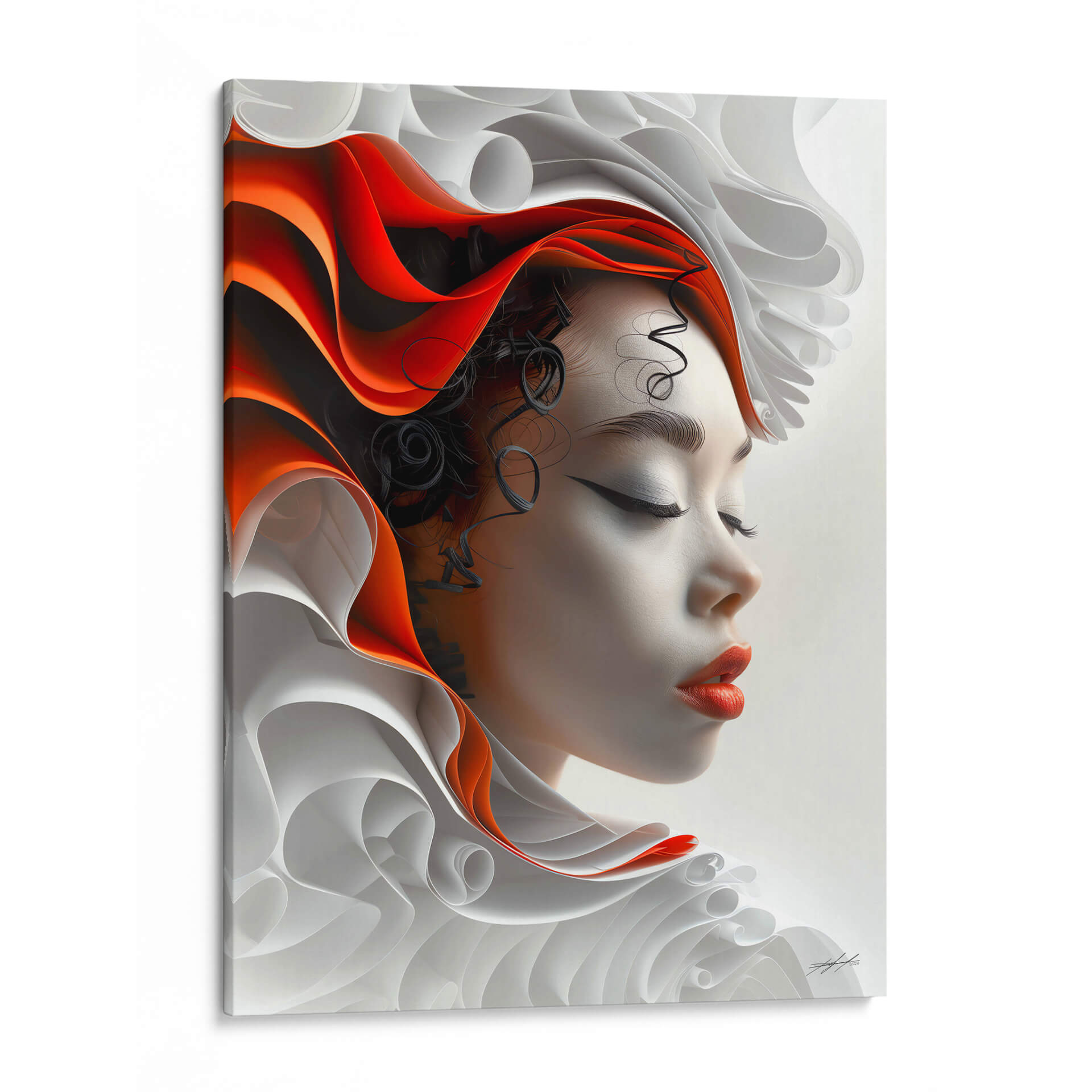 Sumérgete en la sofisticación y el misterio con "Entre Papel - 10", una obra de arte contemporáneo que captura la mirada con su elegante representación de un perfil femenino. La pieza se distingue por una audaz paleta de colores donde vibrantes tonos anaranjados y rojos contrastan dramáticamente con el fondo etéreo y las texturas blancas y fluidas que envuelven a la figura. Estas formas esculturales, que recuerdan a delicadas capas de papel o pétalos, crean un juego de luces y sombras que añade profundidad y dinamismo a la composición. El rostro, con los ojos cerrados y unos labios carnosos pintados en un audaz rojo anaranjado, transmite una sensación de introspección serena, casi onírica. El detallado trabajo en el cabello rizado, junto con la precisa línea de delineado en los ojos, añade un toque de refinamiento moderno. "Entre Papel - 10" es un cuadro decorativo ideal para espacios que buscan un acento de color y elegancia, como salones modernos, tocadores o incluso como pieza central en un estudio de moda o un dormitorio contemporáneo. Su estilo único, que fusiona el retrato con elementos abstractos y orgánicos, lo convierte en una adición impactante y memorable a cualquier decoración interior, invitando a la contemplación y al asombro.