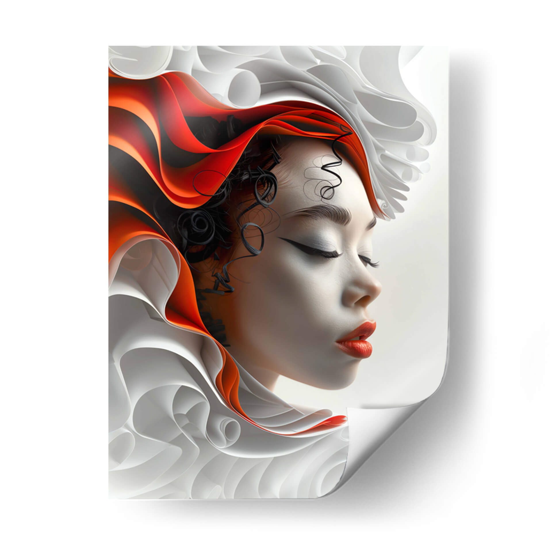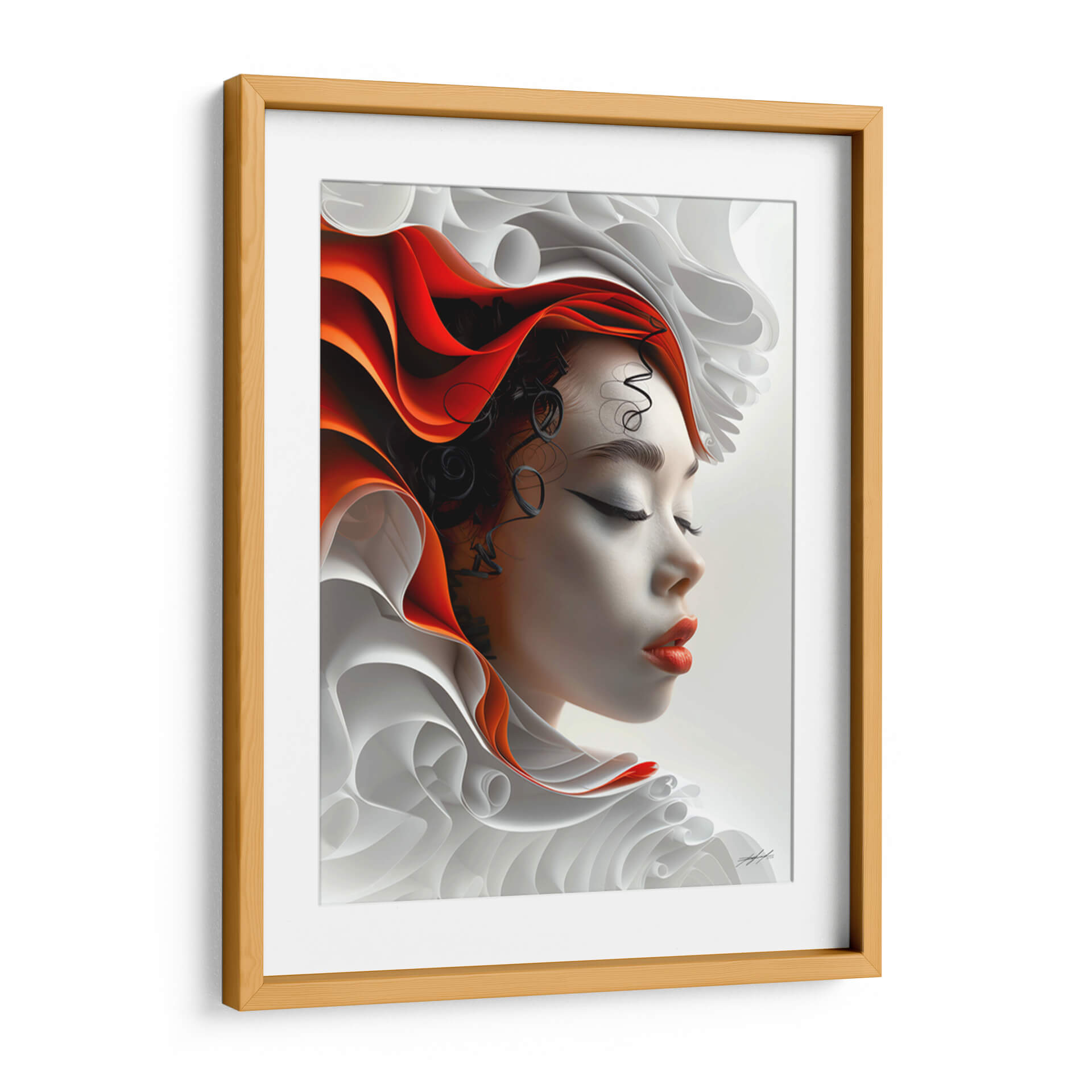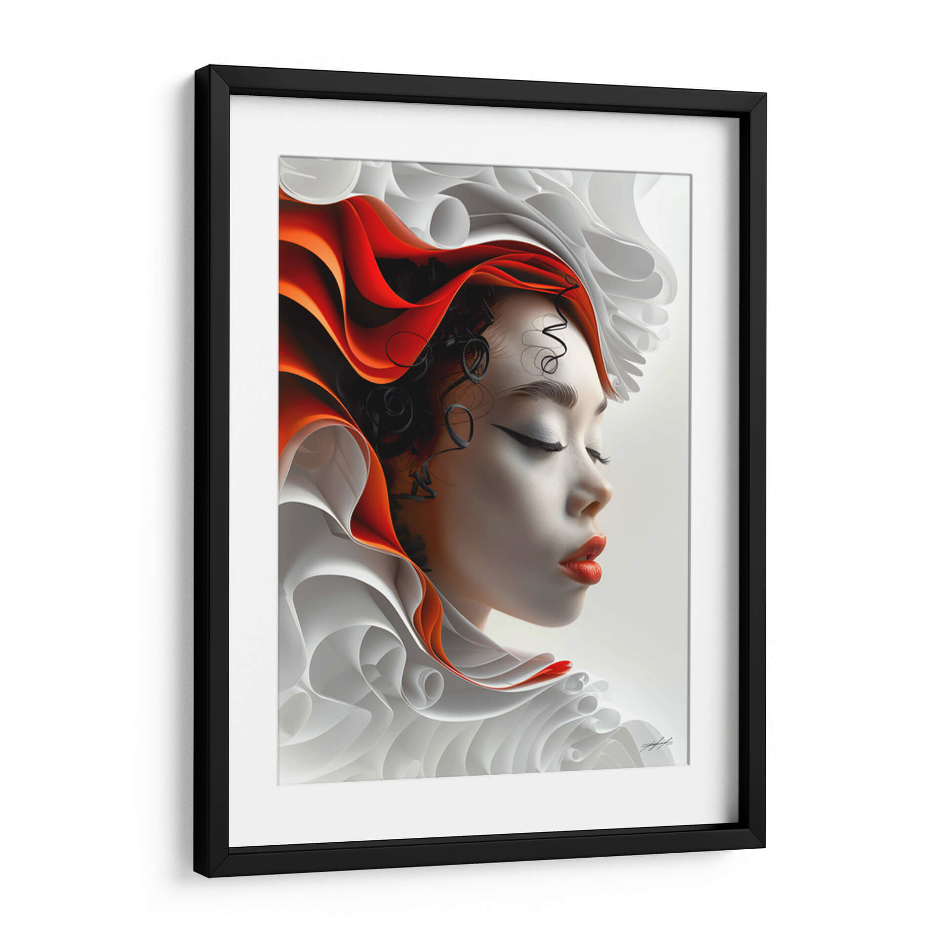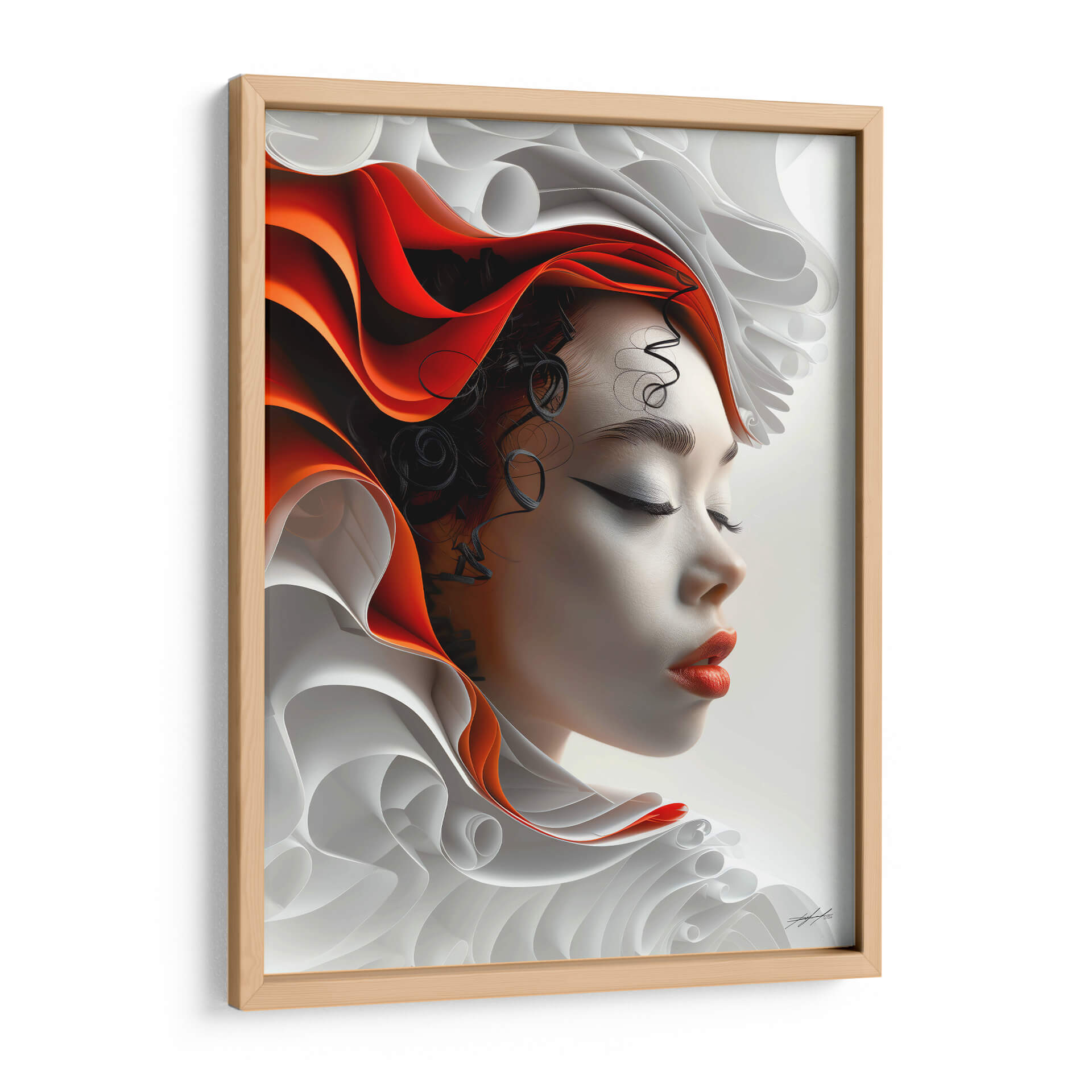 Sumérgete en la sofisticación y el misterio con "Entre Papel - 10", una obra de arte contemporáneo que captura la mirada con su elegante representación de un perfil femenino. La pieza se distingue por una audaz paleta de colores donde vibrantes tonos anaranjados y rojos contrastan dramáticamente con el fondo etéreo y las texturas blancas y fluidas que envuelven a la figura. Estas formas esculturales, que recuerdan a delicadas capas de papel o pétalos, crean un juego de luces y sombras que añade profundidad y dinamismo a la composición. El rostro, con los ojos cerrados y unos labios carnosos pintados en un audaz rojo anaranjado, transmite una sensación de introspección serena, casi onírica. El detallado trabajo en el cabello rizado, junto con la precisa línea de delineado en los ojos, añade un toque de refinamiento moderno. "Entre Papel - 10" es un cuadro decorativo ideal para espacios que buscan un acento de color y elegancia, como salones modernos, tocadores o incluso como pieza central en un estudio de moda o un dormitorio contemporáneo. Su estilo único, que fusiona el retrato con elementos abstractos y orgánicos, lo convierte en una adición impactante y memorable a cualquier decoración interior, invitando a la contemplación y al asombro.