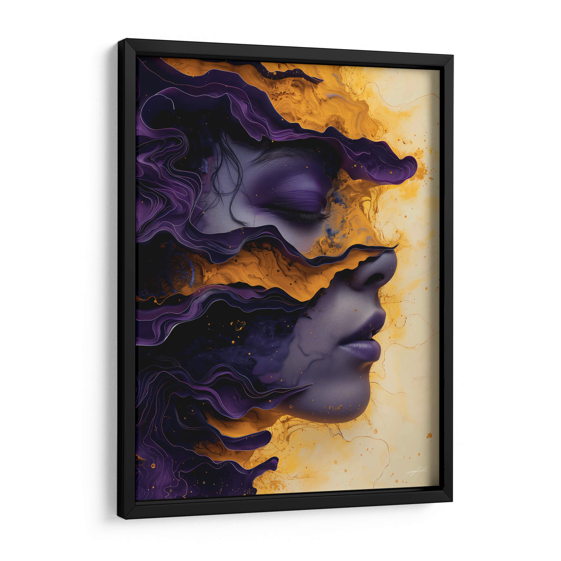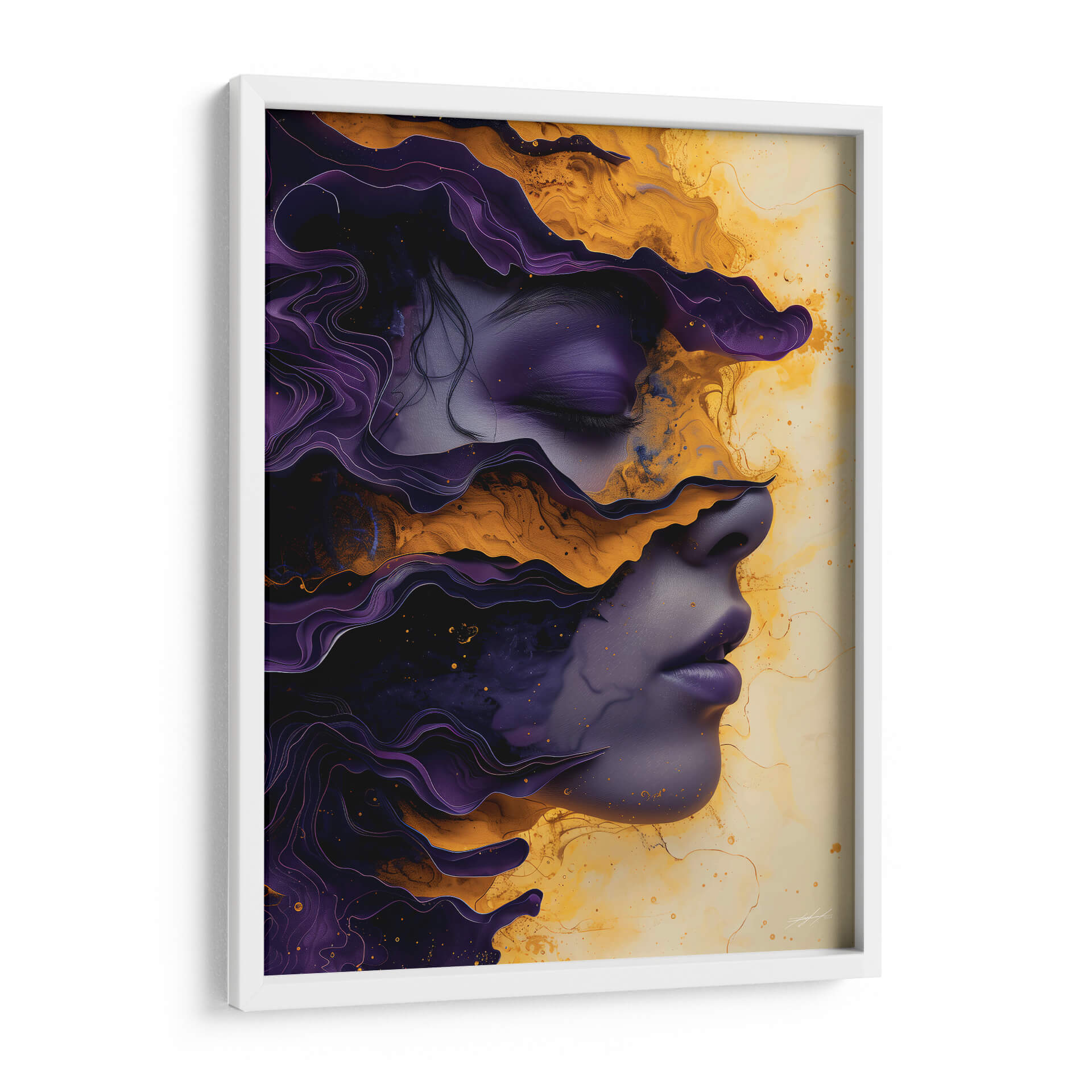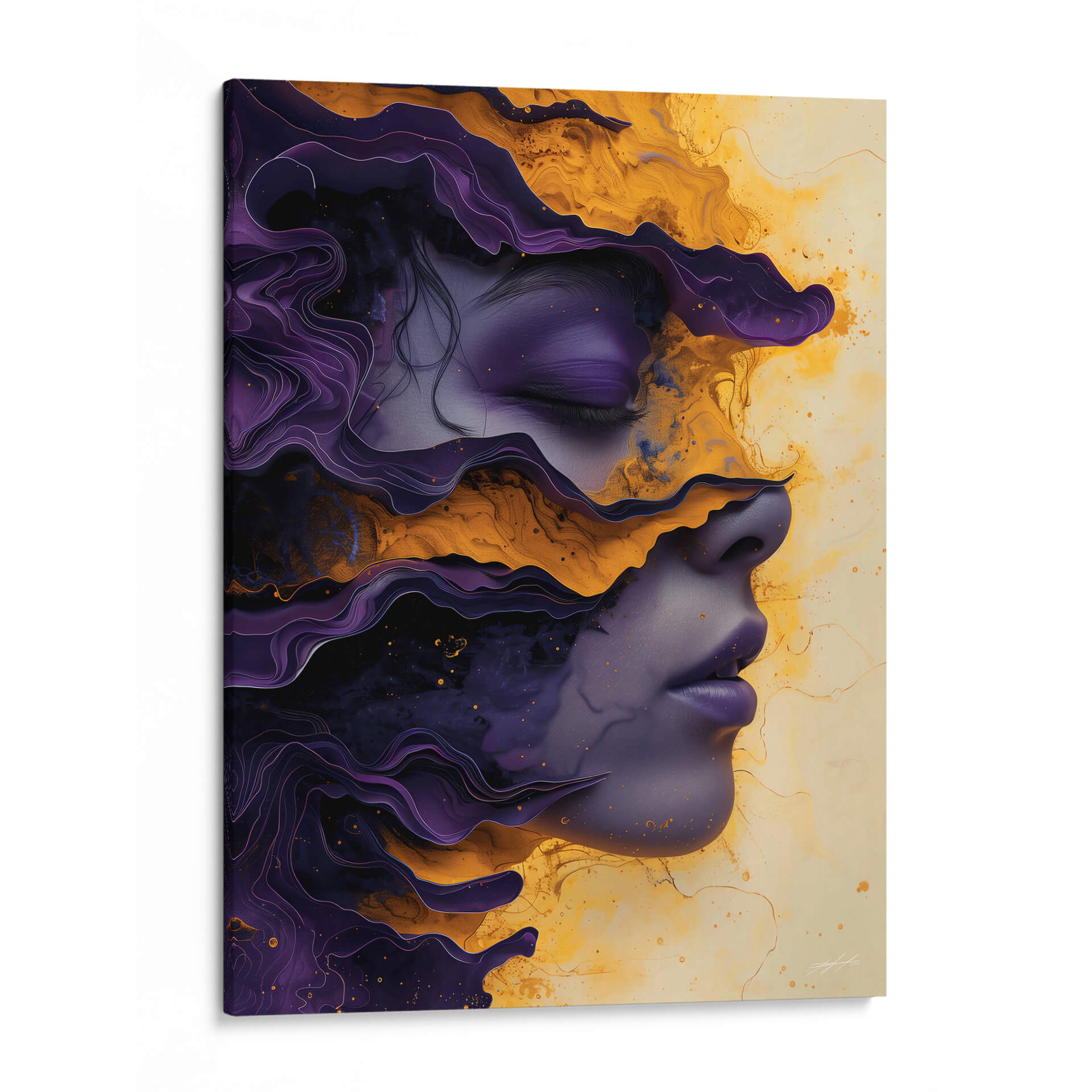 Sumérgete en la enigmática belleza de "Entre Papel - 2", una obra de arte contemporáneo que captura la esencia de la introspección y la fluidez. Este cautivador cuadro decorativo presenta un perfil femenino etéreo, con los ojos cerrados en un gesto de profunda meditación o sueño. La composición se ve realzada por capas de formas onduladas y fluidas en vibrantes tonos de púrpura y dorado, que parecen envolver y definir el rostro, creando un efecto casi onírico. Los detalles intrincados y las texturas sutiles invitan a la contemplación, mientras que la paleta de colores, dominada por el misterioso púrpura y el cálido dorado, evoca una sensación de lujo y serenidad. "Entre Papel - 2" es más que una simple pieza decorativa; es una invitación a explorar el mundo interior y la conexión entre la mente y la materia. Ideal para espacios que buscan un toque de sofisticación moderna y profundidad emocional, como salones elegantes, estudios privados o dormitorios que inviten a la calma. Añade un elemento de intriga y belleza atemporal a tu decoración con este impresionante cuadro.