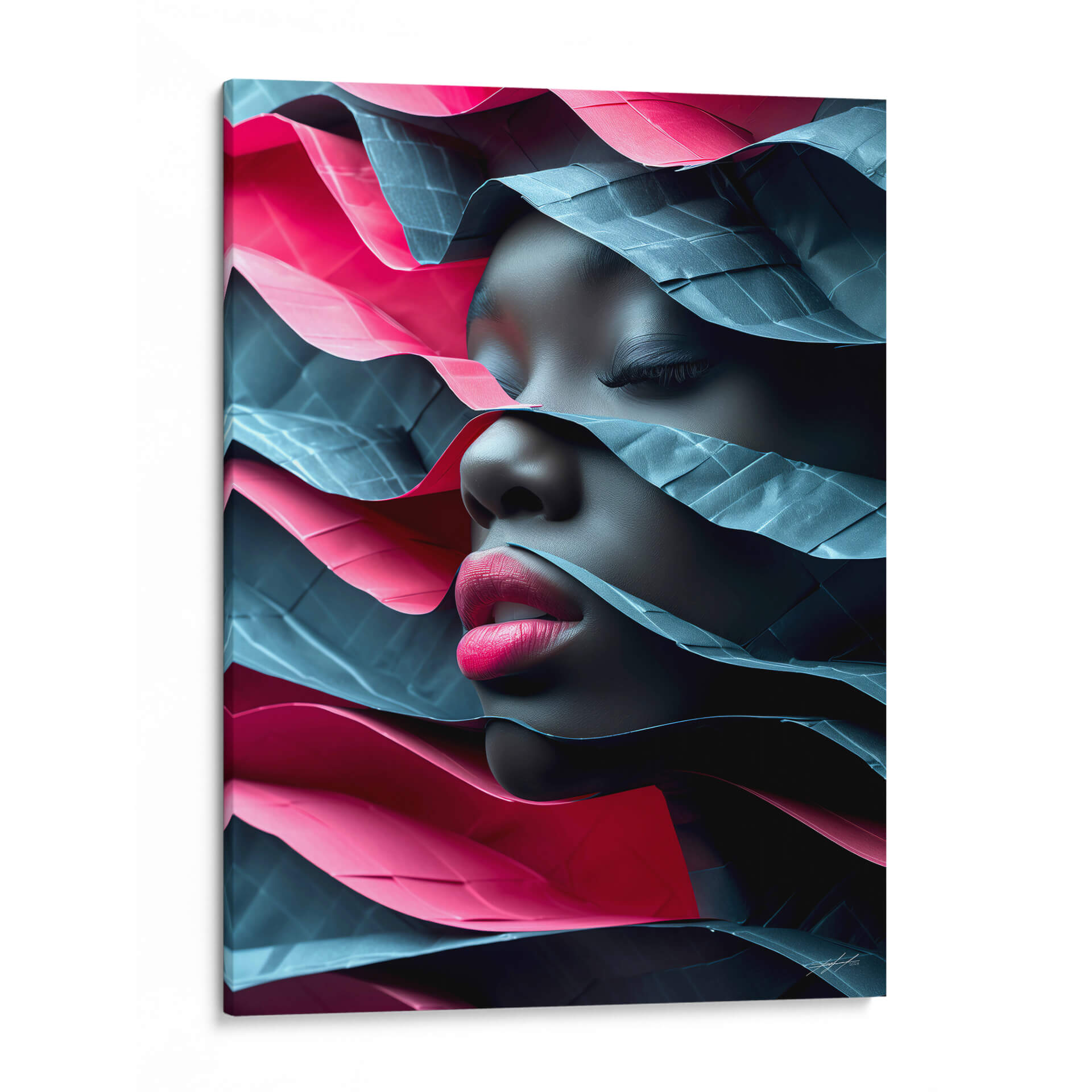 Sumérgete en la enigmática belleza de "Entre Papel - 20", una obra de arte contemporáneo que fusiona la figura humana con texturas abstractas y audaces. Esta pieza cautivadora presenta un primer plano íntimo de un rostro, sutilmente envuelto y revelado por capas de pliegues de papel en vibrantes tonos de fucsia y azul grisáceo. La composición juega con la luz y la sombra, creando un efecto dramático que resalta la profundidad y la intriga. Los labios intensamente pintados en un fucsia brillante contrastan con la paleta más sombría del entorno, aportando un toque de pasión y modernidad. Ideal para quienes buscan añadir un acento de color y sofisticación a su hogar u oficina, este cuadro decorativo es una invitación a la contemplación y al diálogo. Transmite una sensación de misterio y elegancia, perfecta para salones modernos, dormitorios o incluso espacios creativos. La técnica aplicada sugiere un arte digital o una manipulación fotográfica de alta calidad, resultando en una imagen impactante y de gran detalle. "Entre Papel - 20" es más que una simple decoración; es una declaración de estilo y una pieza que seguramente generará conversación.