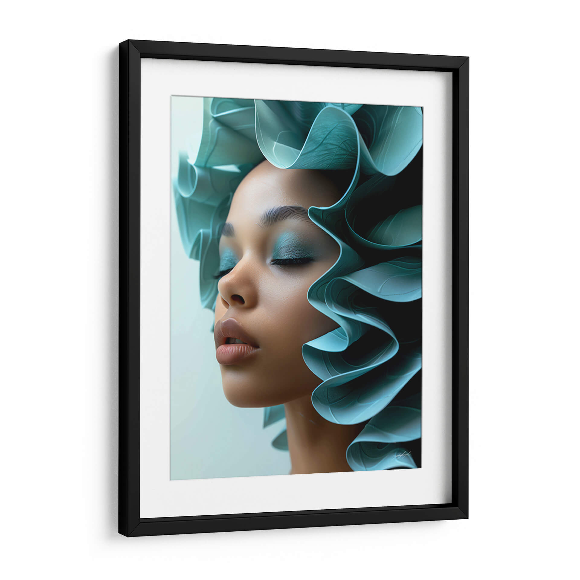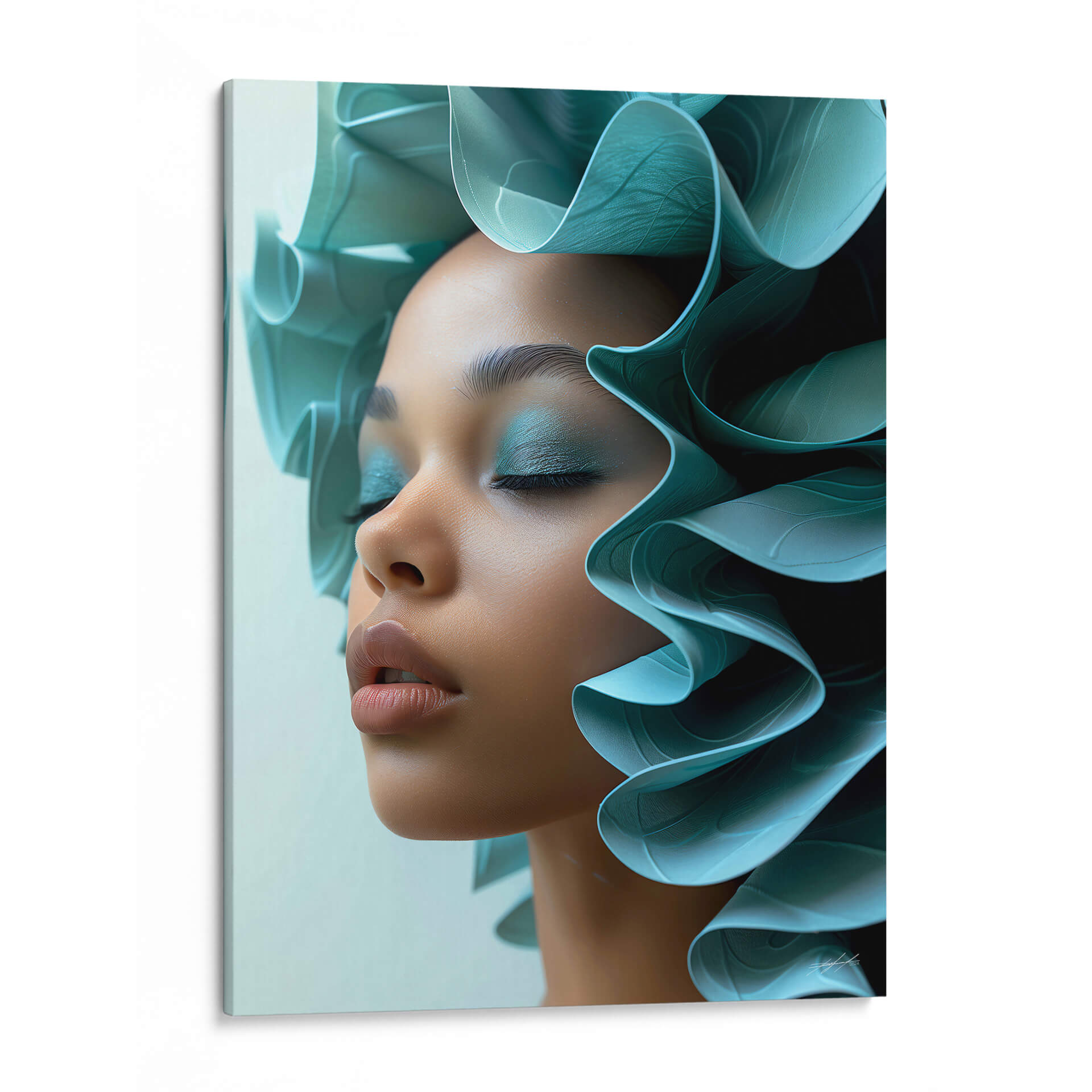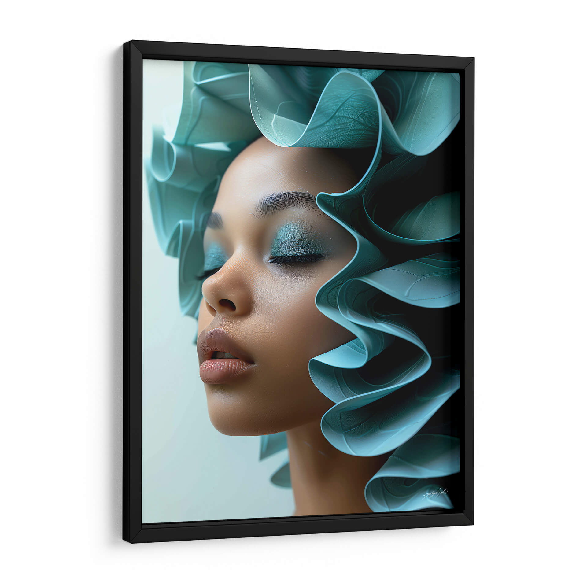 Sumérgete en la enigmática belleza de "Entre Papel - 8", una obra de arte contemporáneo que captura la esencia de la introspección y la elegancia. Esta pieza presenta un primer plano de un rostro femenino, con los ojos cerrados y una expresión de profunda serenidad. La característica más impactante es el elaborado tocado o peinado, compuesto por capas fluidas de un material etéreo en tonos azul verdoso, que envuelven la cabeza como una corona orgánica o pétalos de una flor exótica. La paleta de colores, dominada por suaves azules y turquesas, crea una atmósfera de calma y tranquilidad, contrastando sutilmente con los tonos cálidos y naturales de la piel. El estilo es una fusión de realismo detallado en el rostro y una abstracción orgánica en el tocado, generando un efecto visual cautivador. Esta composición es ideal para añadir un toque de sofisticación y misterio a cualquier espacio, ya sea una sala de estar moderna, un dormitorio sereno o un estudio creativo. "Entre Papel - 8" no es solo una decoración, sino una invitación a la contemplación y a la apreciación de la belleza en sus formas más abstractas y poéticas, un cuadro decorativo que invita a la reflexión y al ensueño, perfecto para quienes buscan piezas únicas y cargadas de significado.