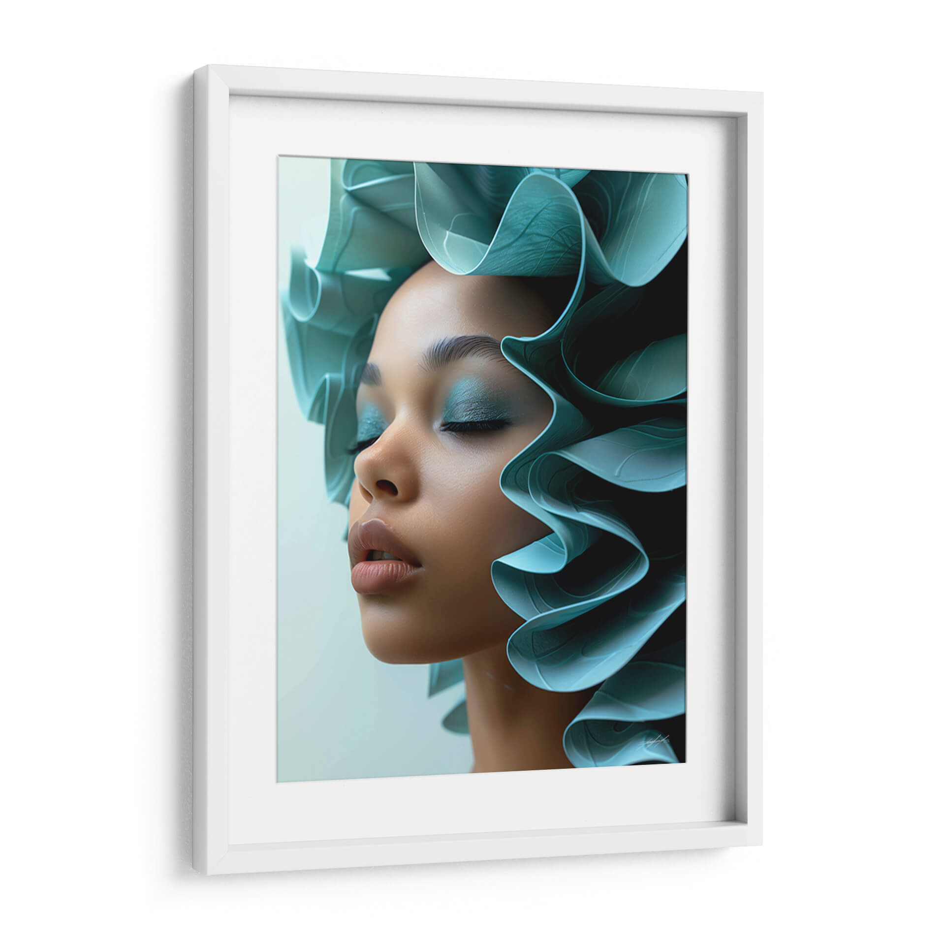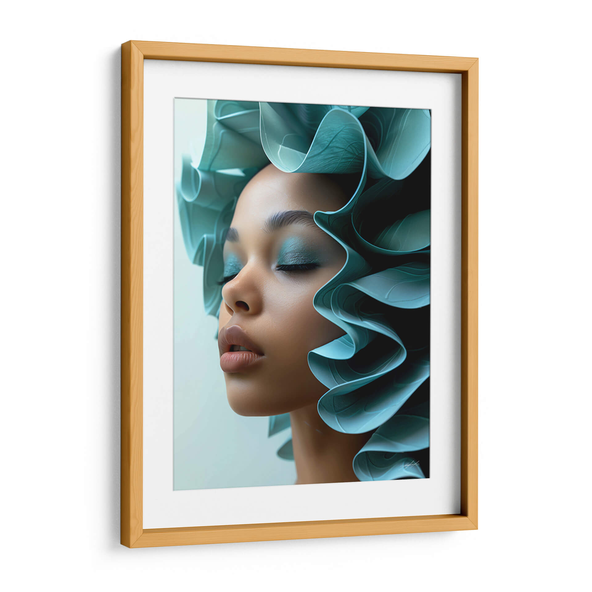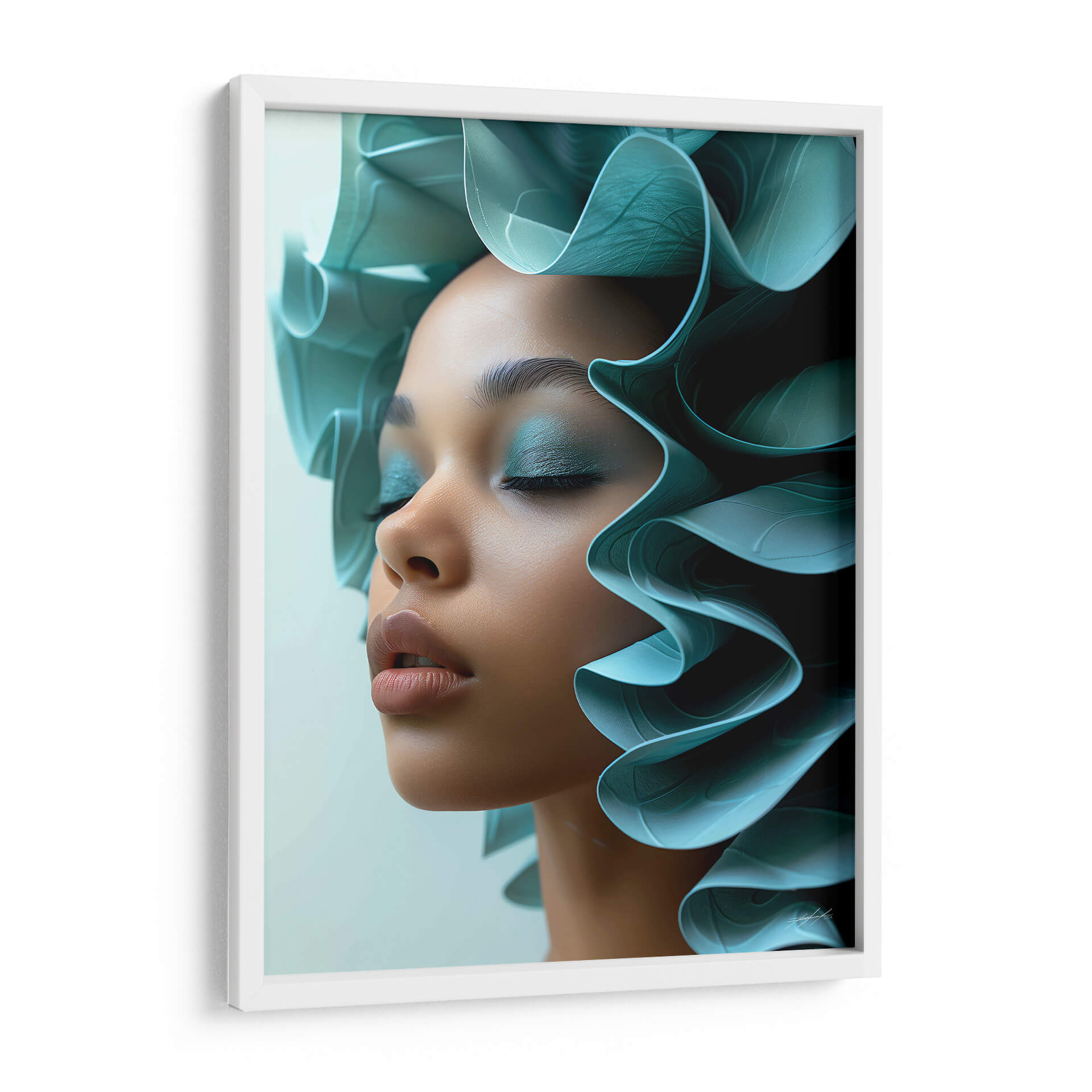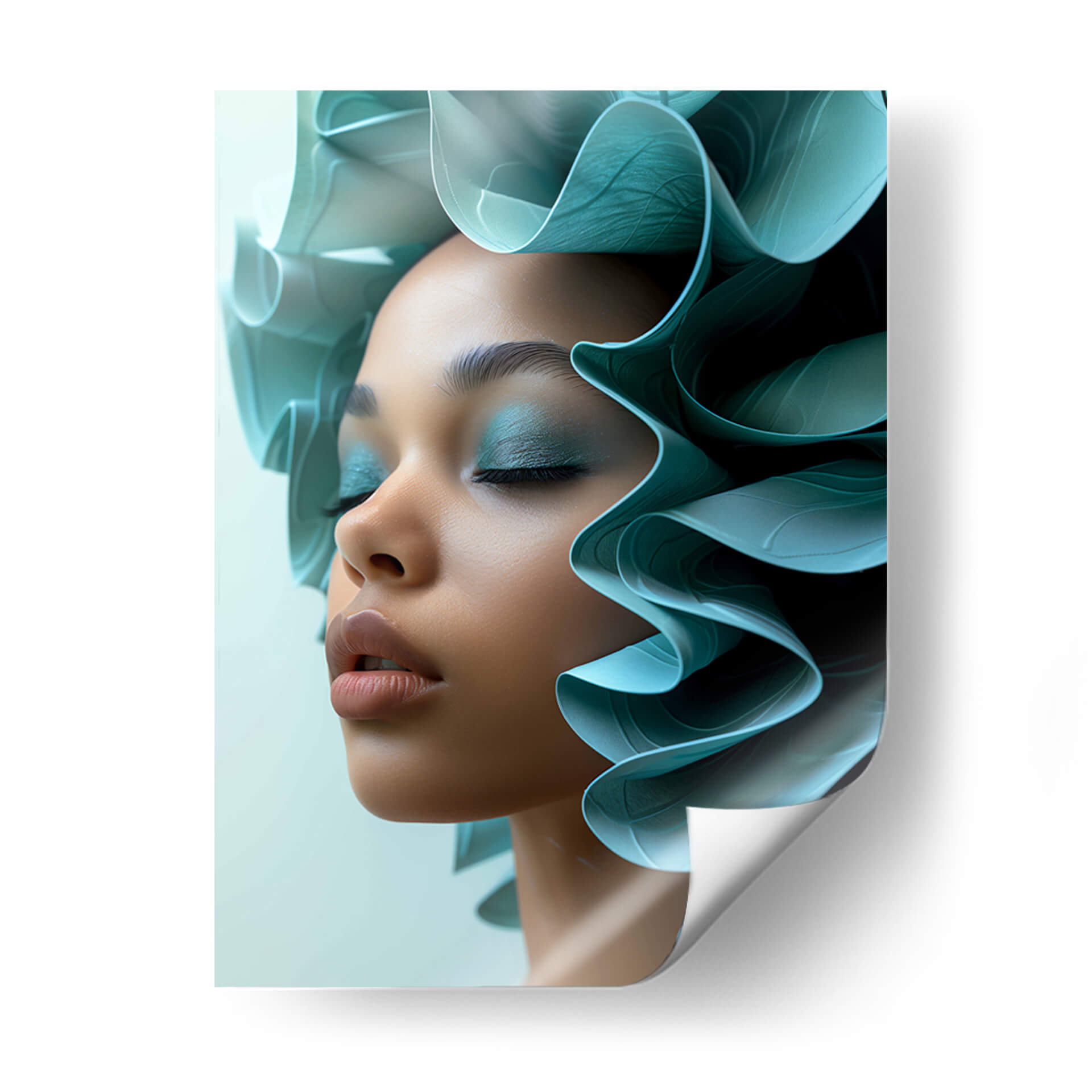Sumérgete en la enigmática belleza de "Entre Papel - 8", una obra de arte contemporáneo que captura la esencia de la introspección y la elegancia. Esta pieza presenta un primer plano de un rostro femenino, con los ojos cerrados y una expresión de profunda serenidad. La característica más impactante es el elaborado tocado o peinado, compuesto por capas fluidas de un material etéreo en tonos azul verdoso, que envuelven la cabeza como una corona orgánica o pétalos de una flor exótica. La paleta de colores, dominada por suaves azules y turquesas, crea una atmósfera de calma y tranquilidad, contrastando sutilmente con los tonos cálidos y naturales de la piel. El estilo es una fusión de realismo detallado en el rostro y una abstracción orgánica en el tocado, generando un efecto visual cautivador. Esta composición es ideal para añadir un toque de sofisticación y misterio a cualquier espacio, ya sea una sala de estar moderna, un dormitorio sereno o un estudio creativo. "Entre Papel - 8" no es solo una decoración, sino una invitación a la contemplación y a la apreciación de la belleza en sus formas más abstractas y poéticas, un cuadro decorativo que invita a la reflexión y al ensueño, perfecto para quienes buscan piezas únicas y cargadas de significado.