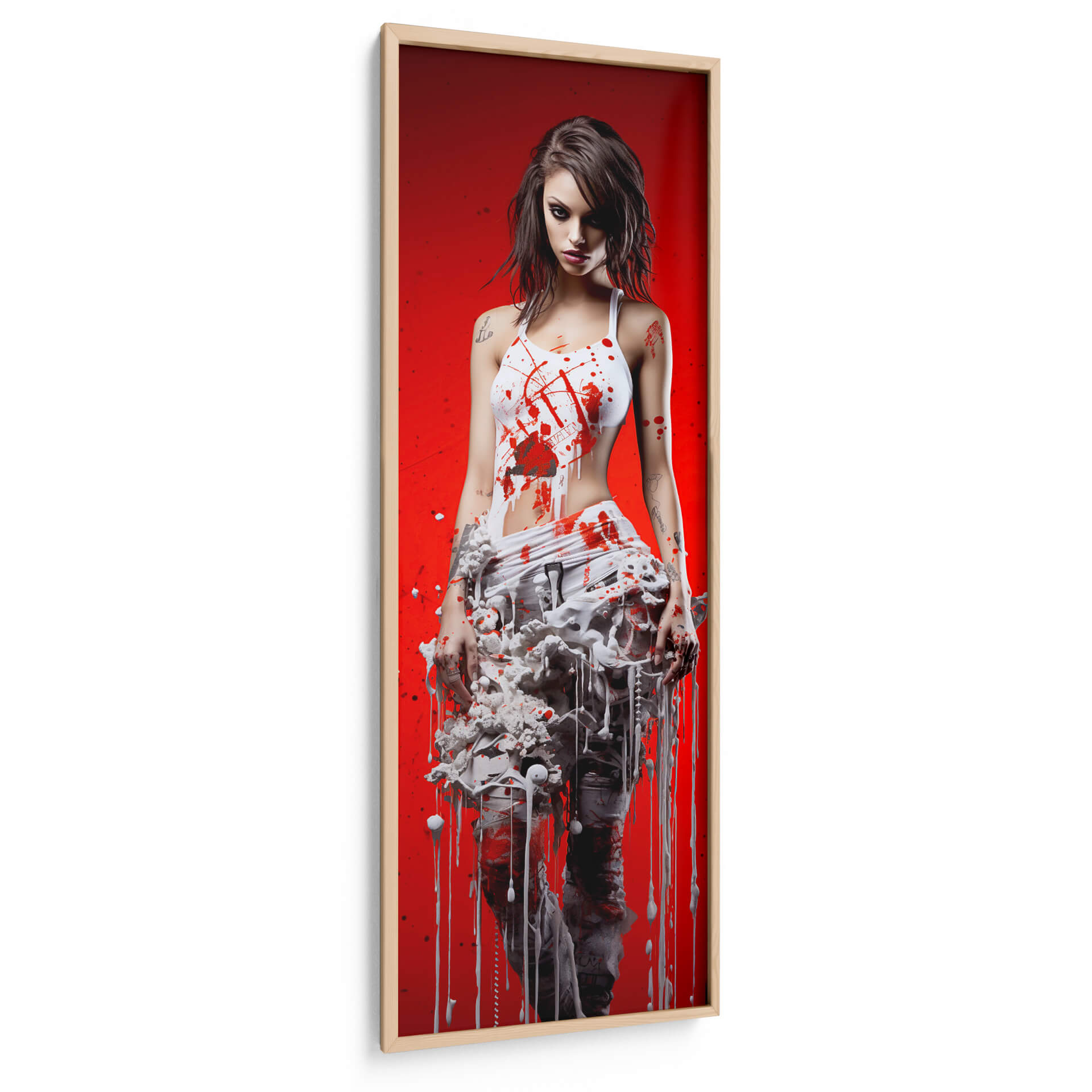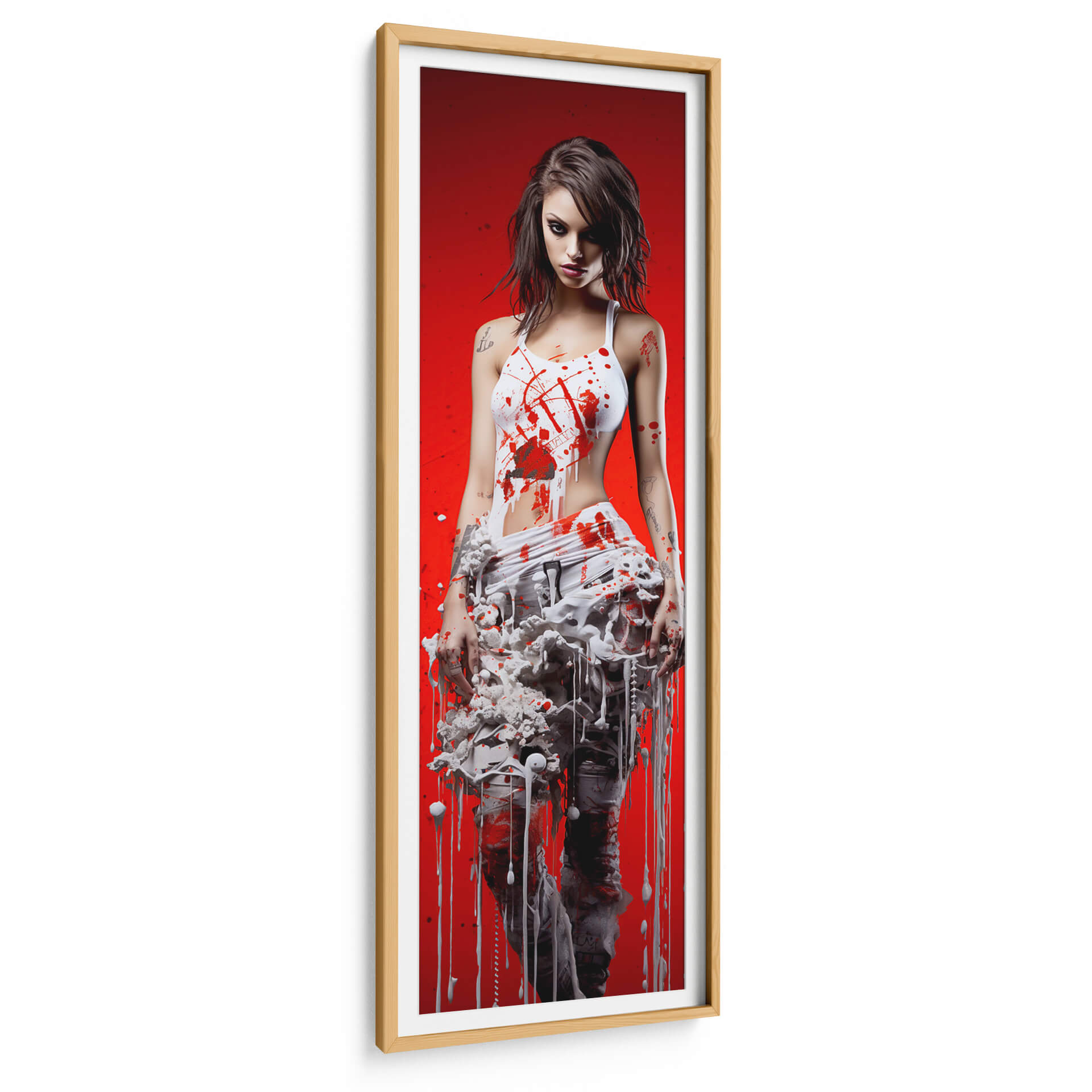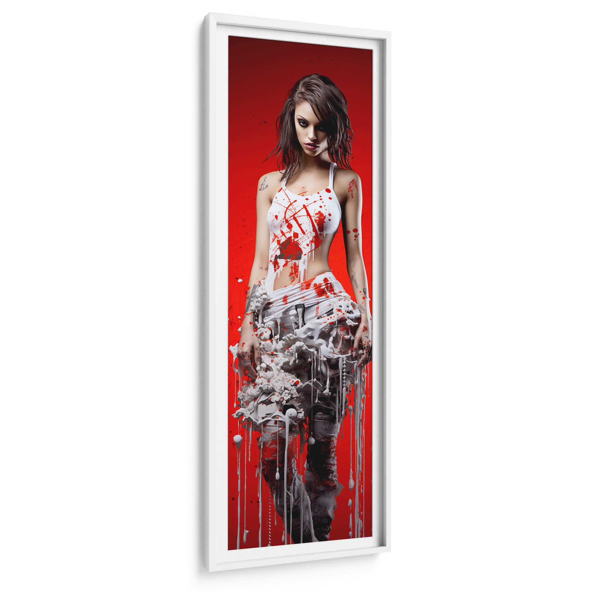 Sumérgete en el impacto visual de "Grunge Chic - 10", una obra de arte contemporáneo que desafía las convenciones y cautiva la mirada. Este cuadro decorativo presenta una figura femenina enigmática, envuelta en una estética urbana y rebelde, adornada con salpicaduras de pintura roja y blanca que evocan un estilo audaz y vanguardista. El contraste entre la paleta de colores vibrante, dominada por un rojo intenso y salpicaduras blancas, y la iluminación dramática crea una atmósfera cargada de energía y misterio. El estilo, que fusiona elementos del arte callejero con una sensibilidad moderna, lo convierte en una pieza de conversación ideal para aquellos que buscan imprimir carácter y originalidad en sus espacios. "Grunge Chic - 10" es perfecto para añadir un toque de sofisticación rebelde a una sala de estar, un estudio o un espacio creativo, atrayendo a quienes aprecian el arte que combina la fuerza visual con una narrativa implícita. Esta obra es una declaración de estilo, invitando a la reflexión y añadiendo una dimensión única a cualquier decoración interior.