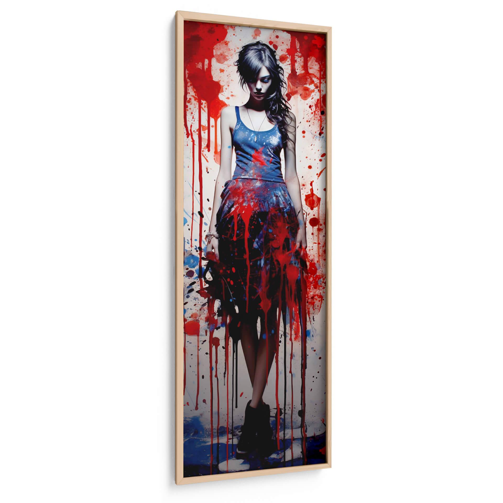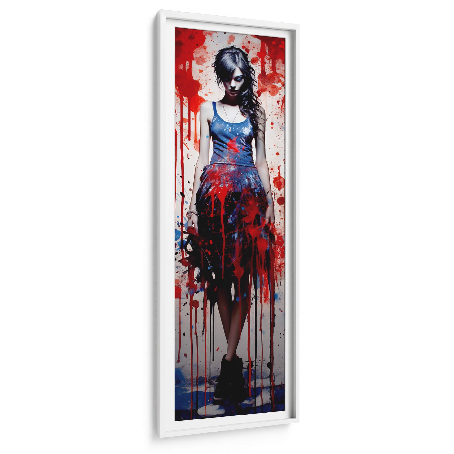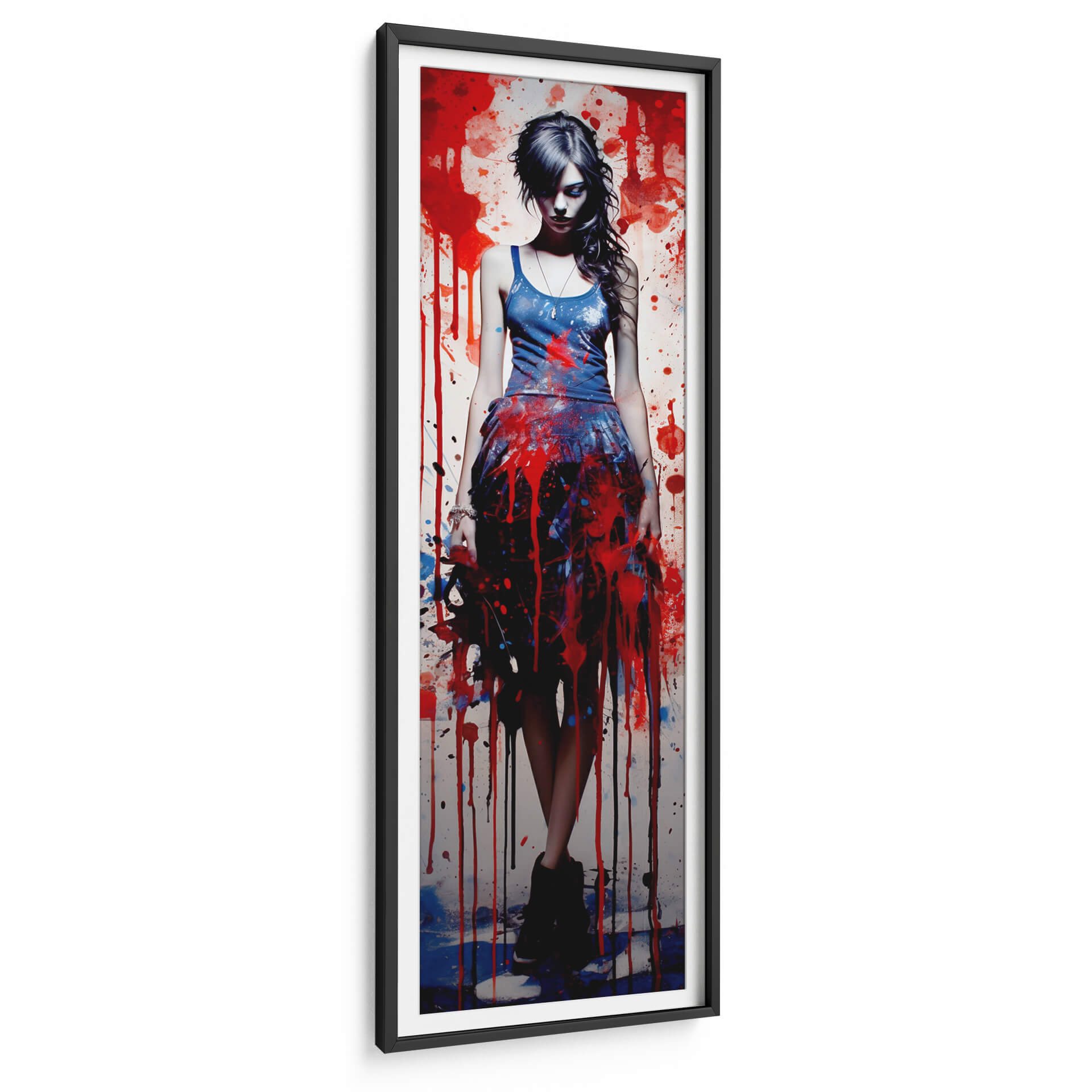 Sumérgete en la intensidad y el estilo vanguardista de "Grunge Chic - 13", una obra de arte digital que captura la esencia de la moda urbana y el arte callejero con una ejecución impecable. La pieza presenta una figura femenina central, envuelta en una cascada de salpicaduras y goteos de pintura en vibrantes tonos rojos, azules y negros, contrastando dramáticamente con un fondo texturizado y salpicado de salpicaduras blancas y grises. La composición vertical, con la figura ligeramente inclinada y la mirada perdida, evoca una sensación de introspección y misterio, invitando al espectador a interpretar su propia narrativa. La técnica de pintura digital imita la textura y el movimiento del goteo de pintura real, creando una profundidad visual cautivadora. "Grunge Chic - 13" es una declaración audaz de estilo, perfecta para añadir un toque de carácter rebelde y sofisticado a cualquier espacio moderno, ya sea una sala de estar, un estudio o un dormitorio. Su paleta de colores contrastante y su atmósfera enigmática la convierten en un punto focal irresistible que fomenta la conversación y refleja una personalidad atrevida y contemporánea. Ideal para amantes del arte urbano, la moda y las estéticas audaces.