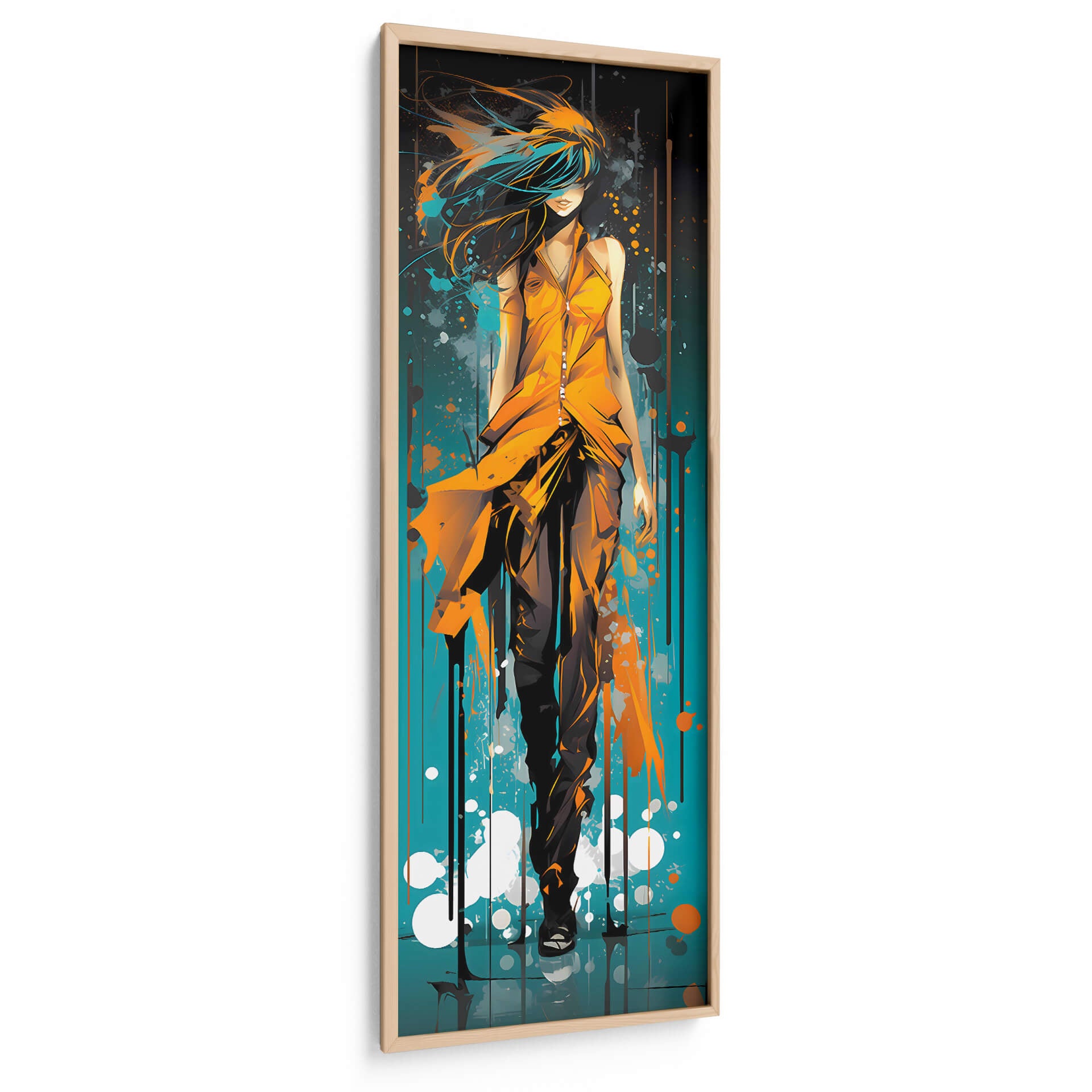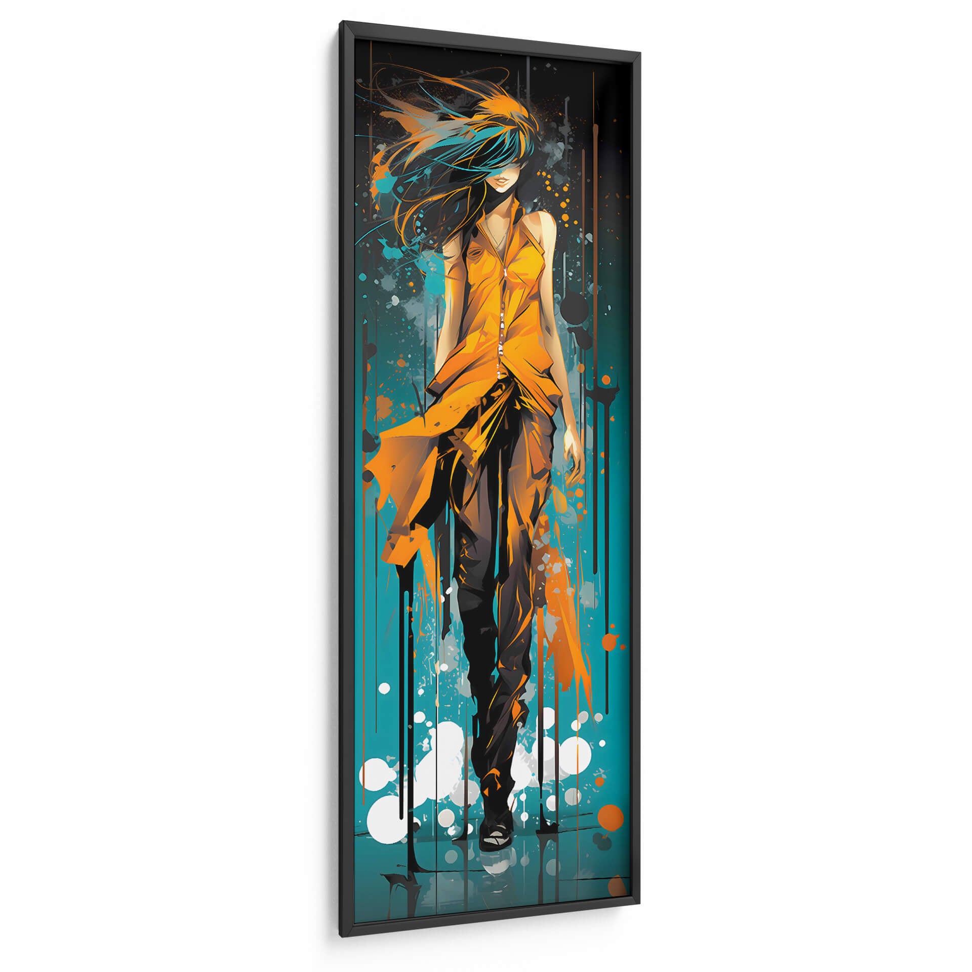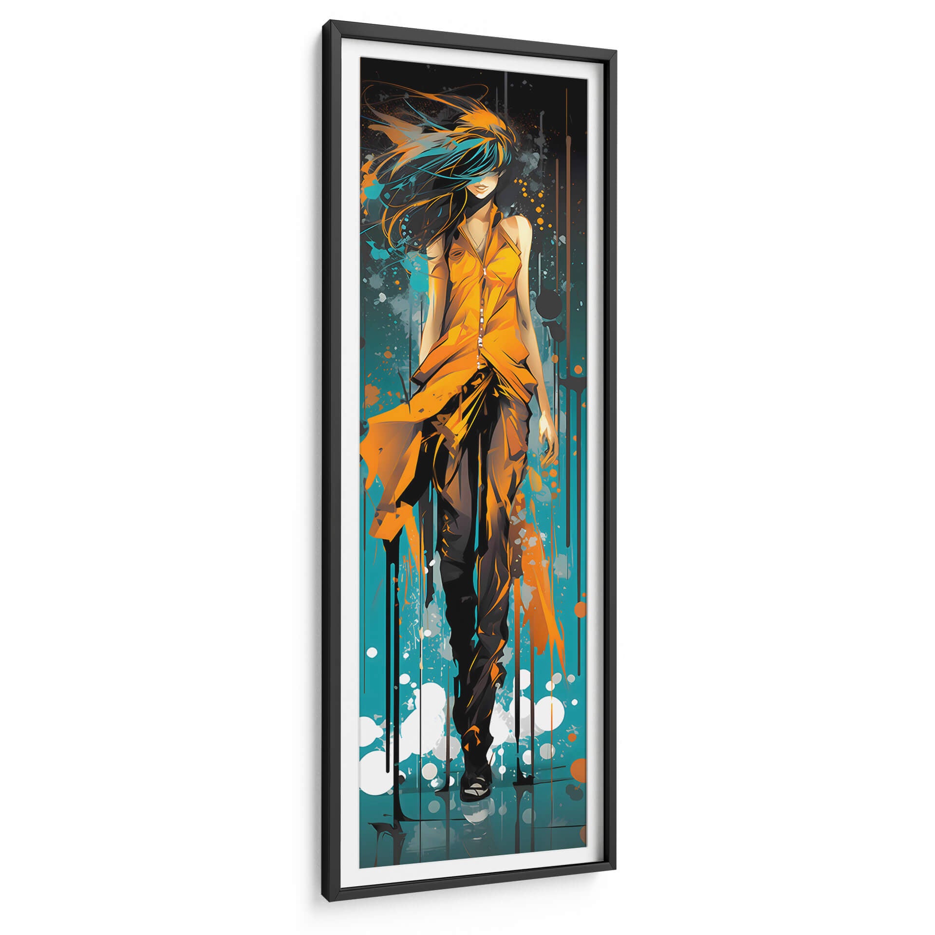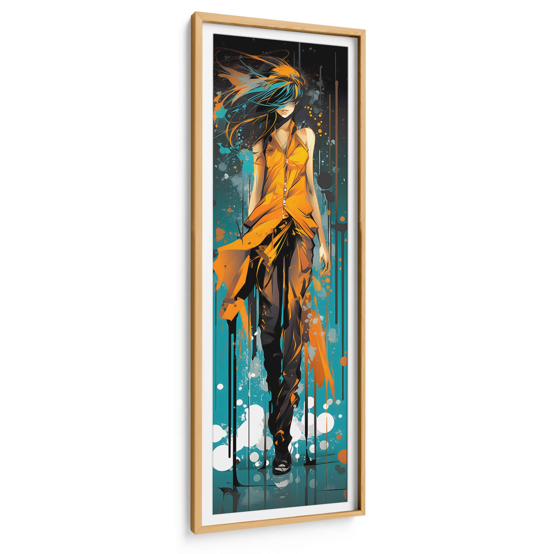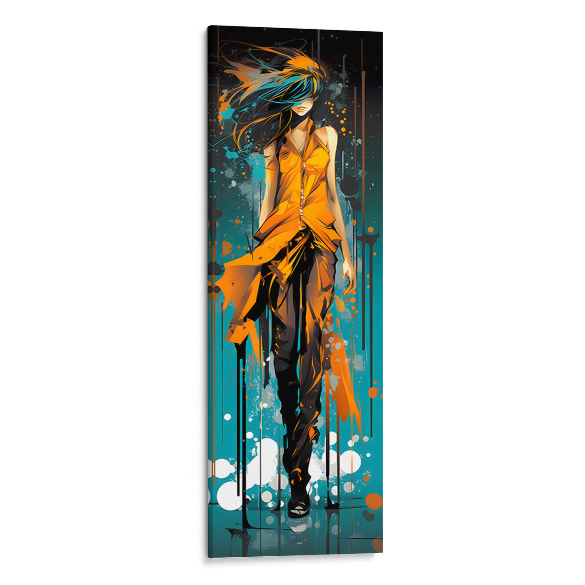 Sumérgete en la estética urbana y contemporánea de "Grunge Chic - 3", una obra de arte que captura la esencia de la moda vanguardista y el espíritu rebelde. Este cuadro decorativo presenta una figura femenina estilizada, envuelta en una vibrante chaqueta naranja que contrasta audazmente con un fondo oscuro y salpicaduras de pintura en tonos turquesa y negro. El cabello de la figura, dinámico y etéreo, fluye con toques de azul y naranja, sugiriendo movimiento y energía. El estilo distintivo de DeLaVegaGaming combina elementos de arte digital con una técnica que evoca la espontaneidad del graffiti y la abstracción, creando un impacto visual potente y cautivador. Las líneas audaces y la paleta de colores intensa hacen de esta pieza un acento perfecto para espacios modernos, estudios de diseño, o cualquier lugar que busque una dosis de carácter y sofisticación. "Grunge Chic - 3" no es solo una decoración, es una declaración de estilo que evoca confianza y audacia, ideal para aquellos que aprecian el arte con una narrativa visual fuerte y una conexión con la cultura urbana.