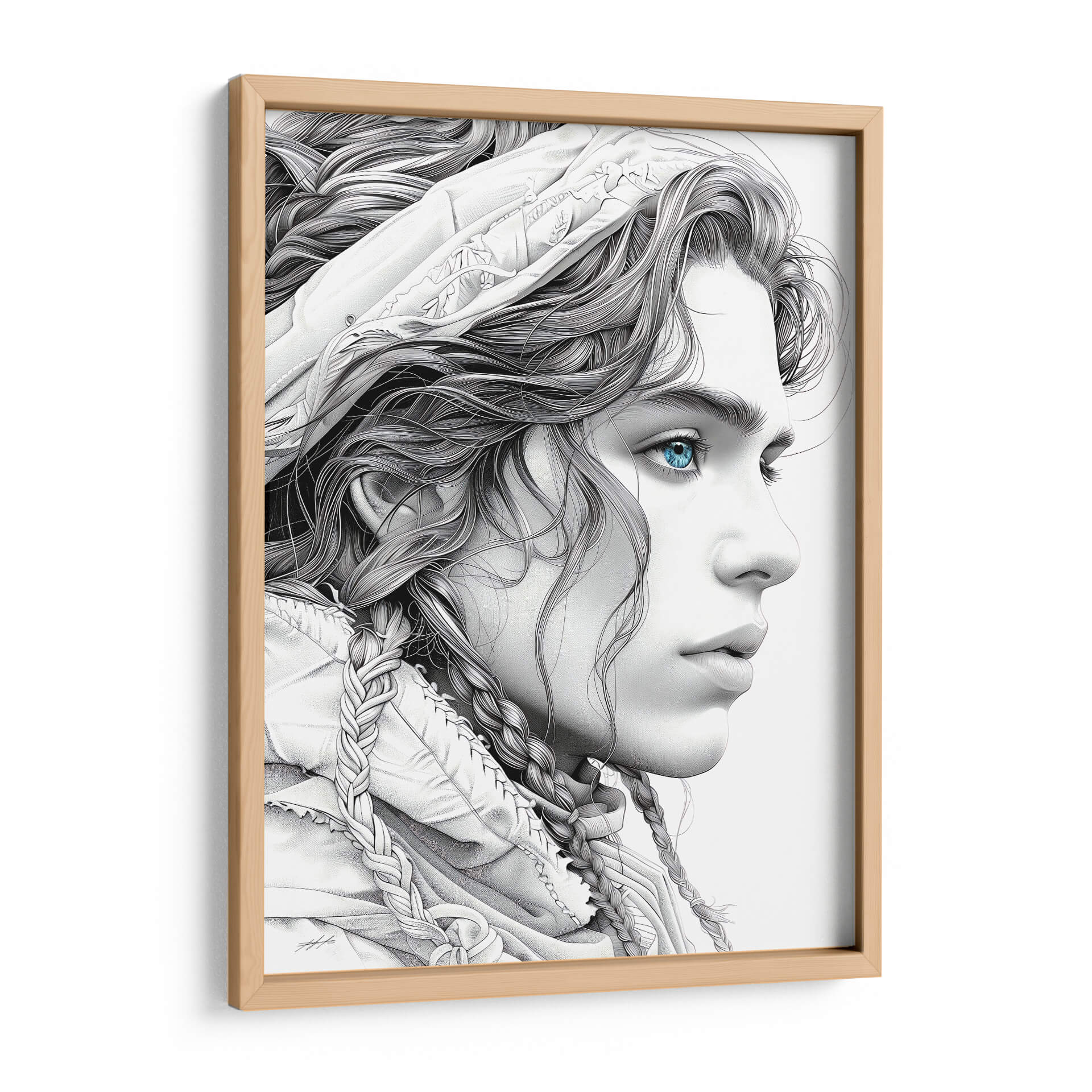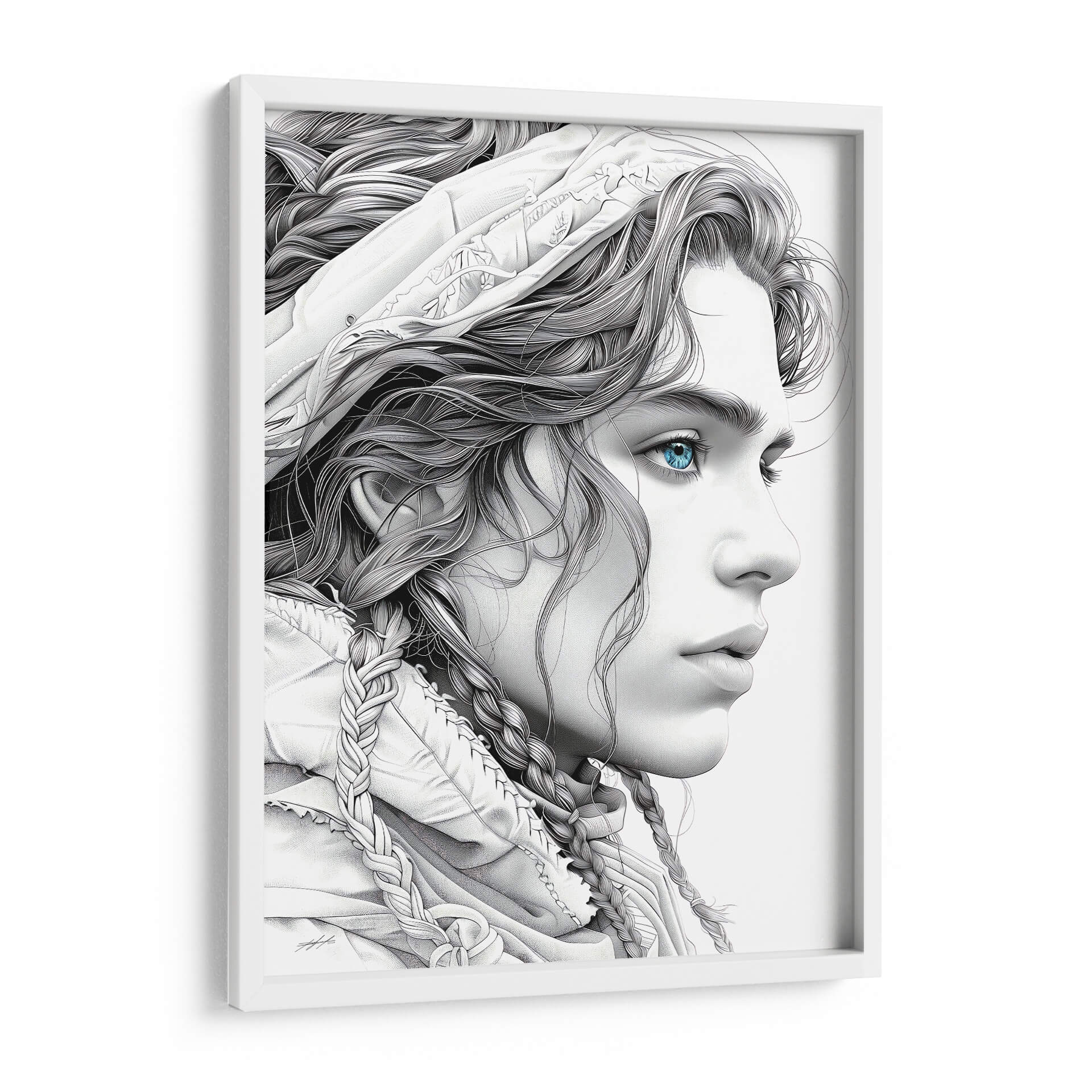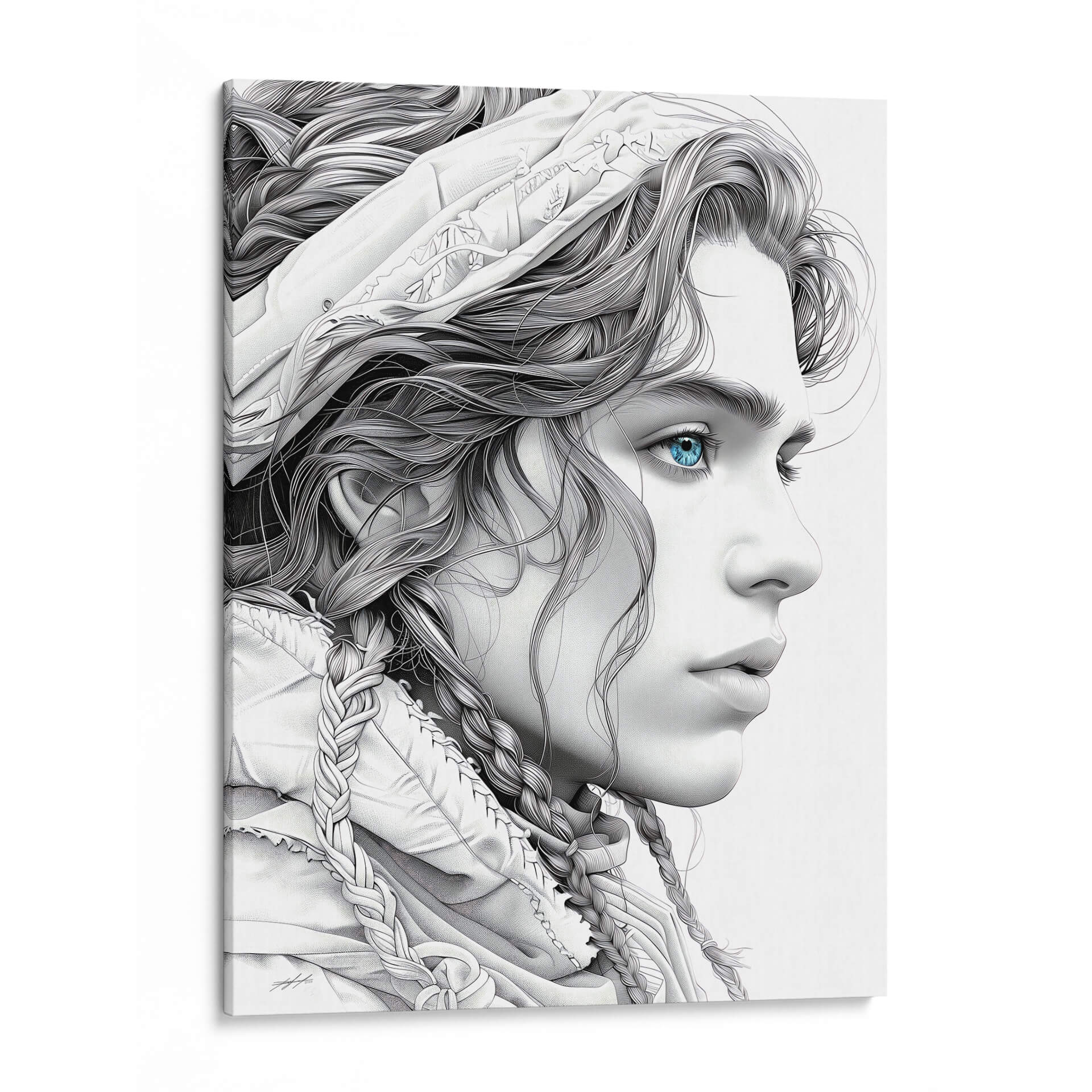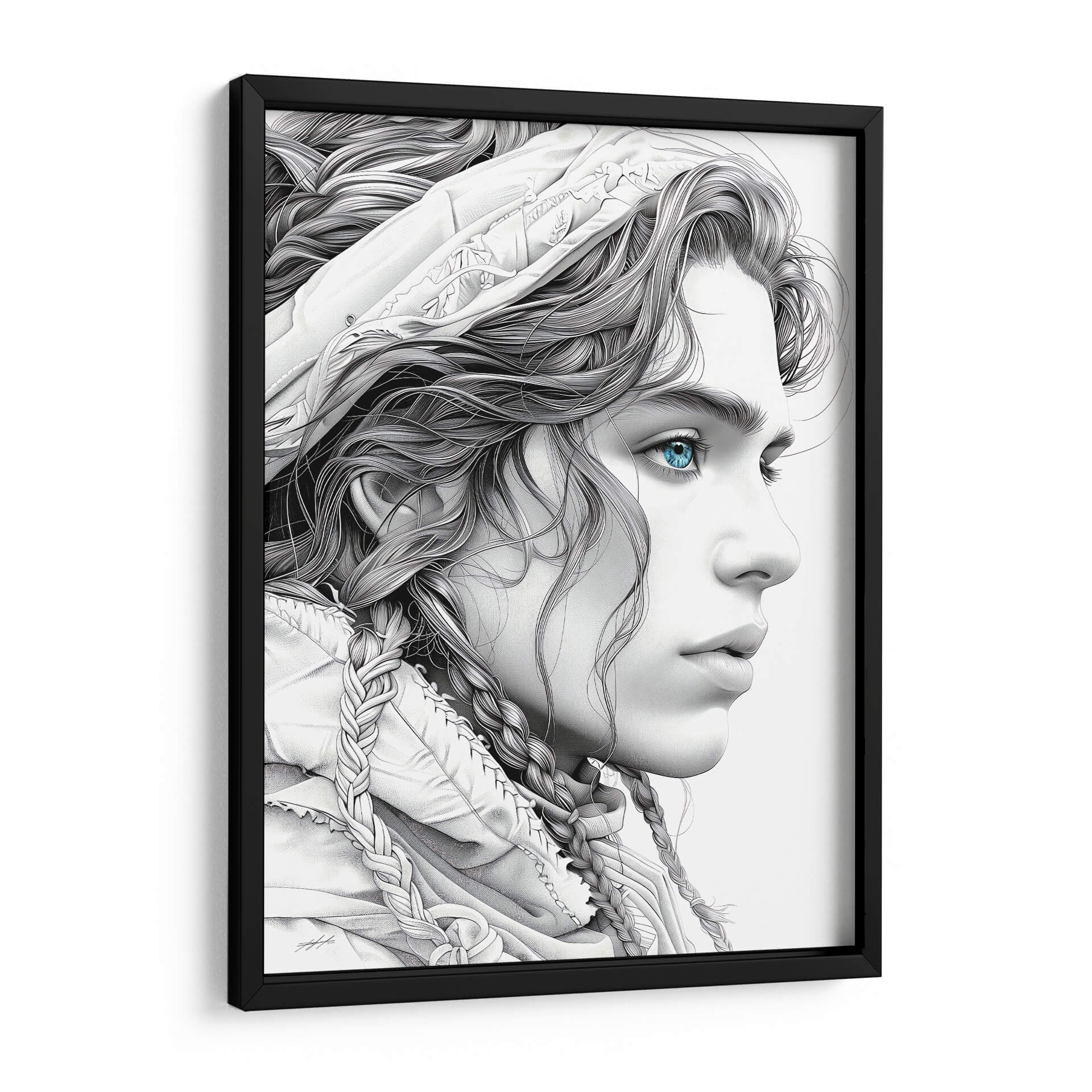 Sumérgete en la mirada penetrante de 'La Chica Nómada', una obra de arte digital que captura la esencia de la aventura y la introspección. Este cuadro decorativo presenta un retrato íntimo de una joven con detalles intrincados en su cabello trenzado y un pañuelo que evoca un espíritu libre. Los vibrantes ojos azules contrastan sutilmente con la paleta monocromática predominante, añadiendo un toque de misterio y profundidad a la pieza. El estilo detallado y la composición centrada en el rostro invitan a la contemplación, creando una atmósfera de serenidad y audacia al mismo tiempo. Ideal para quienes buscan añadir un punto focal cautivador y lleno de personalidad a su sala de estar, dormitorio u oficina. Este cuadro contemporáneo es perfecto para espacios modernos, bohemios o eclécticos, aportando una narrativa visual que inspira y fascina. Descubre la belleza de la exploración y la identidad con esta pieza única de arte de pared que transformará cualquier ambiente.