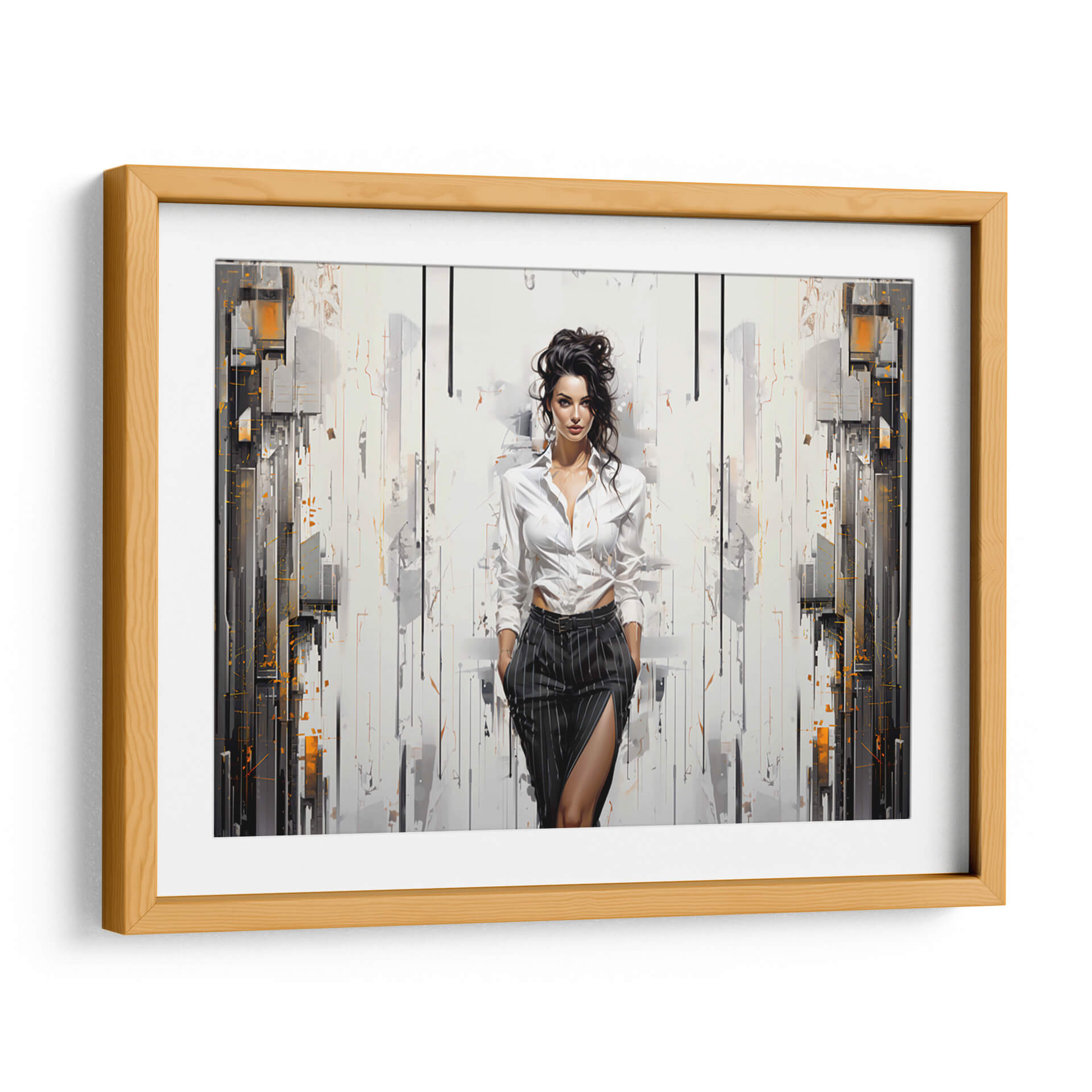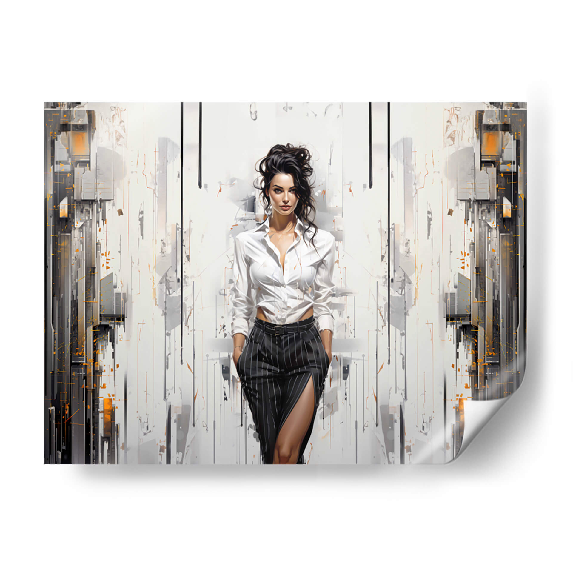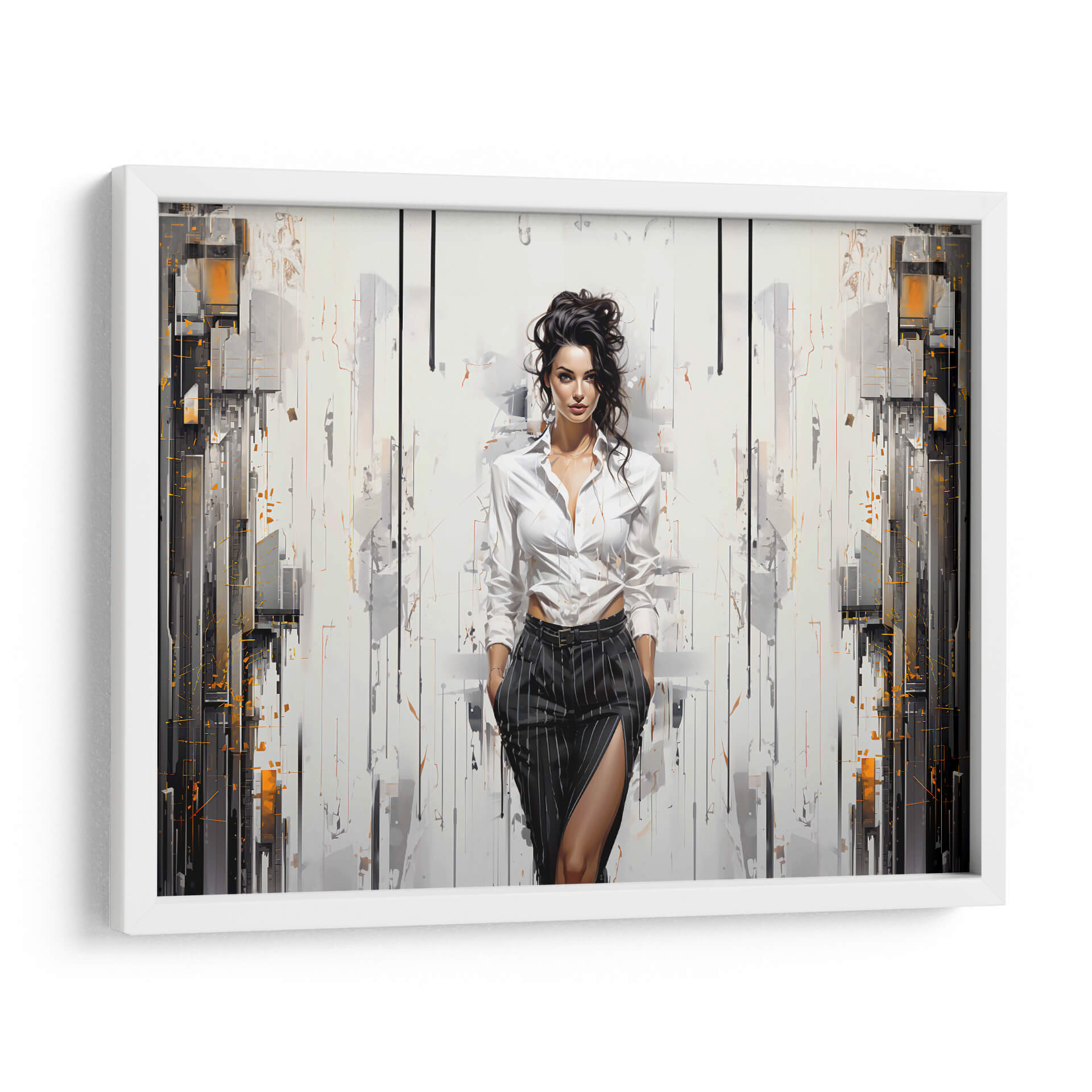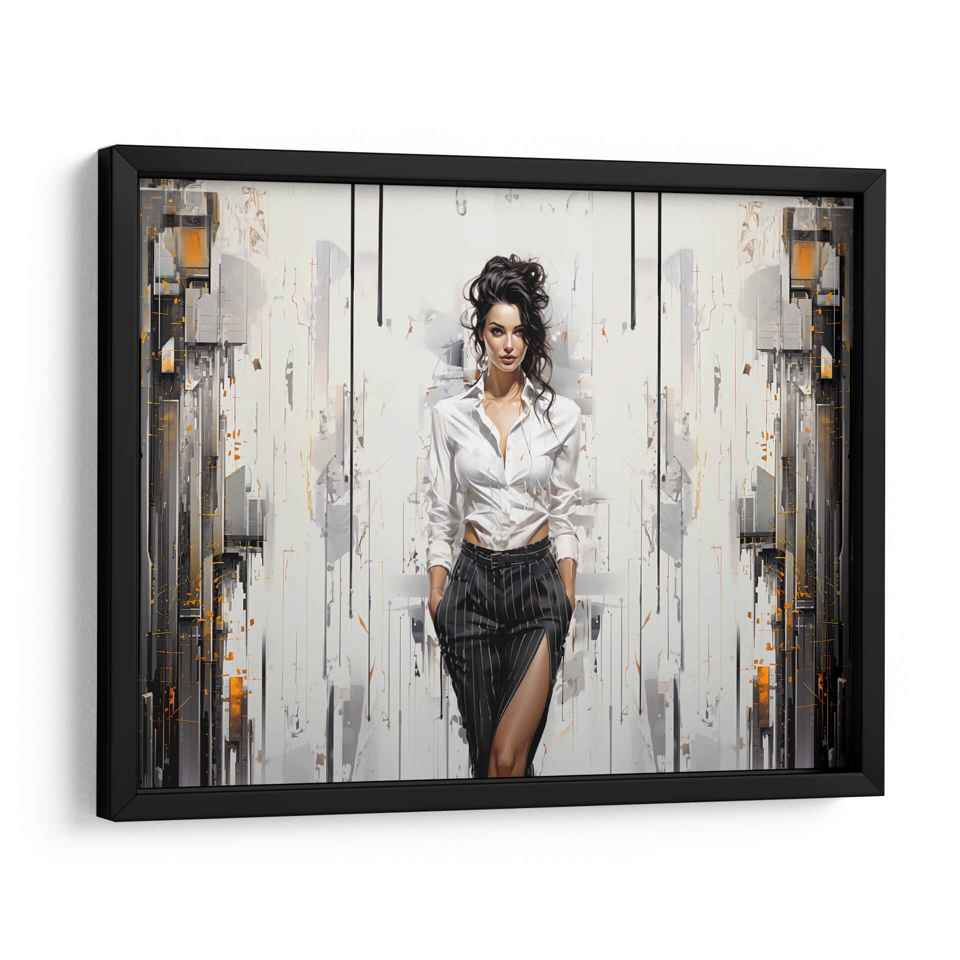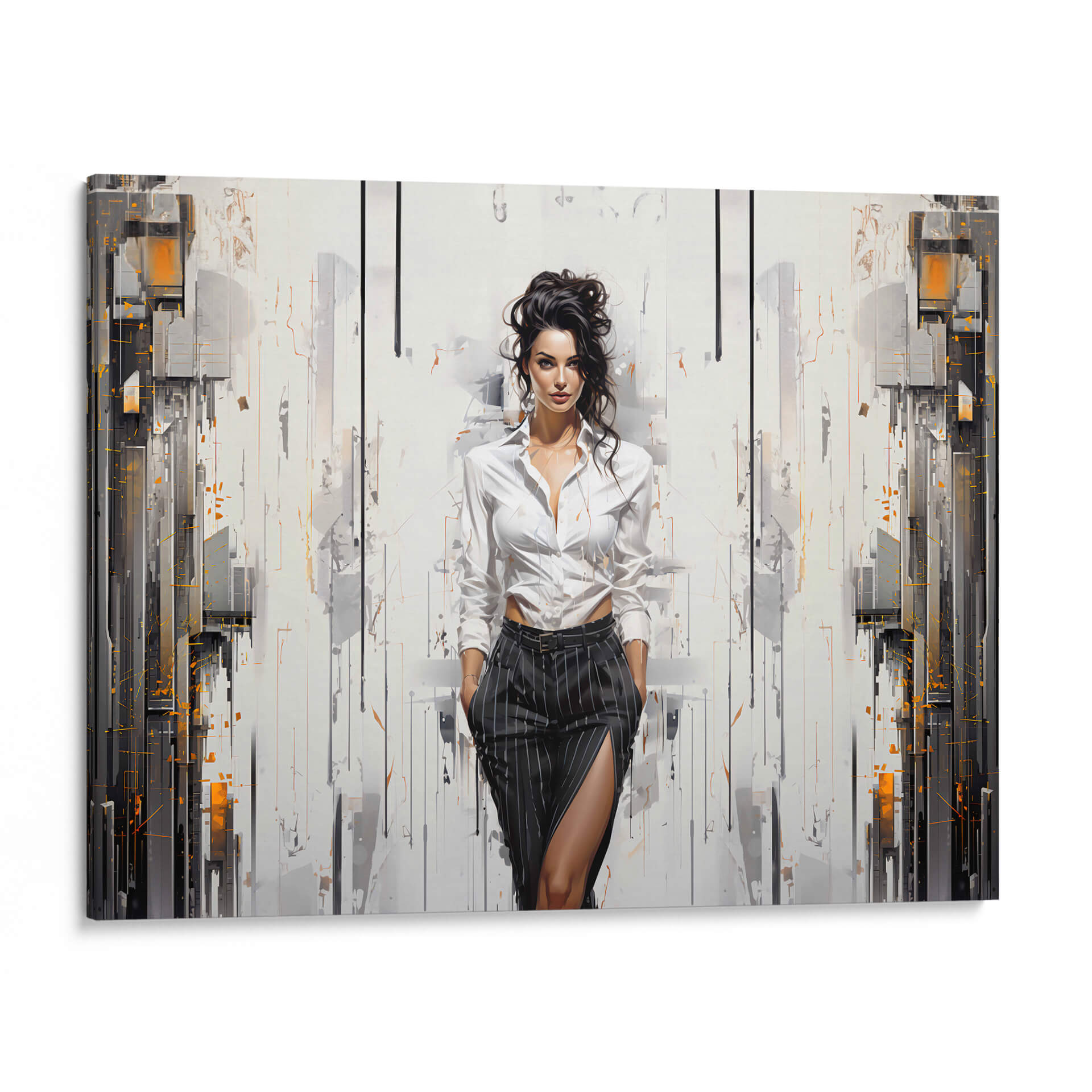 Sumérgete en la fuerza y la sofisticación con el cuadro decorativo "Lady Boss - Blanco y Negro" de DeLaVegaGaming. Esta cautivadora obra de arte presenta a una mujer empoderada en el centro, vestida con una impecable camisa blanca y unos elegantes pantalones a rayas con una atrevida abertura. Su mirada penetrante y su postura segura irradian confianza, haciendo de esta pieza un símbolo de ambición y determinación. El fondo abstracto, una fusión de estructuras geométricas grises y detalles en tonos naranja vibrantes, crea un contraste dinámico que realza la figura central. El estilo contemporáneo y la paleta monocromática con toques de color aportan modernidad y un aire de misterio. Ideal para despachos, oficinas o cualquier espacio que requiera un toque de inspiración y poder femenino. Este cuadro decorativo no es solo una adición estética, sino una declaración de intenciones. Transforma tu entorno con este impresionante lienzo que evoca la esencia de una líder moderna, fusionando arte abstracto y retrato de manera magistral. Una pieza única que inspira y decora.
