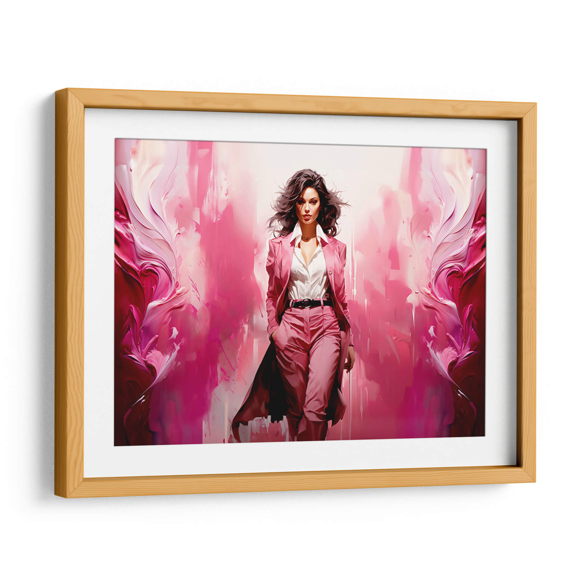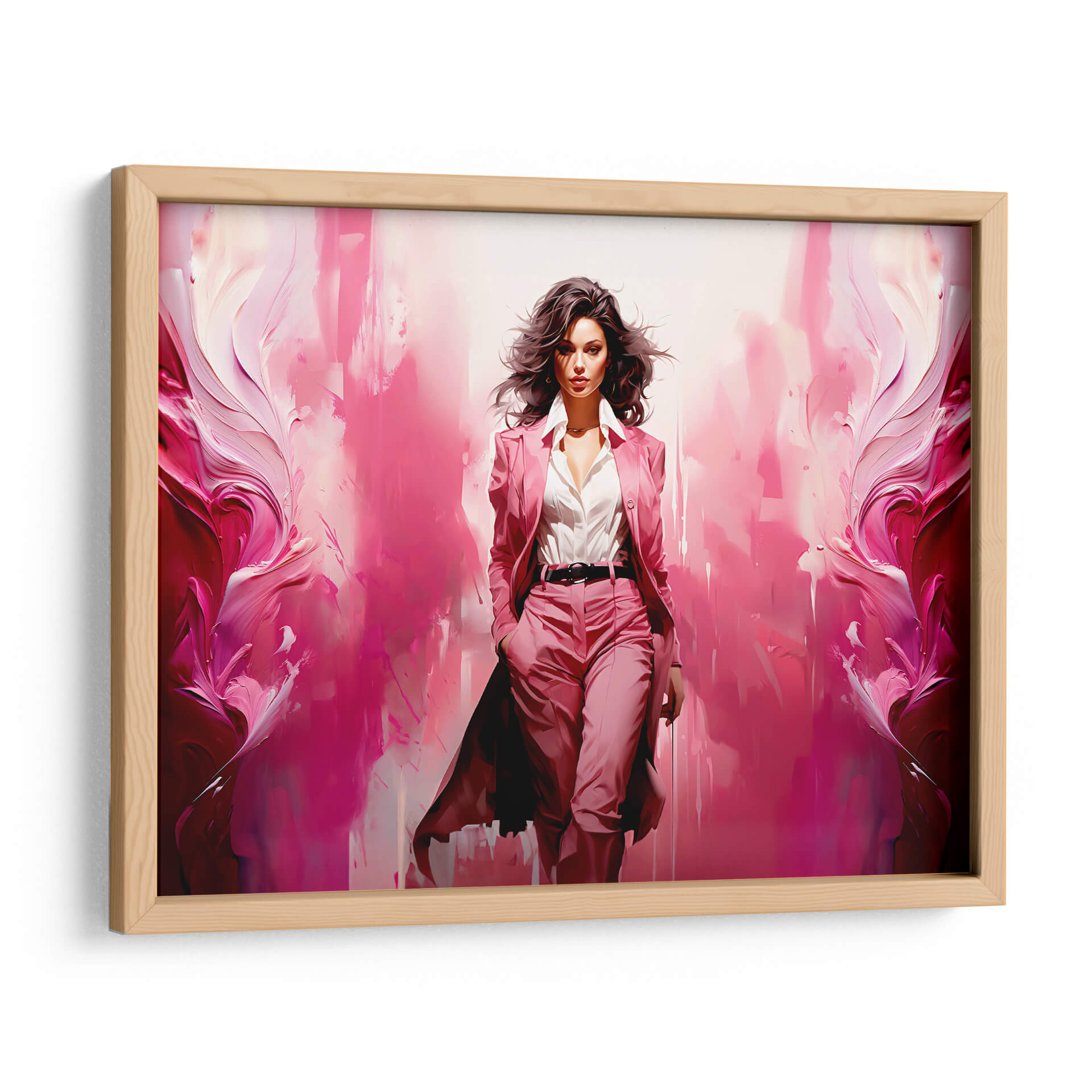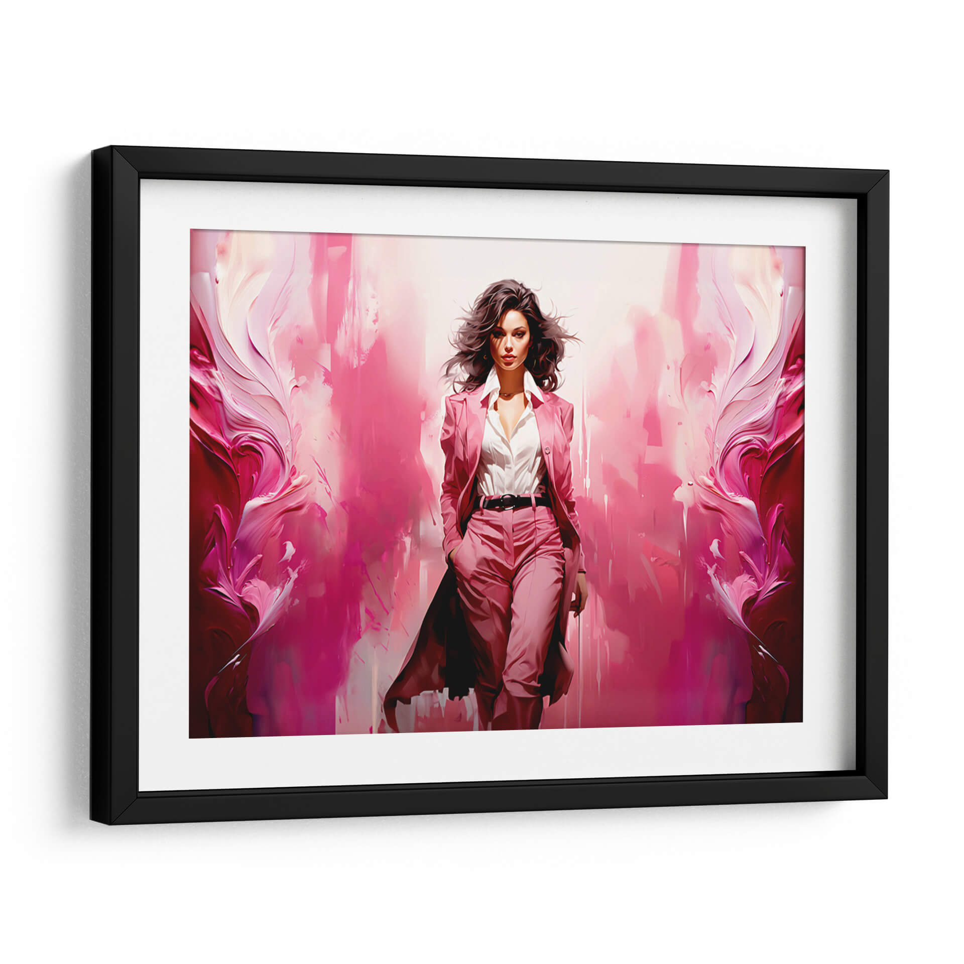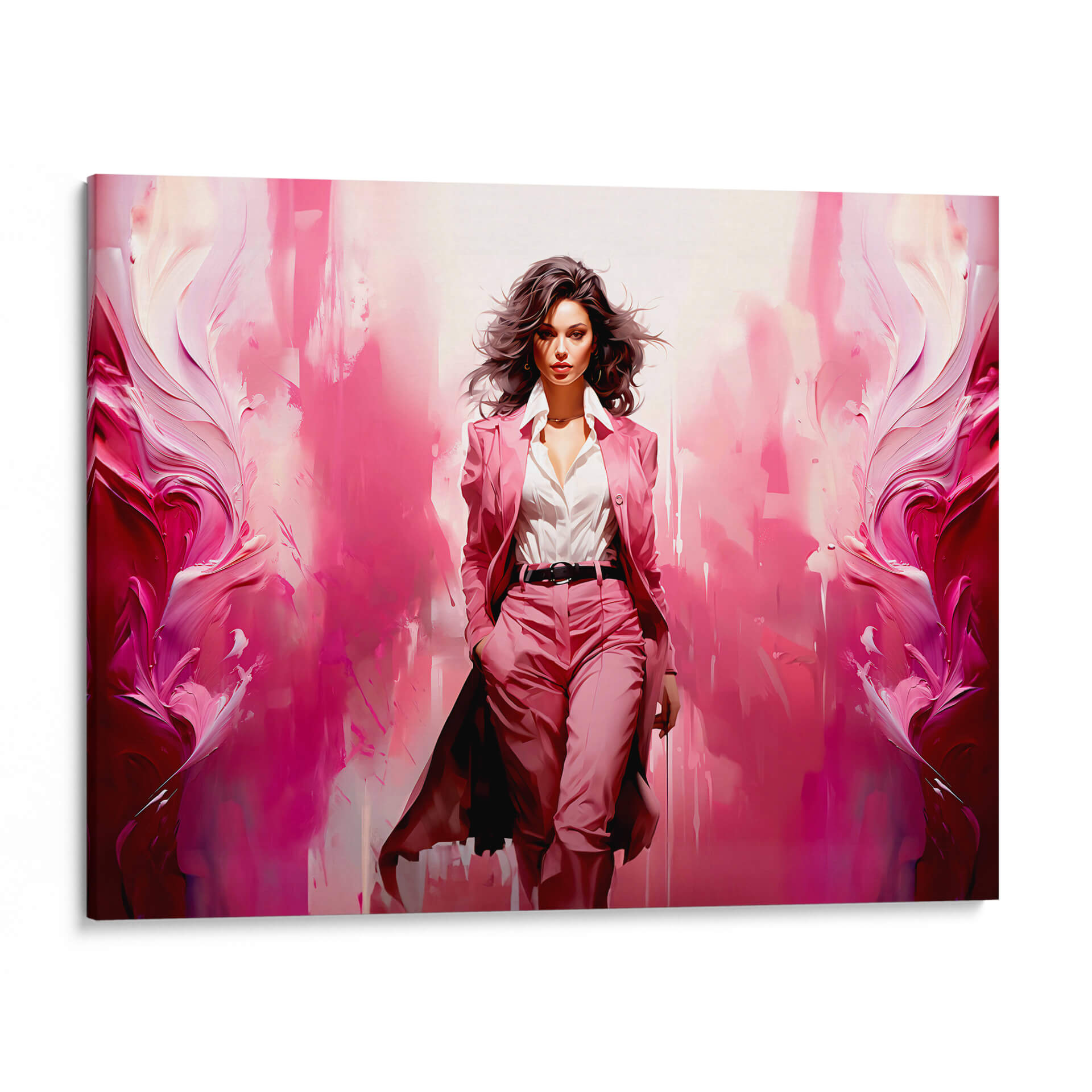 Cautiva con la fuerza y la elegancia de "Lady Boss - Rosa", una obra de arte contemporáneo que irradia poder femenino y estilo. Esta pieza visualmente impactante presenta a una mujer segura de sí misma, vestida con un traje rosa vibrante, avanzando con determinación. El fondo se transforma en una explosión abstracta de tonos rosados y fucsias, con pinceladas audaces y texturas dinámicas que evocan movimiento y energía. La figura central, con su mirada penetrante y su cabello al viento, transmite confianza y sofisticación. "Lady Boss - Rosa" es más que una simple imagen; es una declaración de intenciones, perfecta para inspirar y empoderar en cualquier espacio. Ideal para una oficina moderna, un estudio o una sala de estar que busque un toque de audacia y personalidad. Este cuadro decorativo aportará un ambiente de determinación y glamour, convirtiéndose en un punto focal que inspira admiración. Su paleta de colores vibrantes y su composición dinámica la hacen una elección excepcional para quienes aprecian el arte con carácter y un mensaje de empoderamiento.