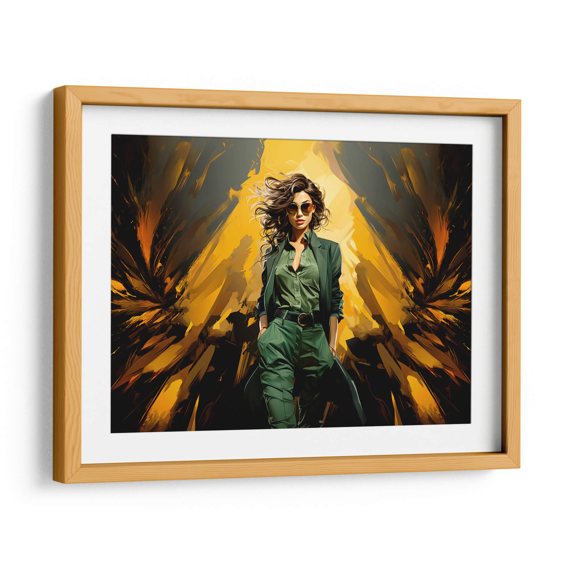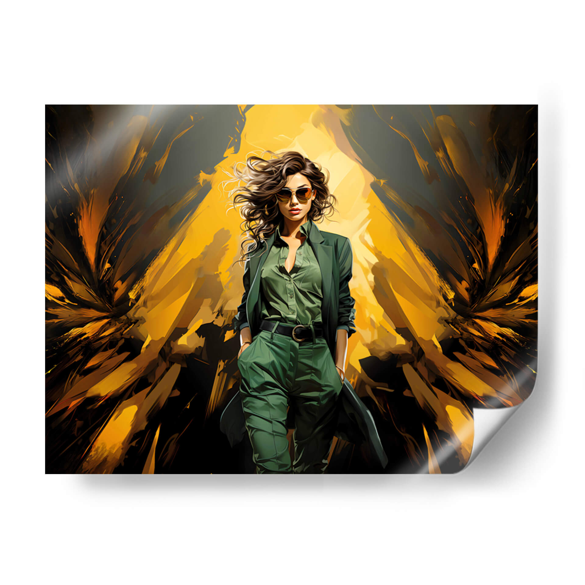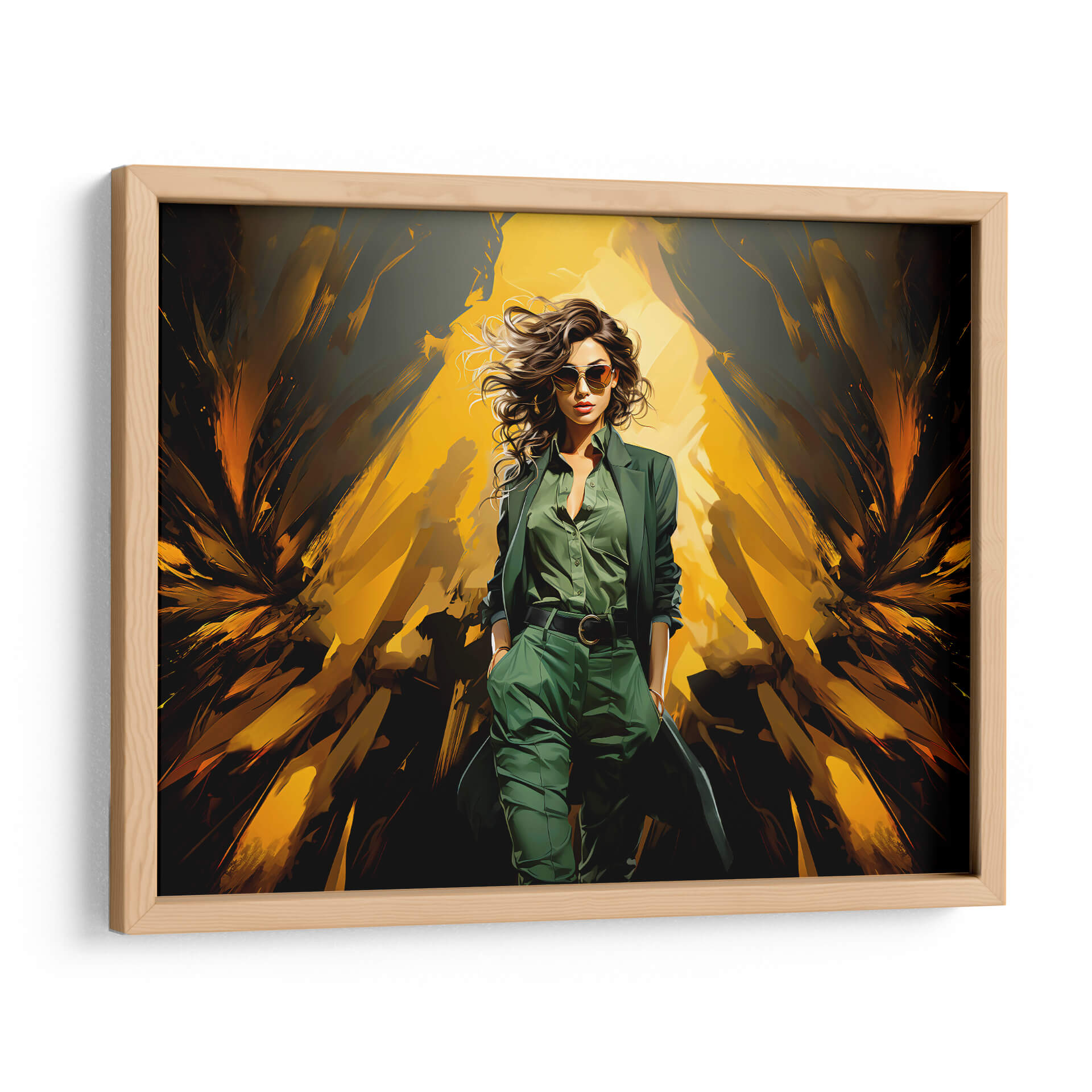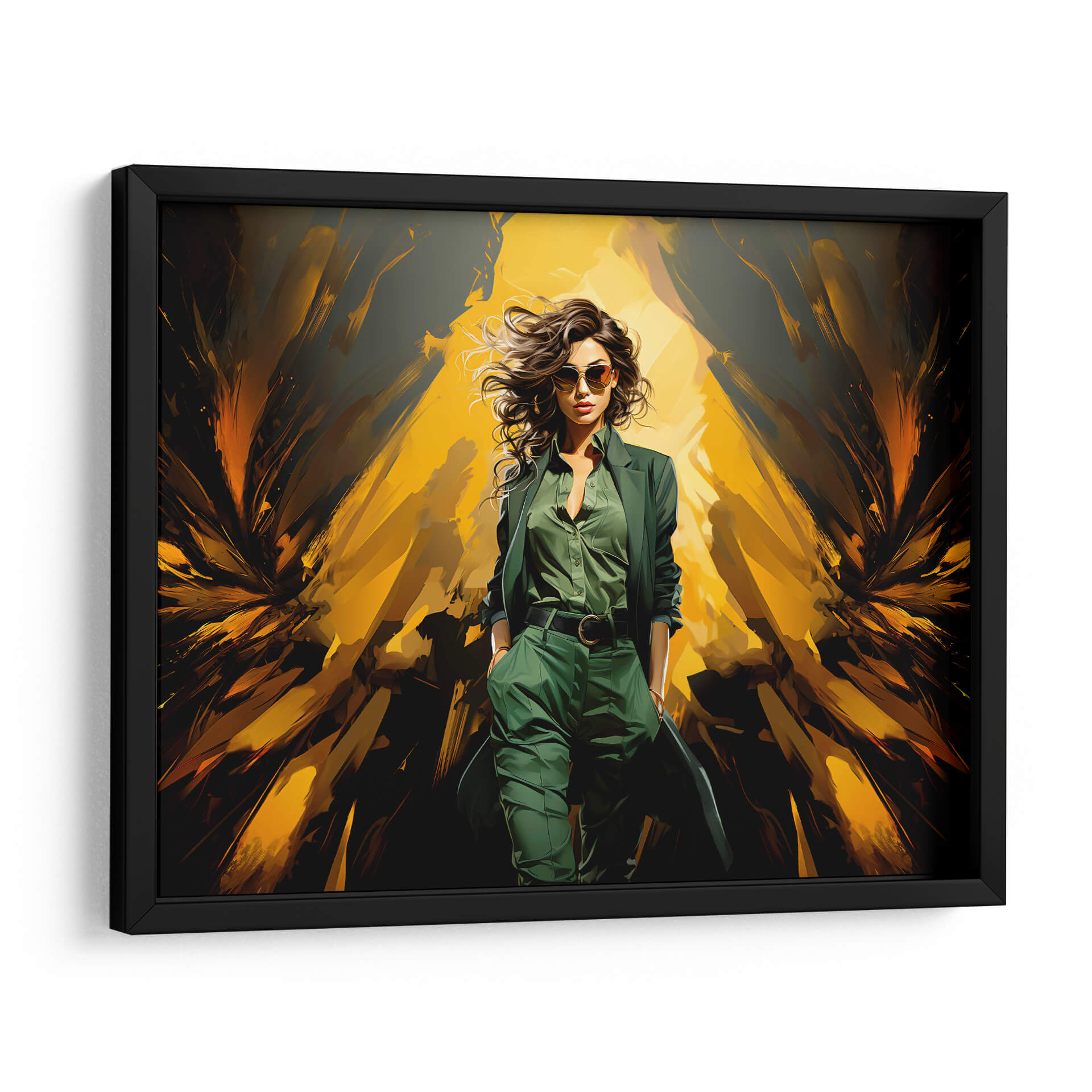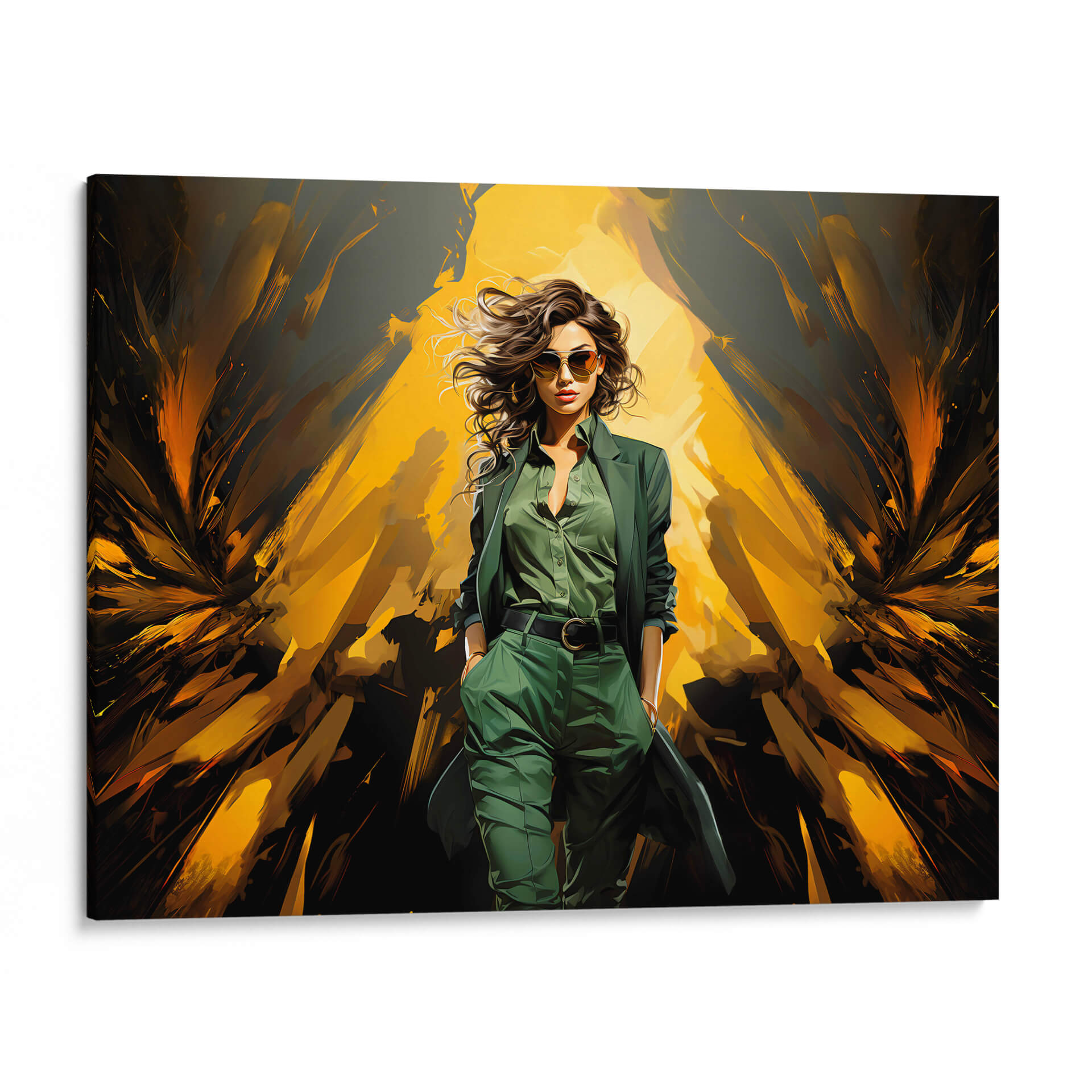 Embárcate en un viaje visual con "Lady Boss - Verde", una obra de arte contemporánea que irradia confianza y estilo. Esta pieza cautivadora presenta a una figura femenina moderna, vestida con un elegante traje verde, caminando con determinación a través de un telón de fondo abstracto de intensos tonos dorados y oscuros. La composición dinámica, con pinceladas audaces y un juego de luces y sombras, crea una atmósfera de poder y sofisticación. Los colores vibrantes y contrastantes, dominados por el verde esmeralda del atuendo y los destellos dorados del fondo, aportan una energía palpable a la obra. El estilo, que fusiona elementos realistas con una ejecución expresionista, otorga profundidad y un toque de misterio. "Lady Boss - Verde" es ideal para espacios que buscan un punto focal audaz y motivador, como una oficina ejecutiva, un salón moderno o un vestidor. Transmite una sensación de ambición, independencia y una estética chic. Este cuadro decorativo no solo embellece tu pared, sino que también inspira y proyecta una imagen de fuerza y determinación. Es la elección perfecta para quienes aprecian el arte que fusiona moda, poder y expresión artística contemporánea, añadiendo un toque distintivo y lleno de personalidad a cualquier ambiente.
