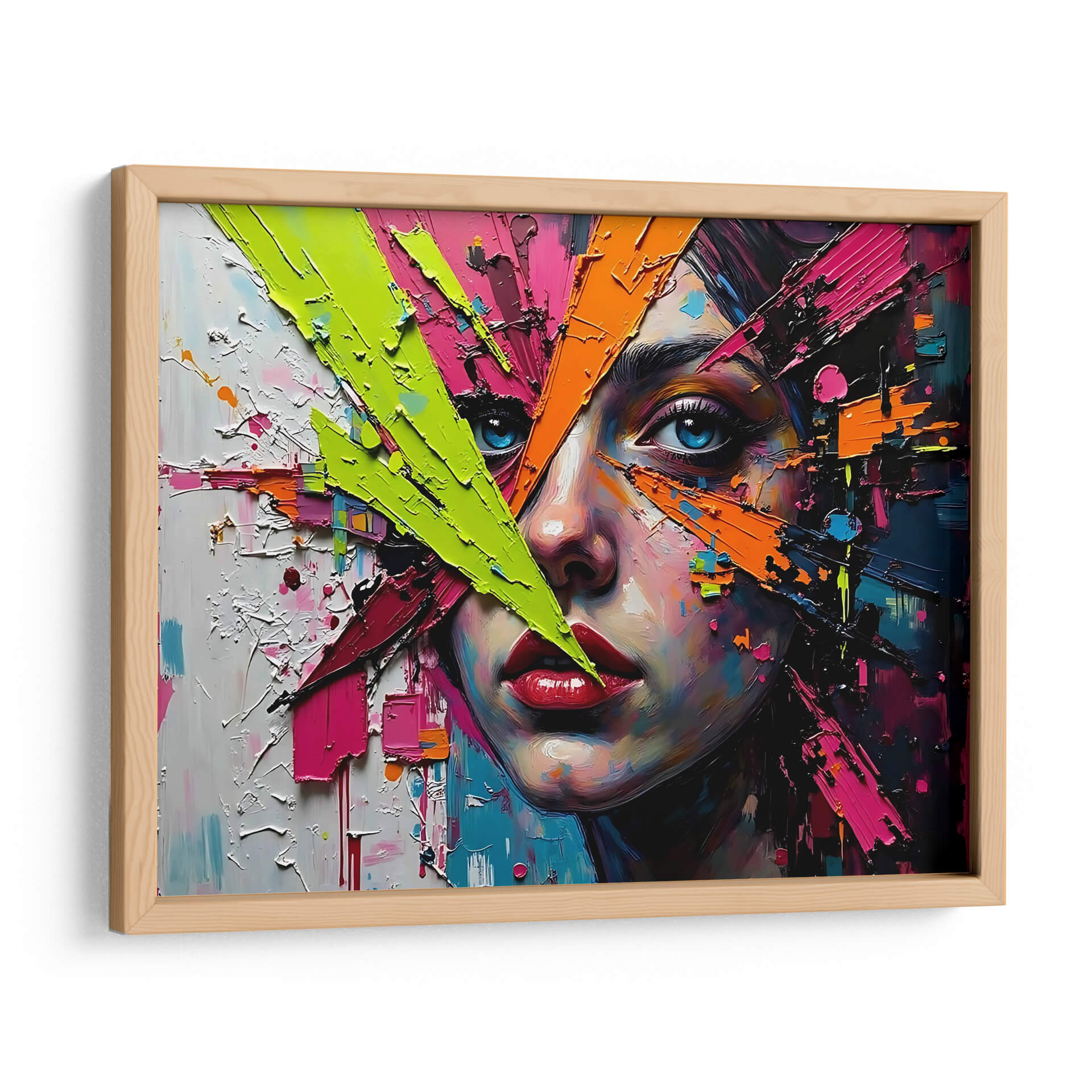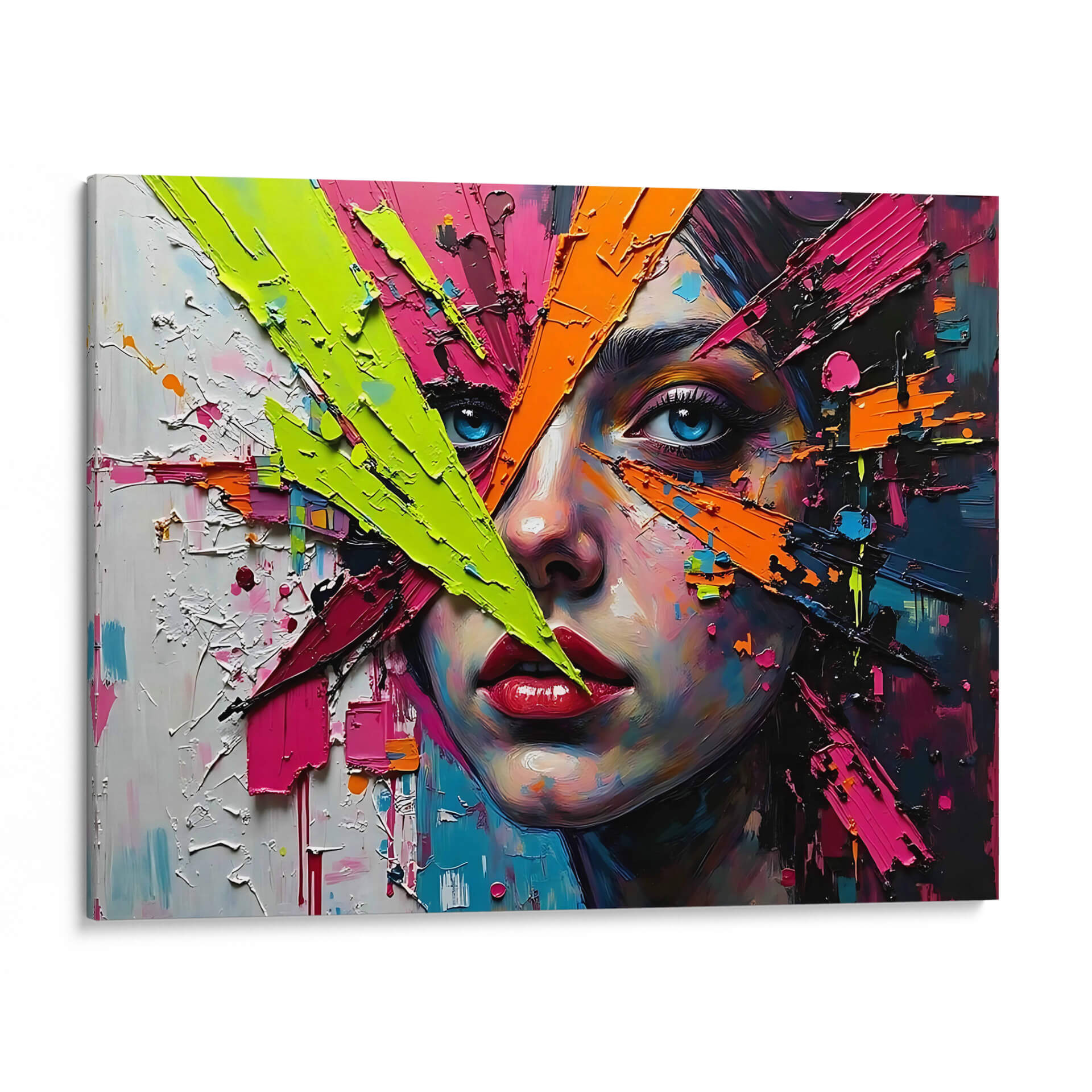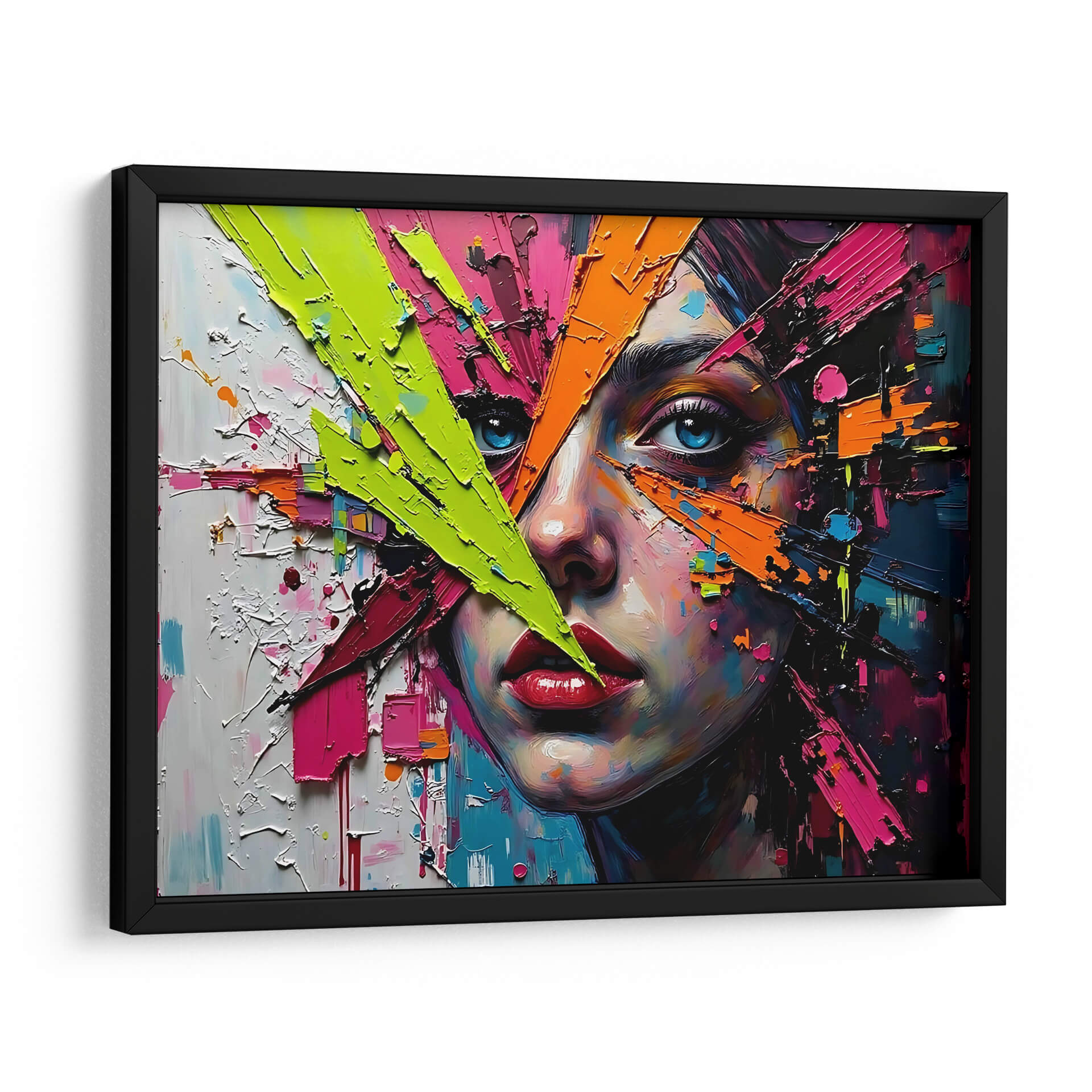 Sumérgete en la intensidad y el misterio de "Mirada Fragmentada", una obra de arte contemporáneo que desafía la percepción. Este cuadro decorativo captura la esencia de un rostro femenino, descompuesto y recompuesto a través de audaces pinceladas y una explosión de colores vibrantes. Los vibrantes tonos de verde neón, naranja y rosa fucsia chocan con el fondo oscuro y texturizado, creando un dinamismo visual impactante. Los penetrantes ojos azules de la figura central sirven como ancla emocional, contrastando con la fragmentación abstracta que la rodea. Esta pieza, con su estilo expresionista y su paleta de colores atrevida, es perfecta para aquellos que buscan añadir un toque de audacia y sofisticación a su decoración. Ideal para salas de estar modernas, oficinas creativas o cualquier espacio que necesite un punto focal cautivador que invite a la reflexión y la admiración. "Mirada Fragmentada" no es solo una decoración de pared, es una declaración de estilo y personalidad, una ventana a la complejidad de la visión moderna.