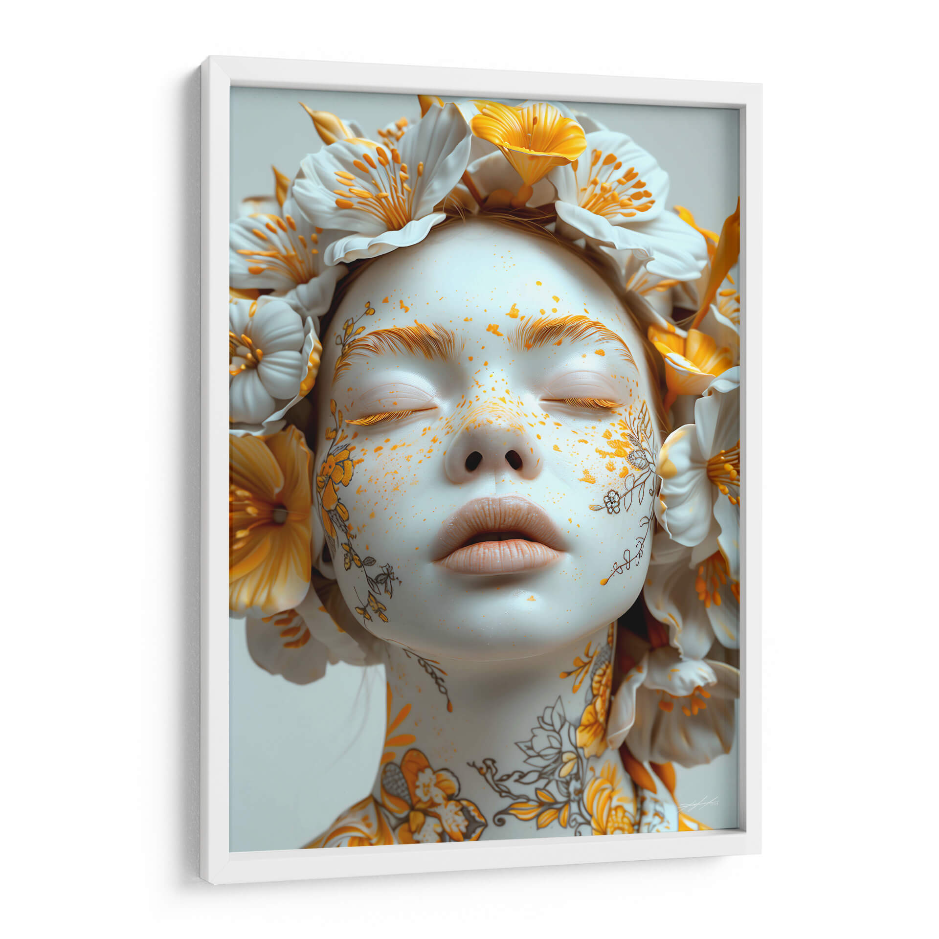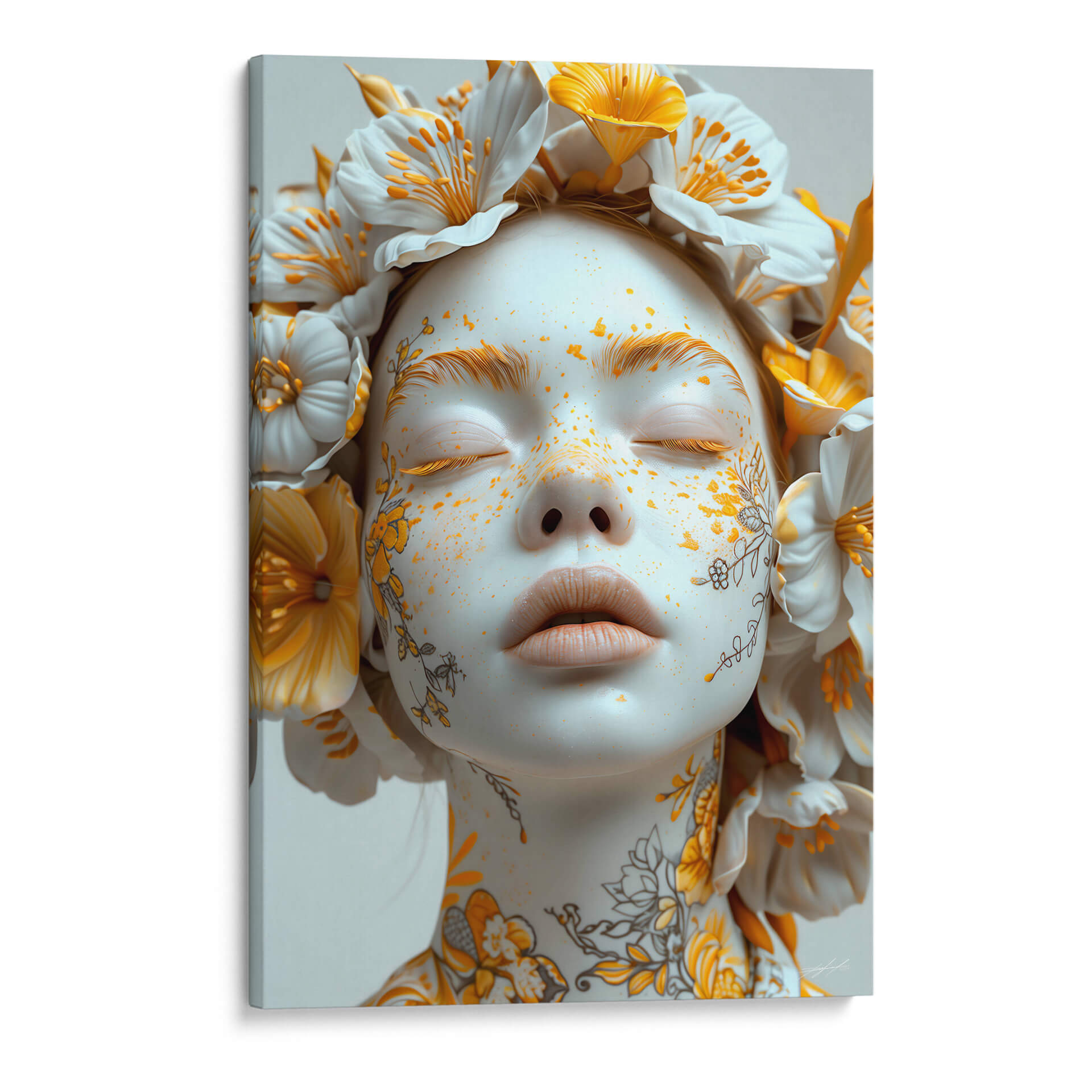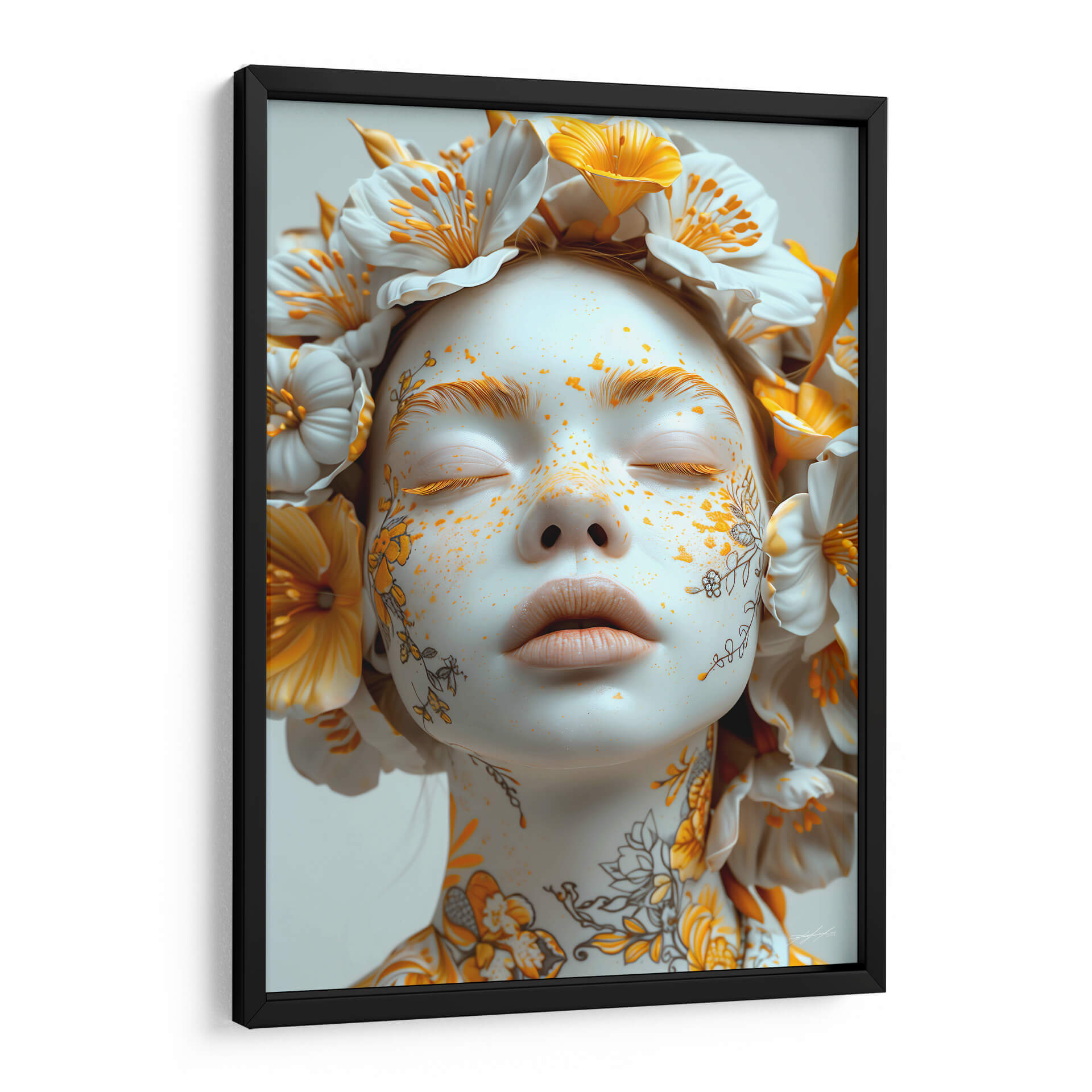 Sumérgete en la delicadeza etérea de 'Sentimiento de Porcelana - 5', una obra de arte que captura la serenidad y la belleza efímera. Esta pieza presenta un rostro sereno, con los ojos cerrados, adornado con delicados pétalos de flores blancas y vibrantes toques de amarillo dorado. La piel, similar a la porcelana, está sutilmente salpicada con detalles florales en tonos dorados y contornos finos, creando una sensación de fragilidad y sofisticación. Las flores, que enmarcan la cabeza y descienden por el cuello, evocan un jardín encantado o un tocado nupcial, aportando una dimensión de naturaleza y feminidad. La paleta de colores, dominada por el blanco y el amarillo, transmite una atmósfera de calma, pureza y renovación, con un toque de elegancia opulenta. El estilo, que fusiona elementos realistas con toques surrealistas y digitales, crea una imagen impactante y onírica. Este cuadro decorativo es ideal para añadir un punto de interés visual y una atmósfera de paz a cualquier espacio, desde un dormitorio tranquilo hasta una sala de estar moderna o una consulta que busque evocar serenidad y buen gusto. Su composición centrada y la expresividad de la figura invitan a la contemplación y la admiración, convirtiéndola en una adición memorable a tu colección de arte mural.