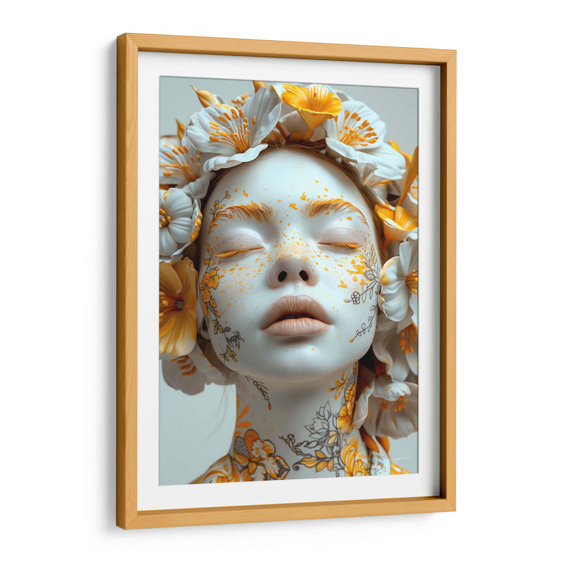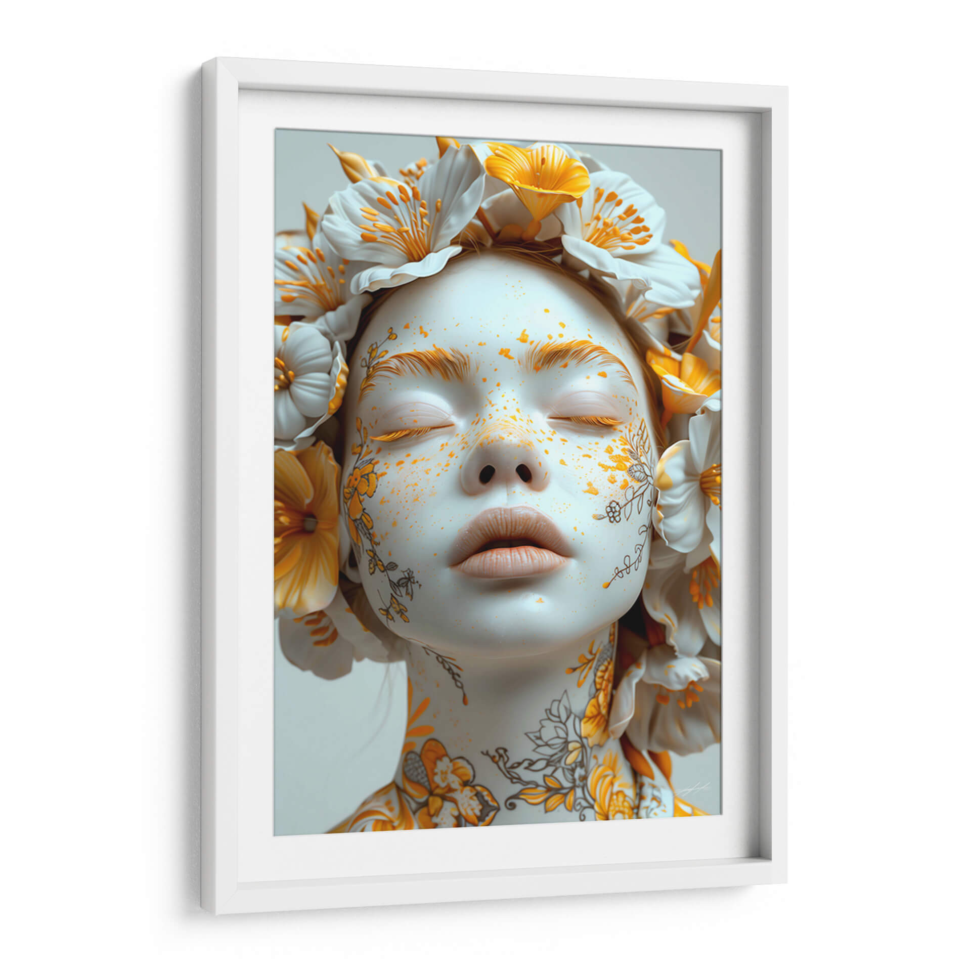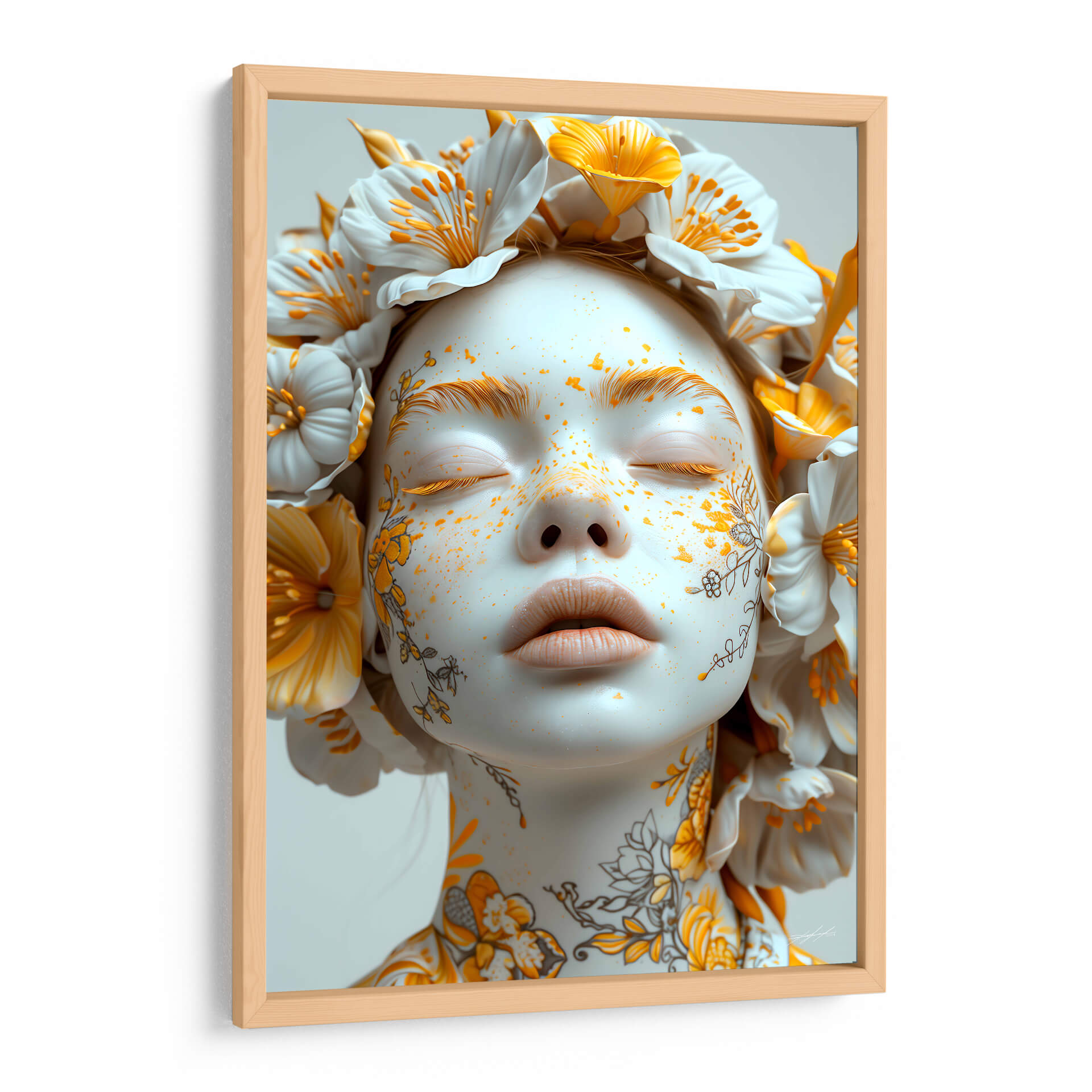 Sumérgete en la delicadeza etérea de 'Sentimiento de Porcelana - 5', una obra de arte que captura la serenidad y la belleza efímera. Esta pieza presenta un rostro sereno, con los ojos cerrados, adornado con delicados pétalos de flores blancas y vibrantes toques de amarillo dorado. La piel, similar a la porcelana, está sutilmente salpicada con detalles florales en tonos dorados y contornos finos, creando una sensación de fragilidad y sofisticación. Las flores, que enmarcan la cabeza y descienden por el cuello, evocan un jardín encantado o un tocado nupcial, aportando una dimensión de naturaleza y feminidad. La paleta de colores, dominada por el blanco y el amarillo, transmite una atmósfera de calma, pureza y renovación, con un toque de elegancia opulenta. El estilo, que fusiona elementos realistas con toques surrealistas y digitales, crea una imagen impactante y onírica. Este cuadro decorativo es ideal para añadir un punto de interés visual y una atmósfera de paz a cualquier espacio, desde un dormitorio tranquilo hasta una sala de estar moderna o una consulta que busque evocar serenidad y buen gusto. Su composición centrada y la expresividad de la figura invitan a la contemplación y la admiración, convirtiéndola en una adición memorable a tu colección de arte mural.