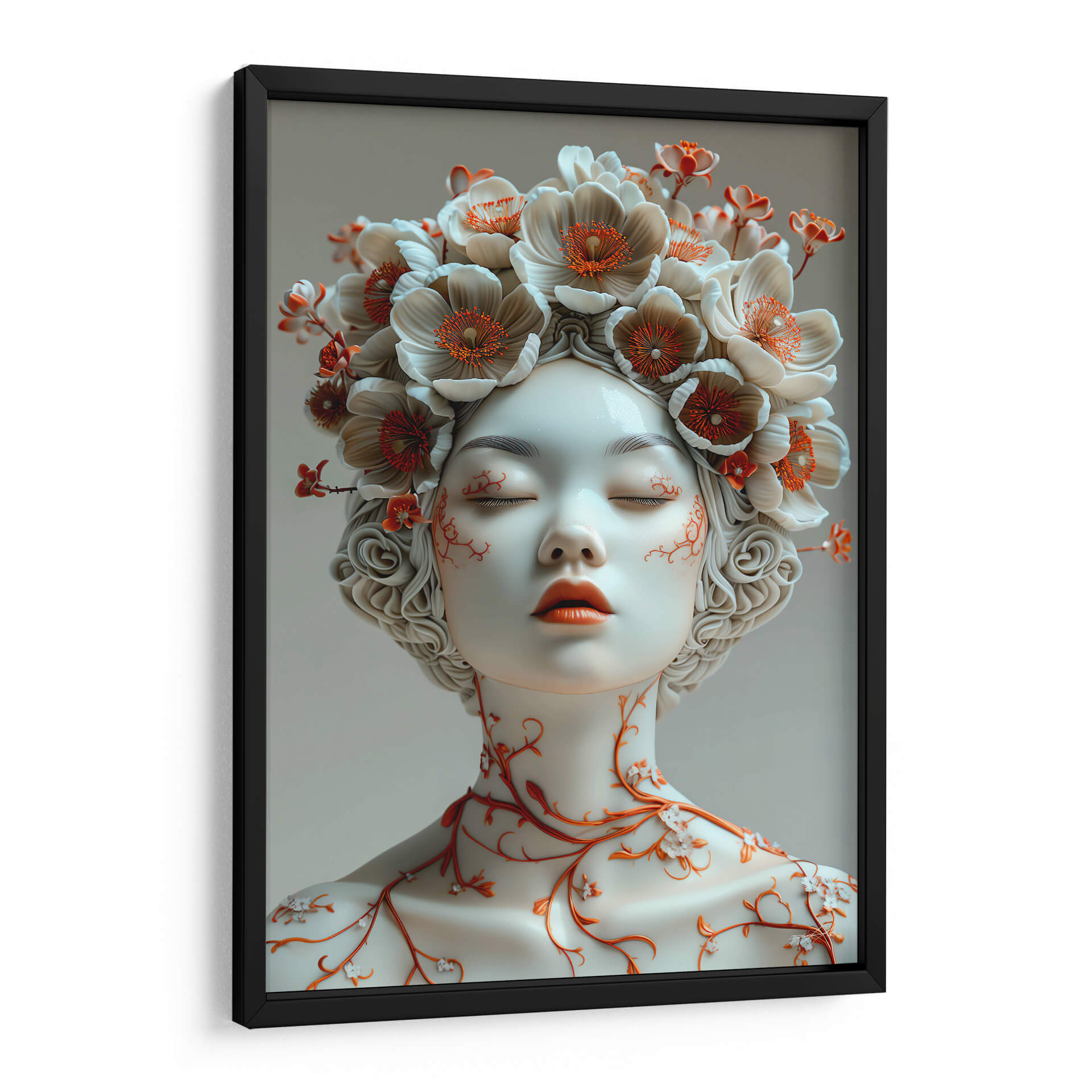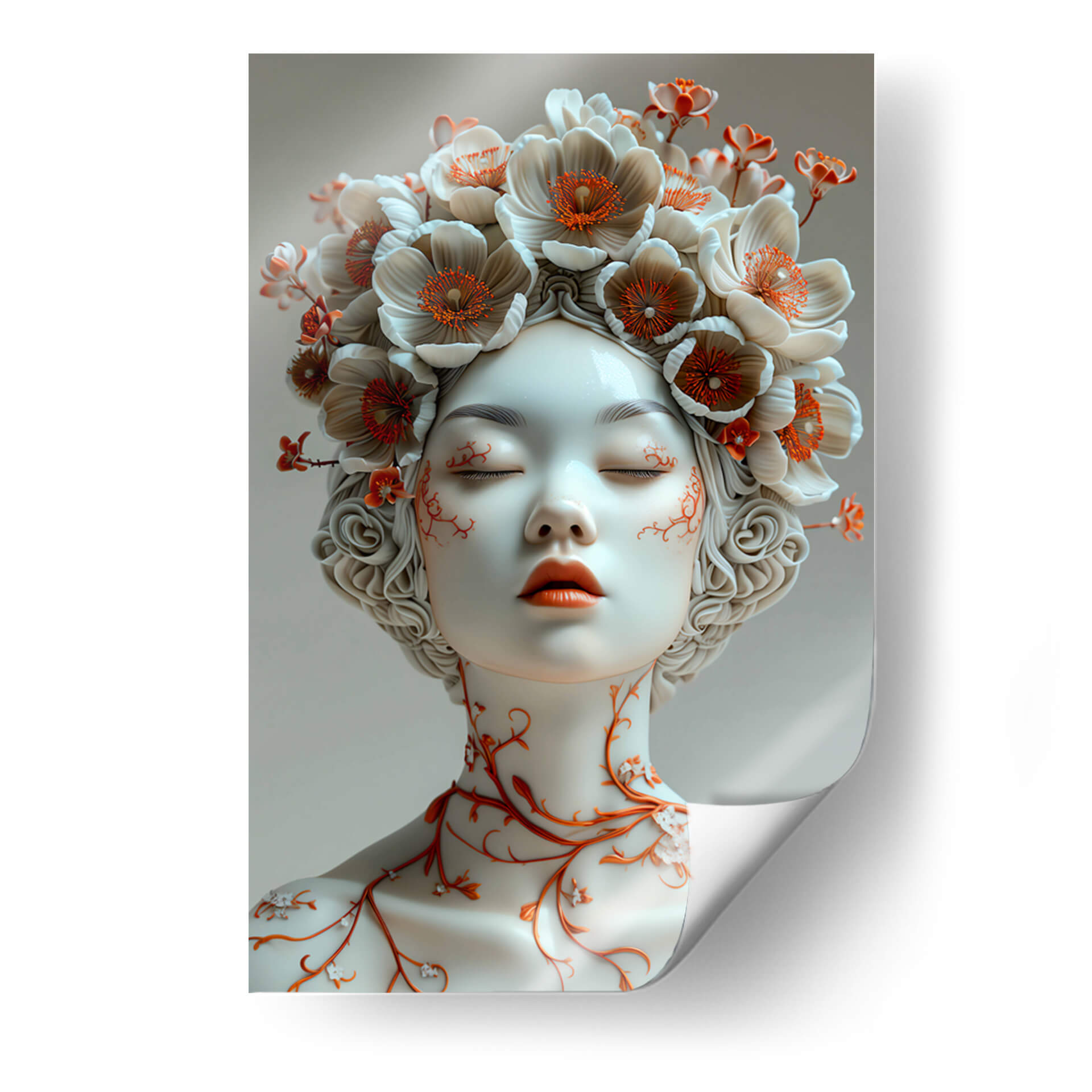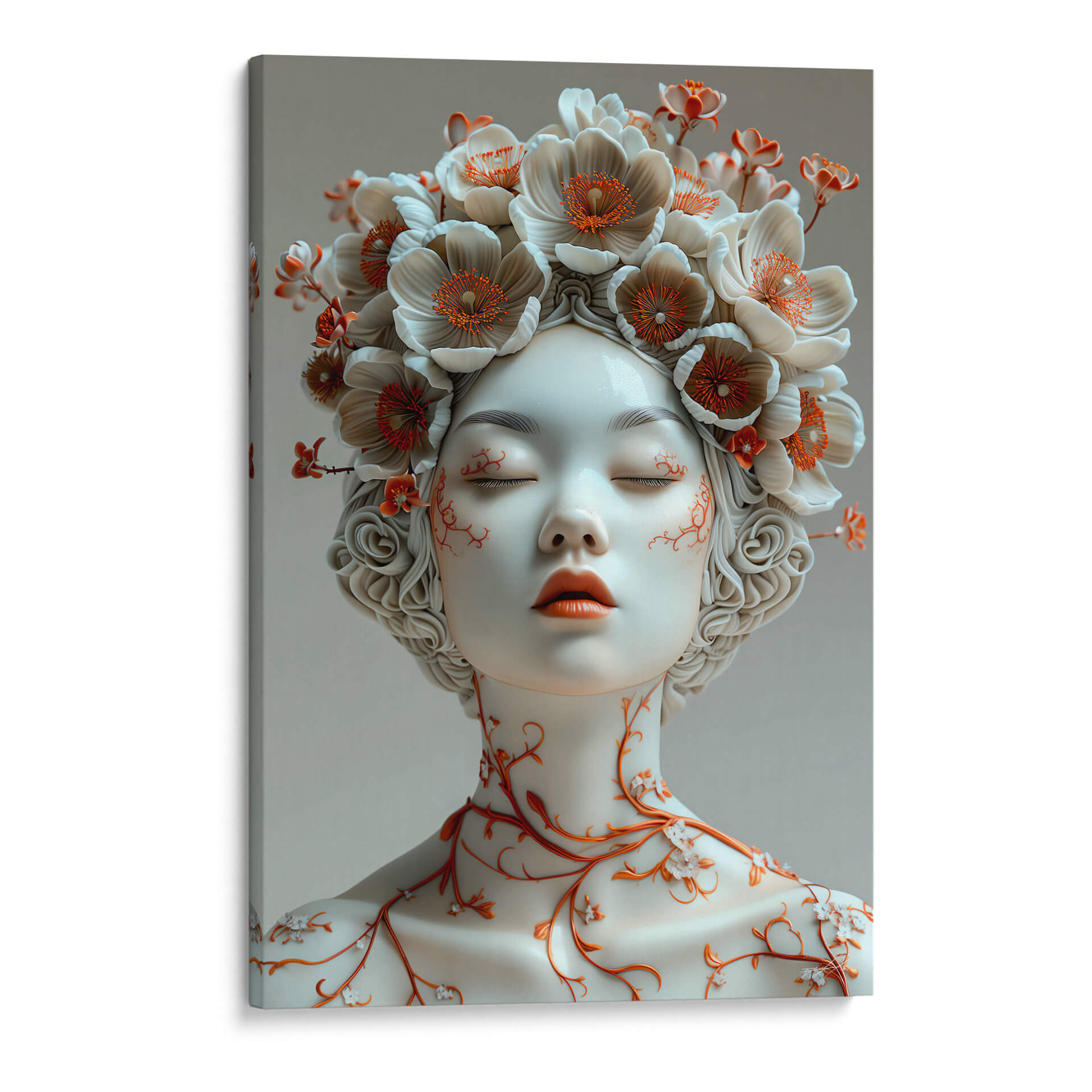 Sumérgete en la delicadeza y el misterio de "Sentimiento de Porcelana - 6", una obra de arte contemporáneo que evoca la fragilidad y la belleza efímera. Este cuadro decorativo presenta un retrato etéreo de una figura femenina con los ojos cerrados, adornada con una exuberante corona de flores en tonos blanco roto y acentos de naranja vibrante. Las delicadas enredaderas naranjas que serpentean por su cuello y mejillas añaden un toque orgánico y fascinante, contrastando sutilmente con la suavidad de la porcelana. La paleta de colores, dominada por blancos puros, grises suaves y toques cálidos de naranja, crea una atmósfera de serenidad y contemplación. El estilo artístico, que fusiona elementos realistas con un toque surrealista y etéreo, lo convierte en una pieza única para cualquier espacio que busque inspiración y un punto focal elegante. Ideal para dormitorios que buscan calma, salas de estar modernas que aprecian la sutileza o estudios que inspiran creatividad. "Sentimiento de Porcelana - 6" no es solo una decoración, es una invitación a la introspección y a la apreciación de la belleza en su forma más pura y delicada, aportando un aire de sofisticación atemporal a tu hogar u oficina.